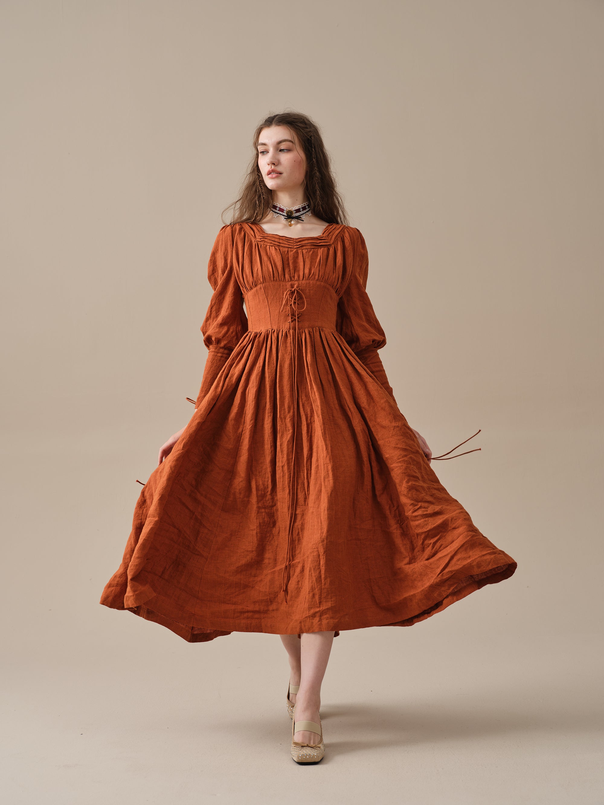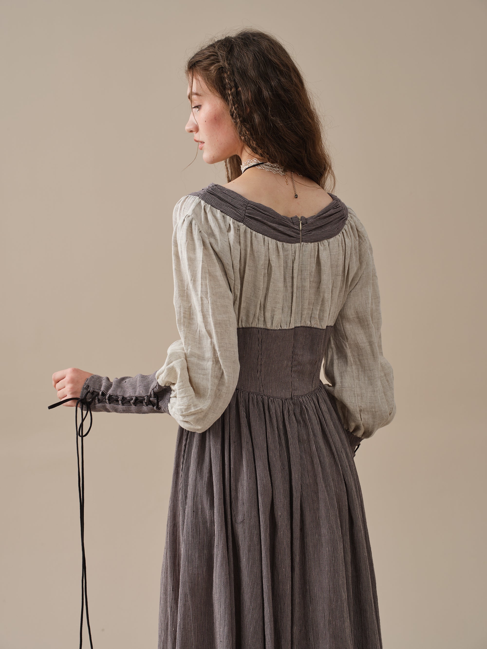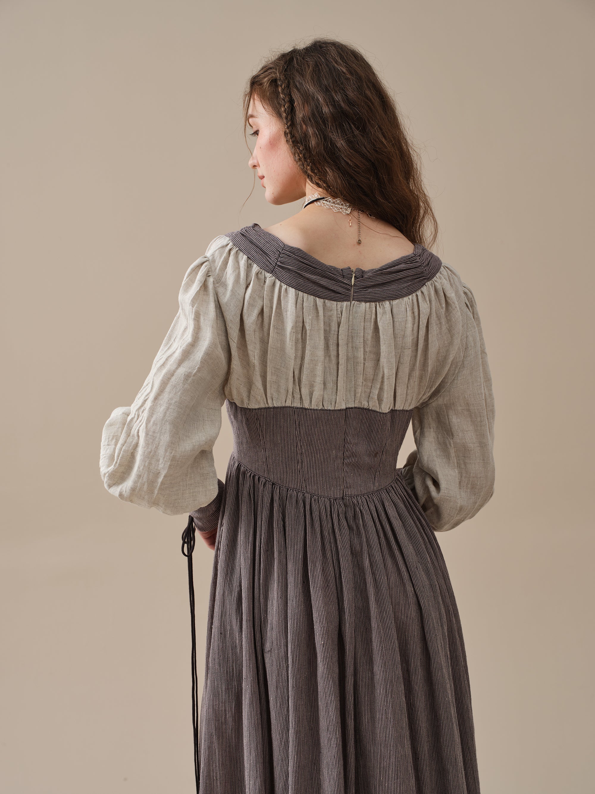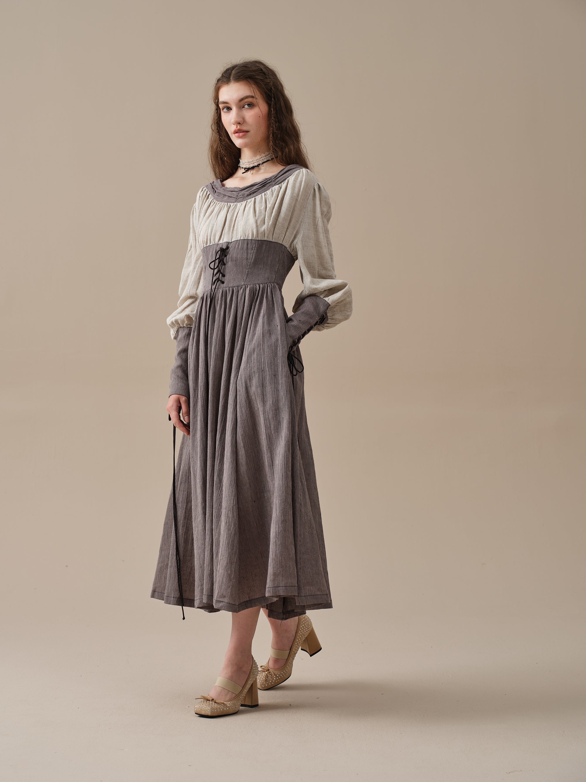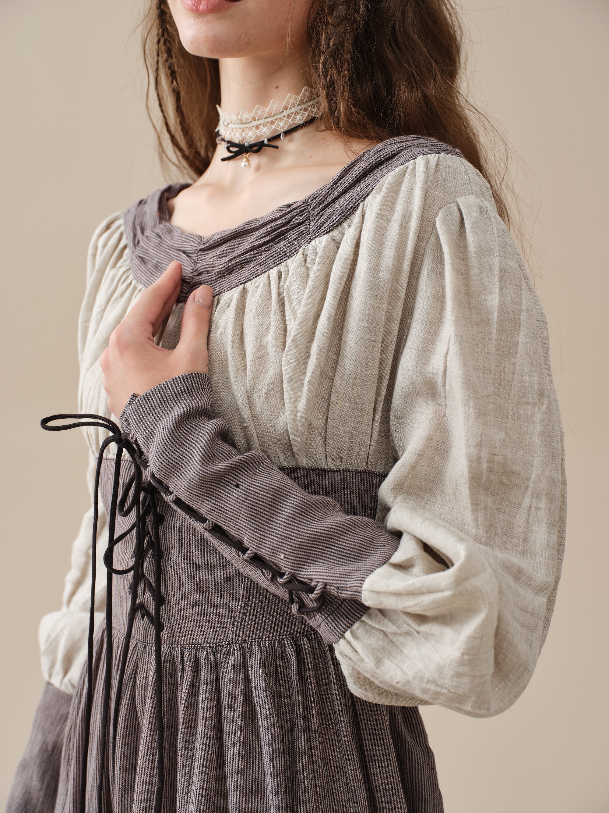 Inspired by vintage fashion, this dress captures the essence of femininity and romance.The pleated detail at the neckline adds sophistication while giving it a whimsical feel. The lace up at the waist and sleeves adds a romantic touch to the piece.