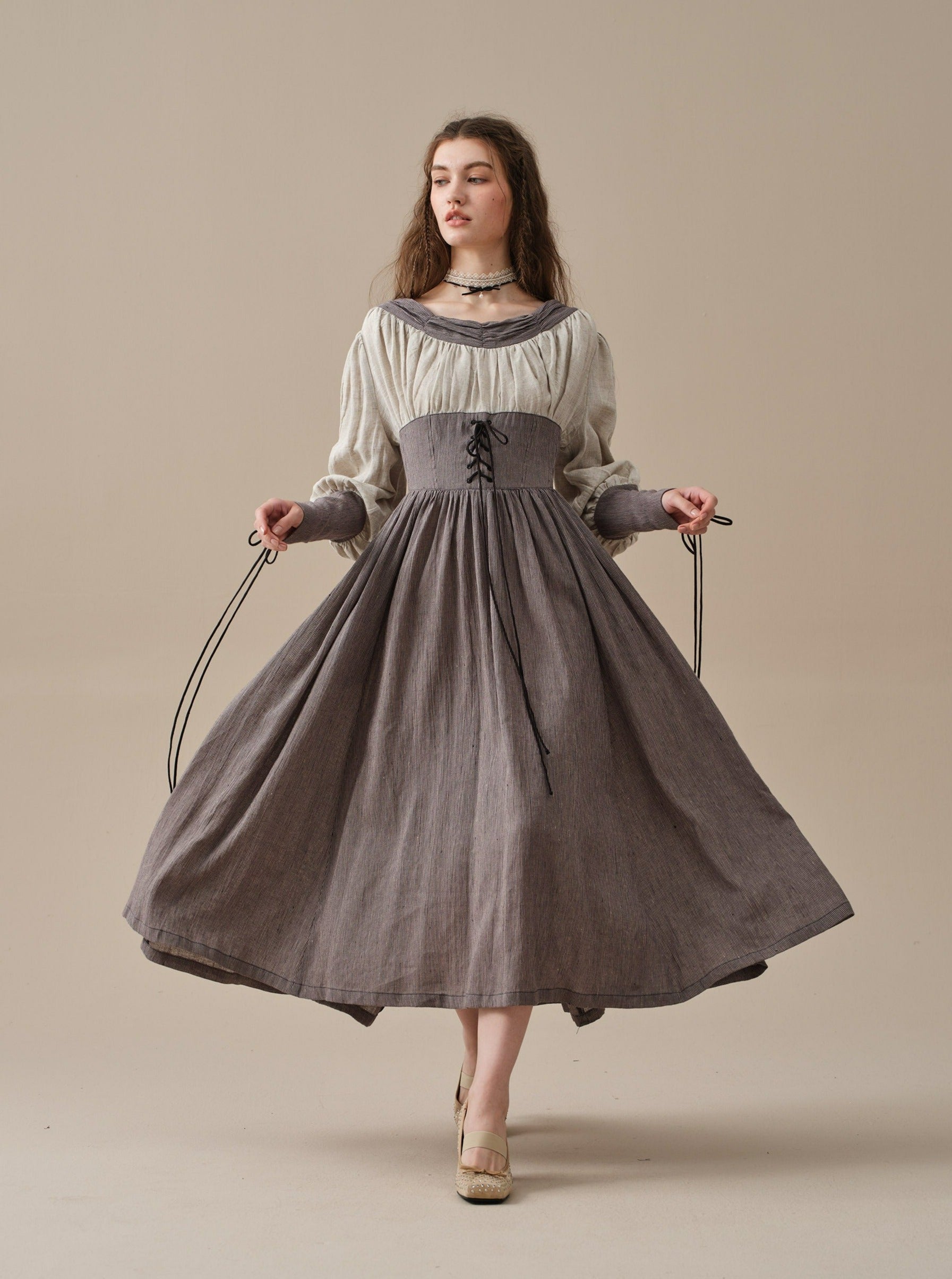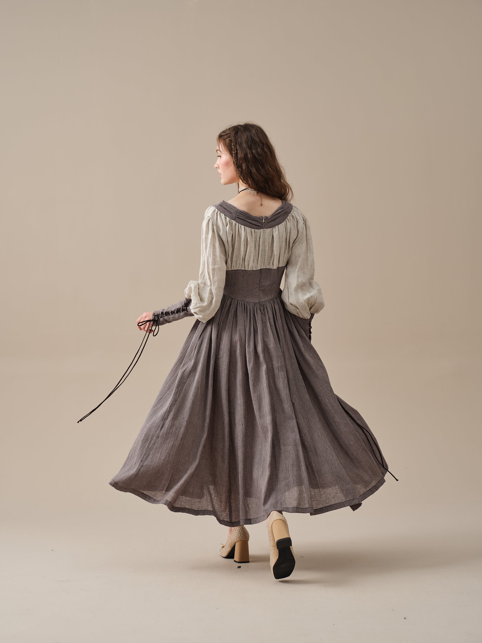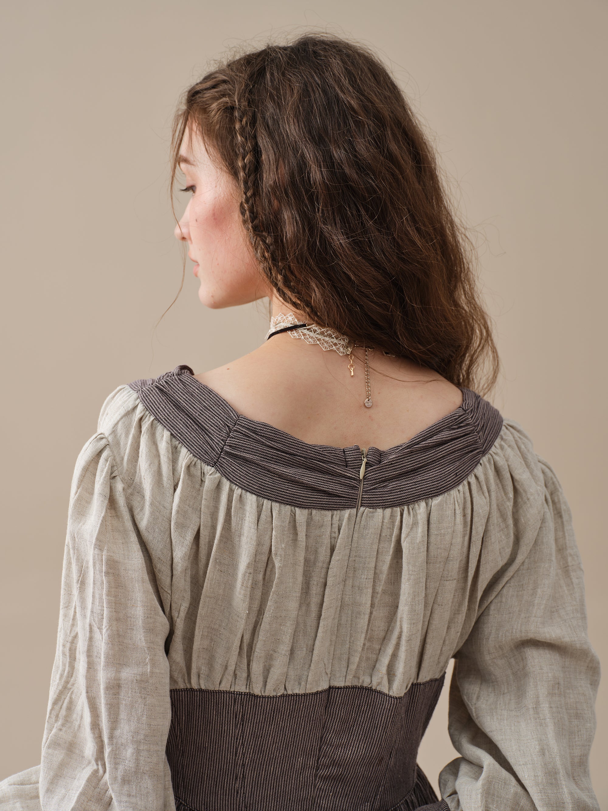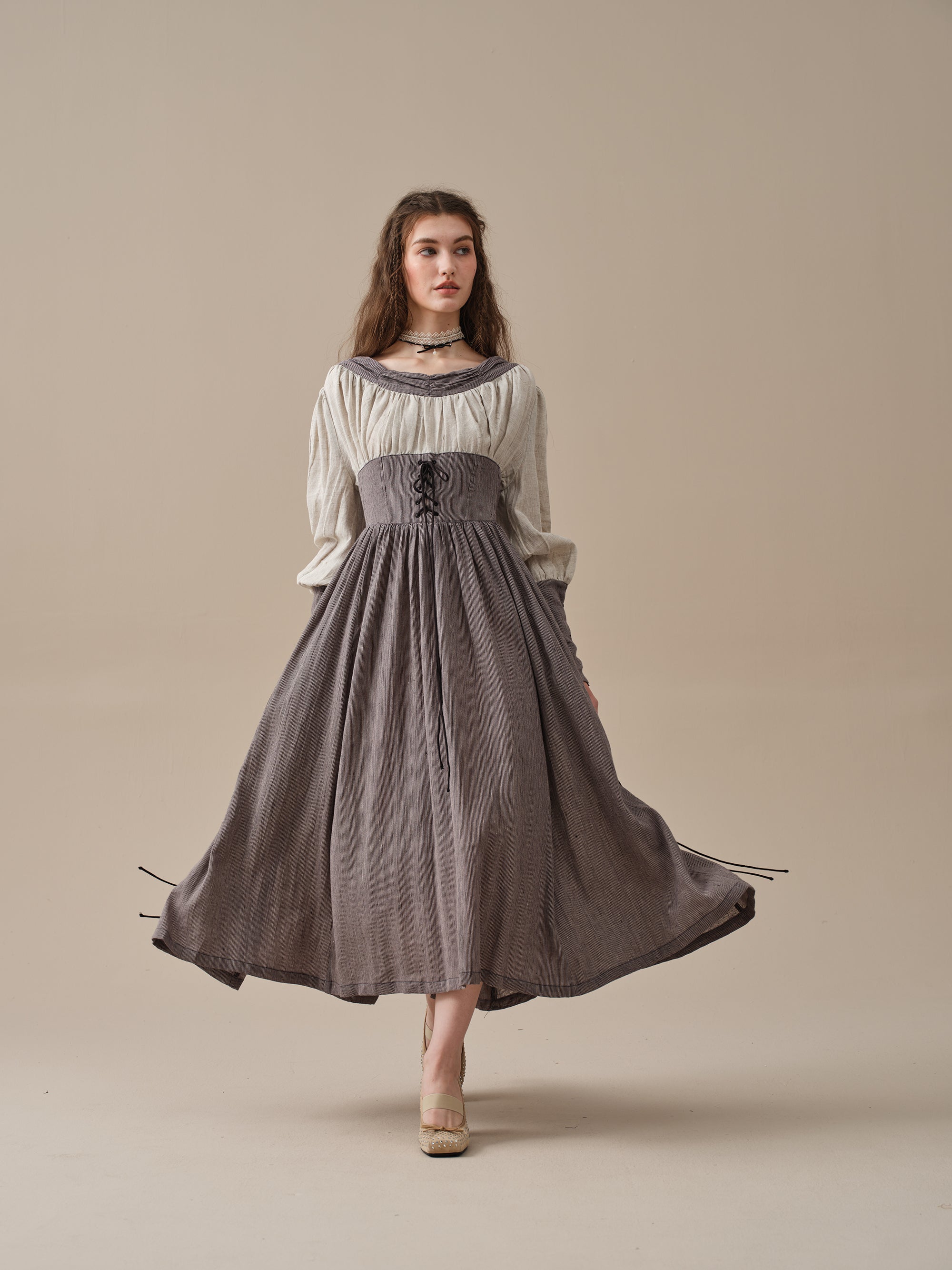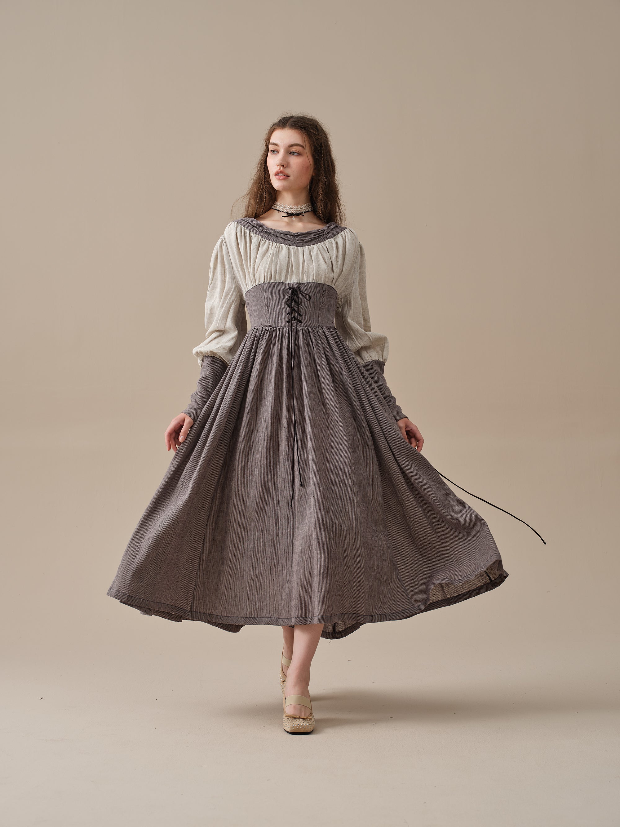 Inspired by vintage fashion, this dress captures the essence of femininity and romance.The pleated detail at the neckline adds sophistication while giving it a whimsical feel. The lace up at the waist and sleeves adds a romantic touch to the piece.