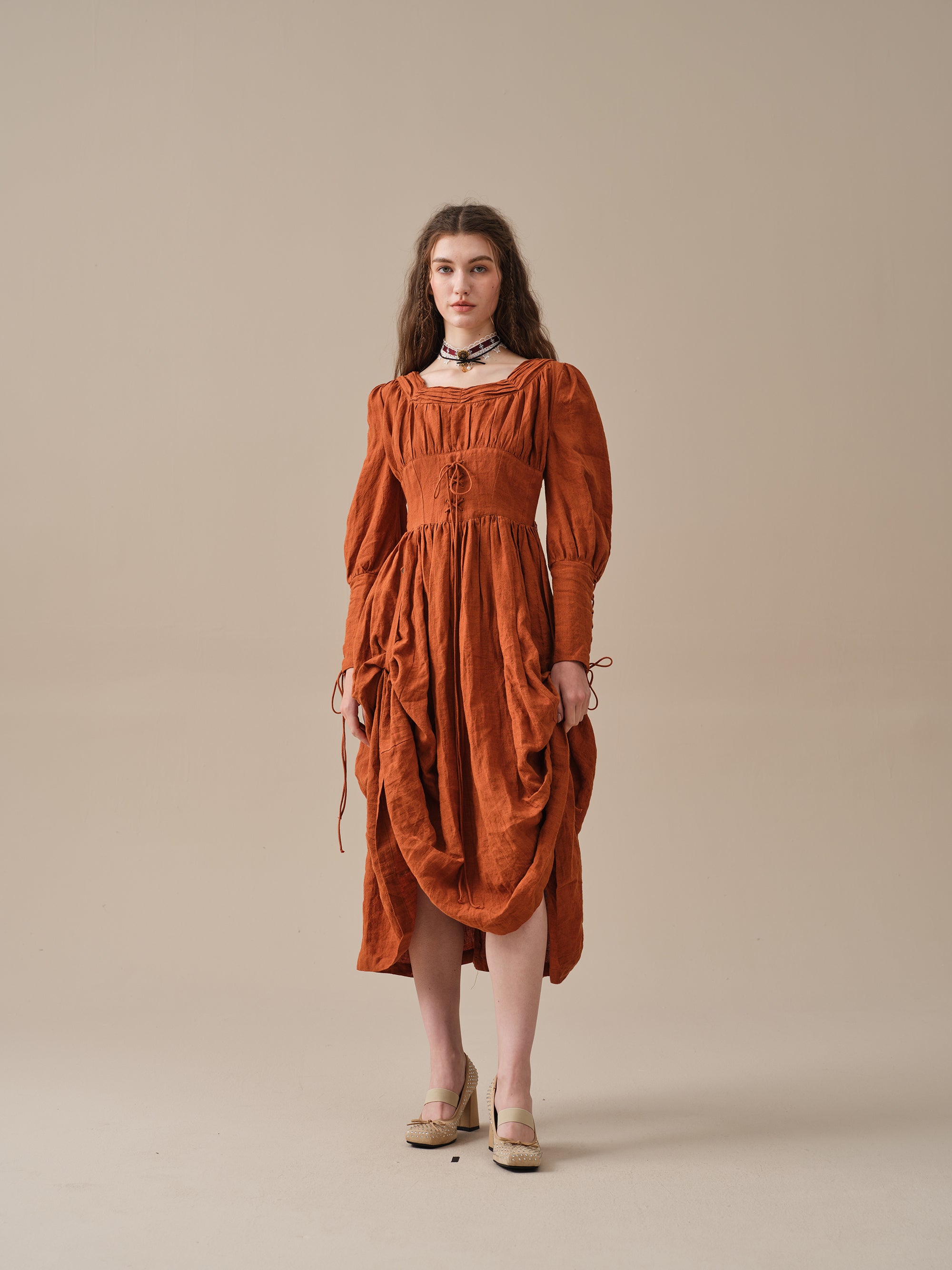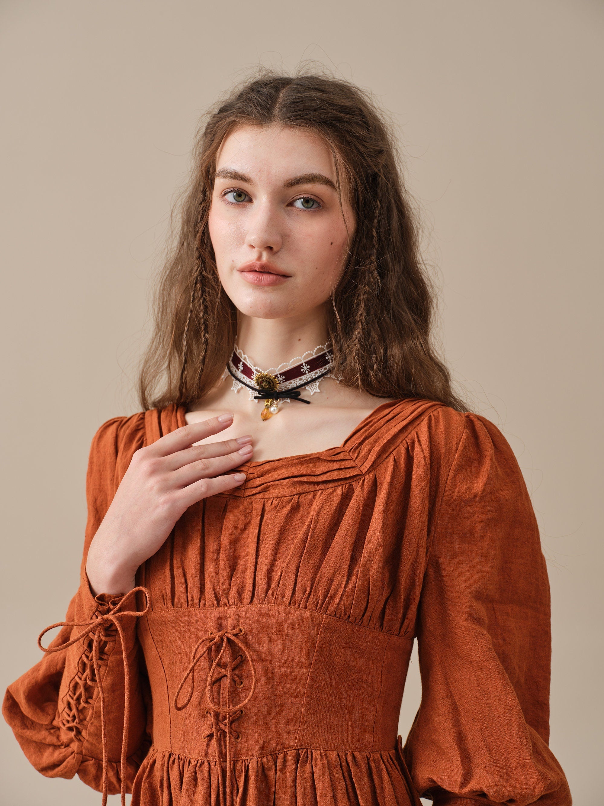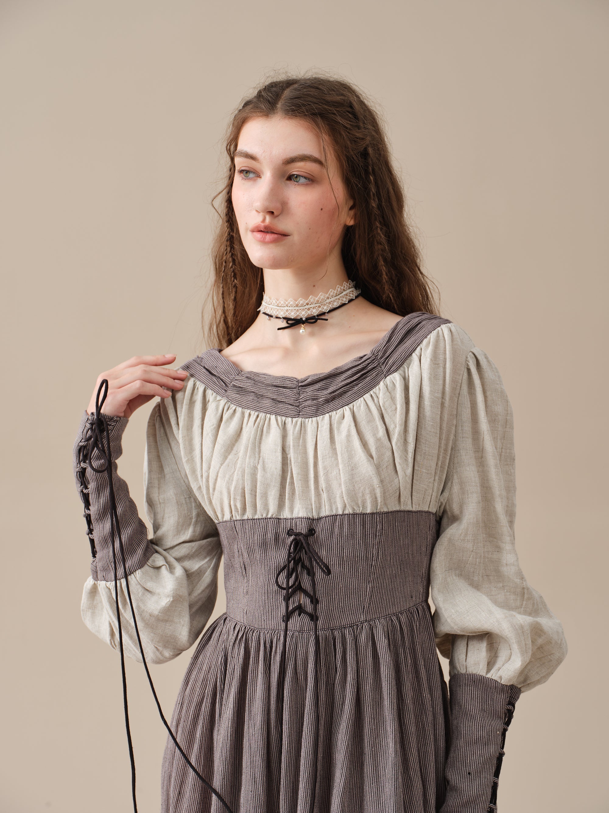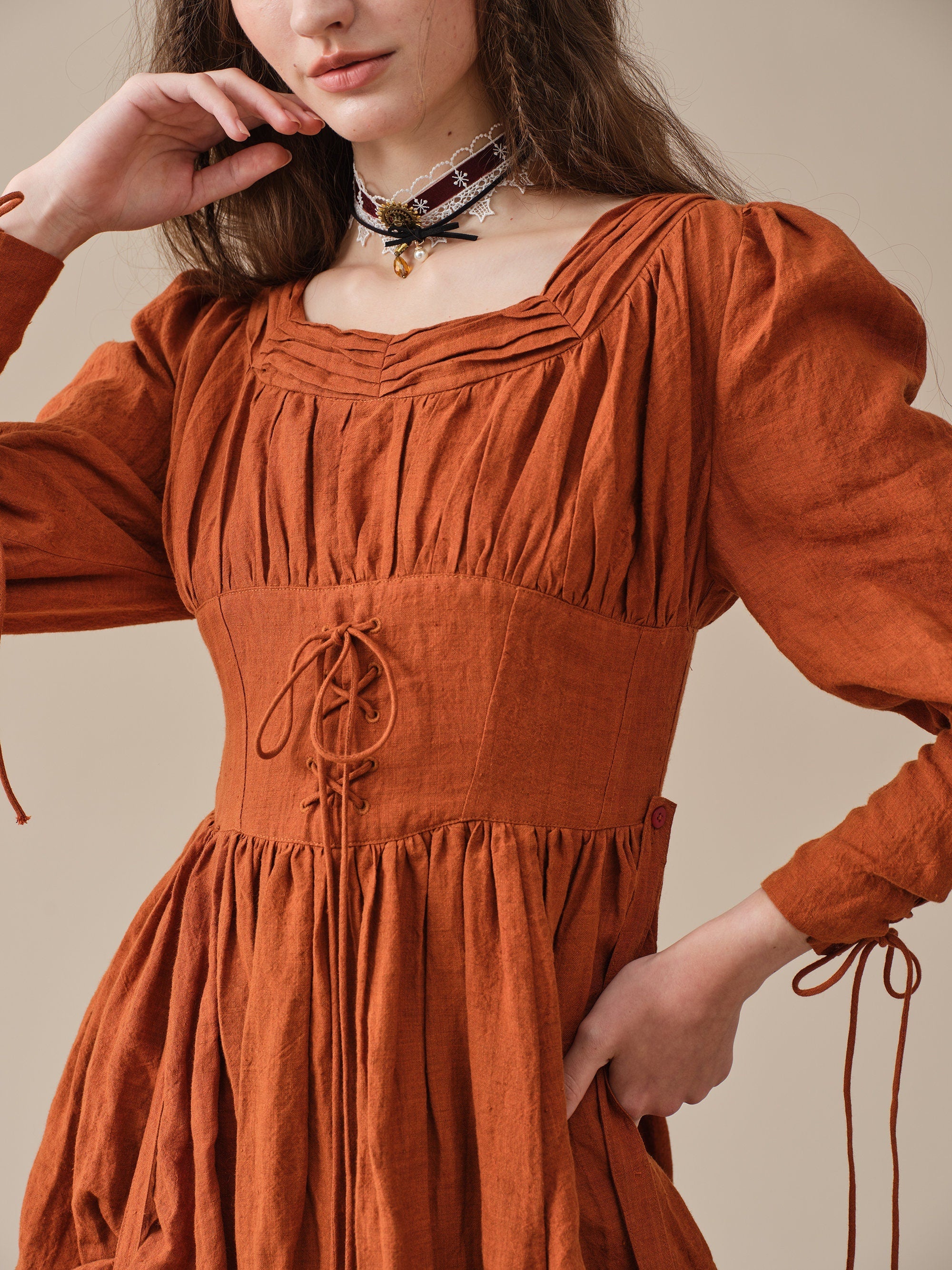 Inspired by vintage fashion, this dress captures the essence of femininity and romance.The pleated detail at the neckline adds sophistication while giving it a whimsical feel. The lace up at the waist and sleeves adds a romantic touch to the piece.