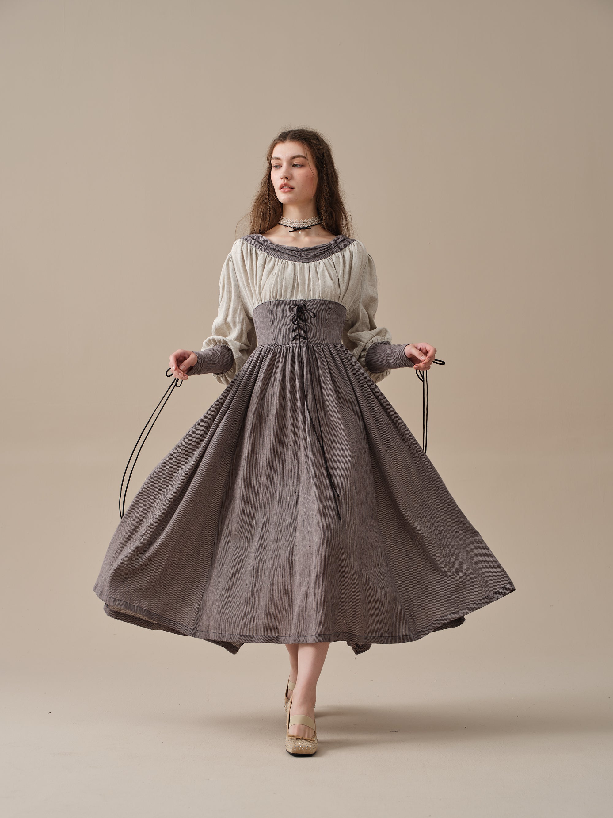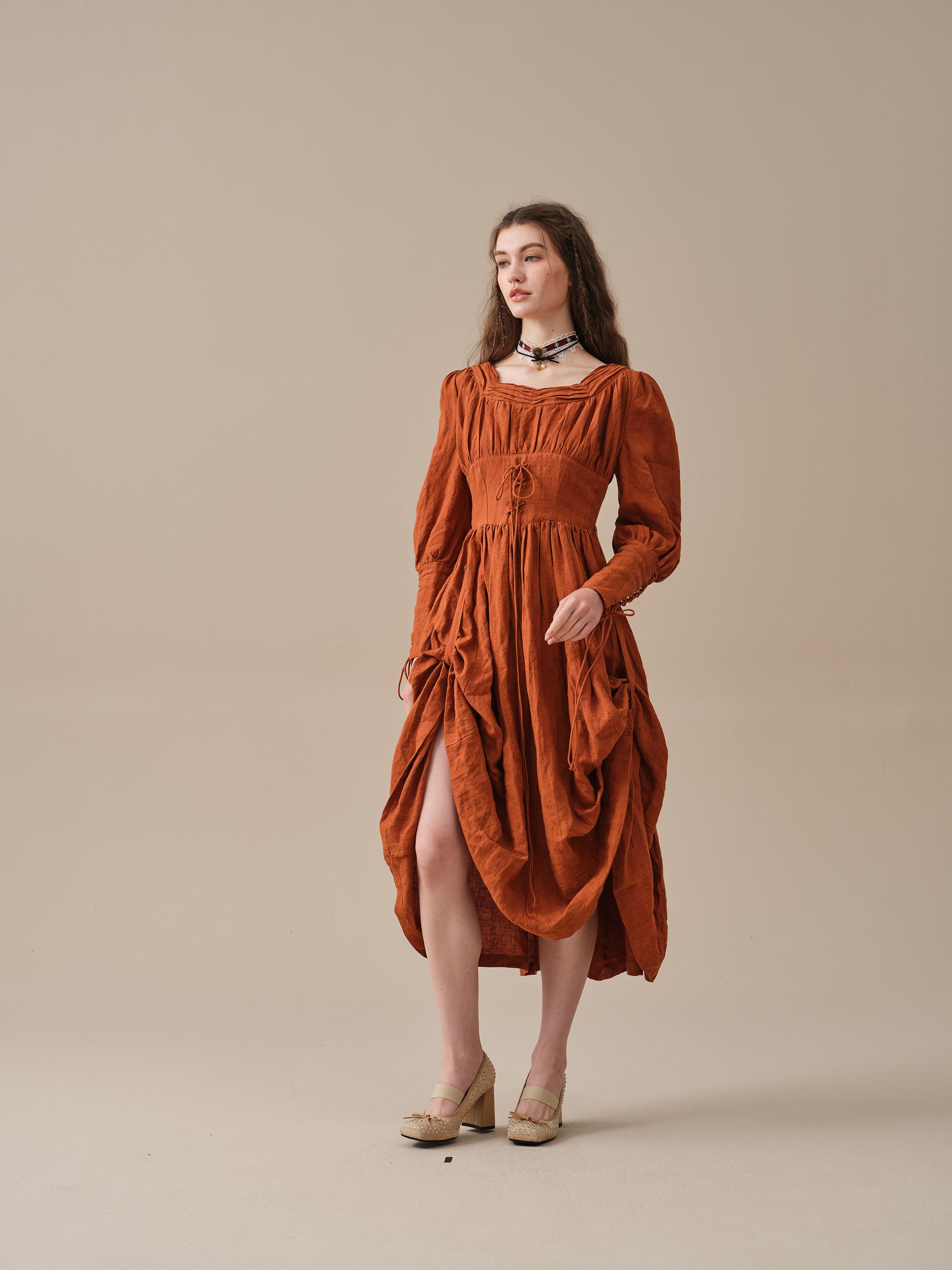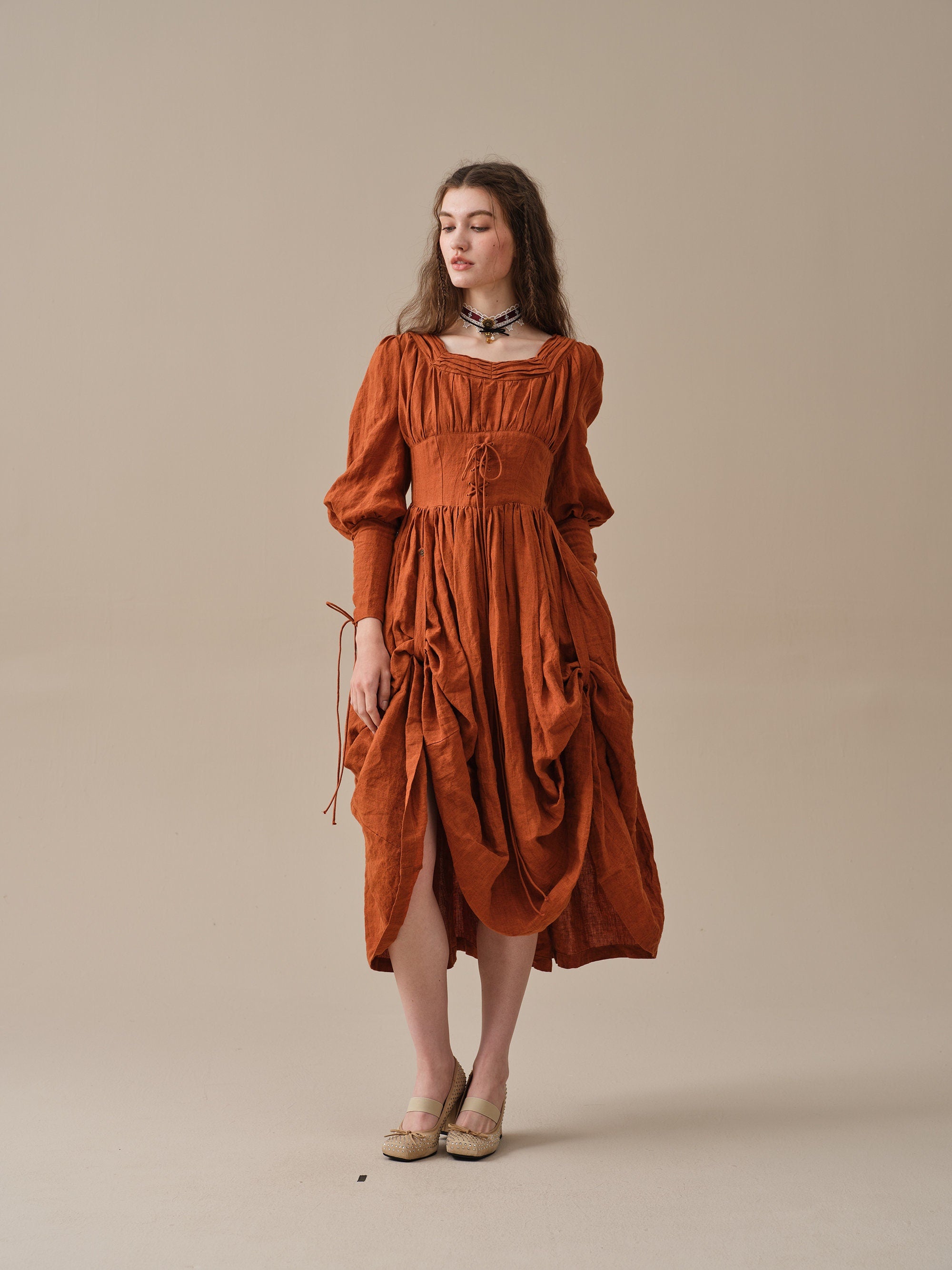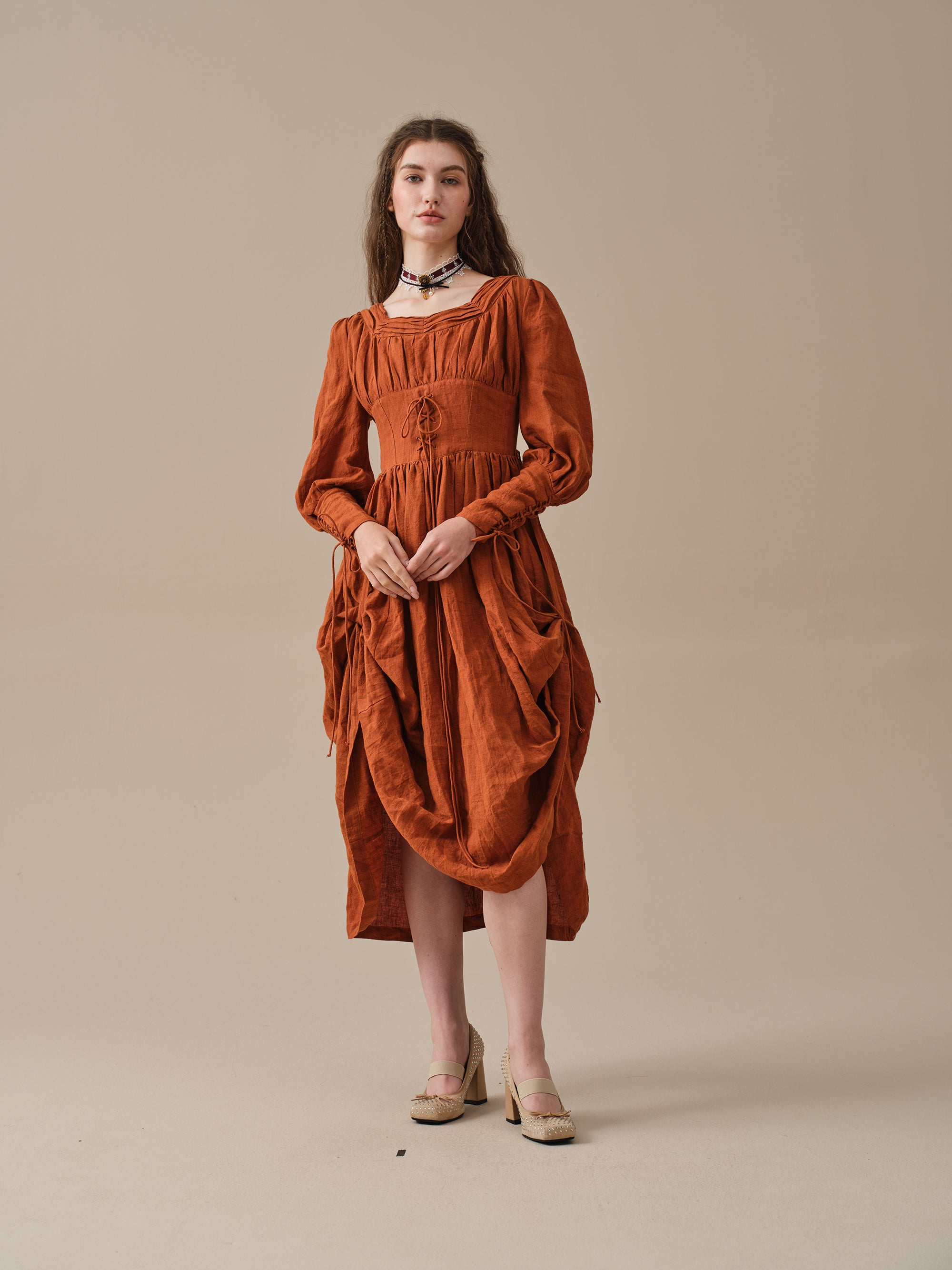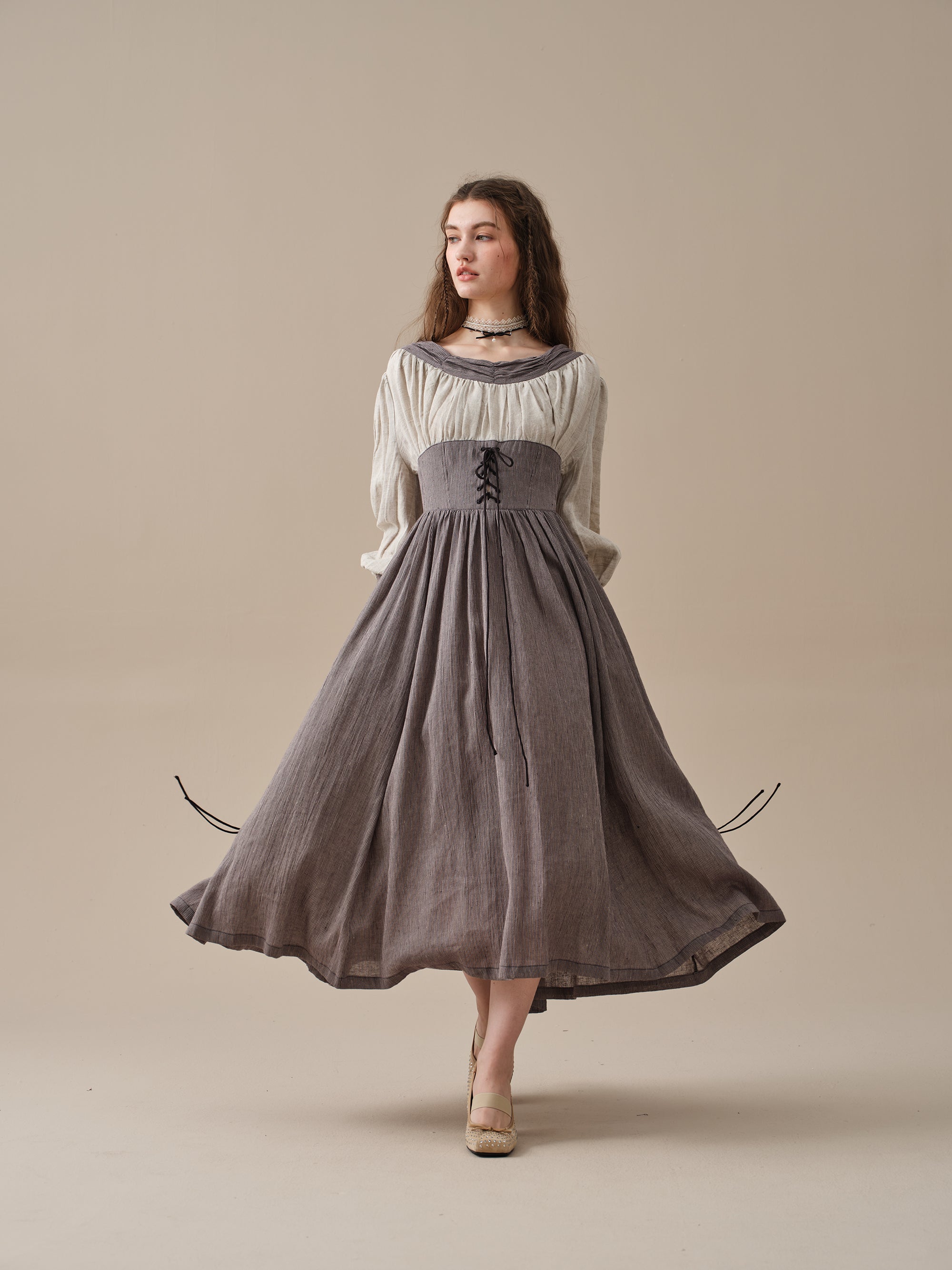 Inspired by vintage fashion, this dress captures the essence of femininity and romance.The pleated detail at the neckline adds sophistication while giving it a whimsical feel. The lace up at the waist and sleeves adds a romantic touch to the piece.