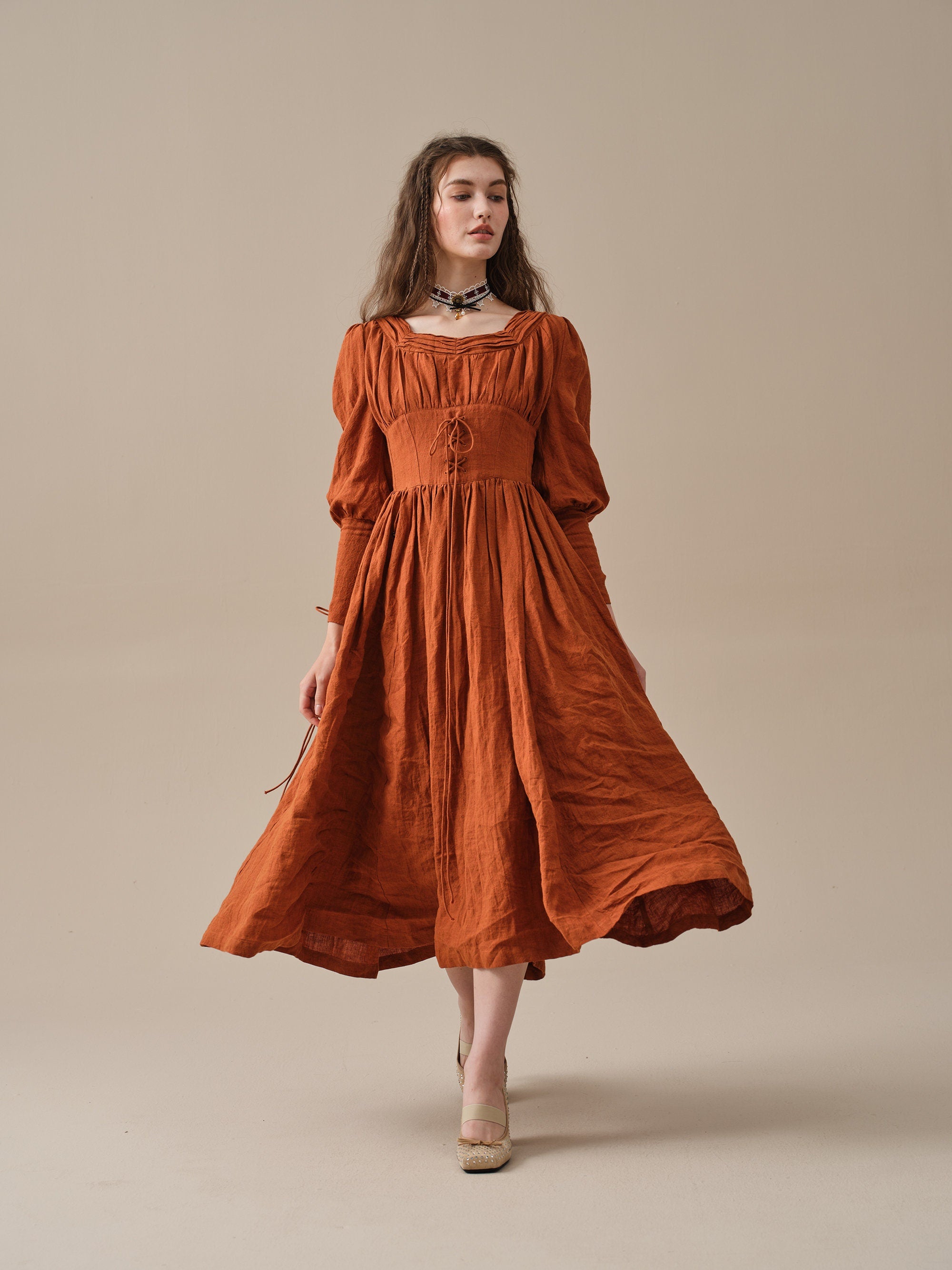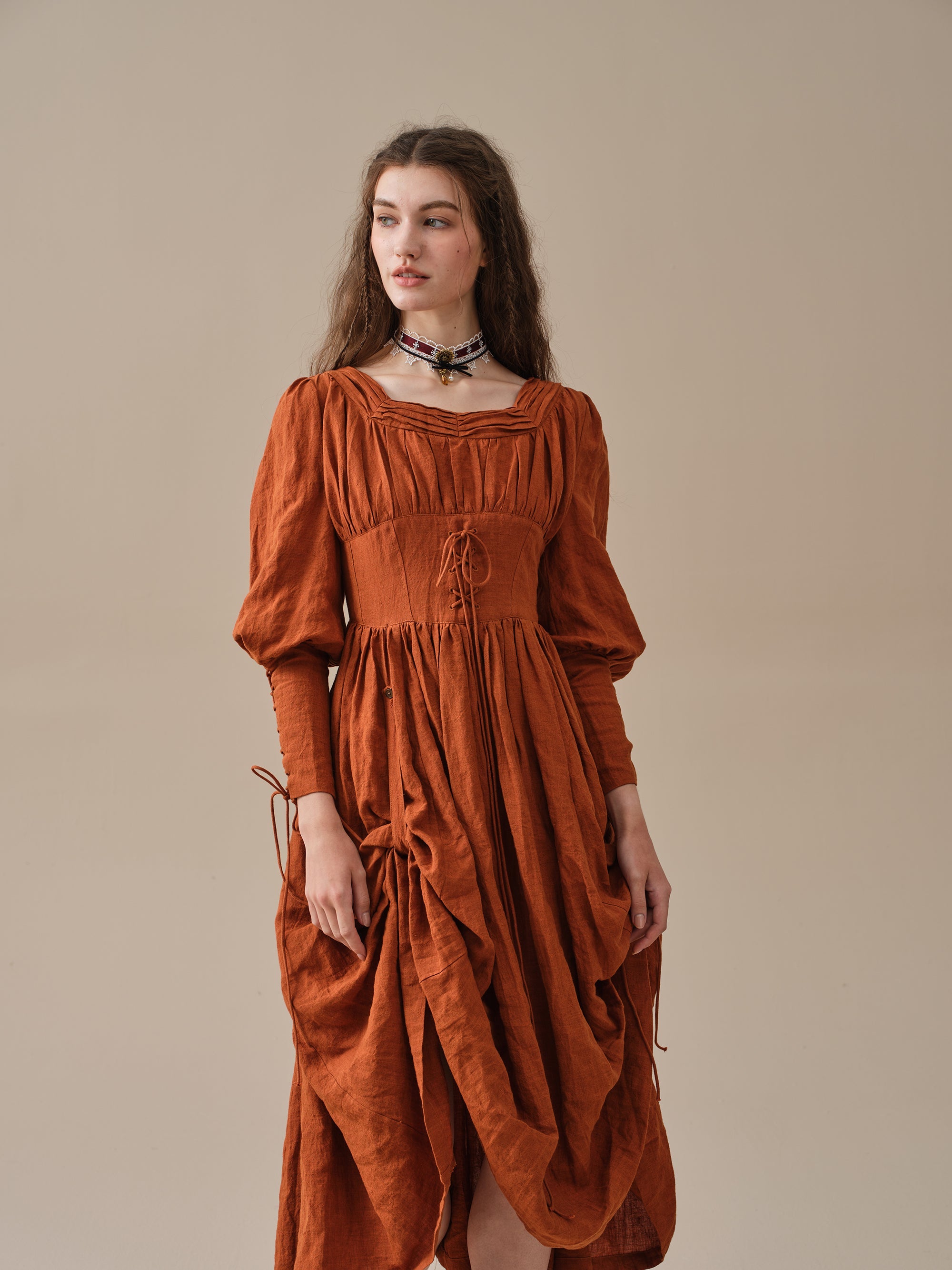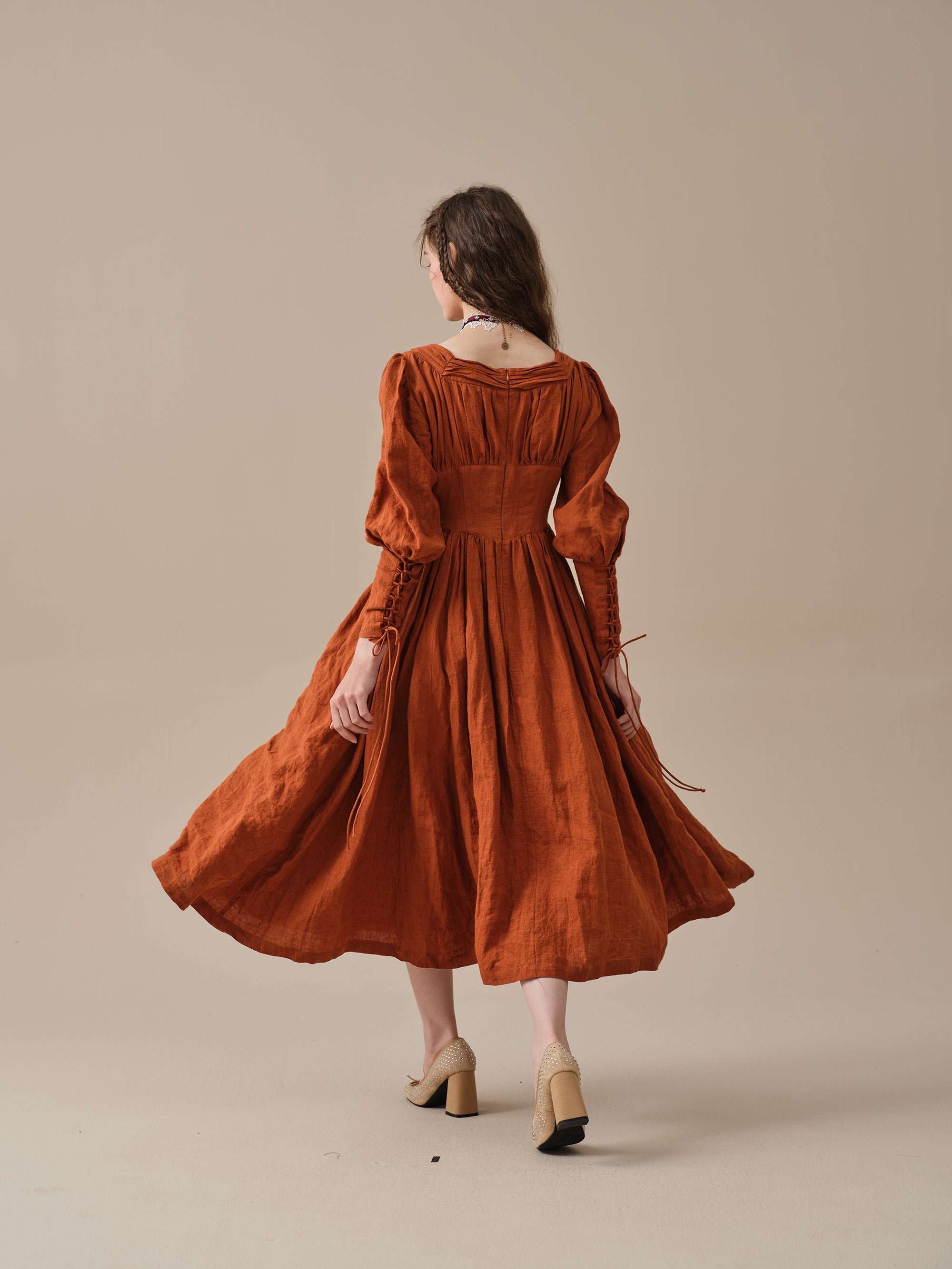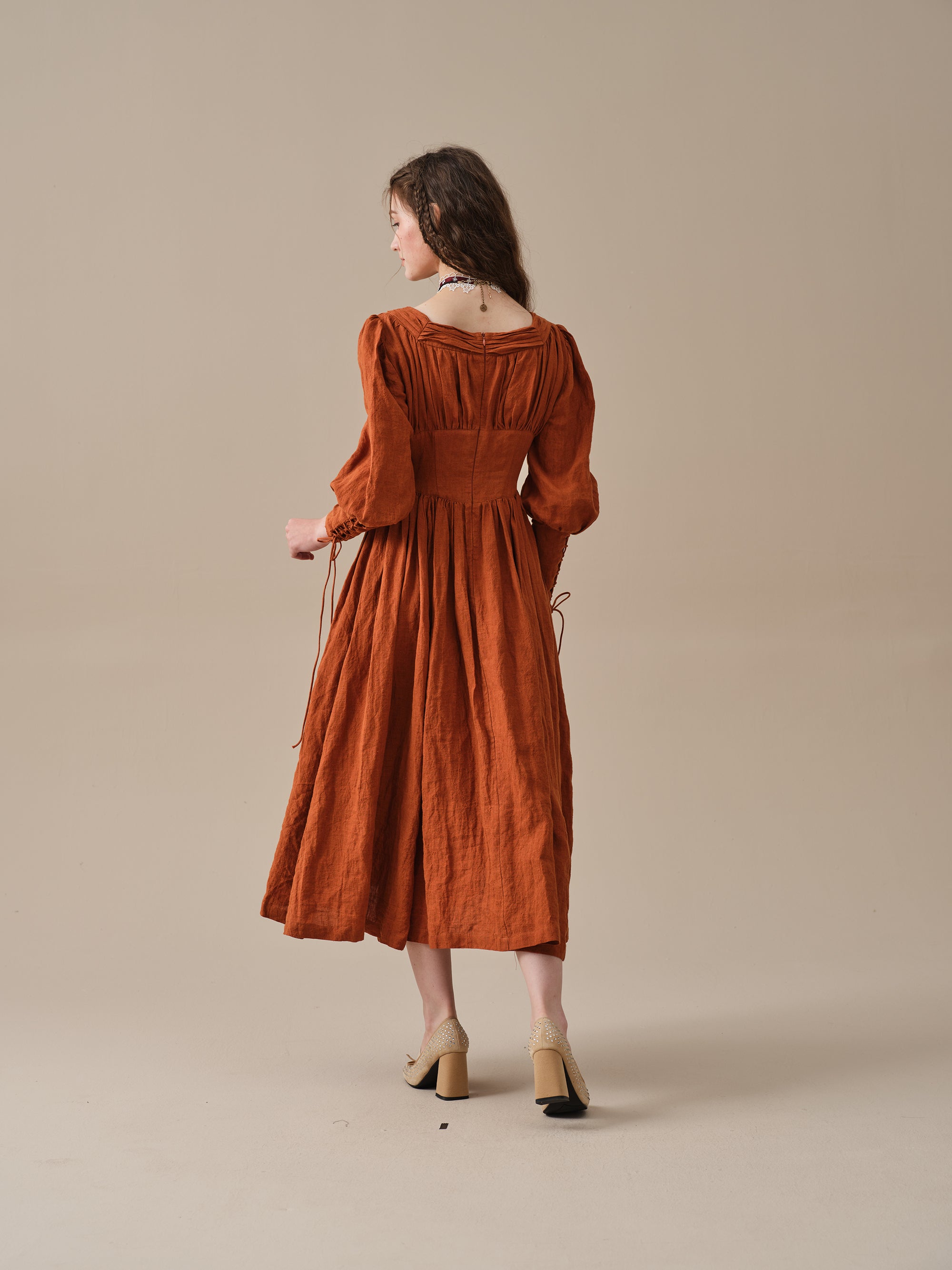 Inspired by vintage fashion, this dress captures the essence of femininity and romance.The pleated detail at the neckline adds sophistication while giving it a whimsical feel. The lace up at the waist and sleeves adds a romantic touch to the piece.