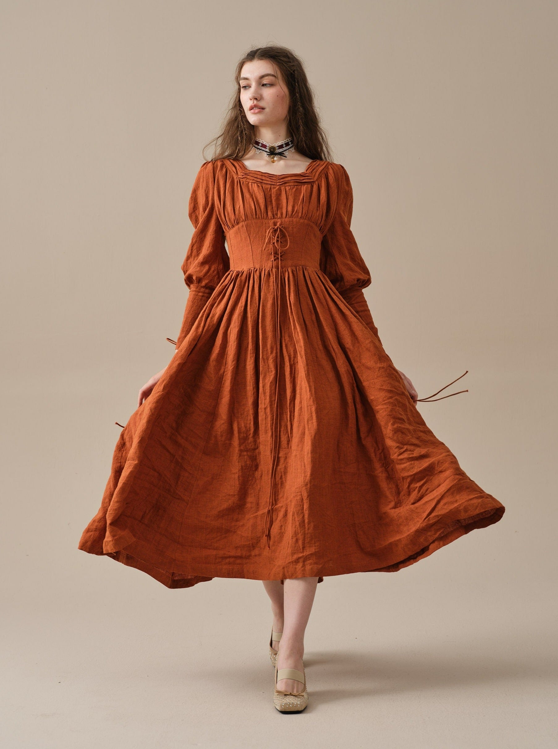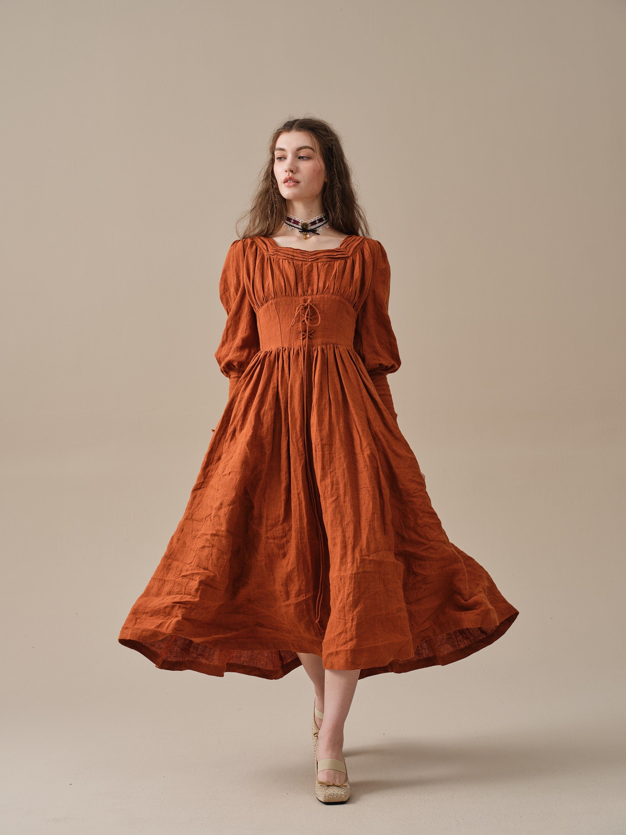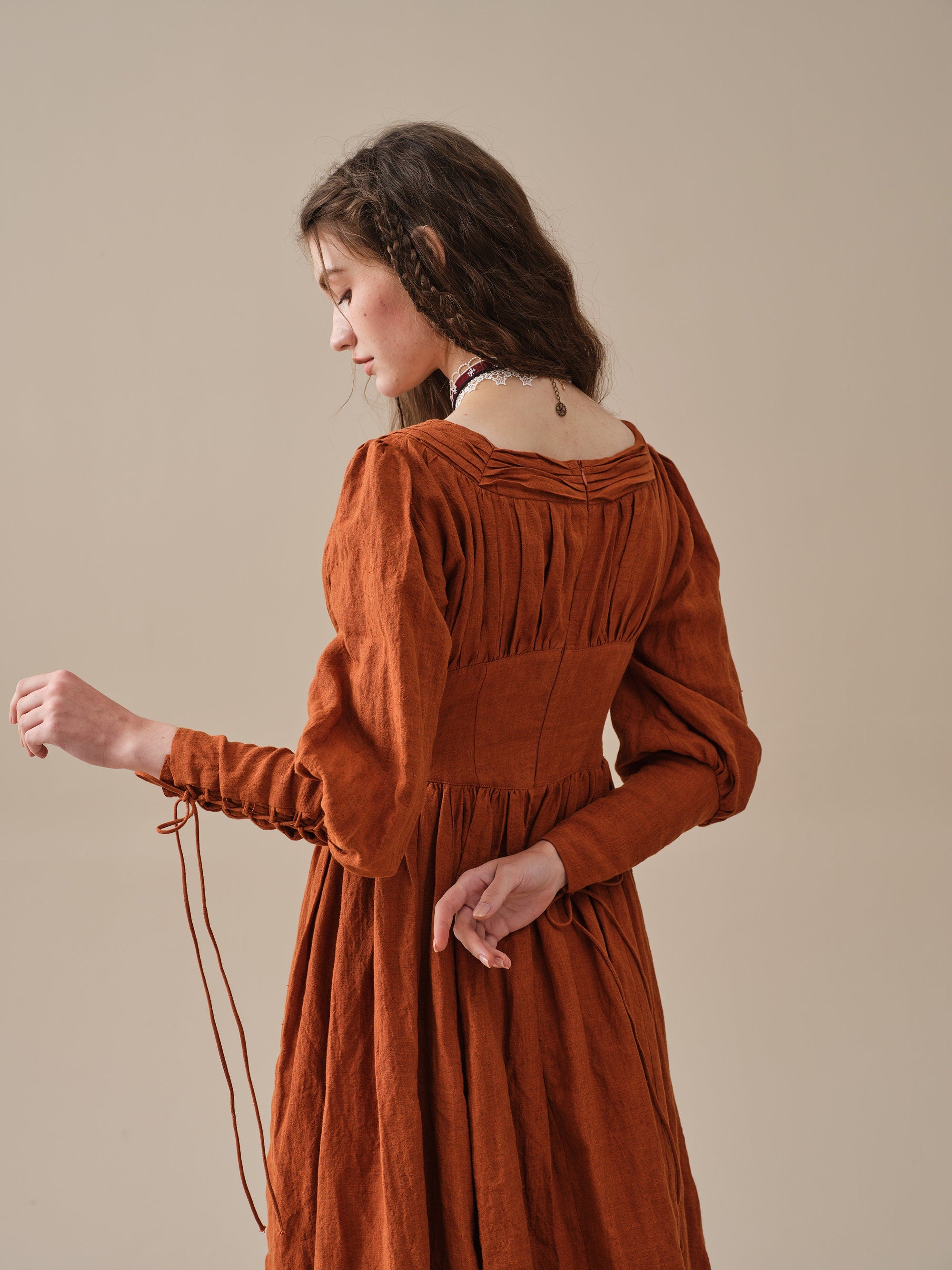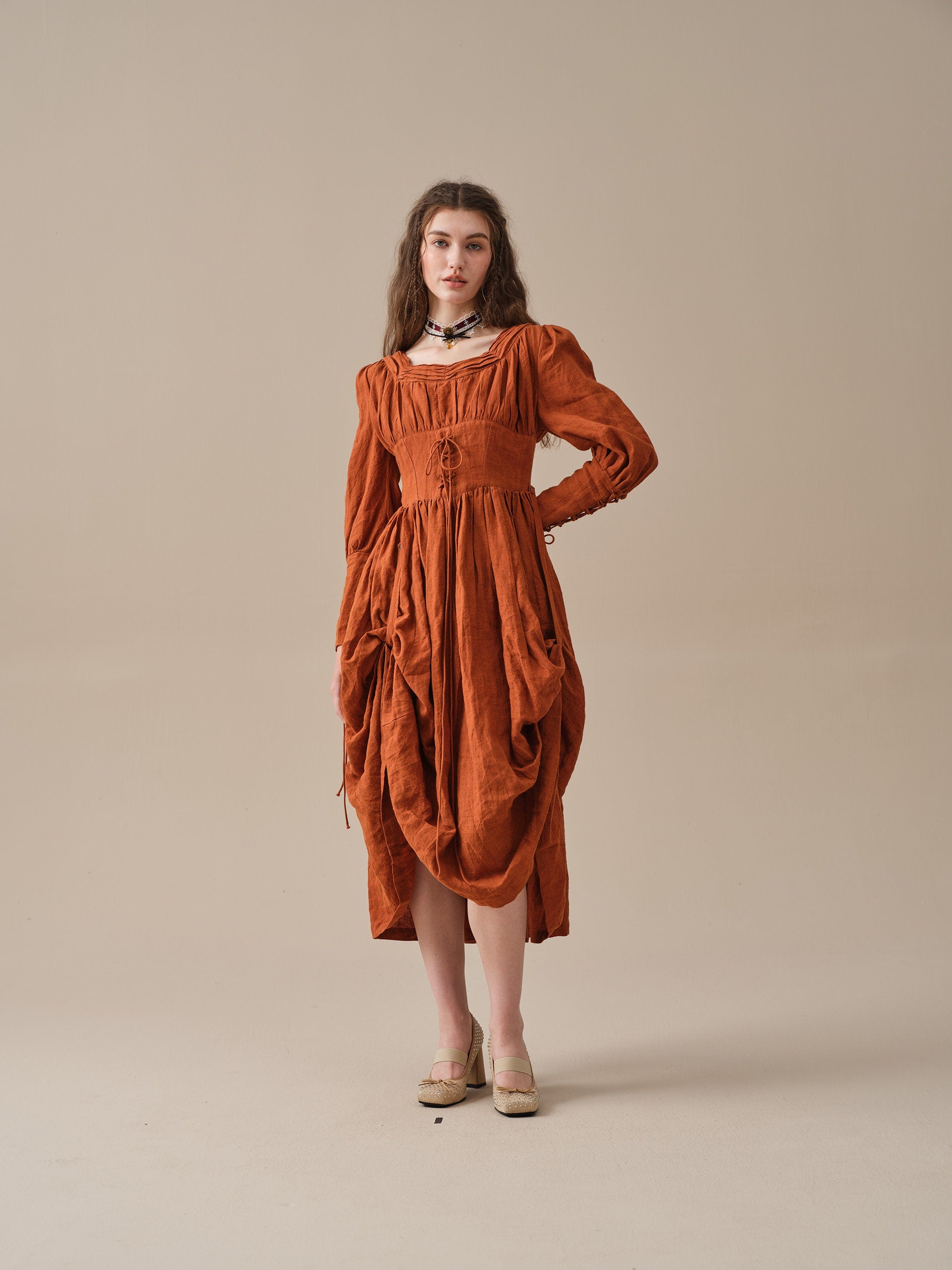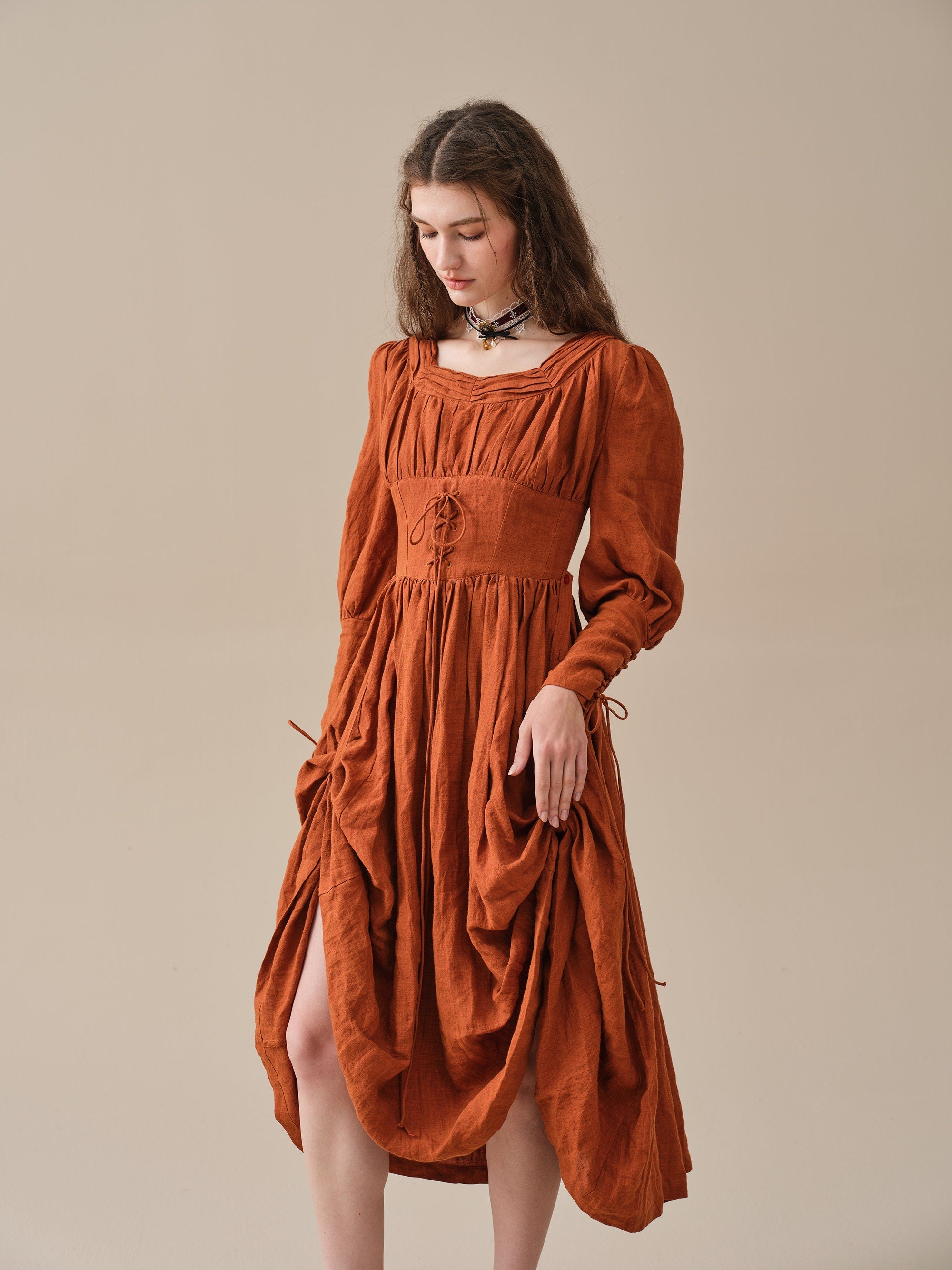 Inspired by vintage fashion, this dress captures the essence of femininity and romance.The pleated detail at the neckline adds sophistication while giving it a whimsical feel. The lace up at the waist and sleeves adds a romantic touch to the piece.