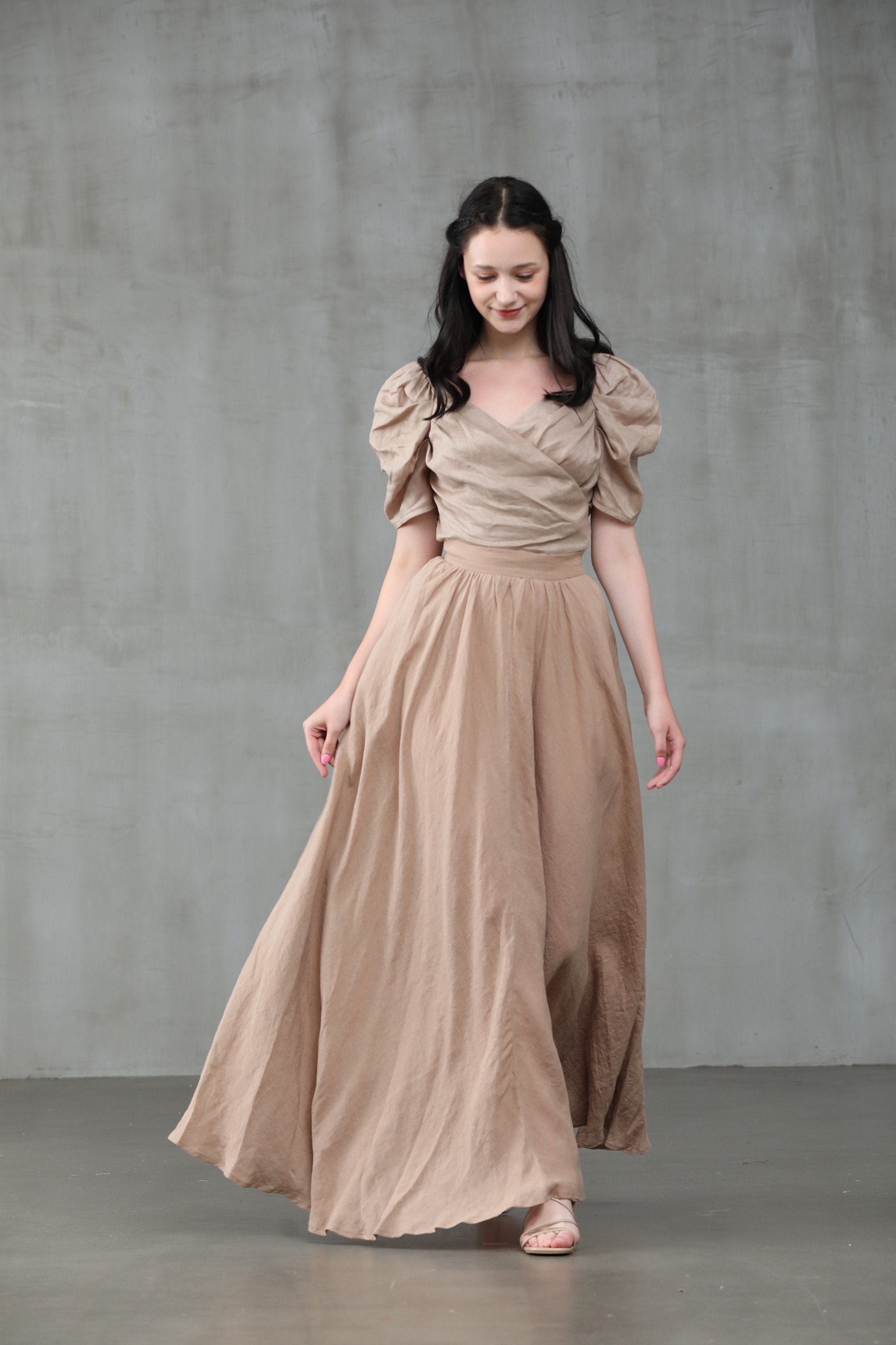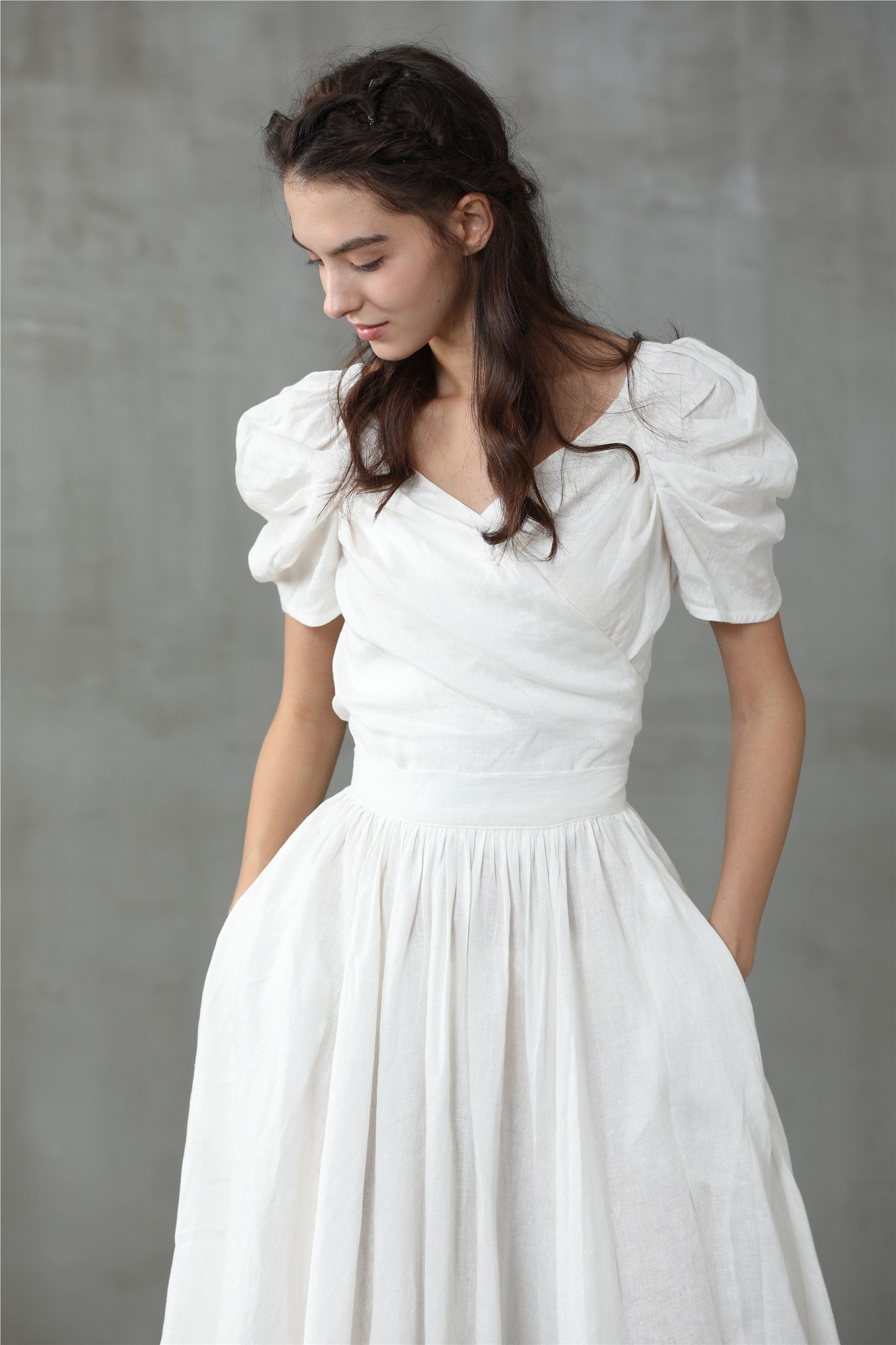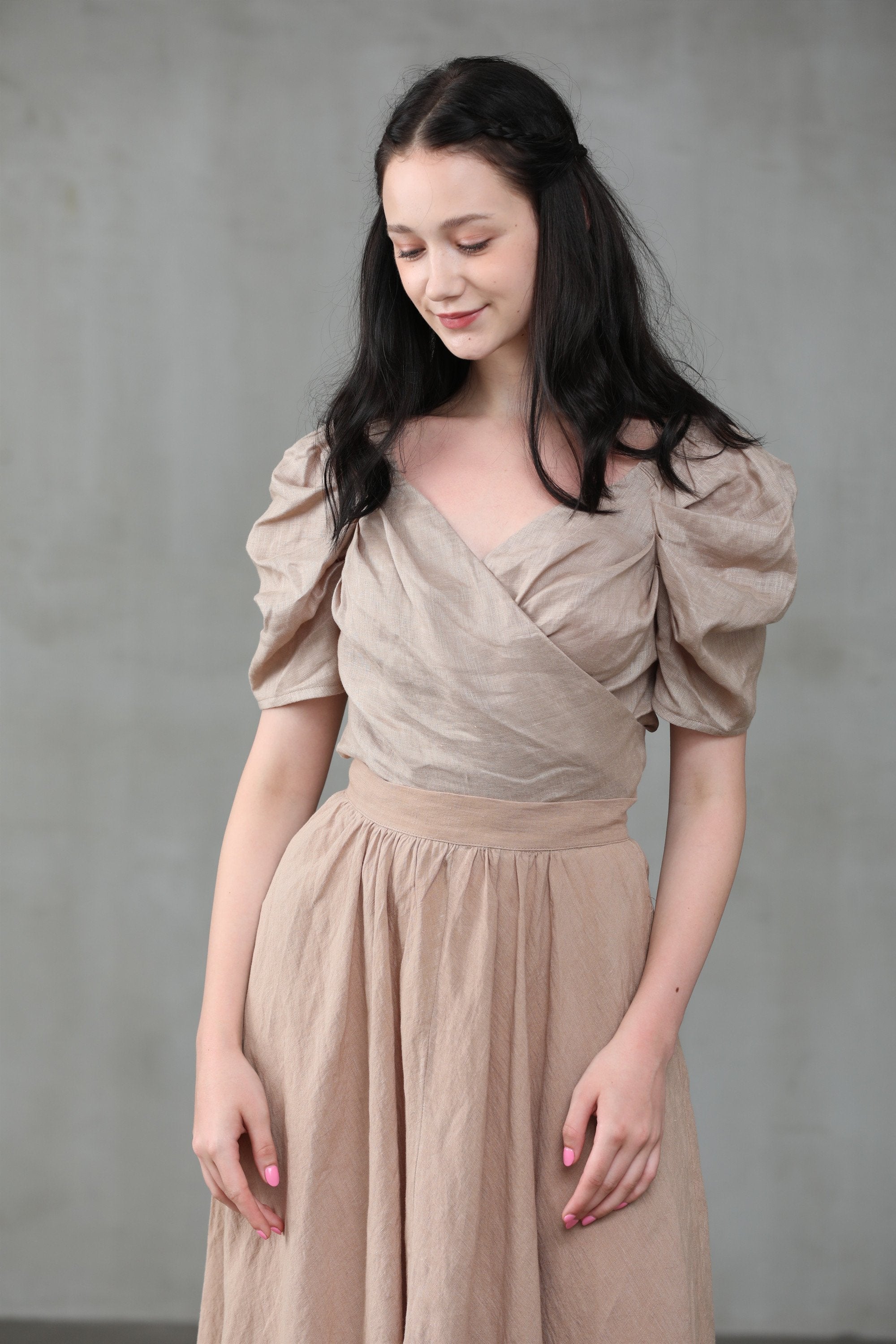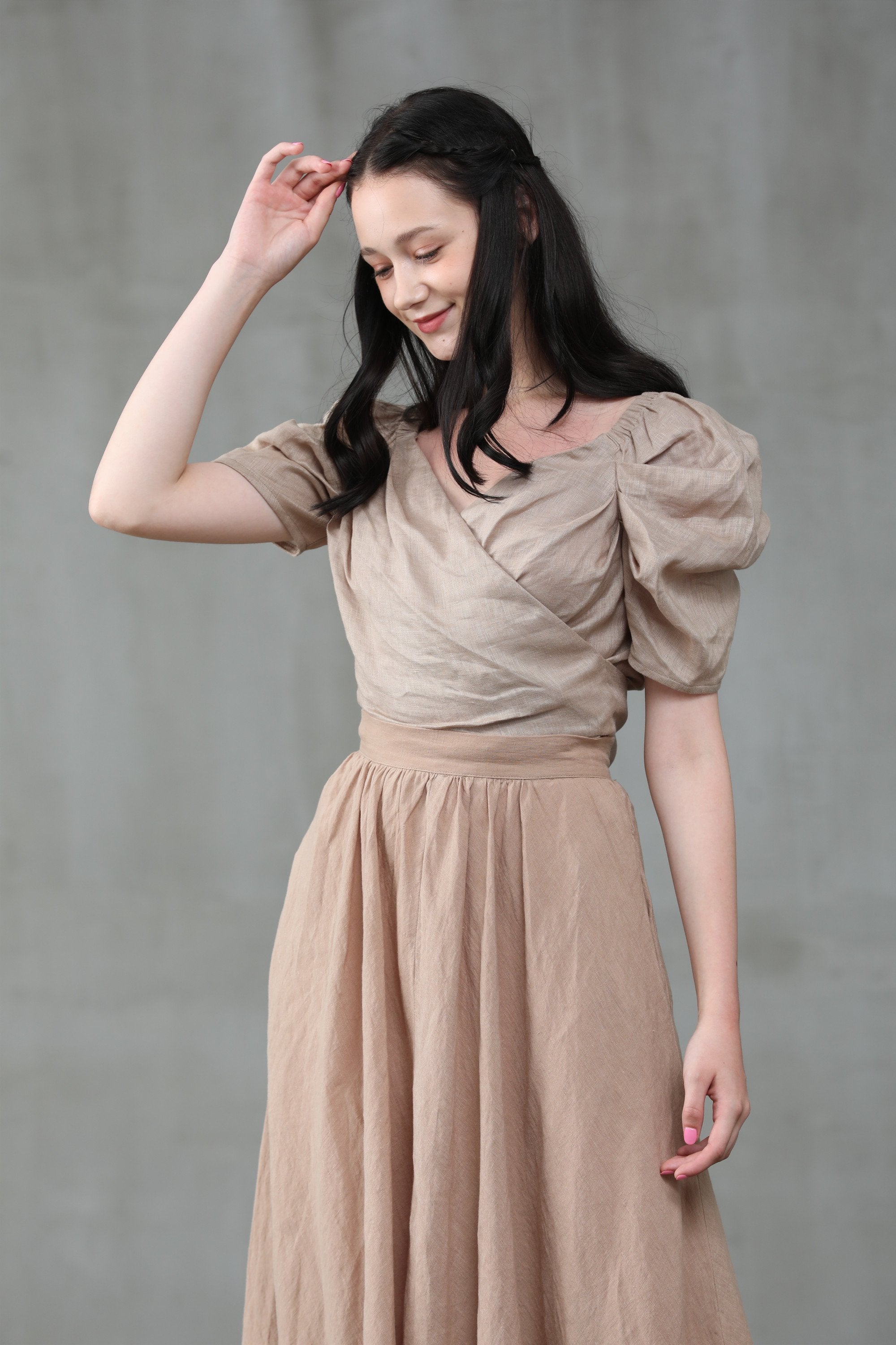 This natural linen wrapped blouse from Linennaive is just the go-to number with its gorgeous fitted silhouette will have you blossoming with confidence. So go ahead and pick up this blooming great top. Featuring a V neck, stitched panels and puff sleeves.