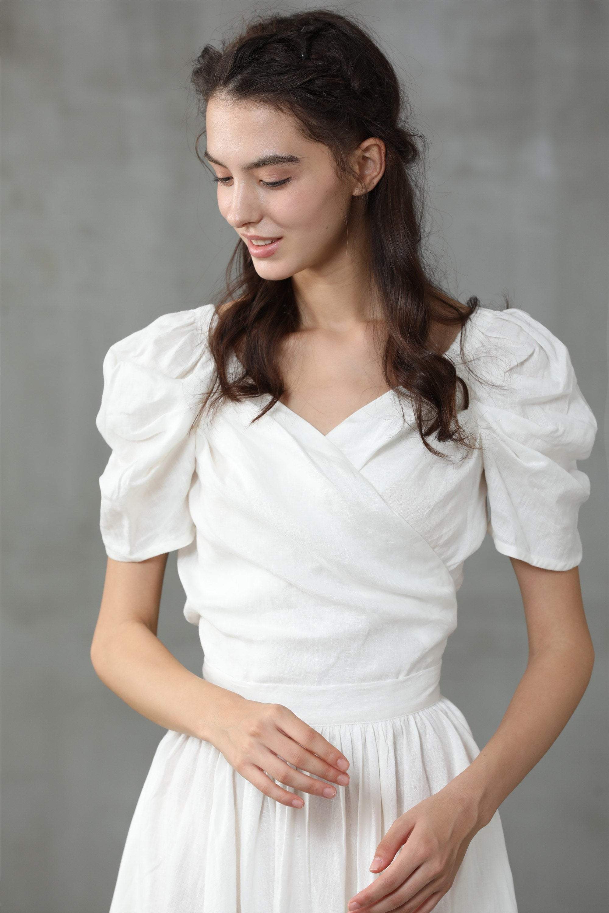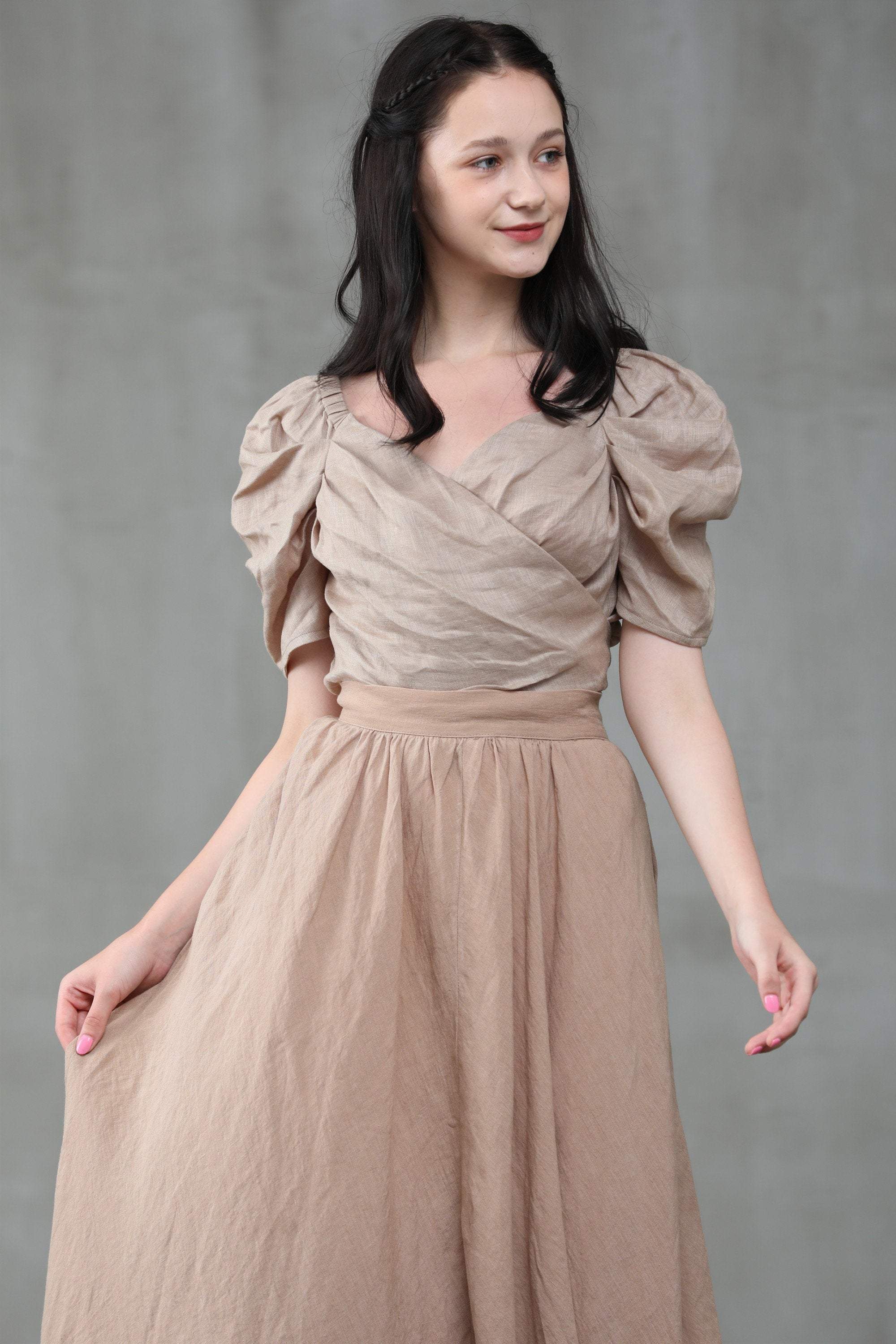 This natural linen wrapped blouse from Linennaive is just the go-to number with its gorgeous fitted silhouette will have you blossoming with confidence. So go ahead and pick up this blooming great top. Featuring a V neck, stitched panels and puff sleeves.