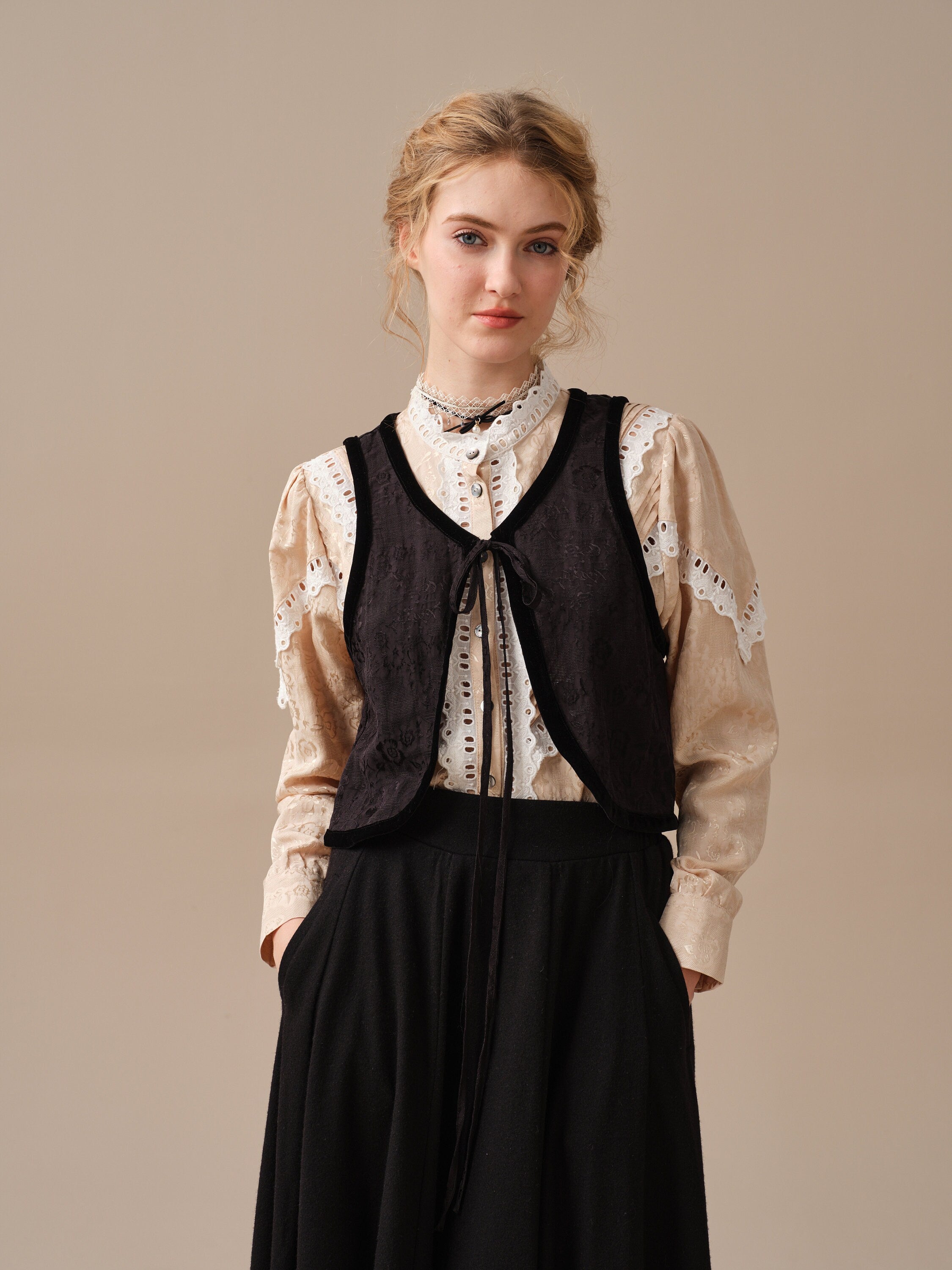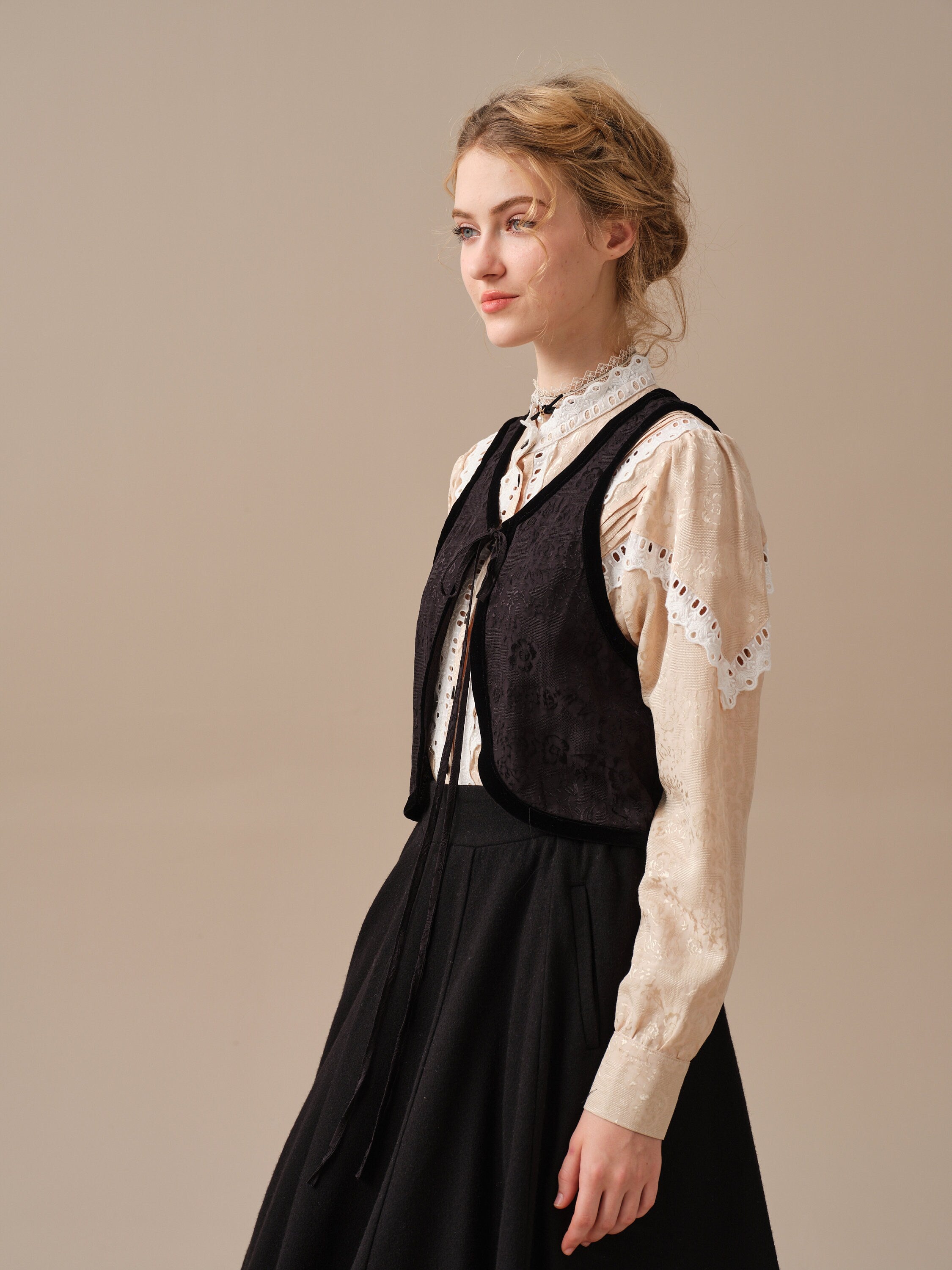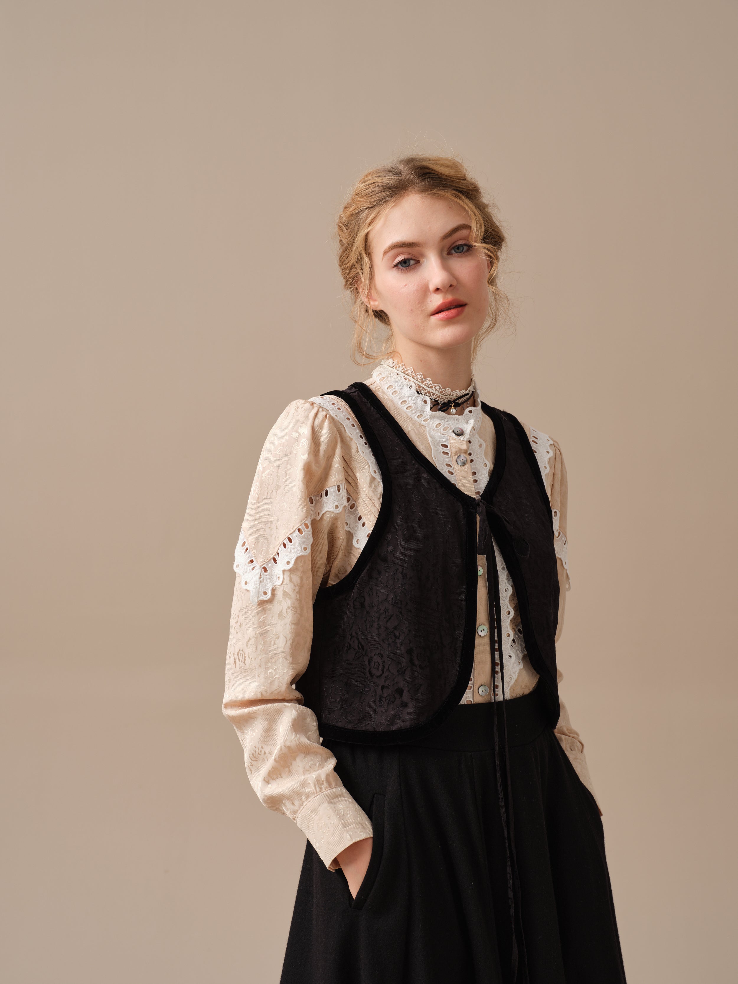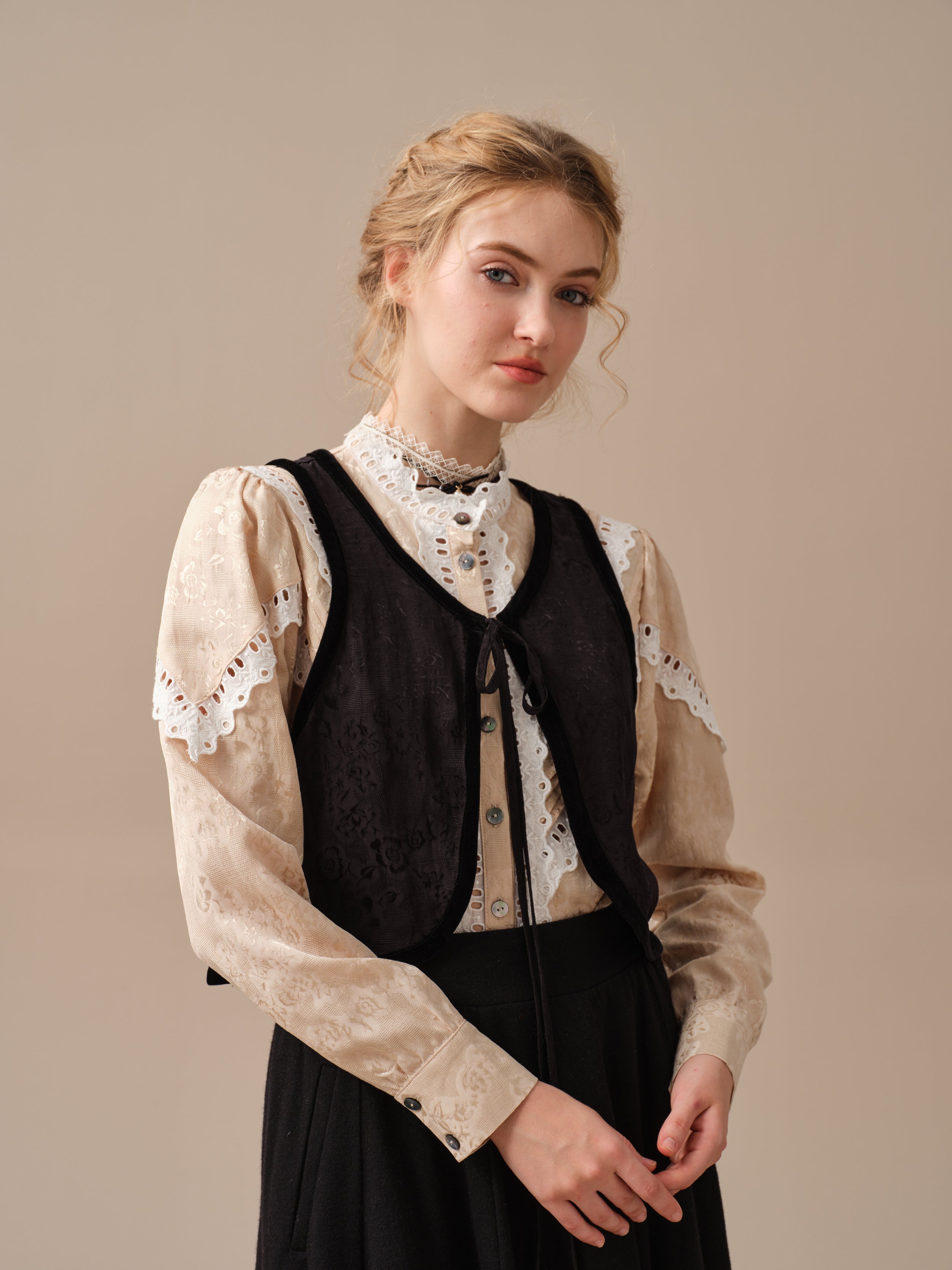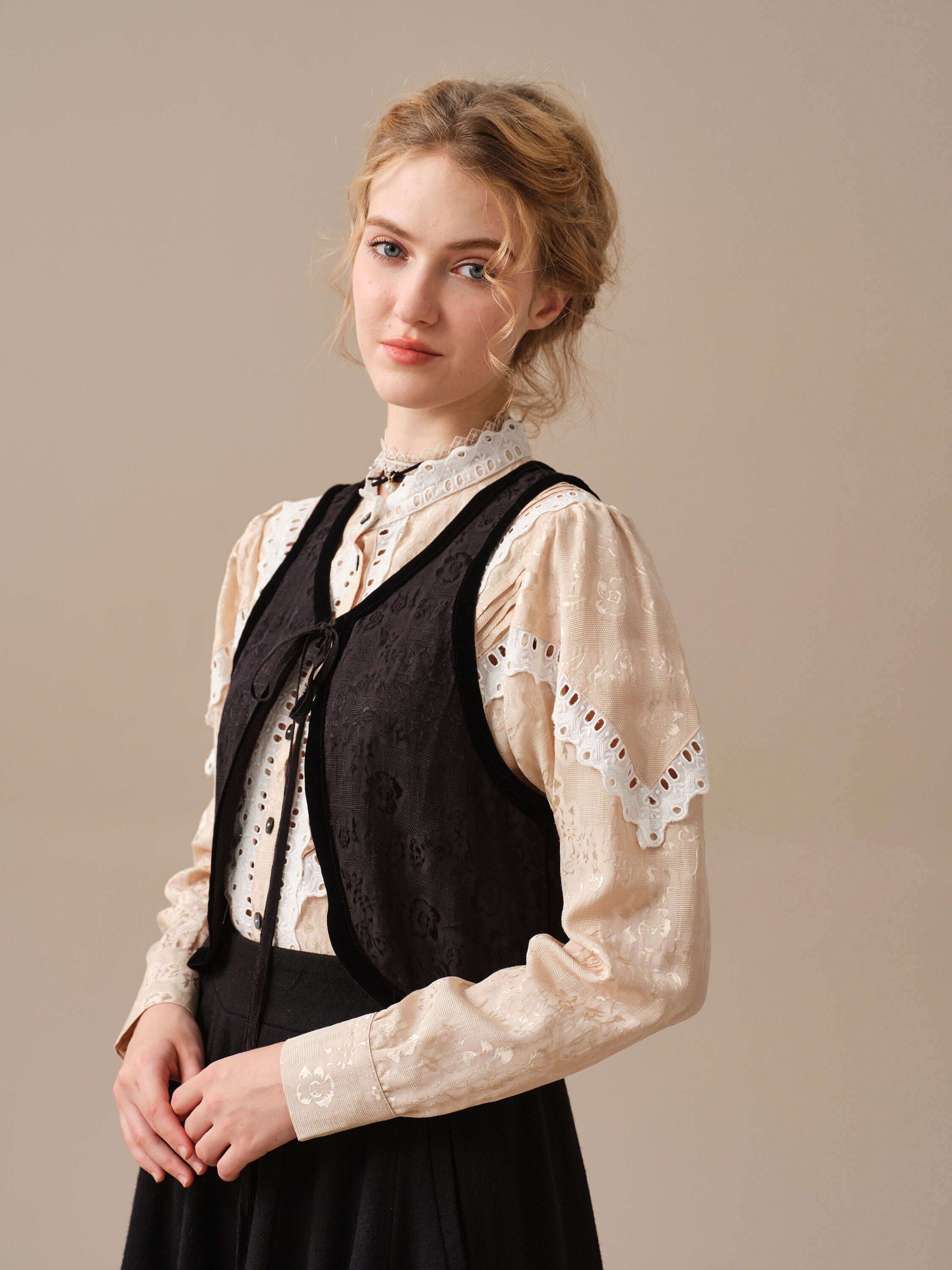 This blouse can be worn separately or paired with a black vest to create a retro and sophisticated look.