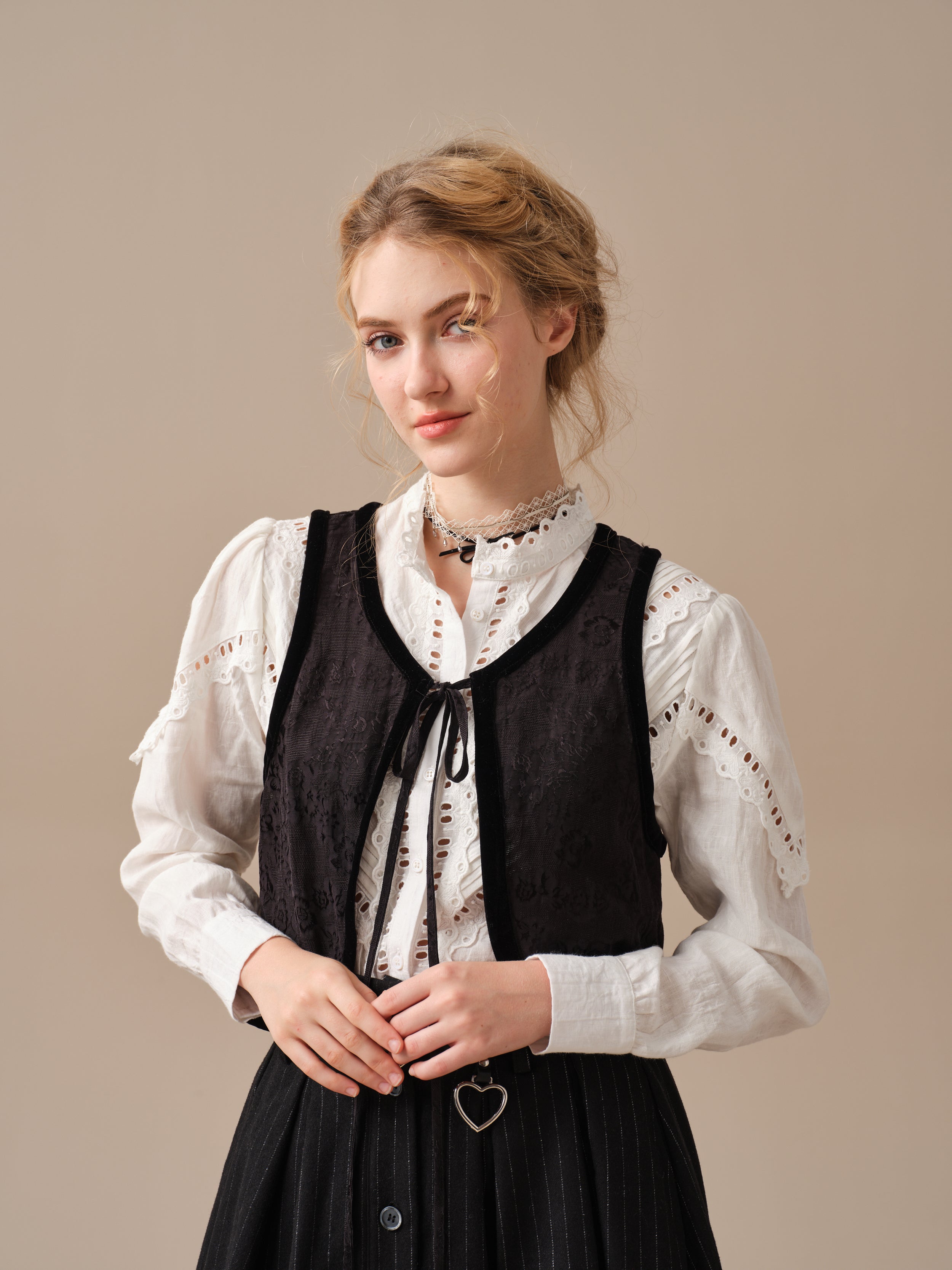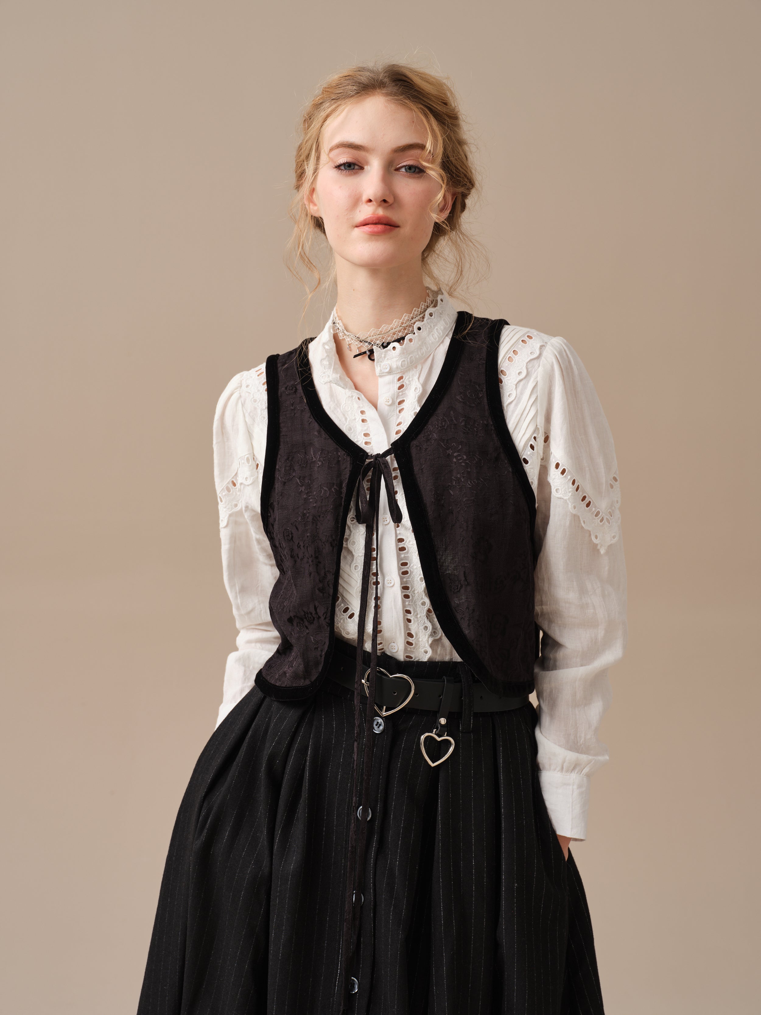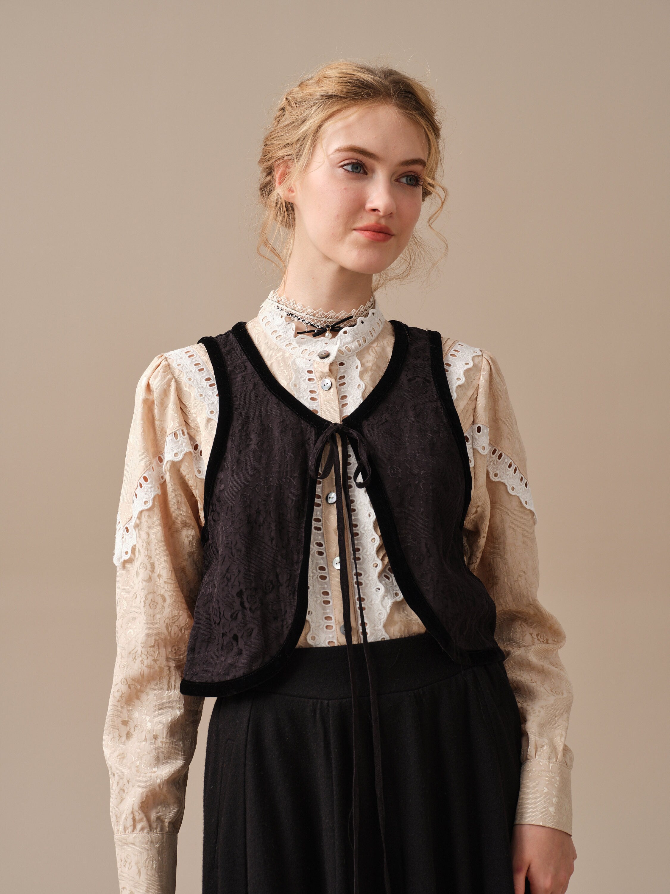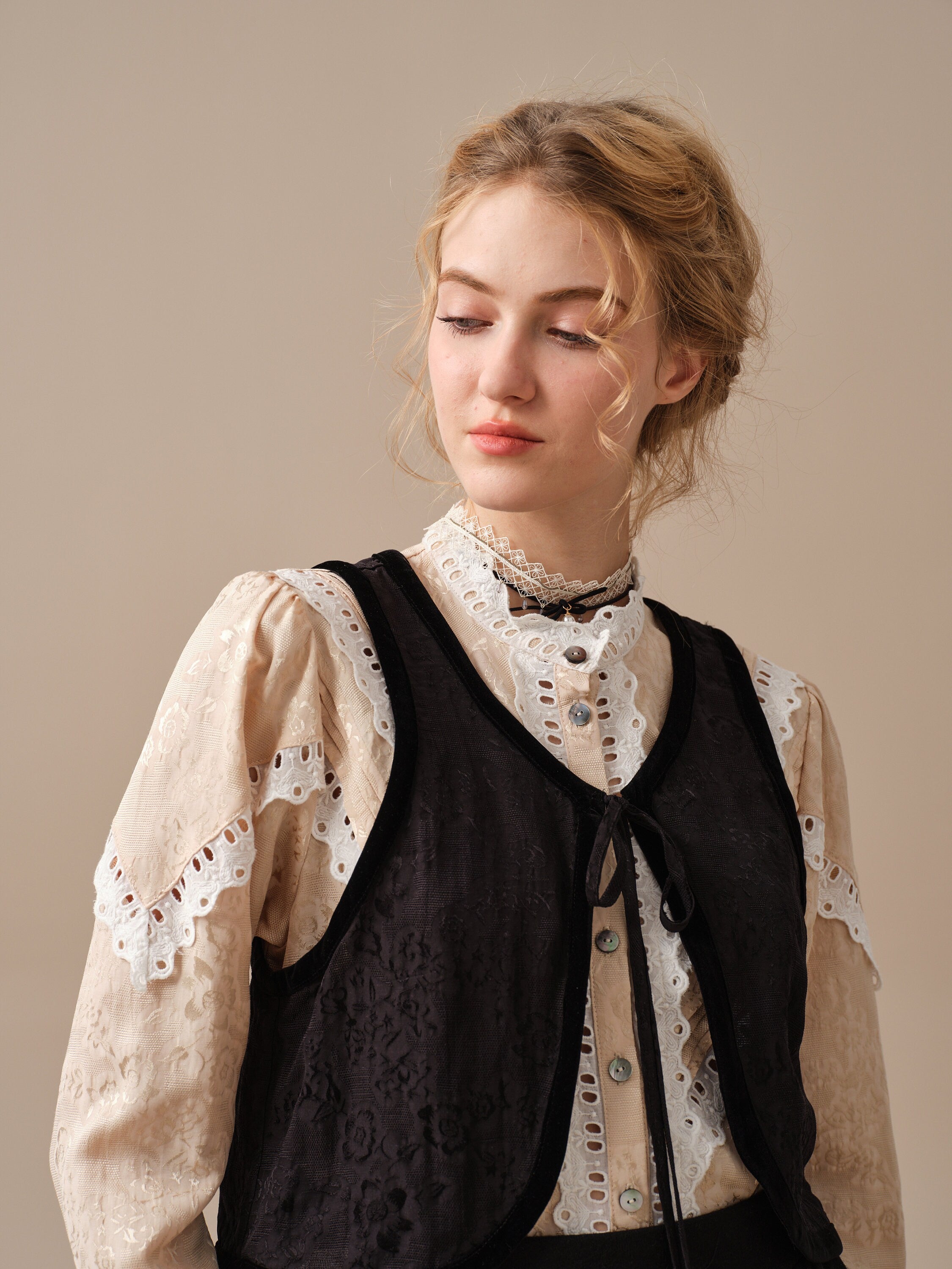 This blouse can be worn separately or paired with a black vest to create a retro and sophisticated look.