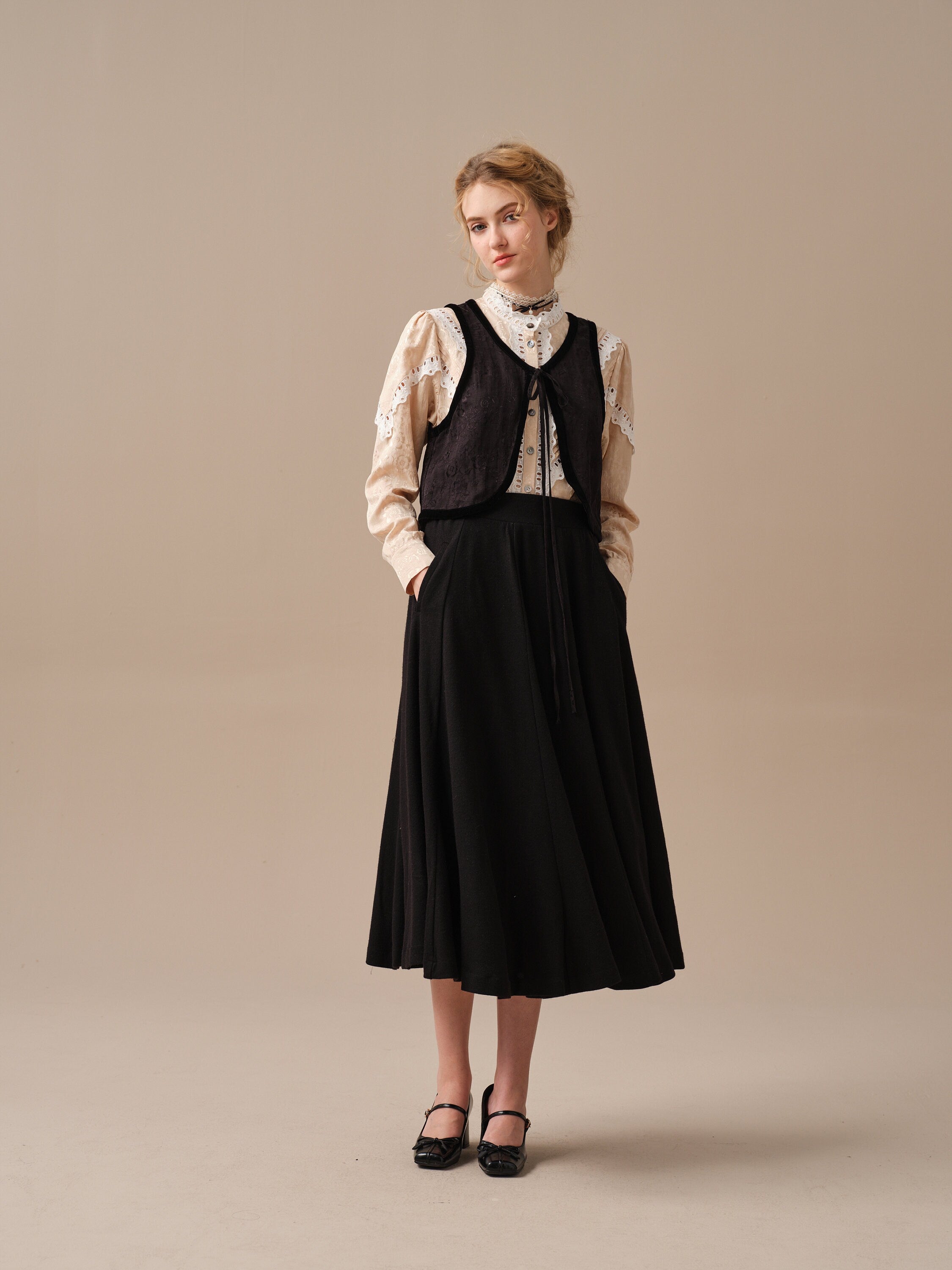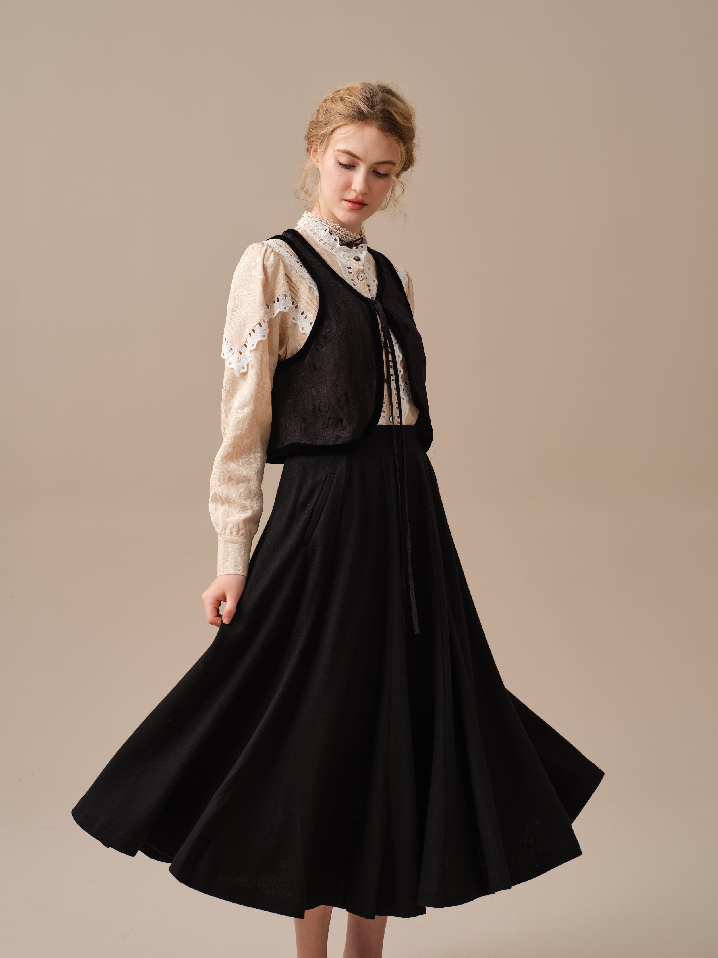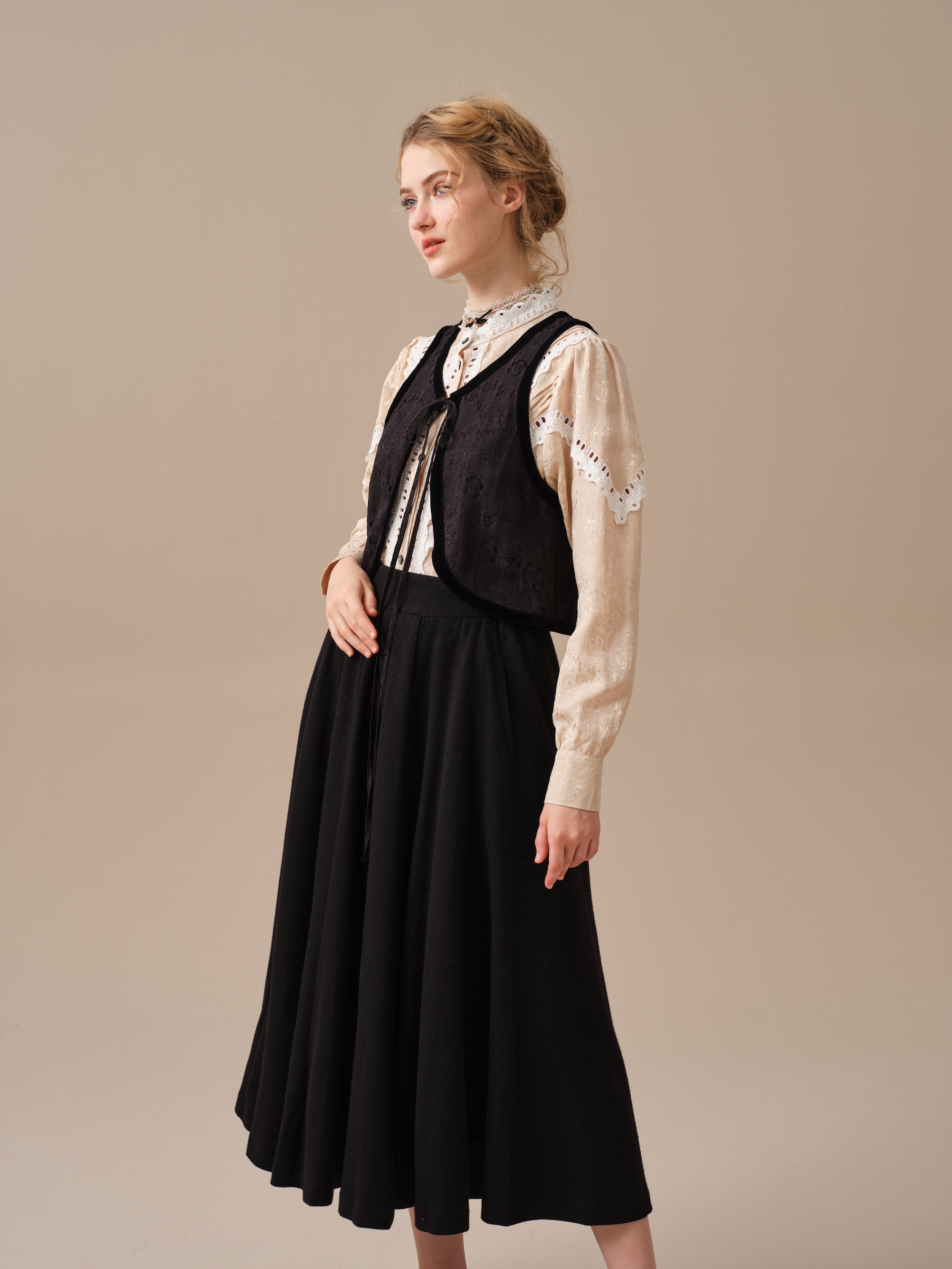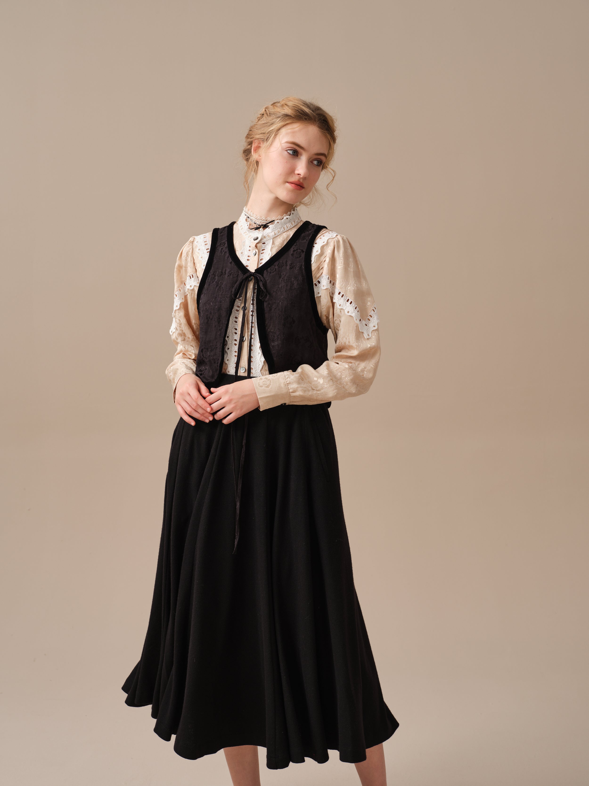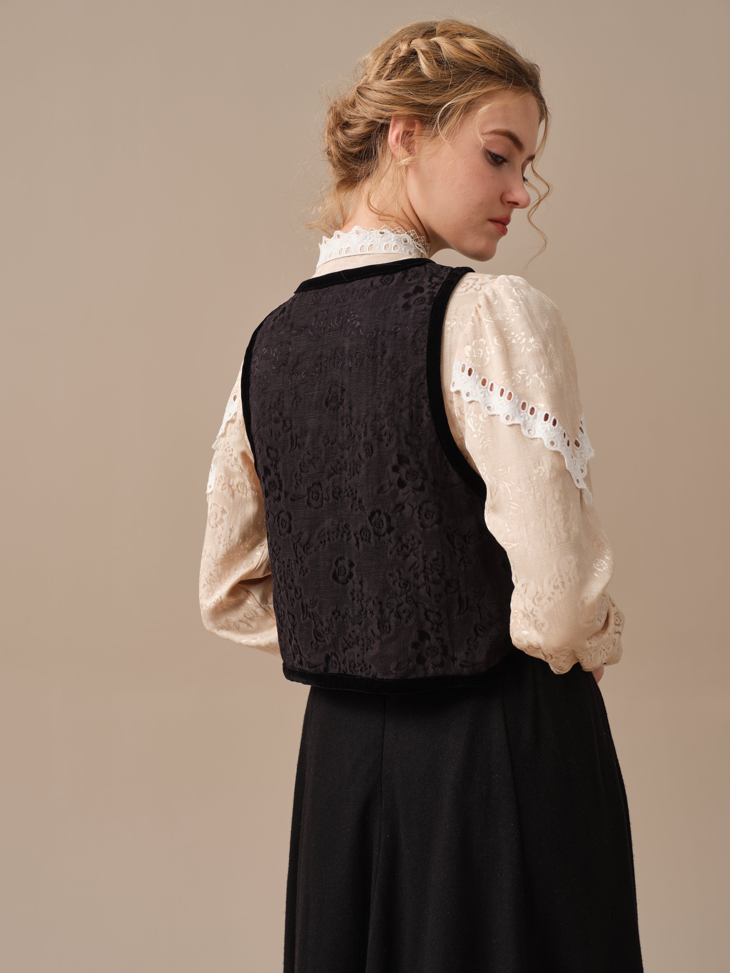 This blouse can be worn separately or paired with a black vest to create a retro and sophisticated look.
