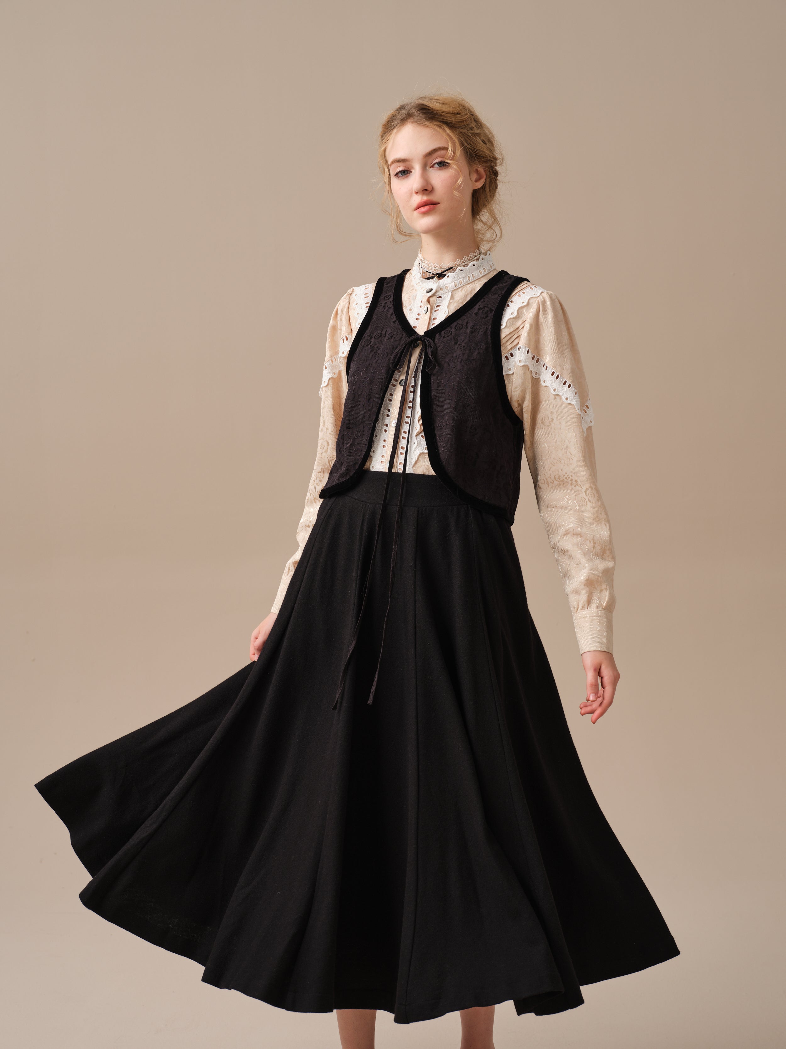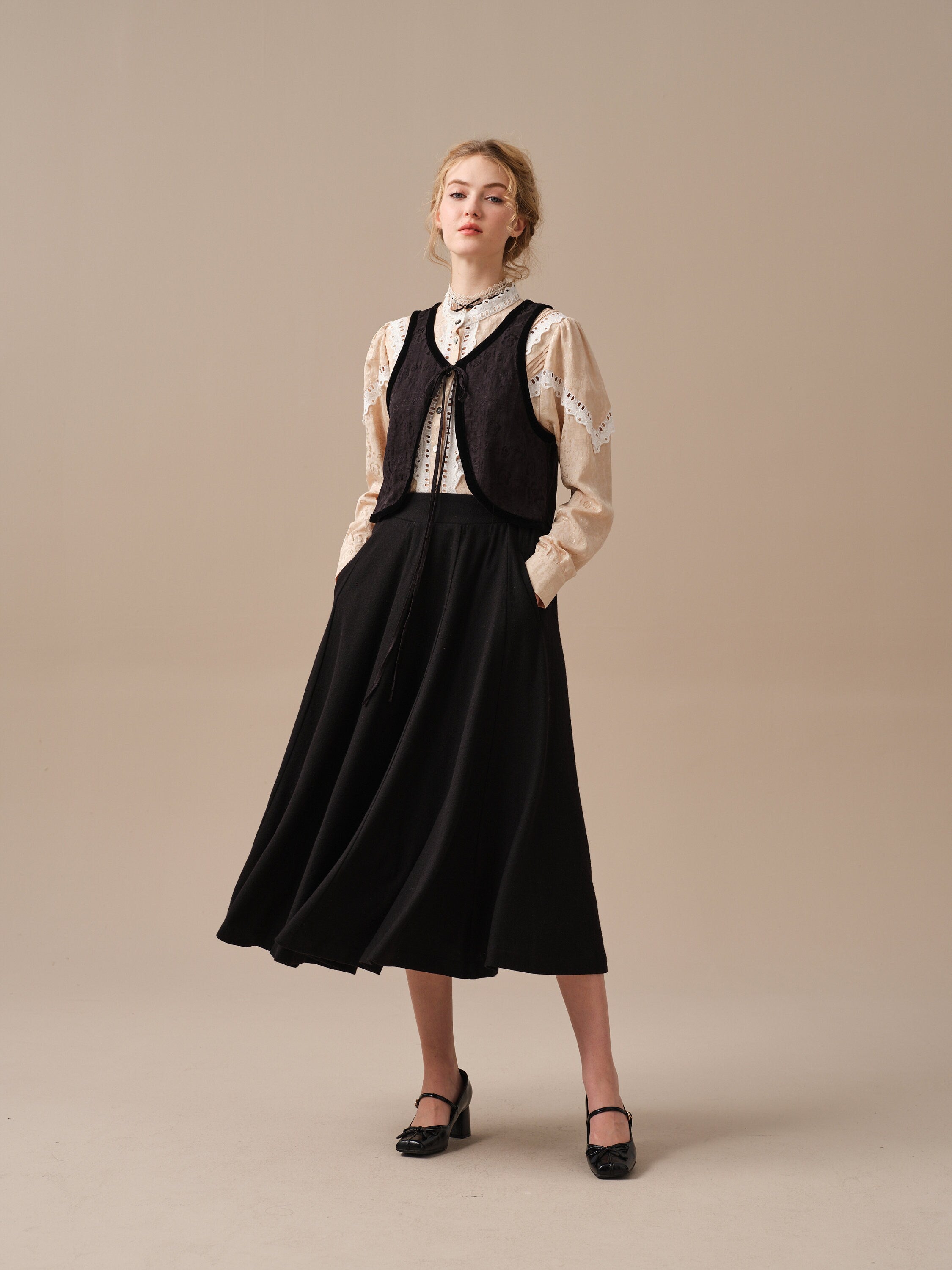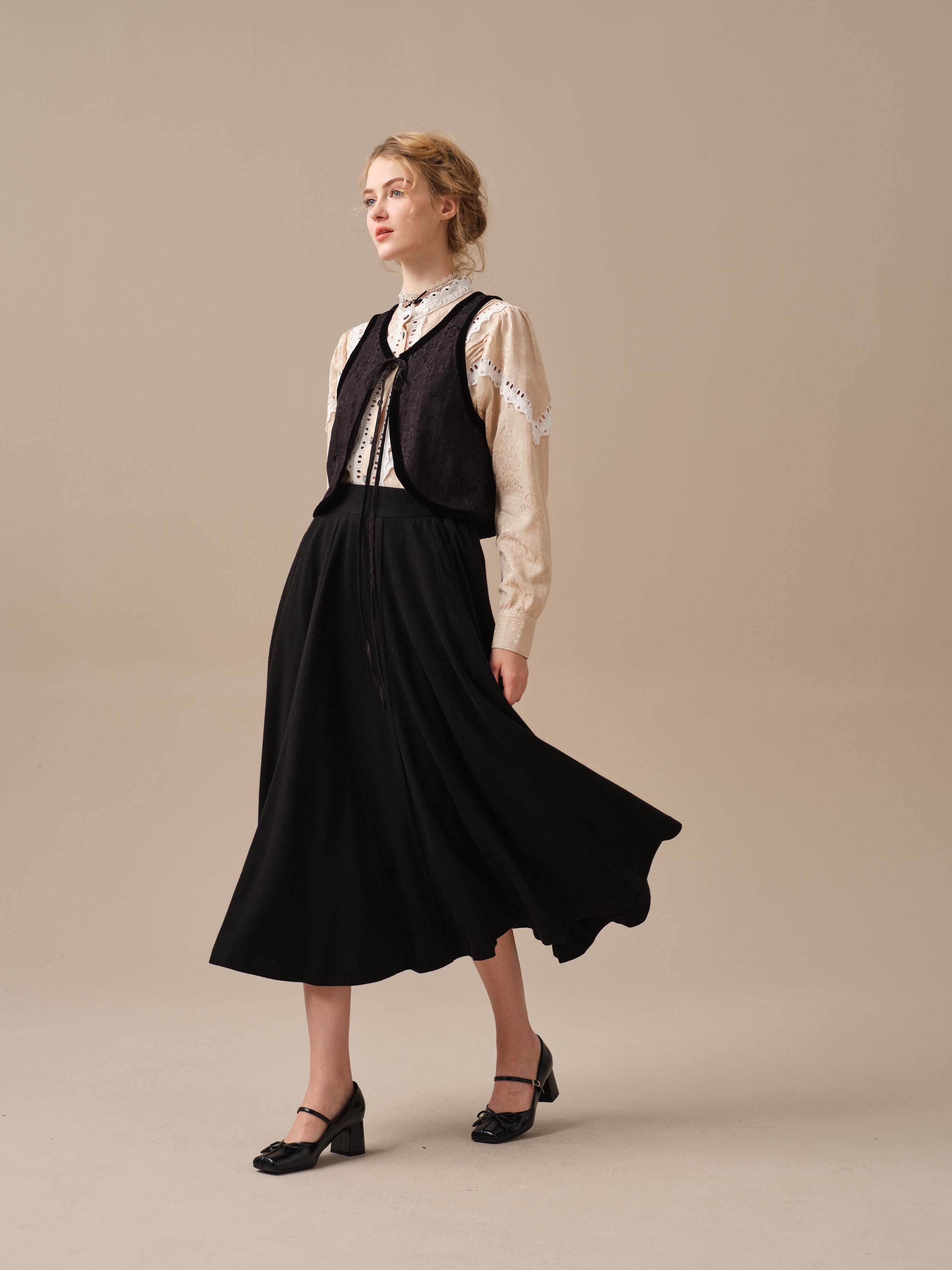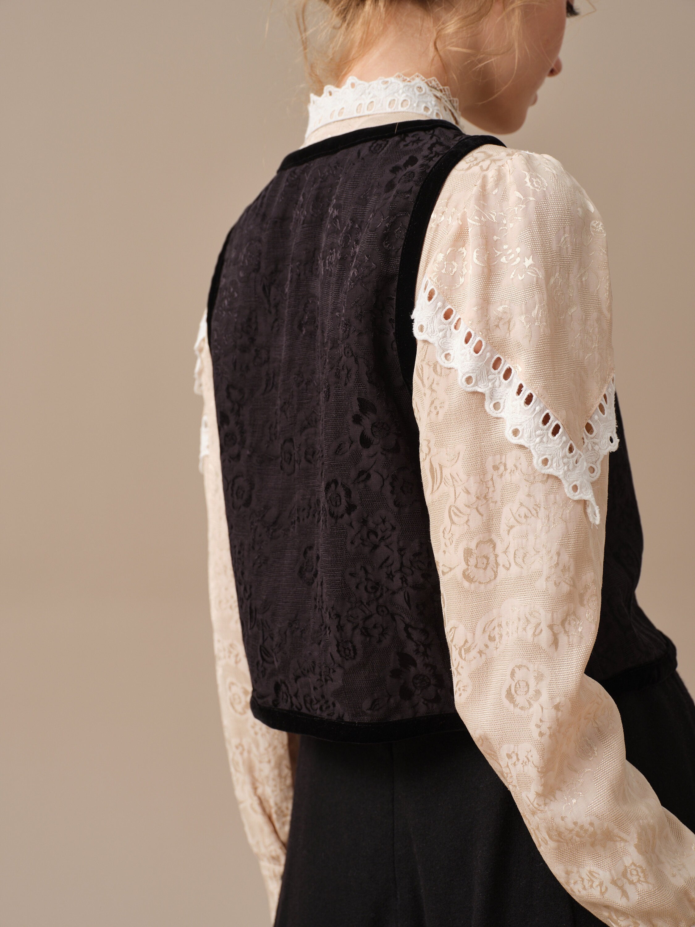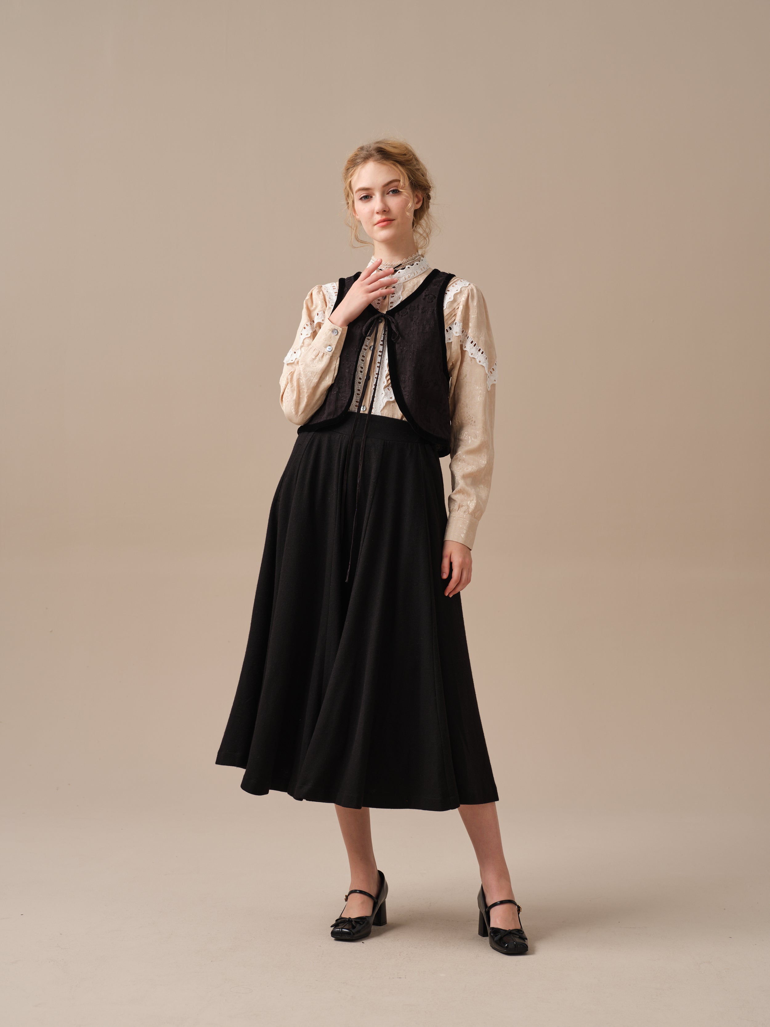This blouse can be worn separately or paired with a black vest to create a retro and sophisticated look.