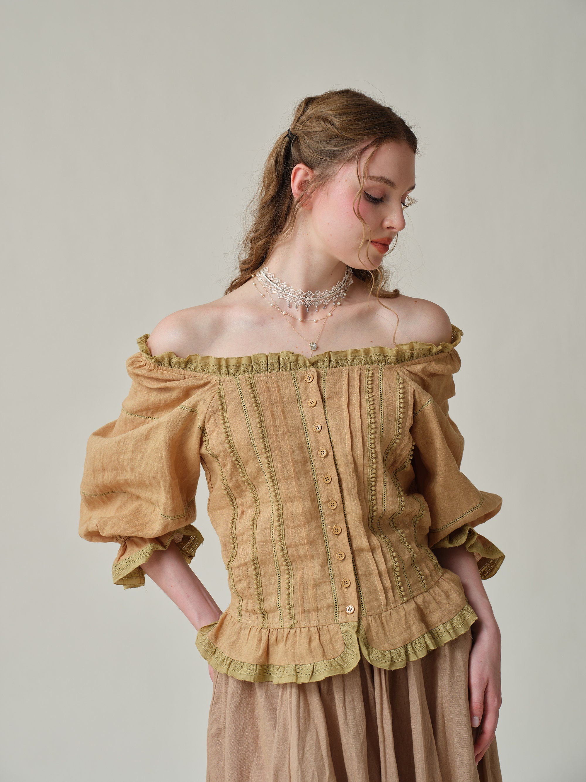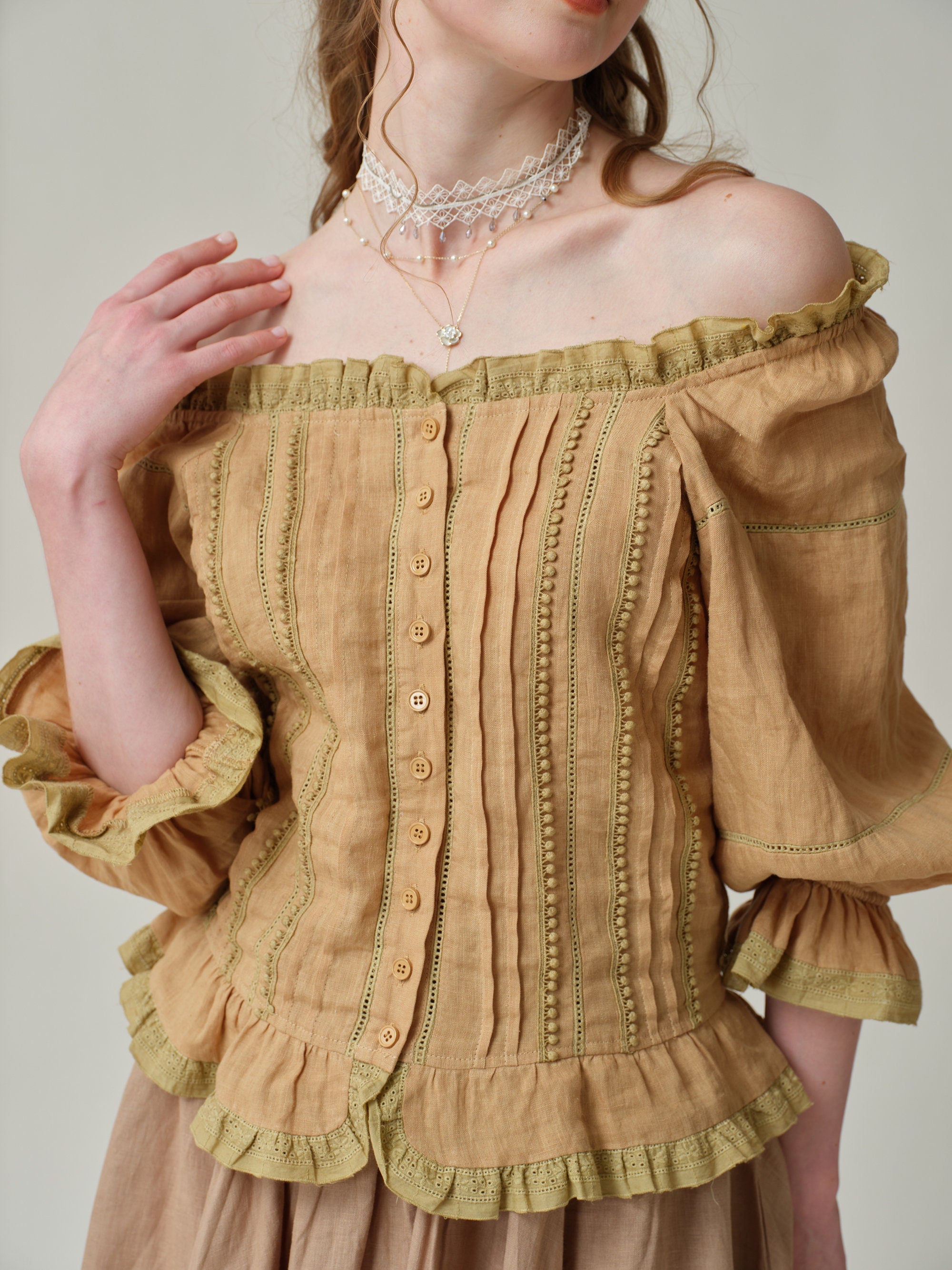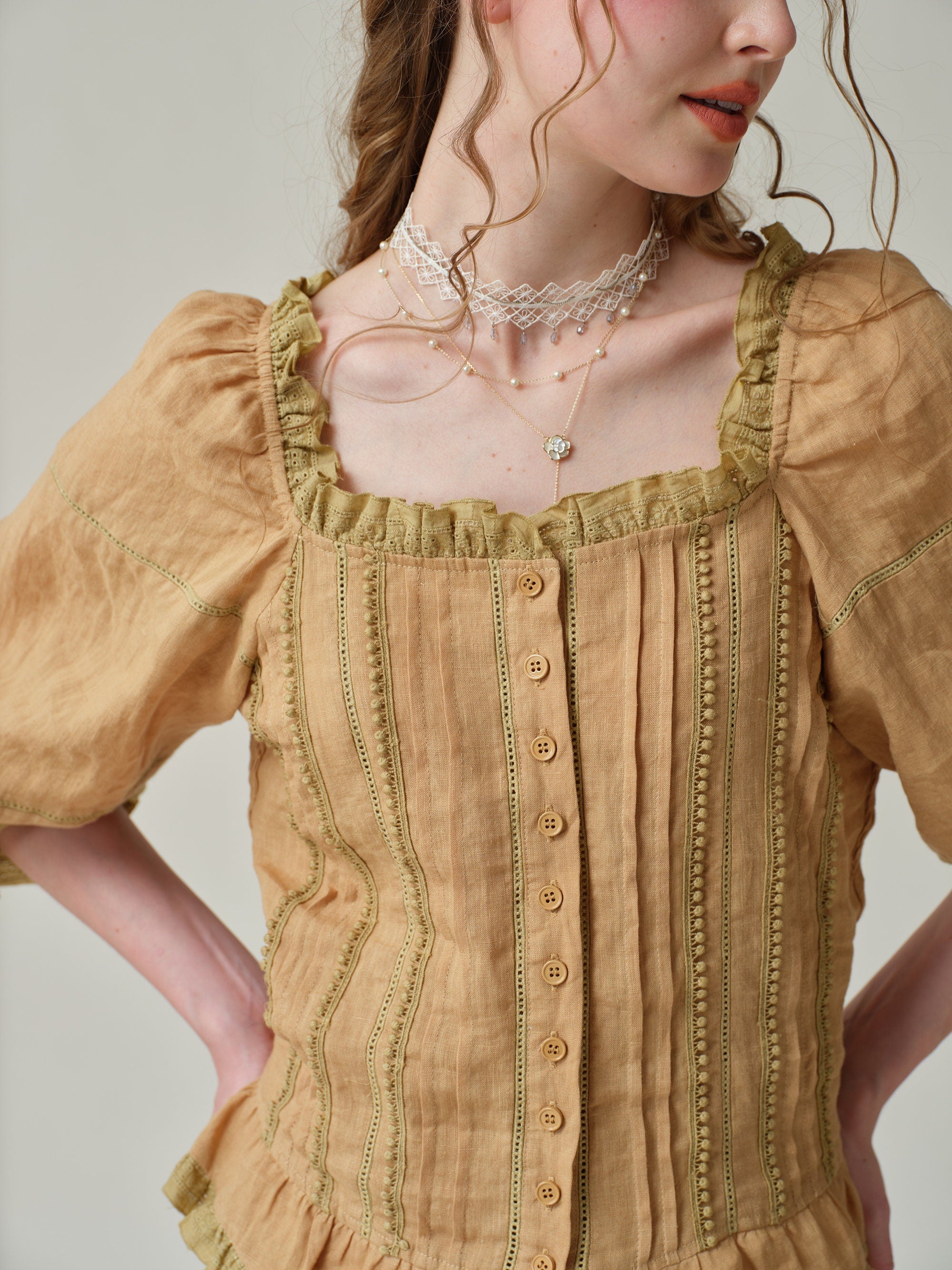 Made from soft linen and scattered with 4 different old French lace-trimmed, it has a vintage-inspired square neckline with romantic puffed sleeves and flared cuffs.