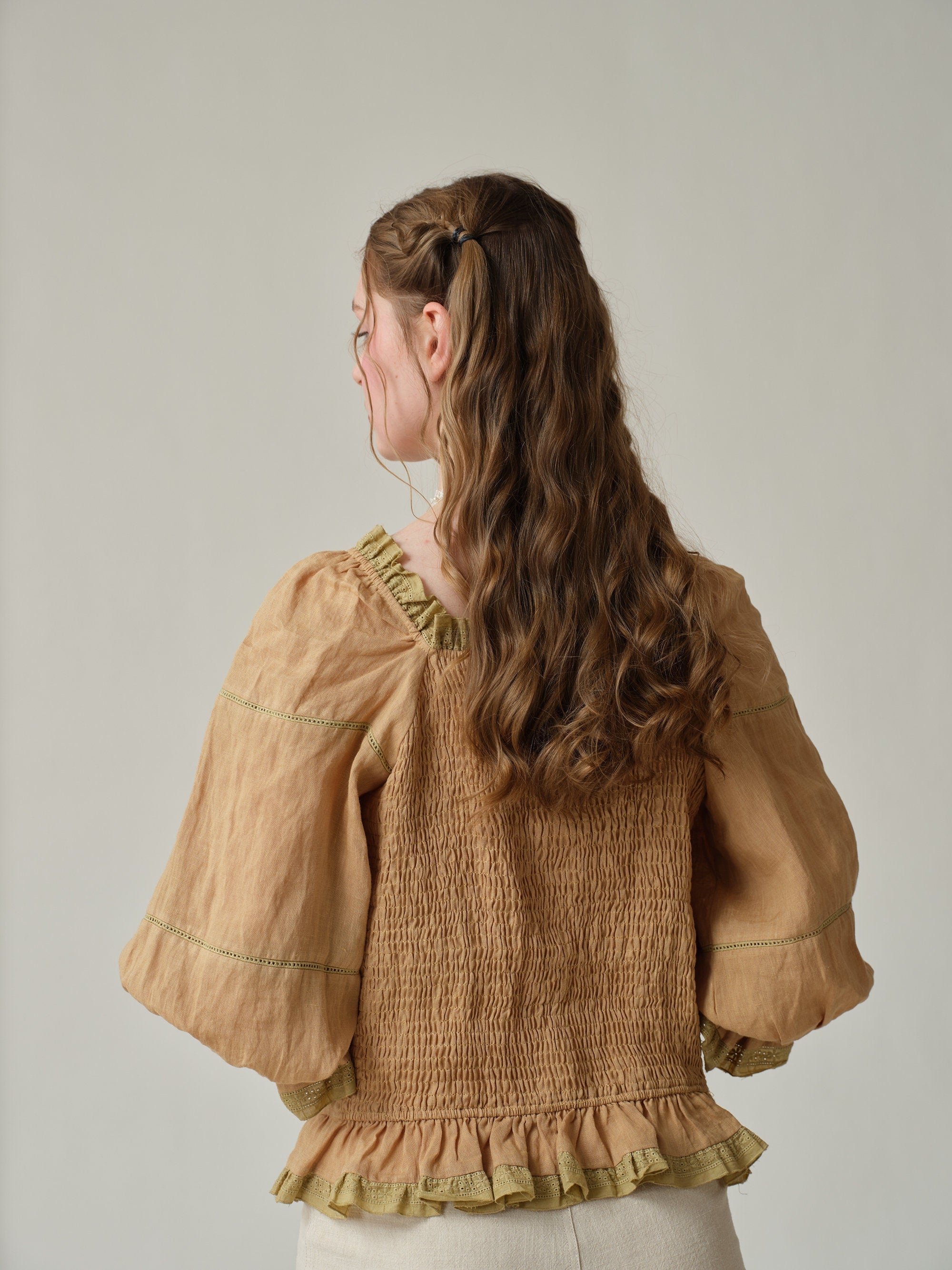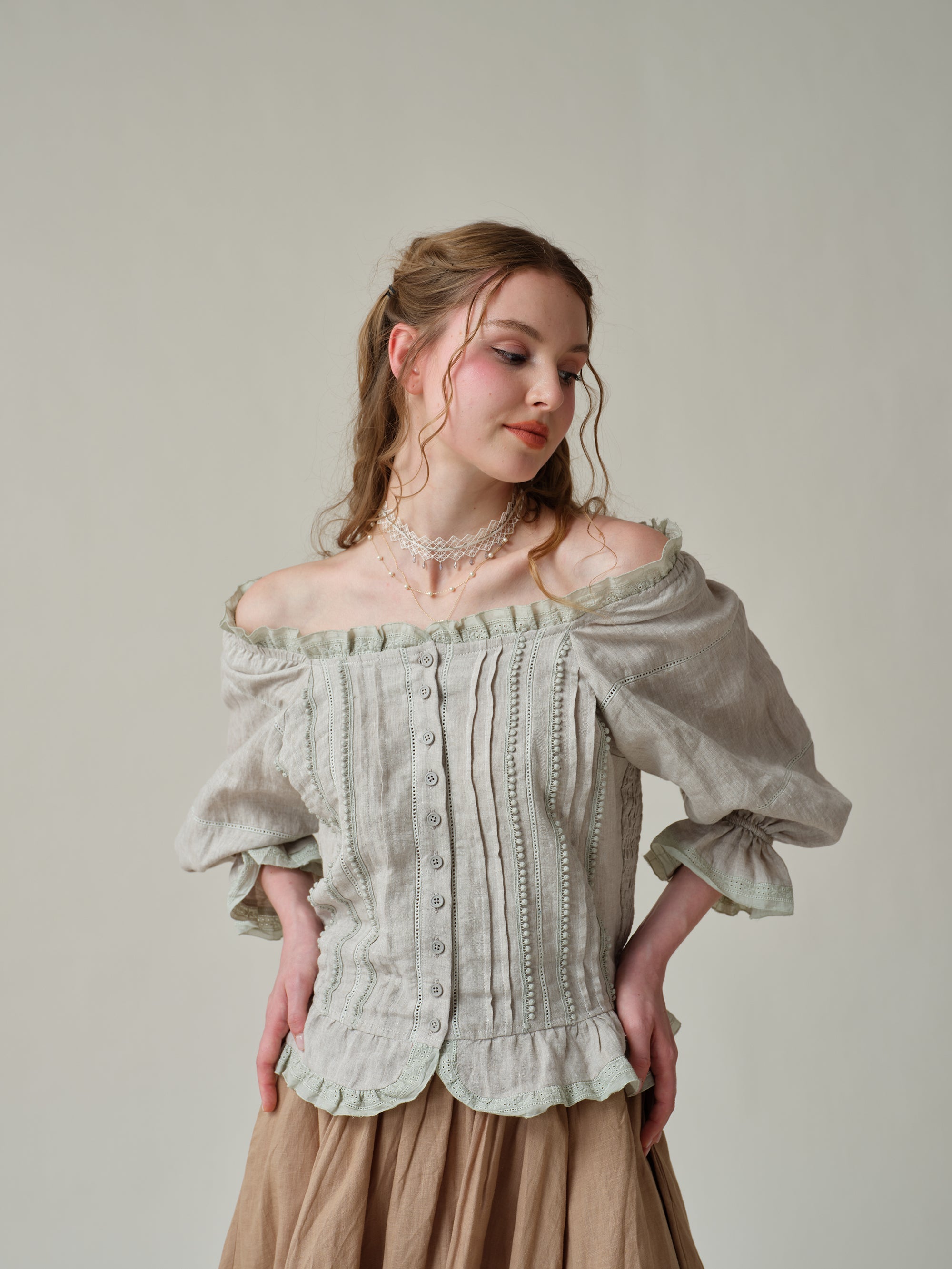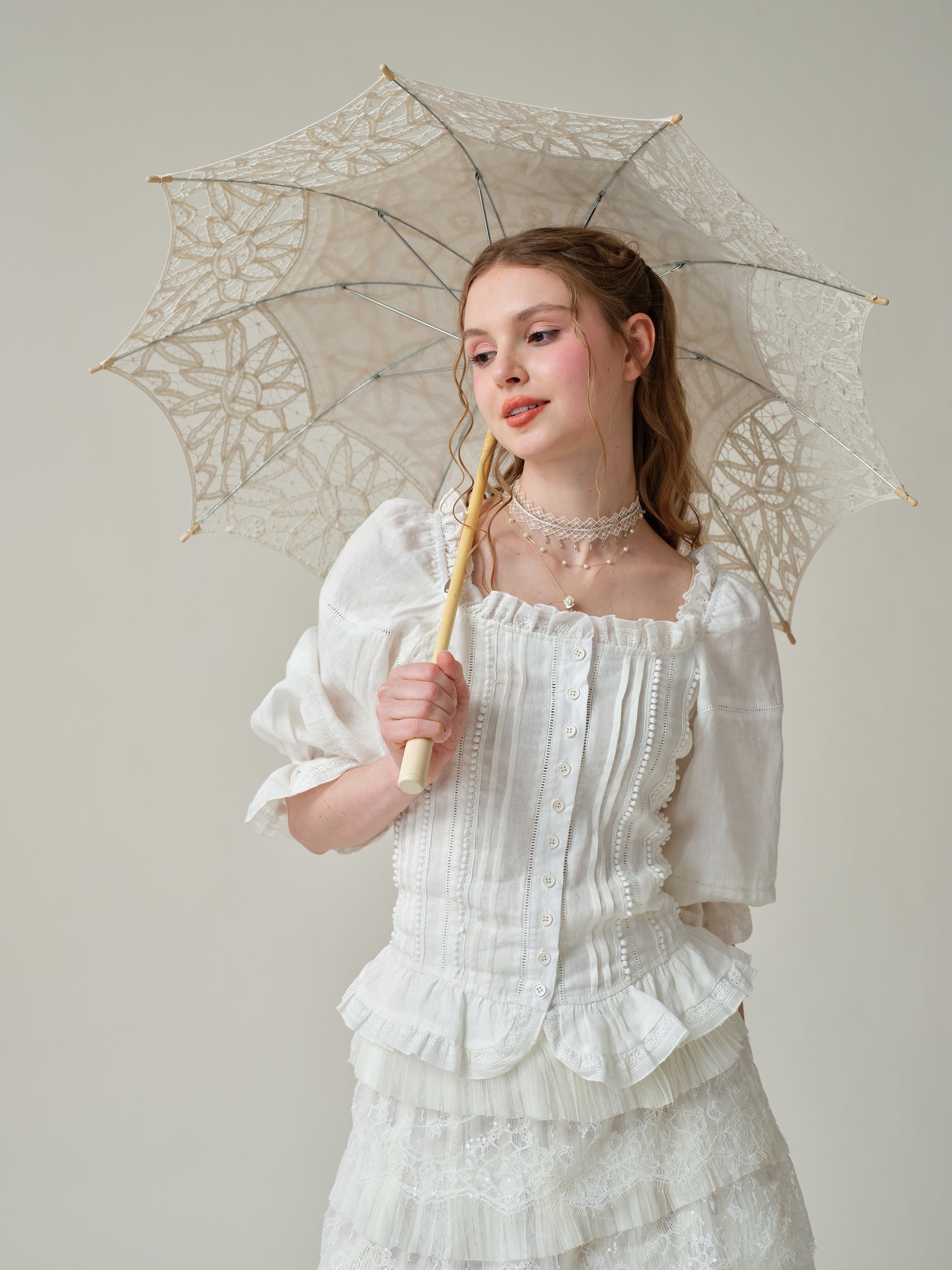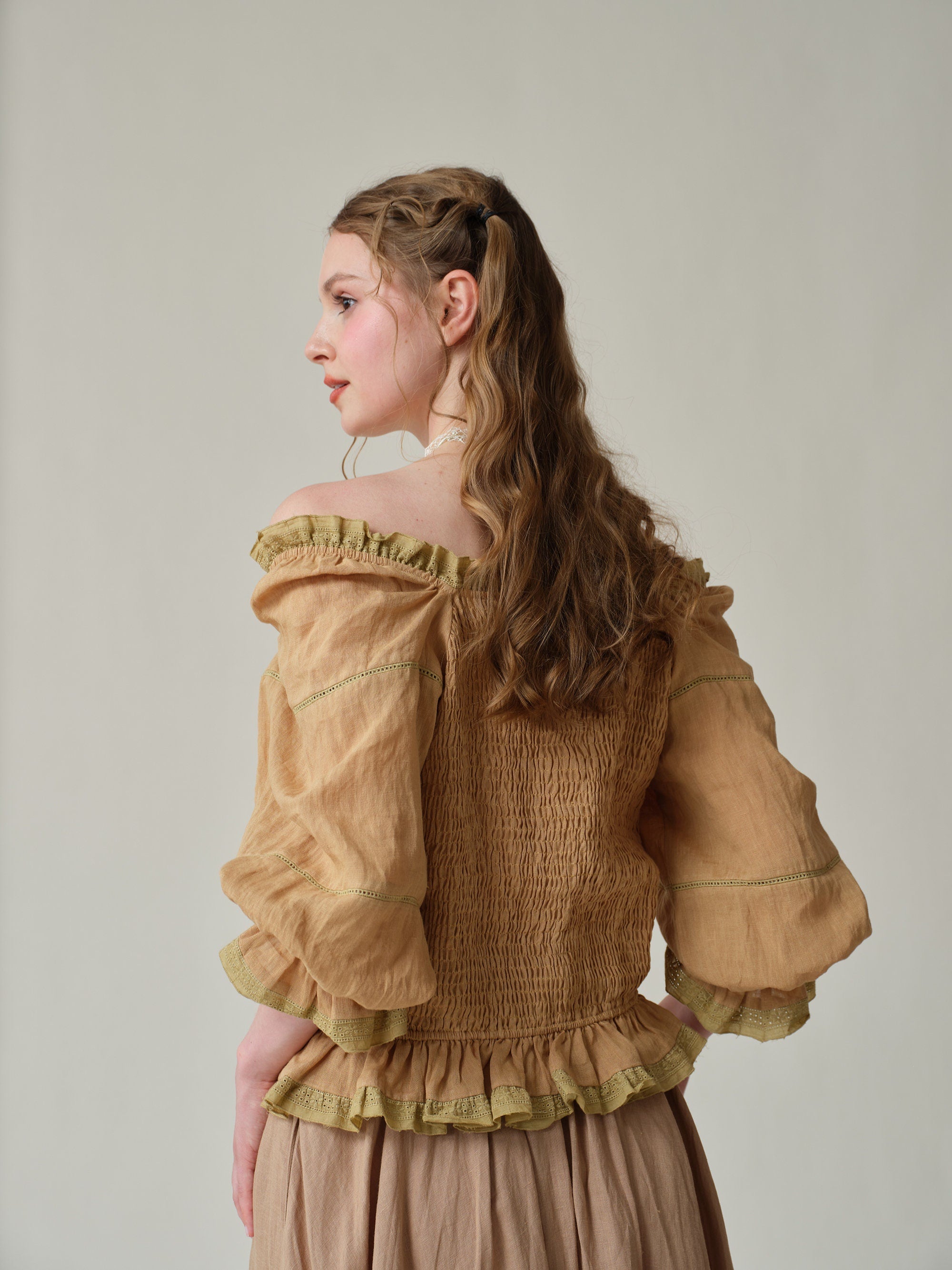 Made from soft linen and scattered with 4 different old French lace-trimmed, it has a vintage-inspired square neckline with romantic puffed sleeves and flared cuffs.