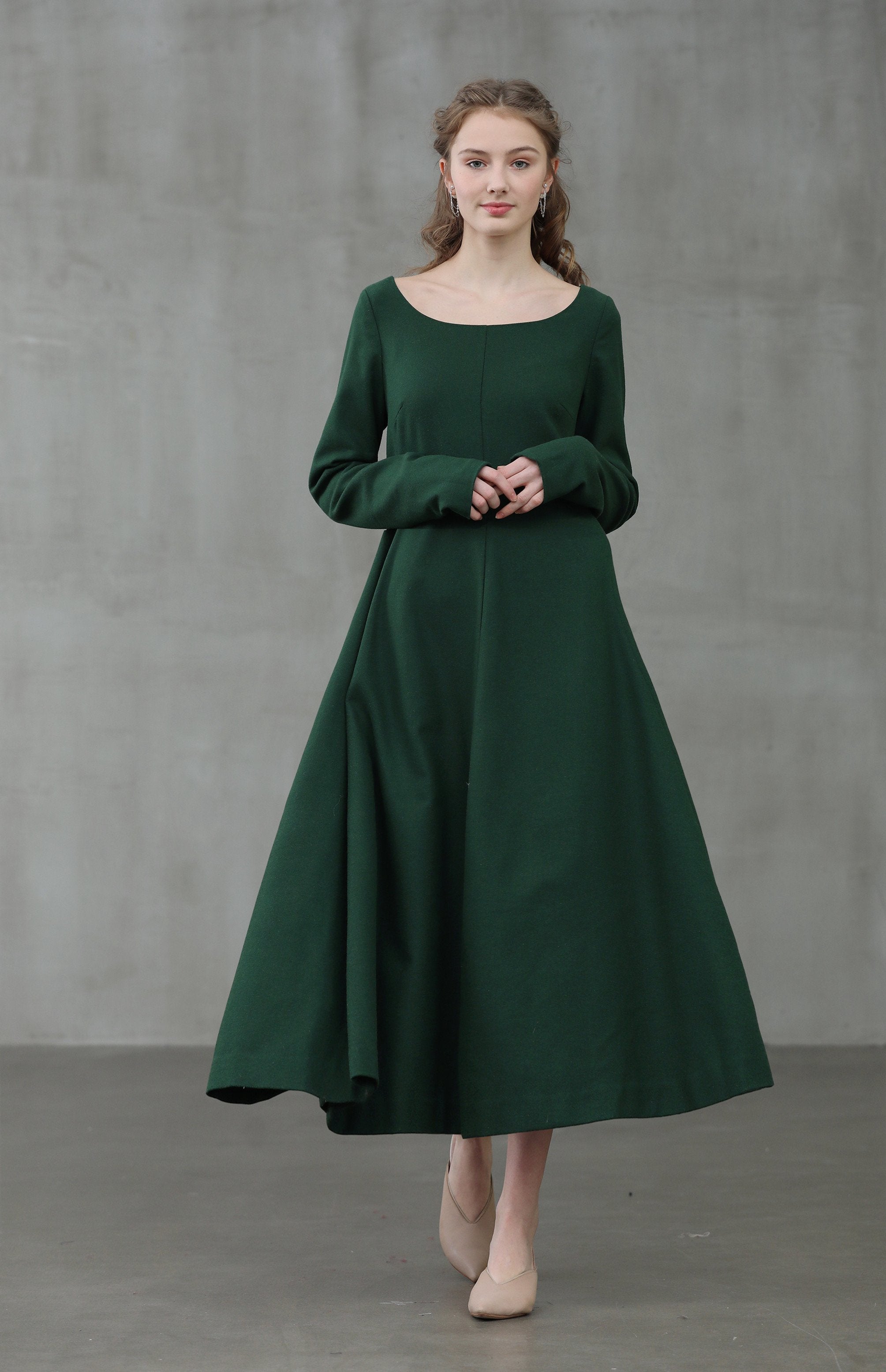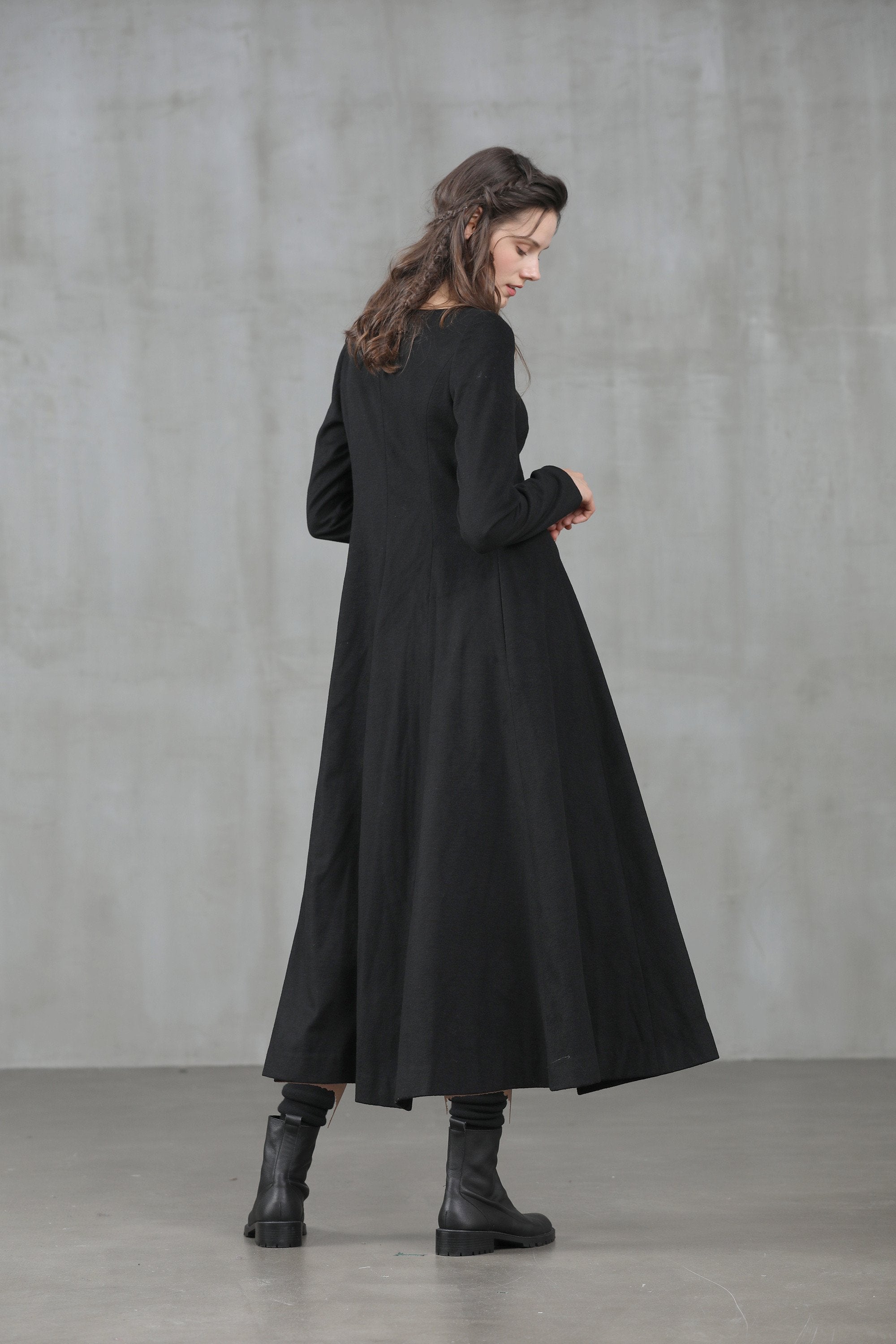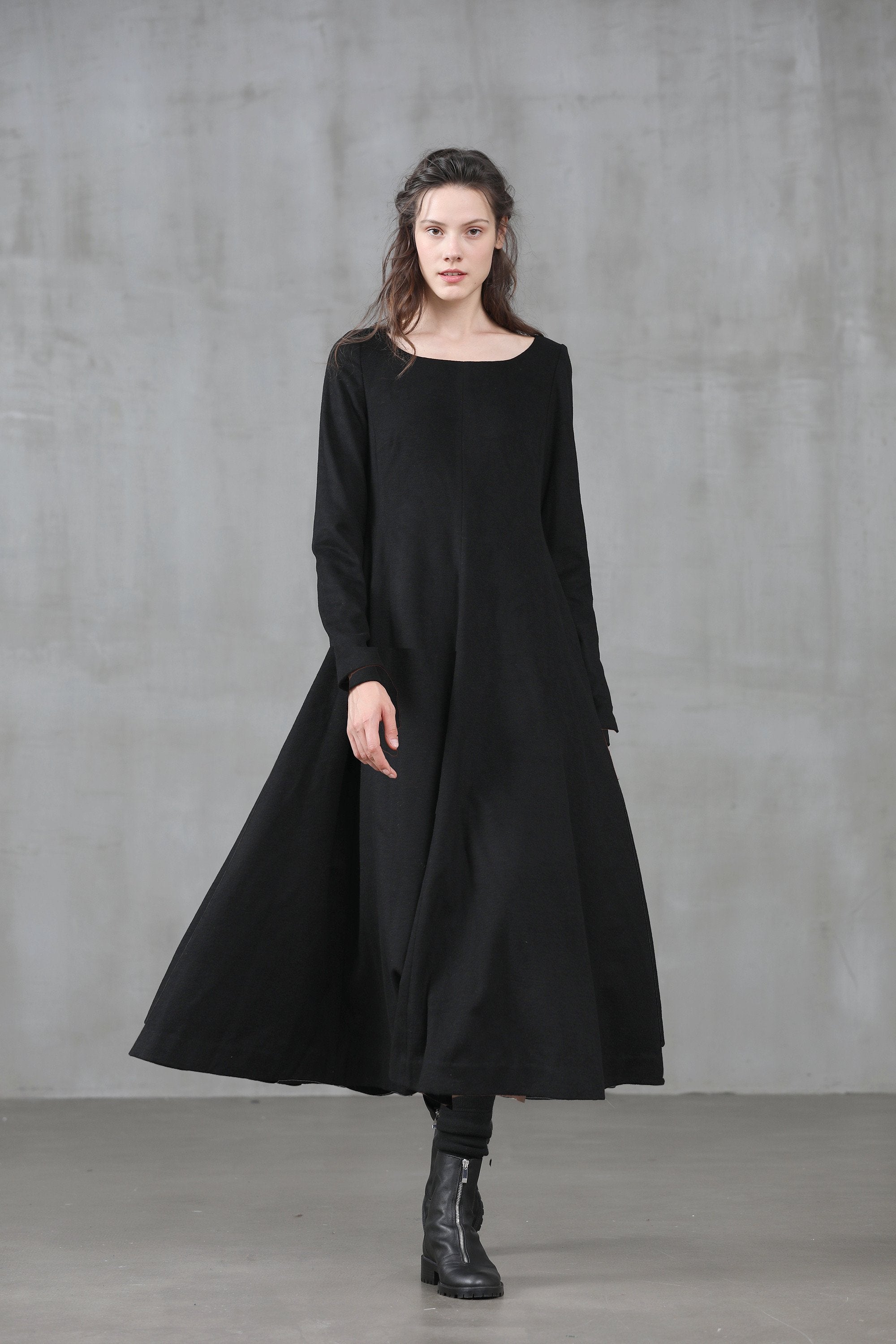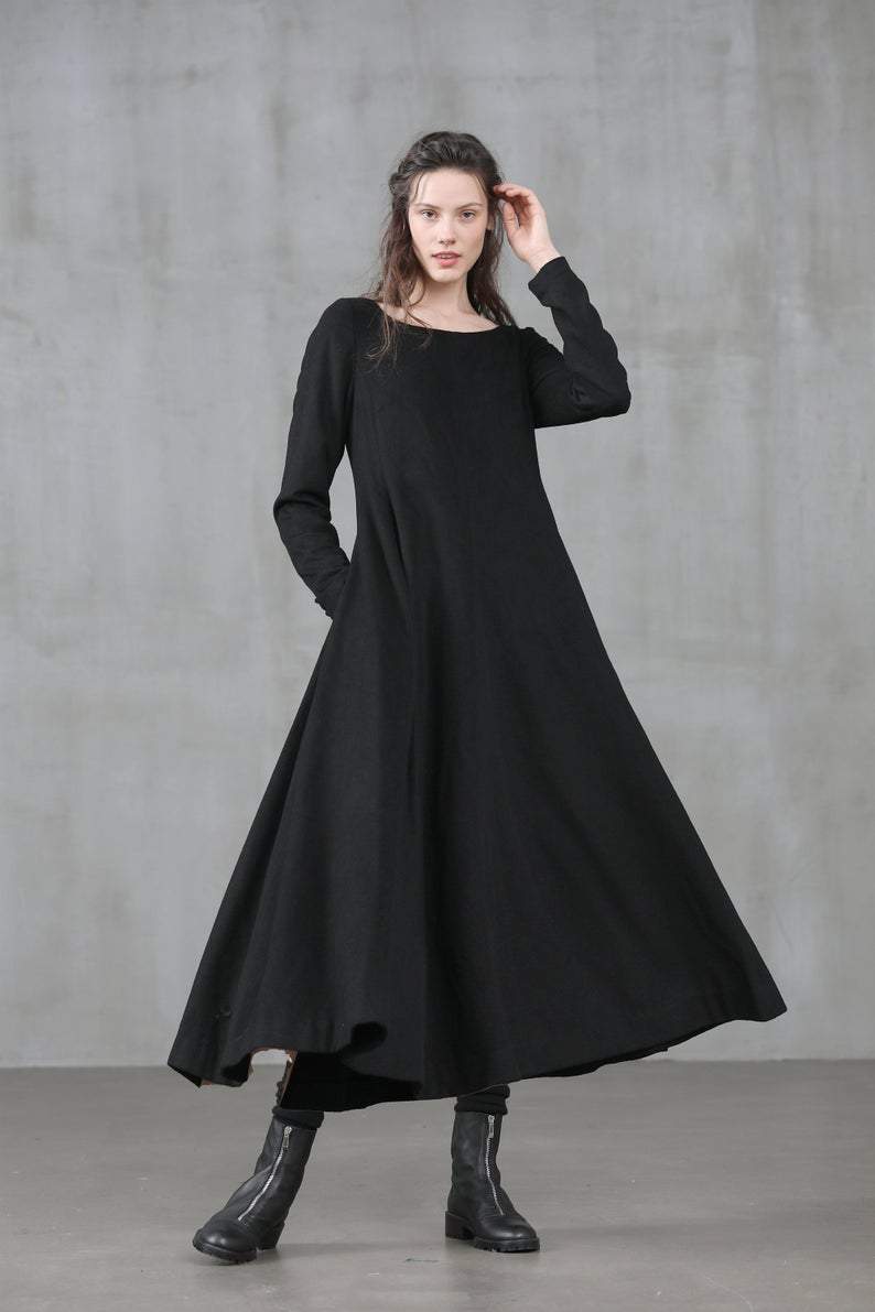 This black wool dress features an elegant U shape neckline, draped skirt, long sleeves, gathering details, a fitted silhouette, and a long length.