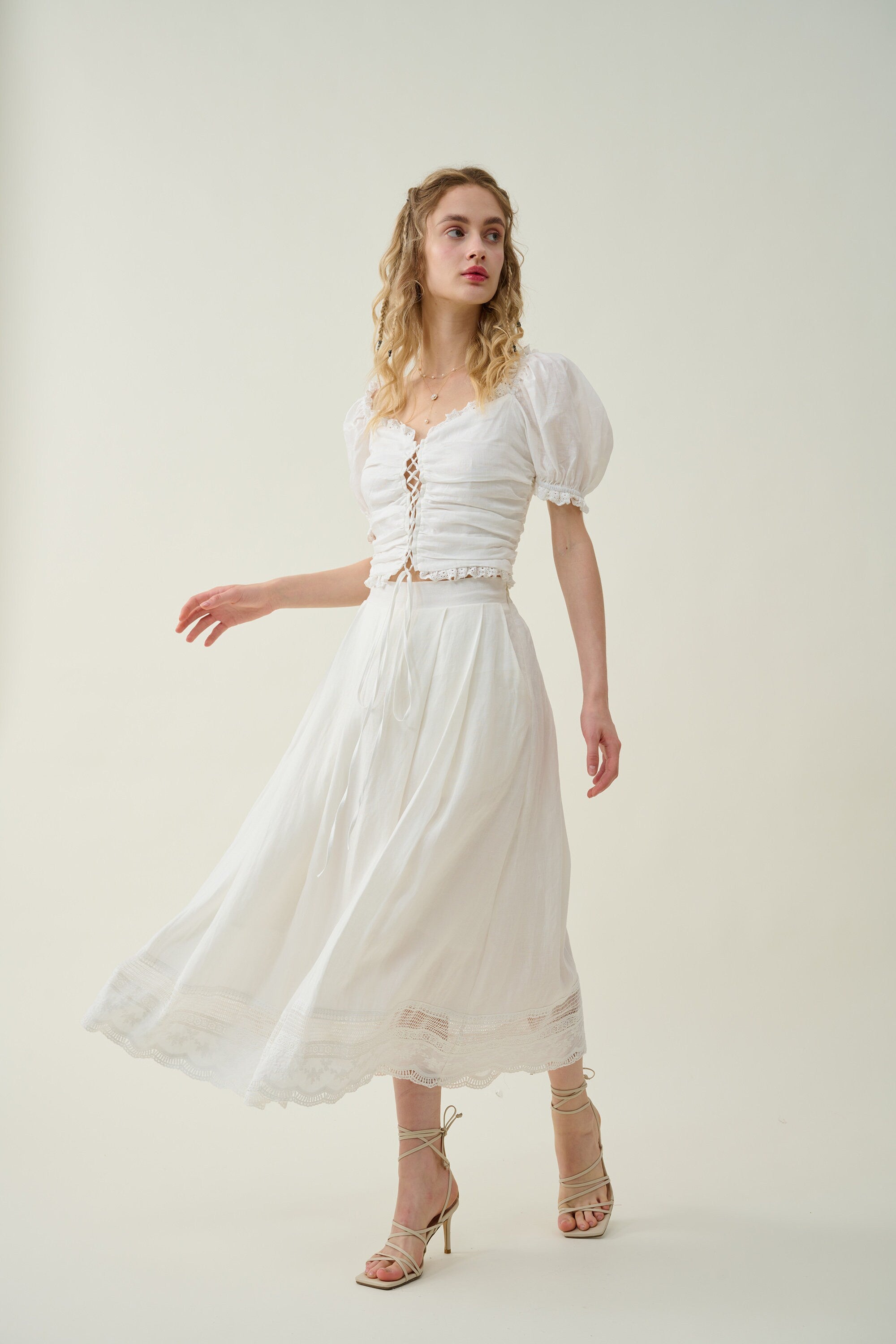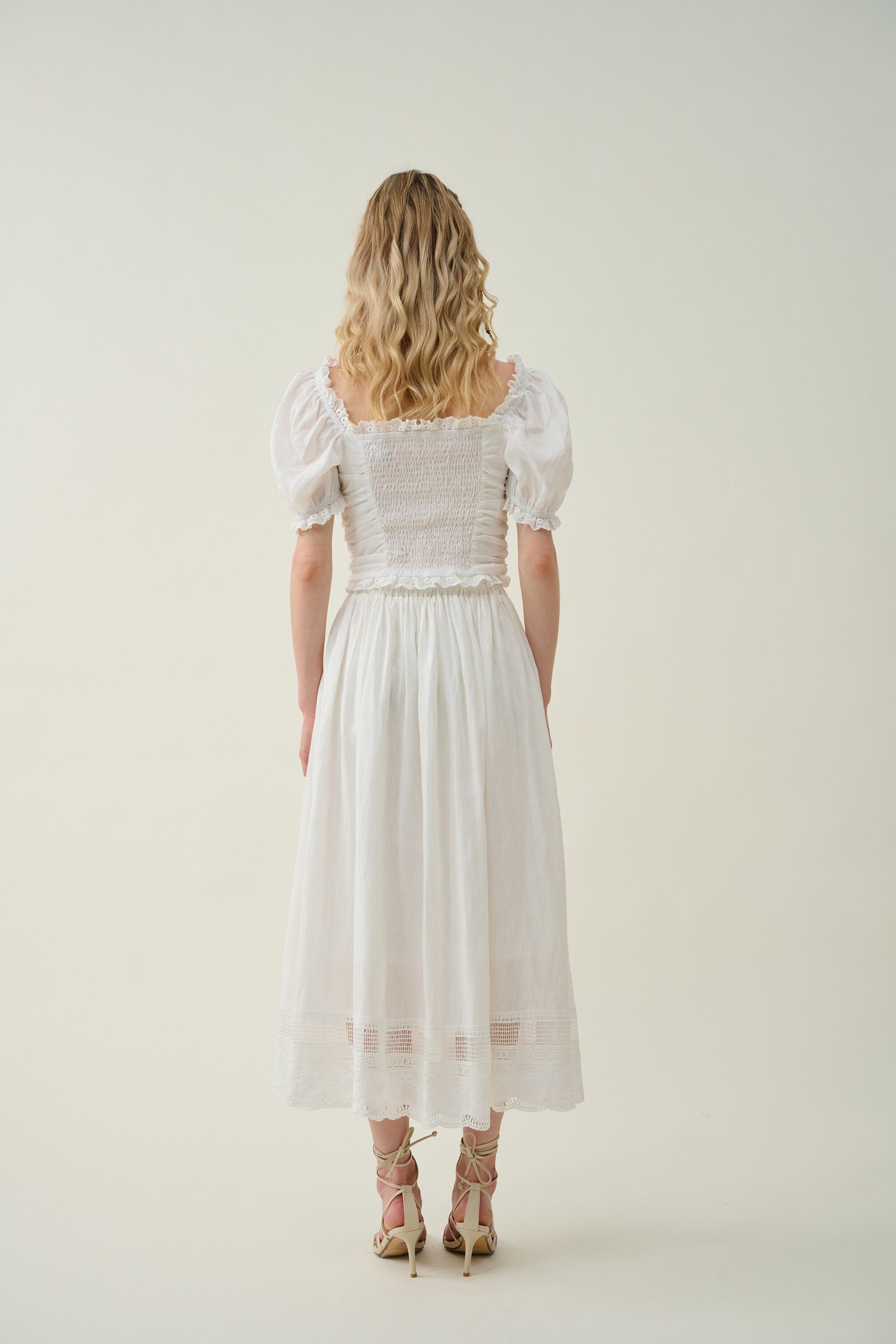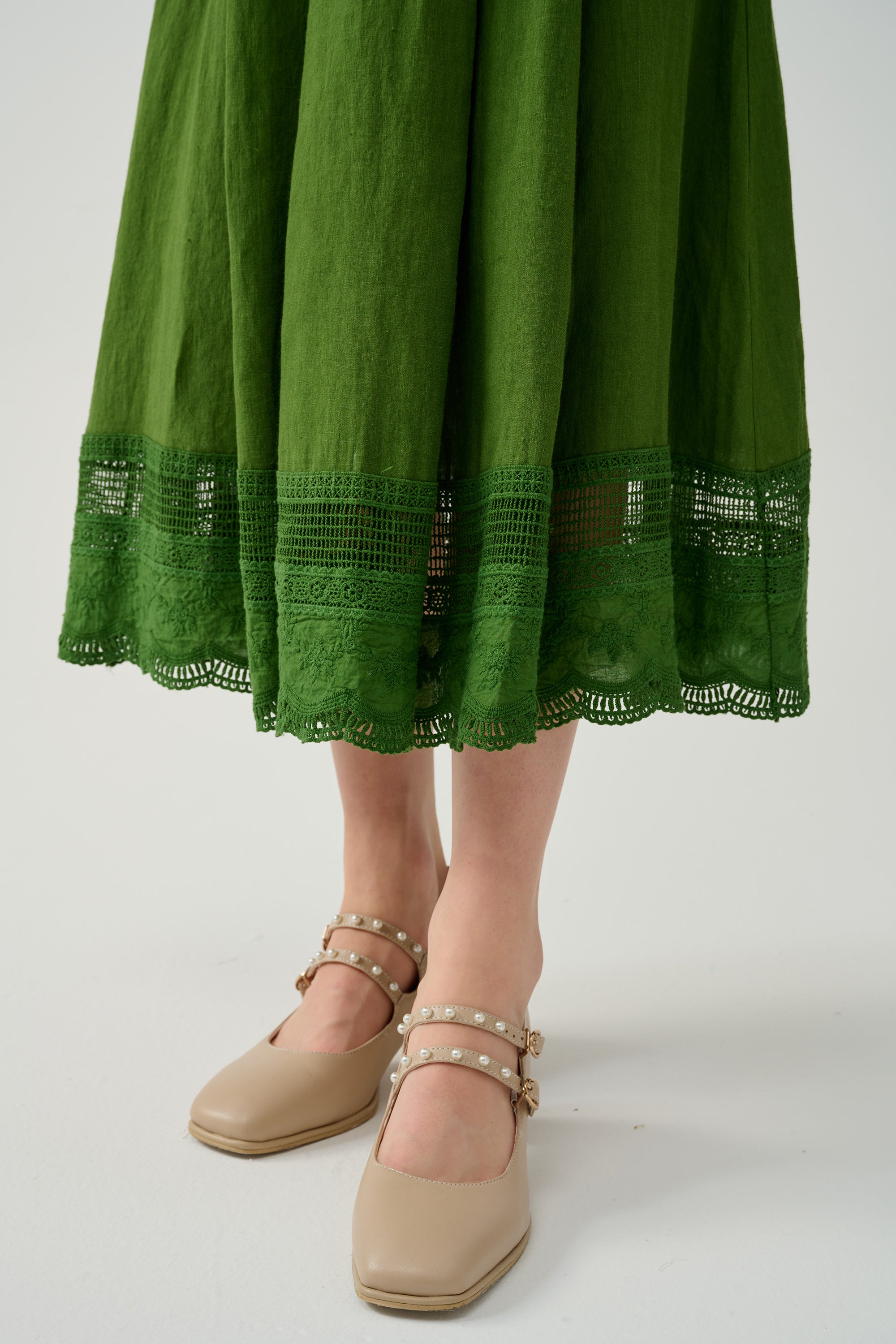 It's cut from lightweight linen in an A-line silhouette and intricately with a lace embroidery at the hem for a romantic feel.