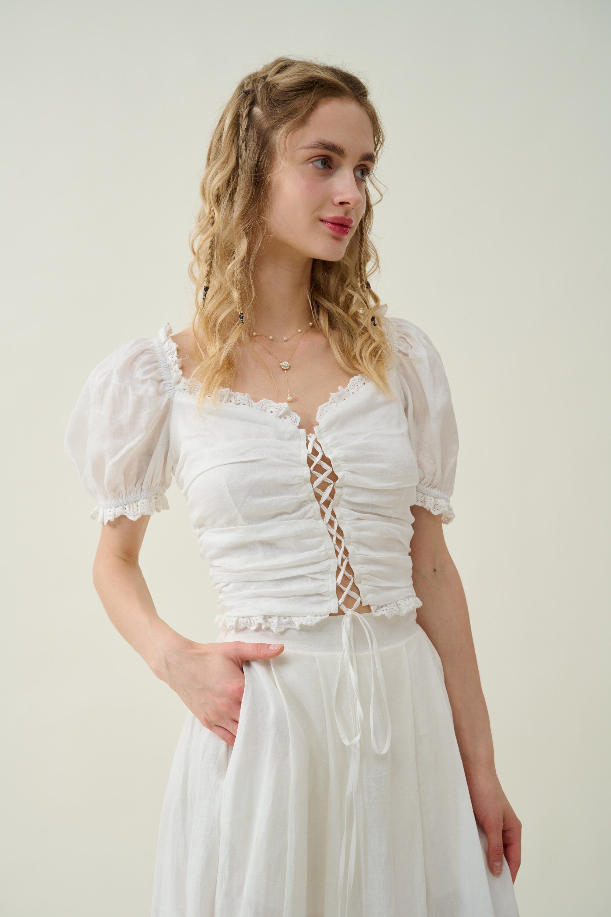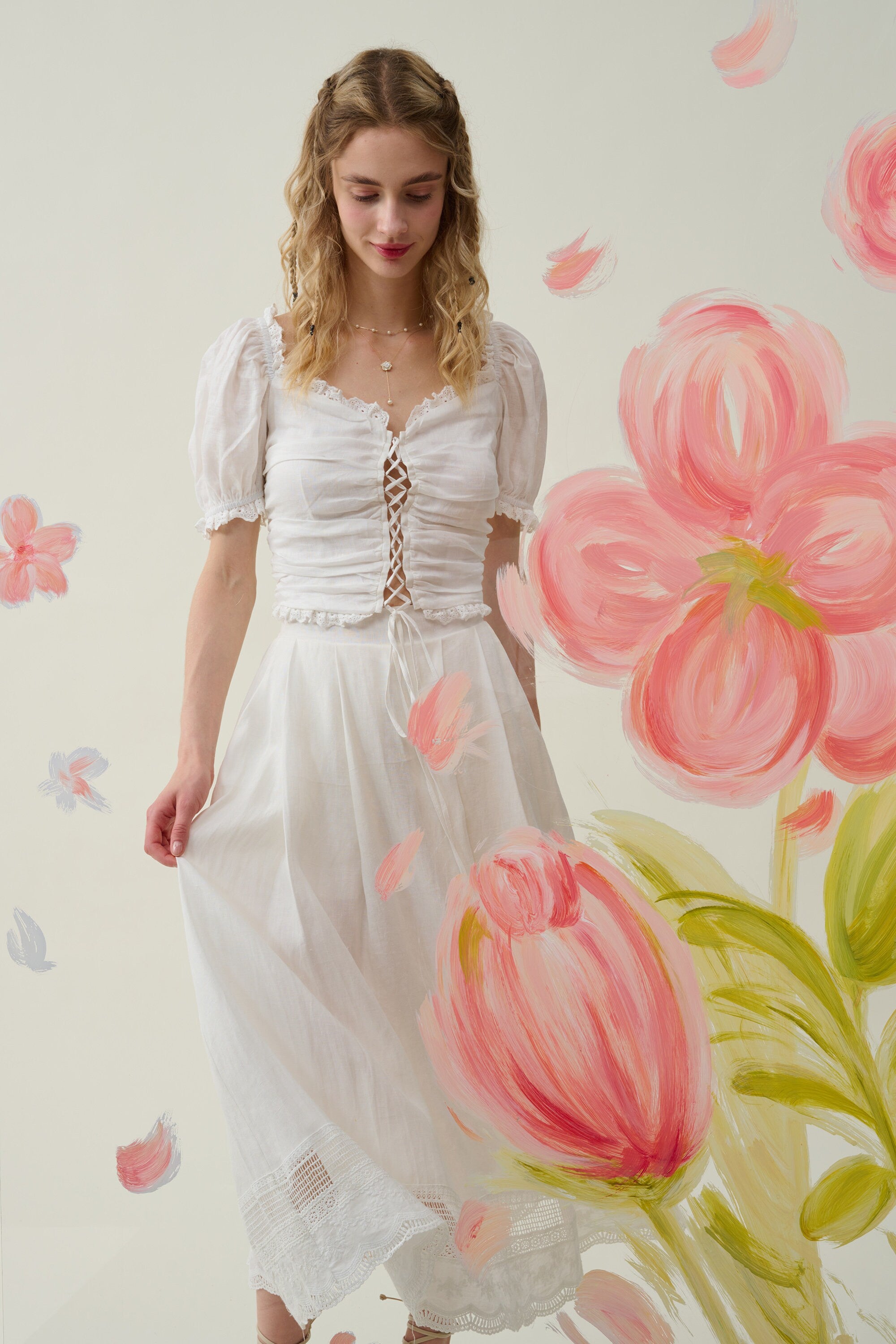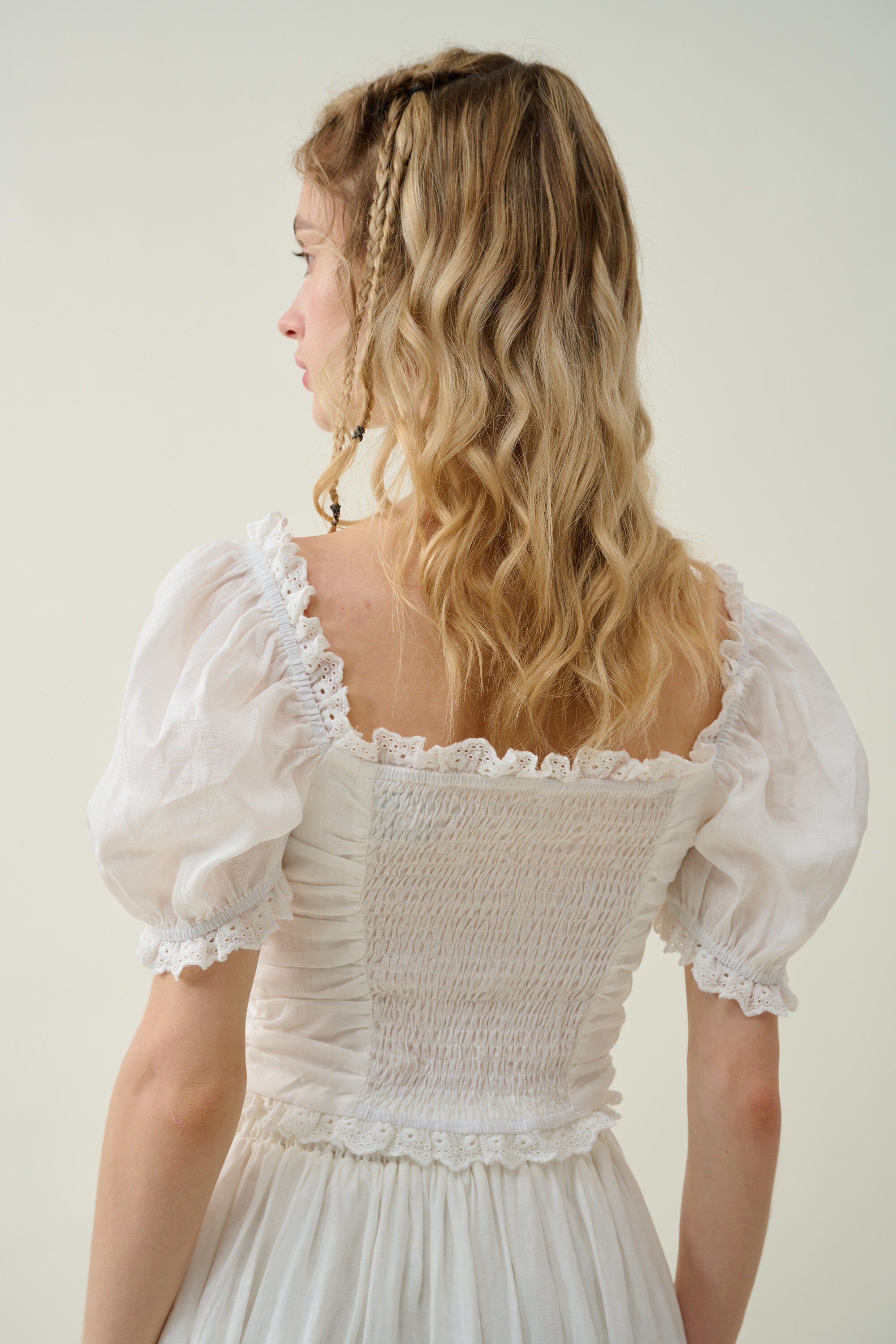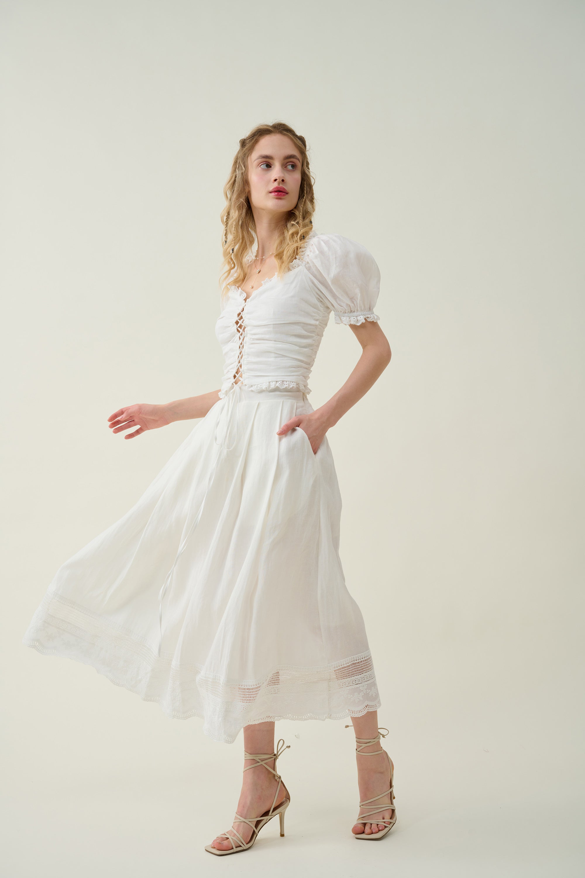 It's cut from lightweight linen in an A-line silhouette and intricately with a lace embroidery at the hem for a romantic feel.