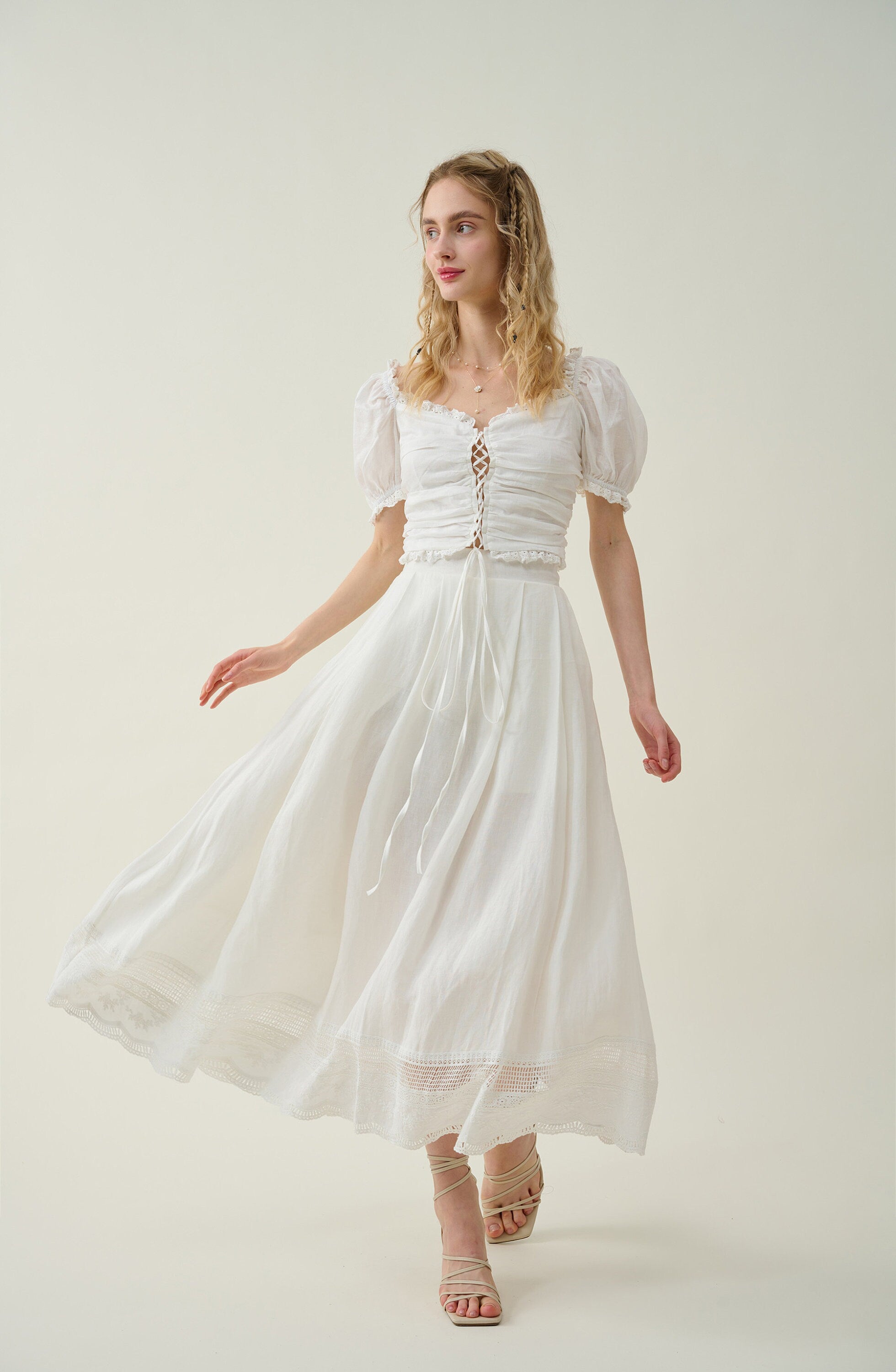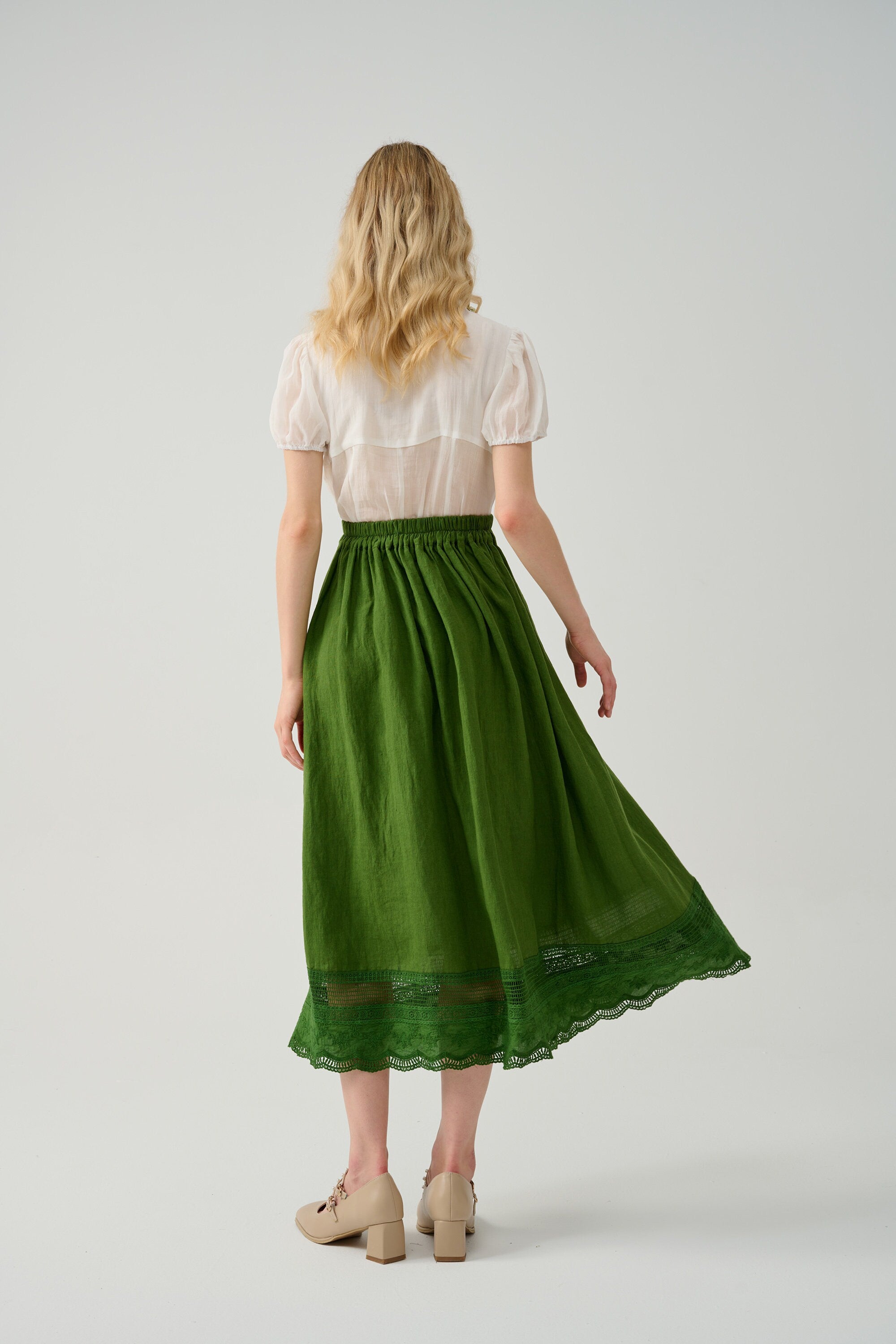 It's cut from lightweight linen in an A-line silhouette and intricately with a lace embroidery at the hem for a romantic feel.