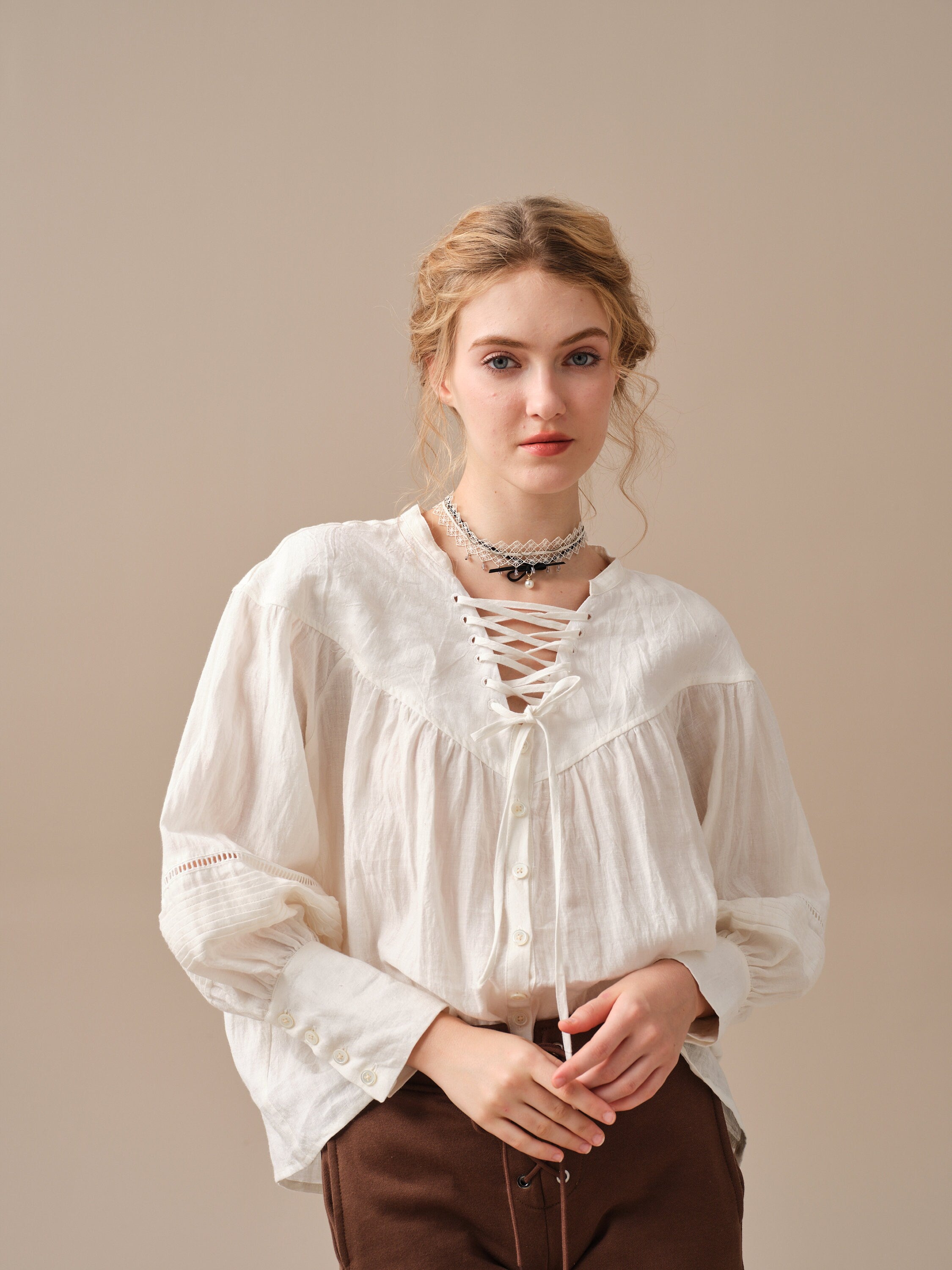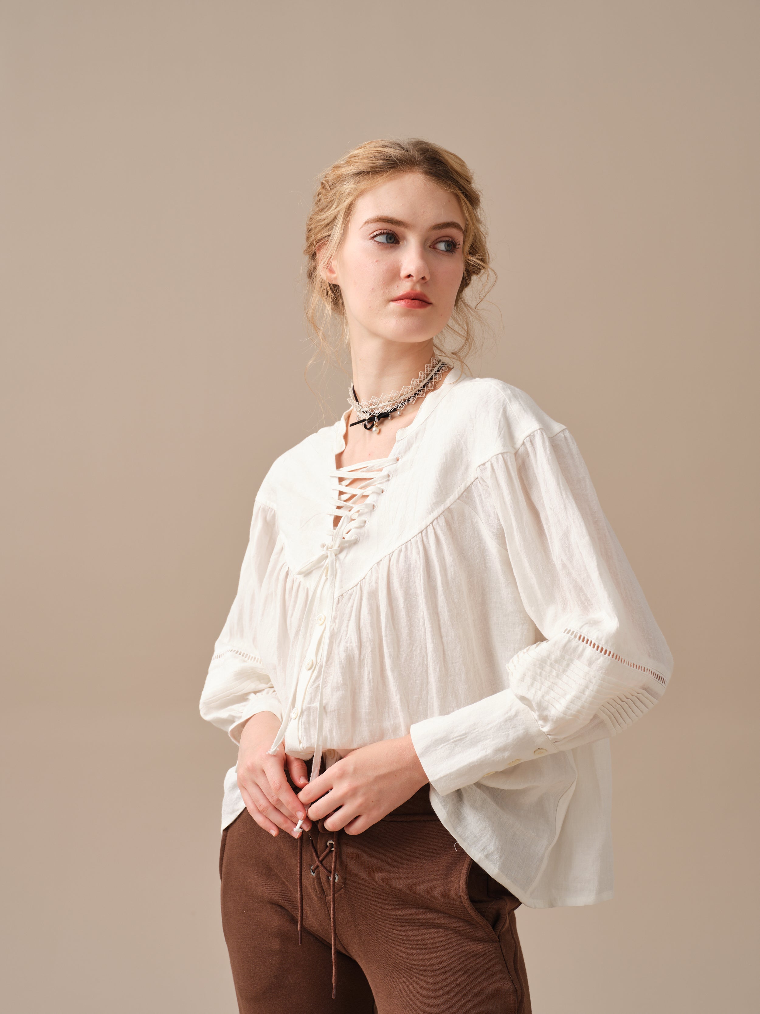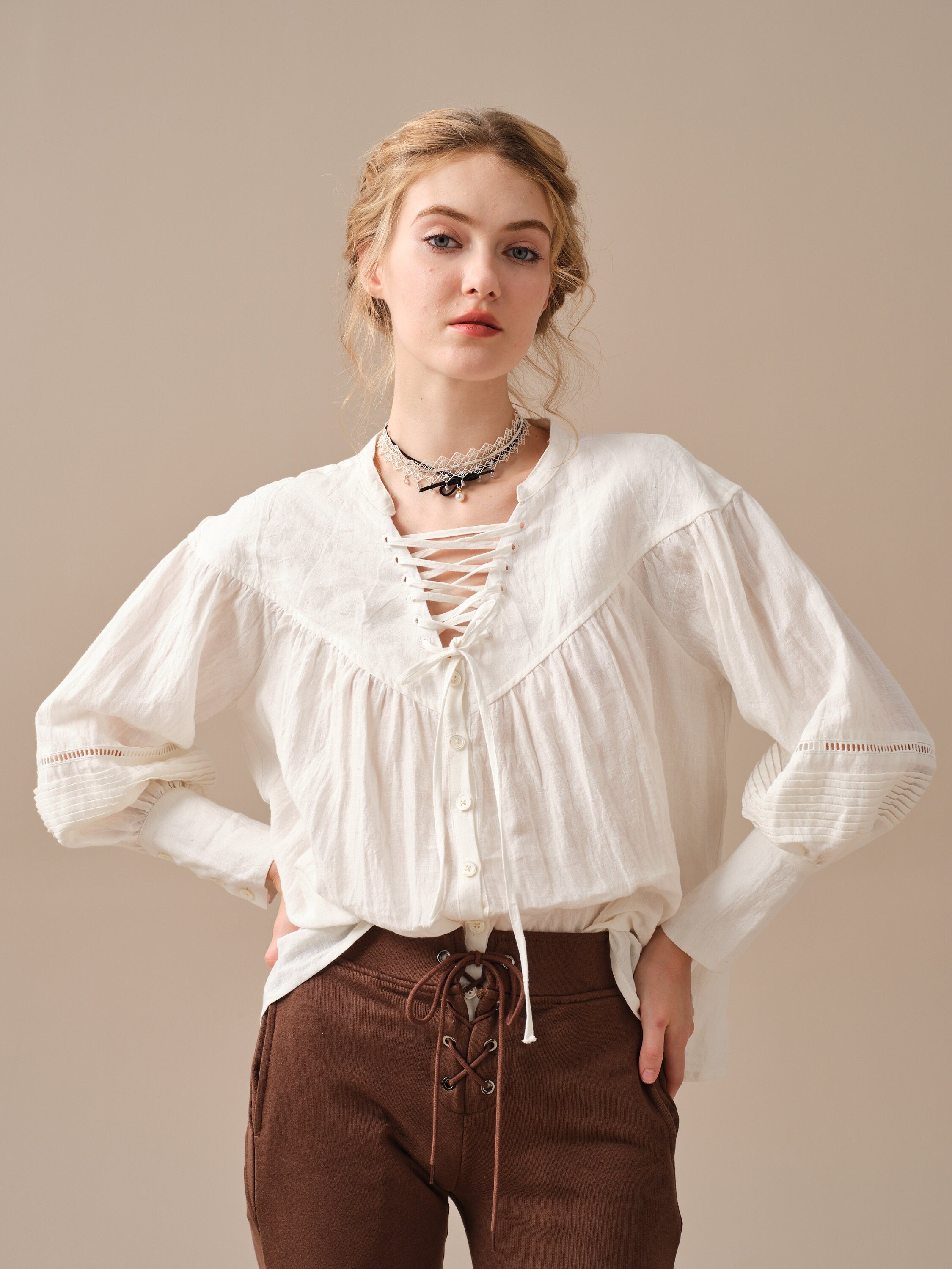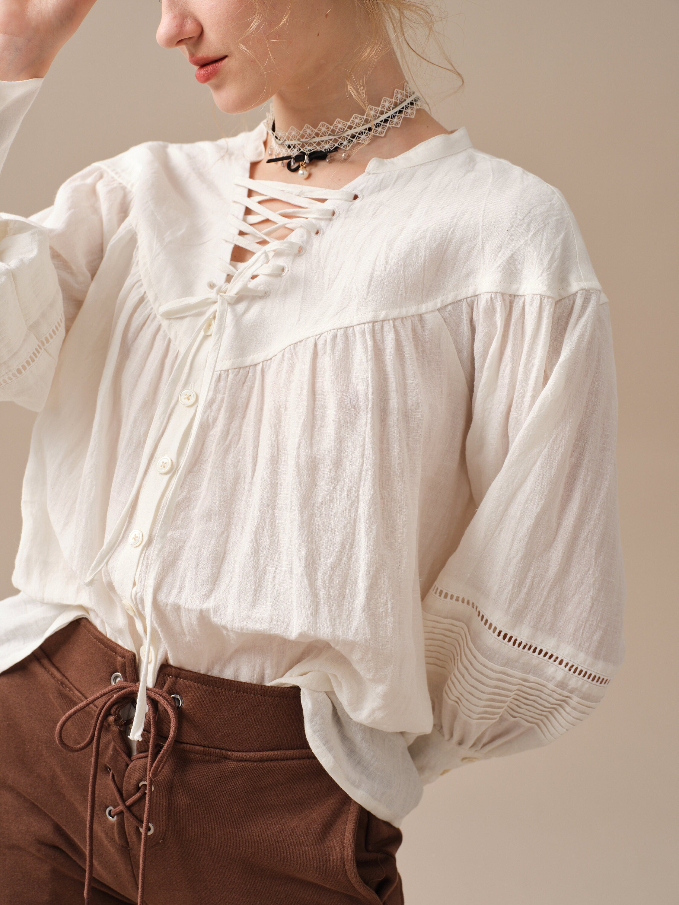 This blouse is adorned with a charming lace-up detail that adds a touch of elegance and sophistication to the design. But it doesn't stop there, as the delicate pleats on the sleeves add a unique and striking touch to this timeless piece.