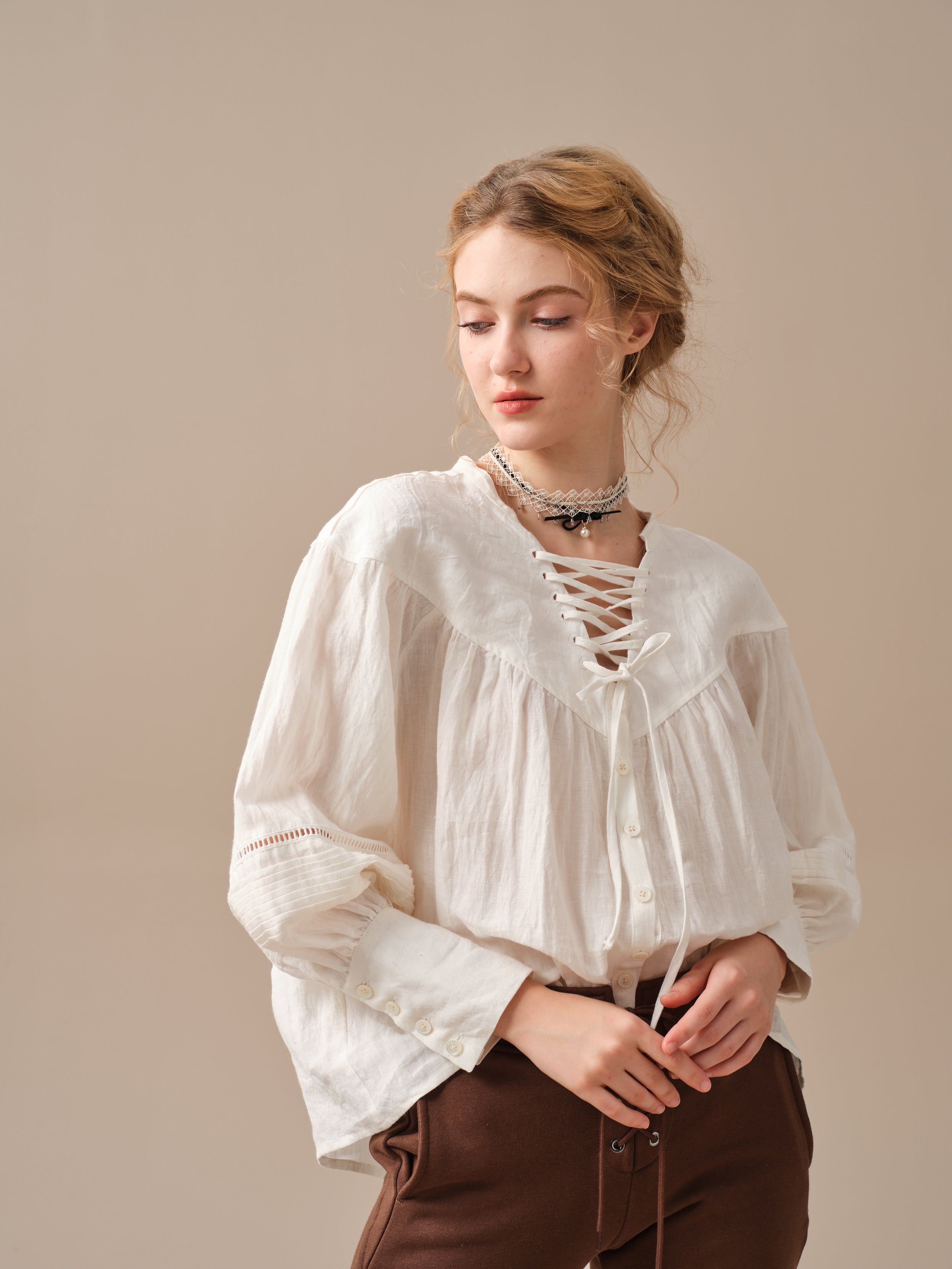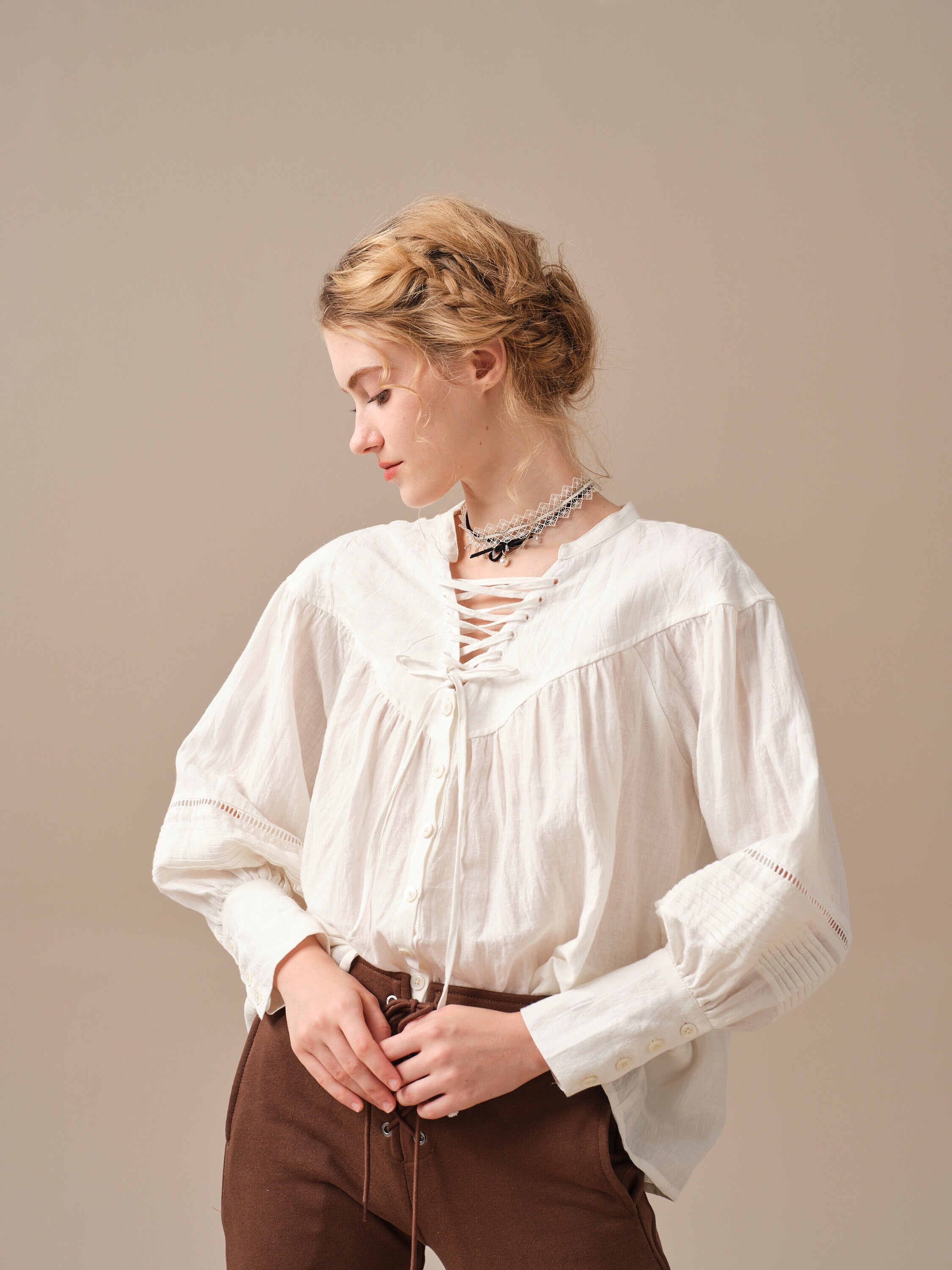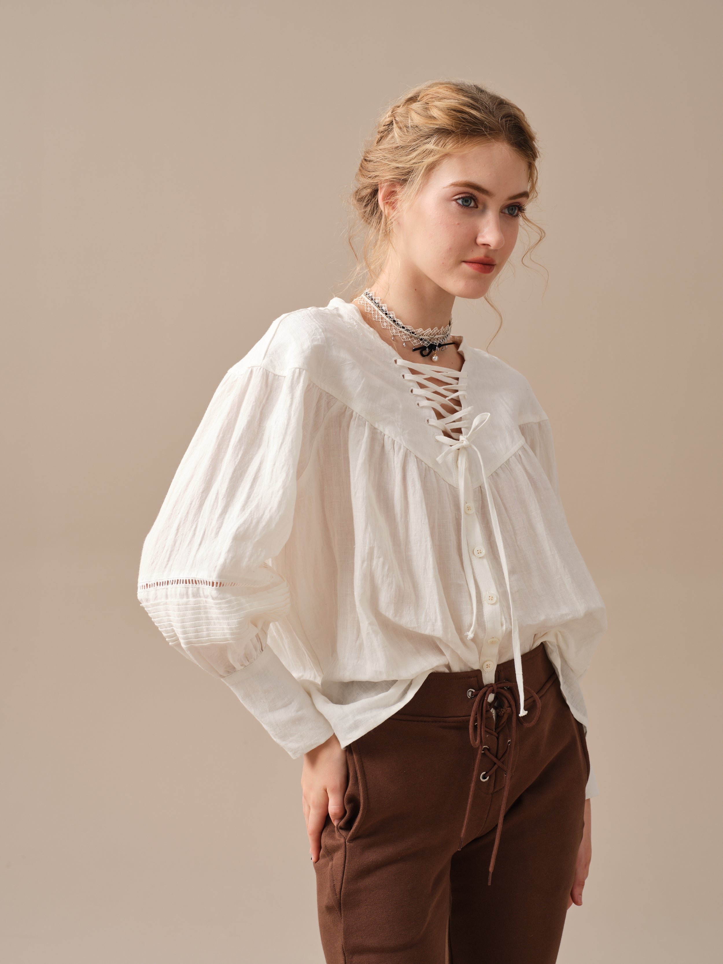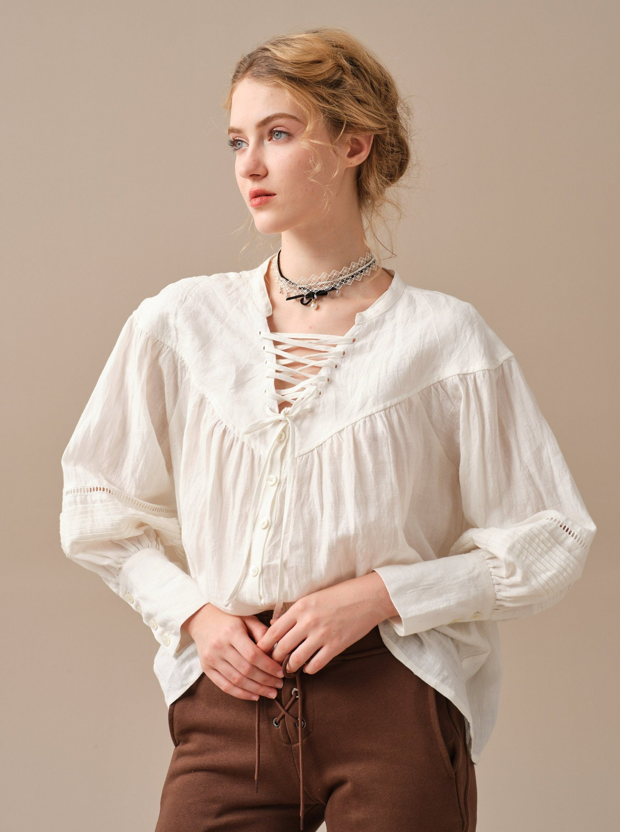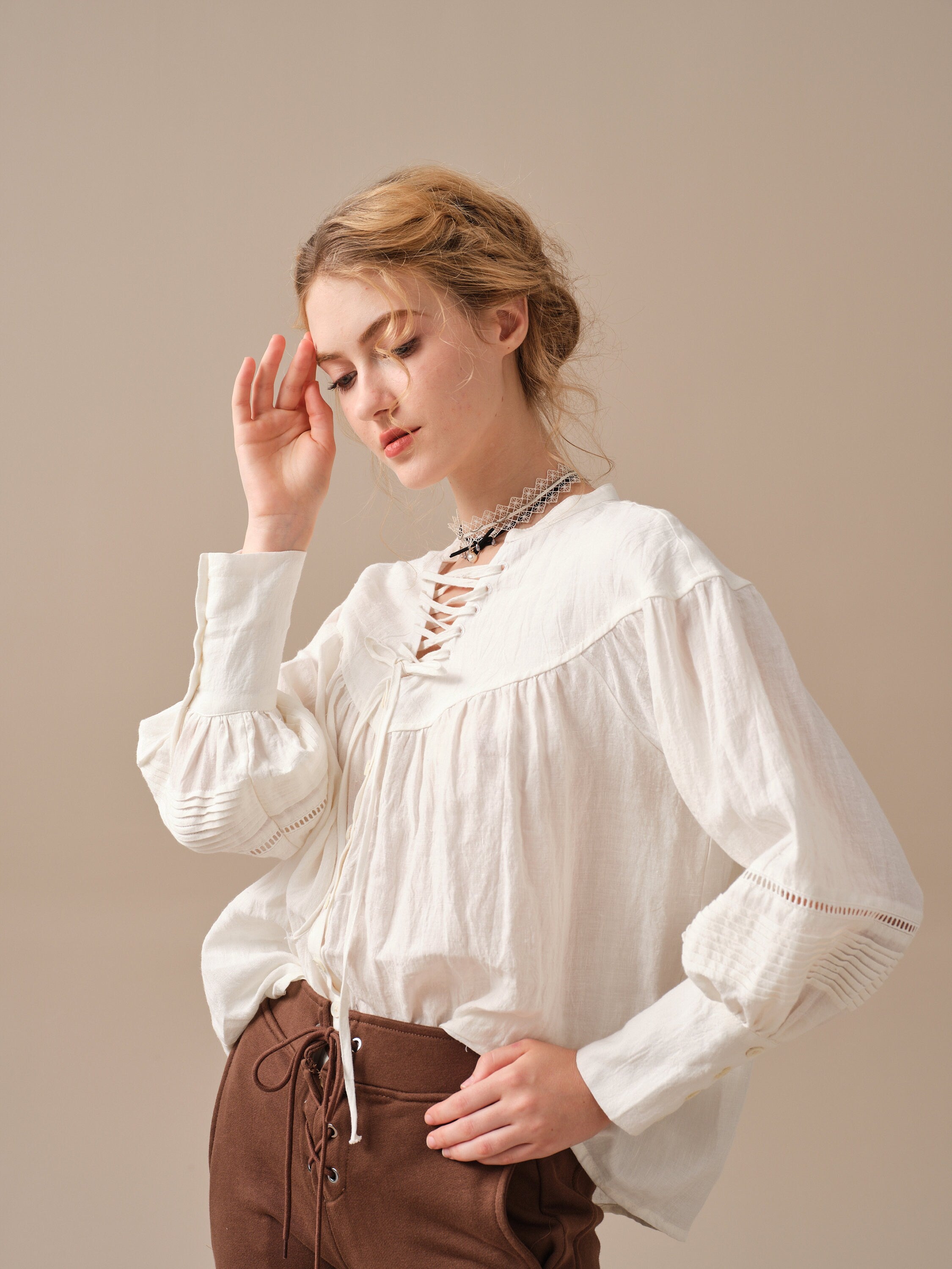 This blouse is adorned with a charming lace-up detail that adds a touch of elegance and sophistication to the design. But it doesn't stop there, as the delicate pleats on the sleeves add a unique and striking touch to this timeless piece.