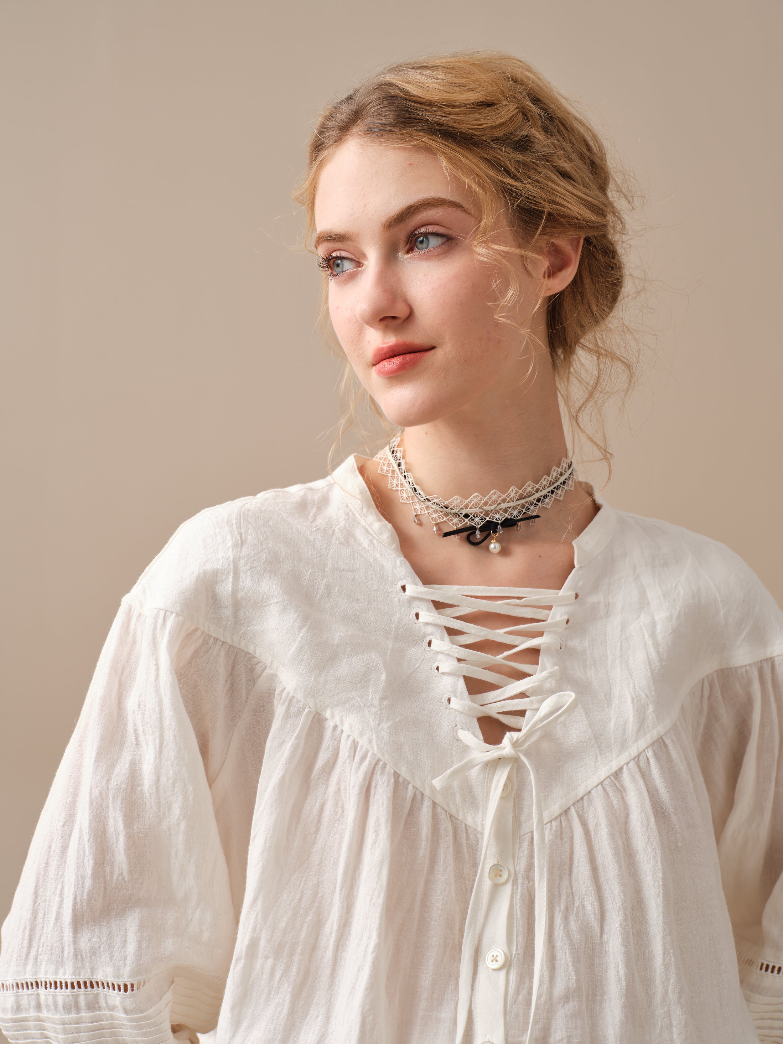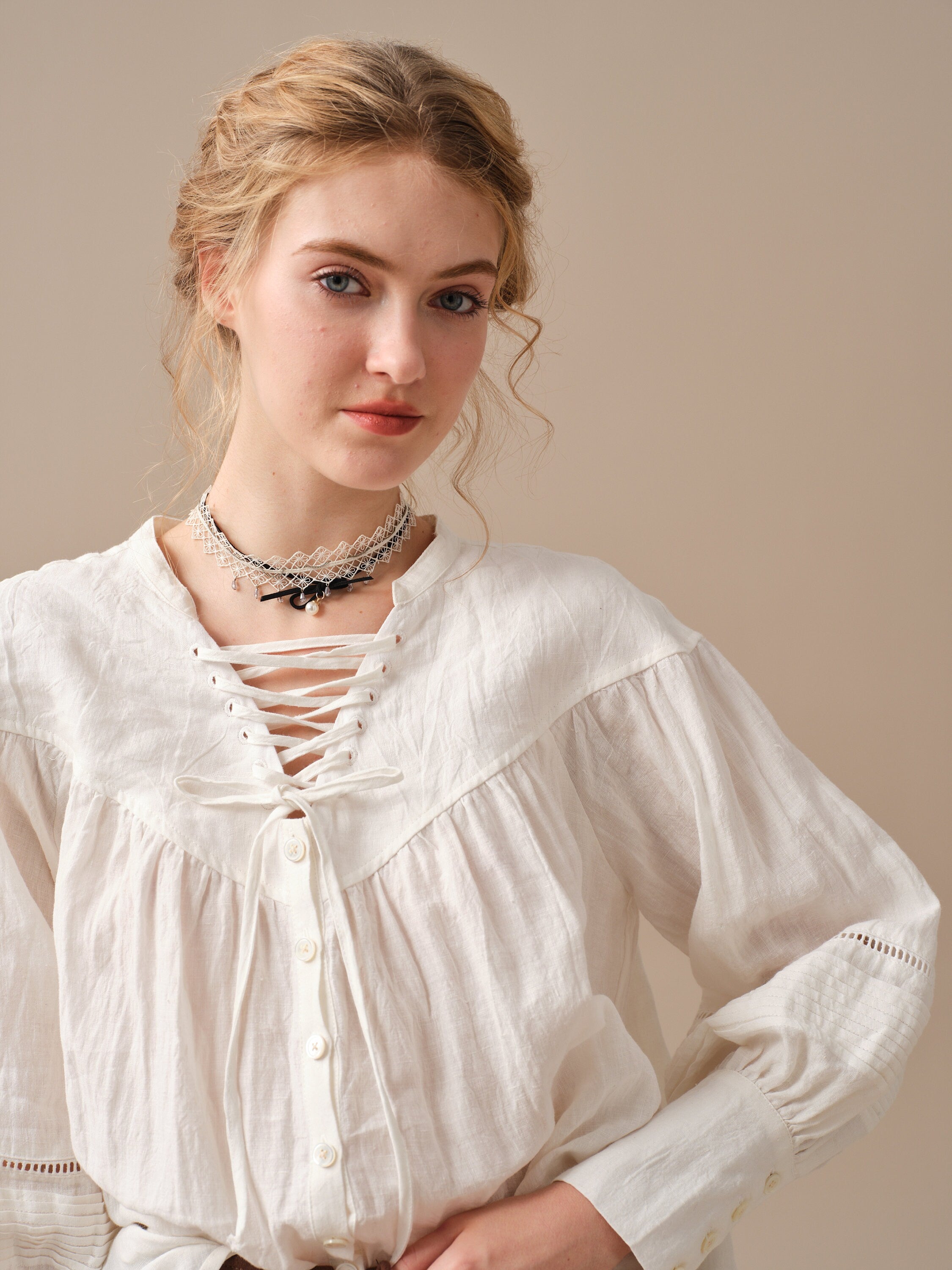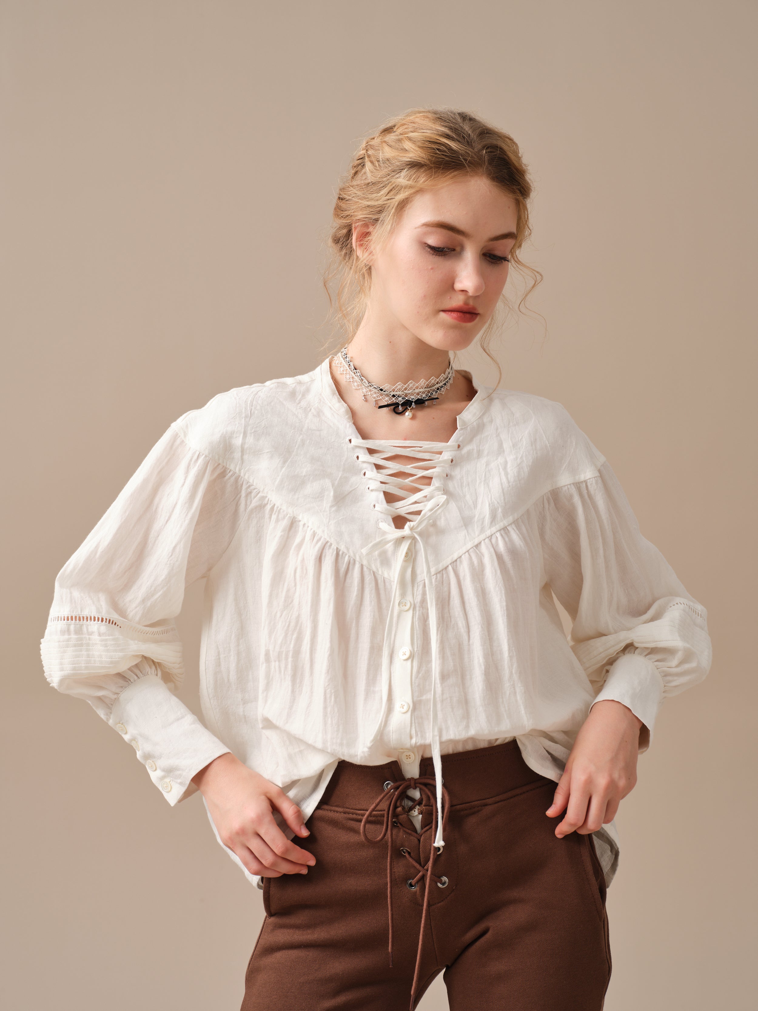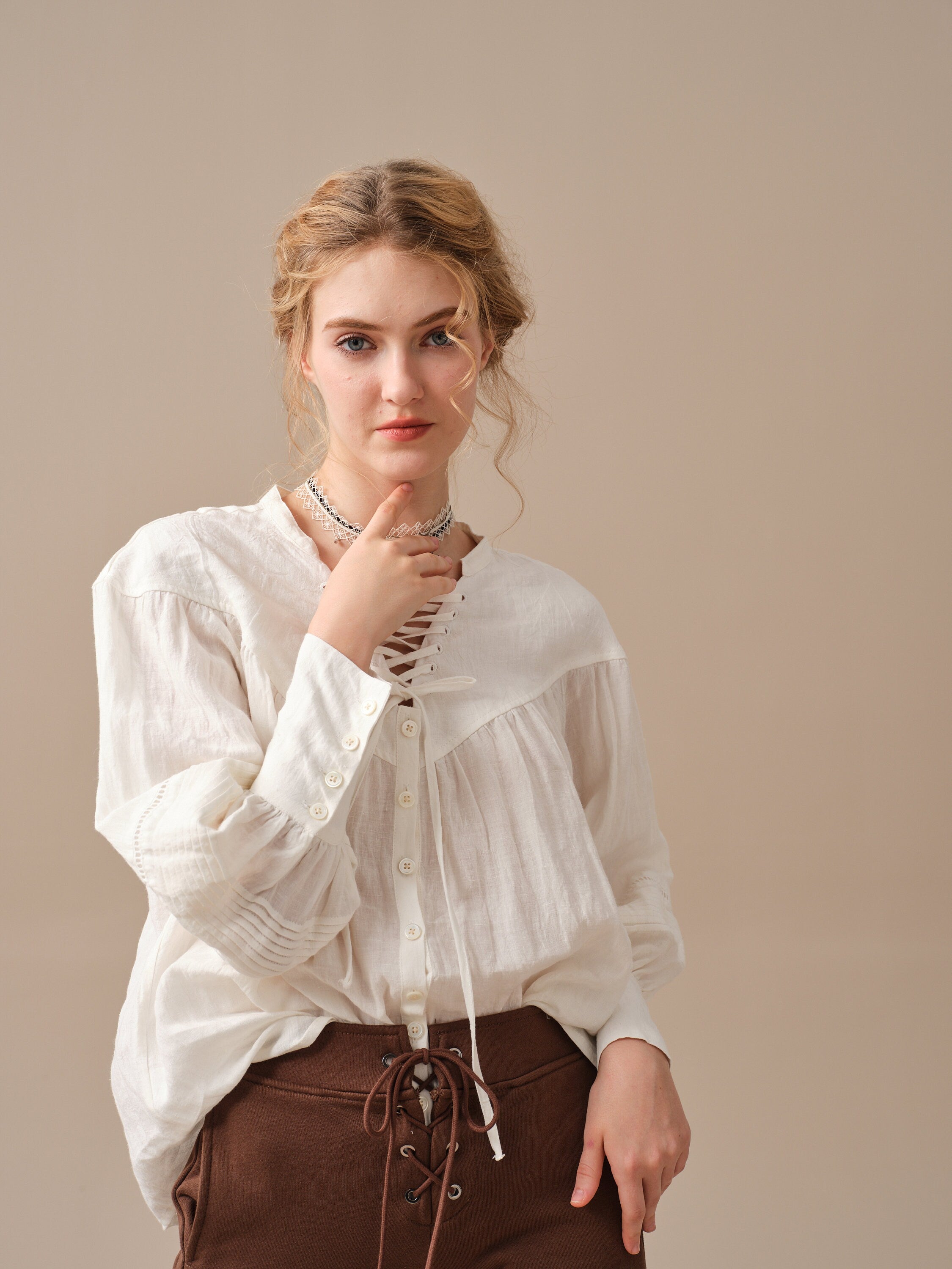 This blouse is adorned with a charming lace-up detail that adds a touch of elegance and sophistication to the design. But it doesn't stop there, as the delicate pleats on the sleeves add a unique and striking touch to this timeless piece.