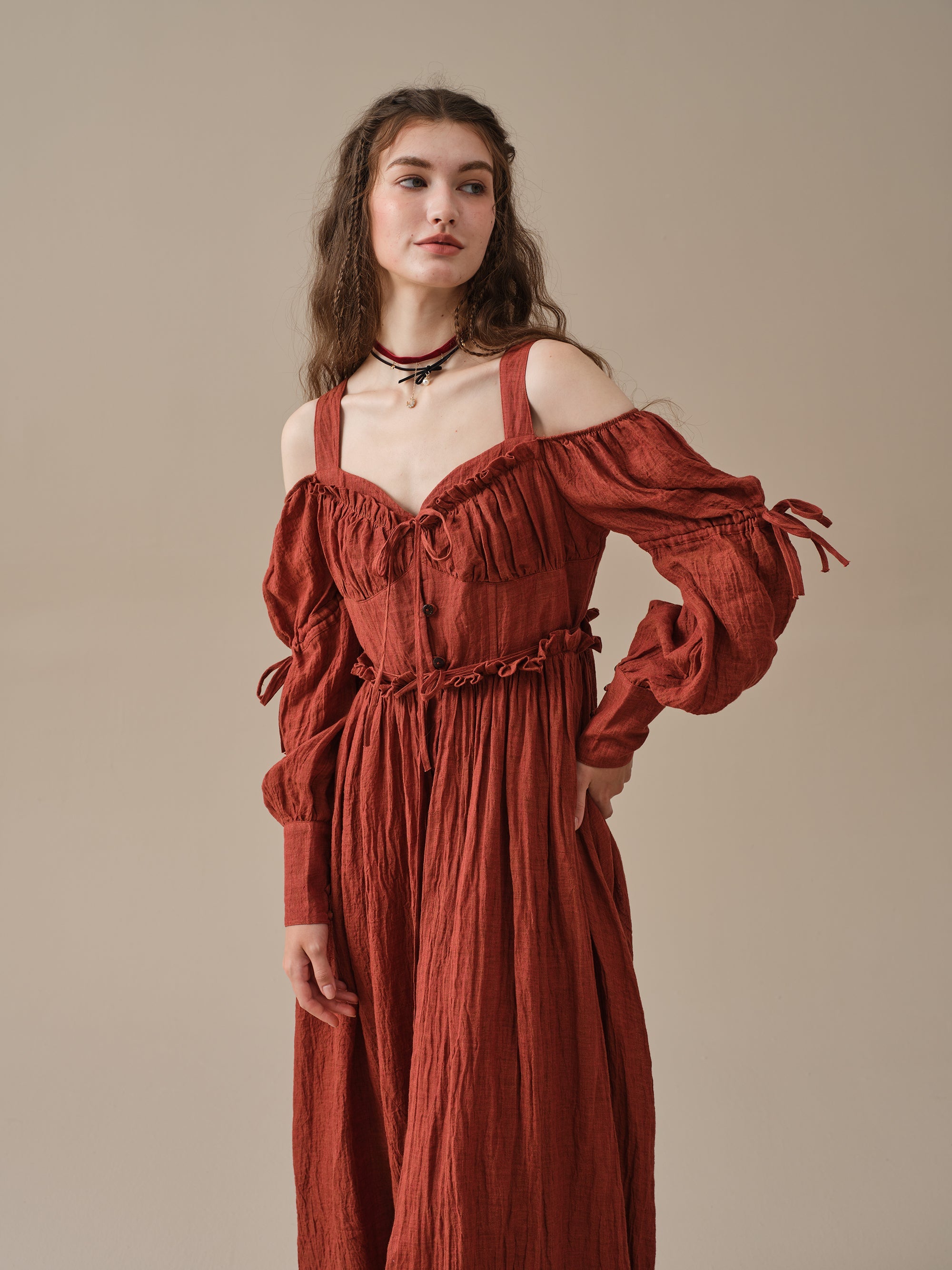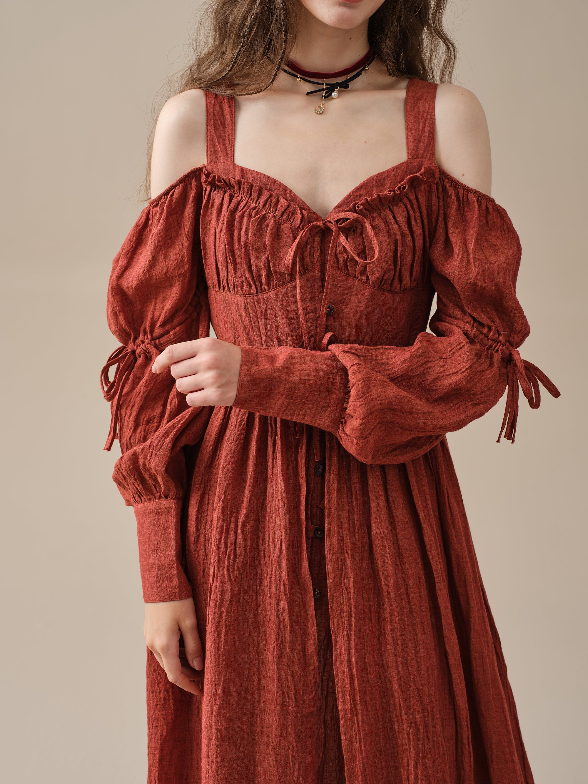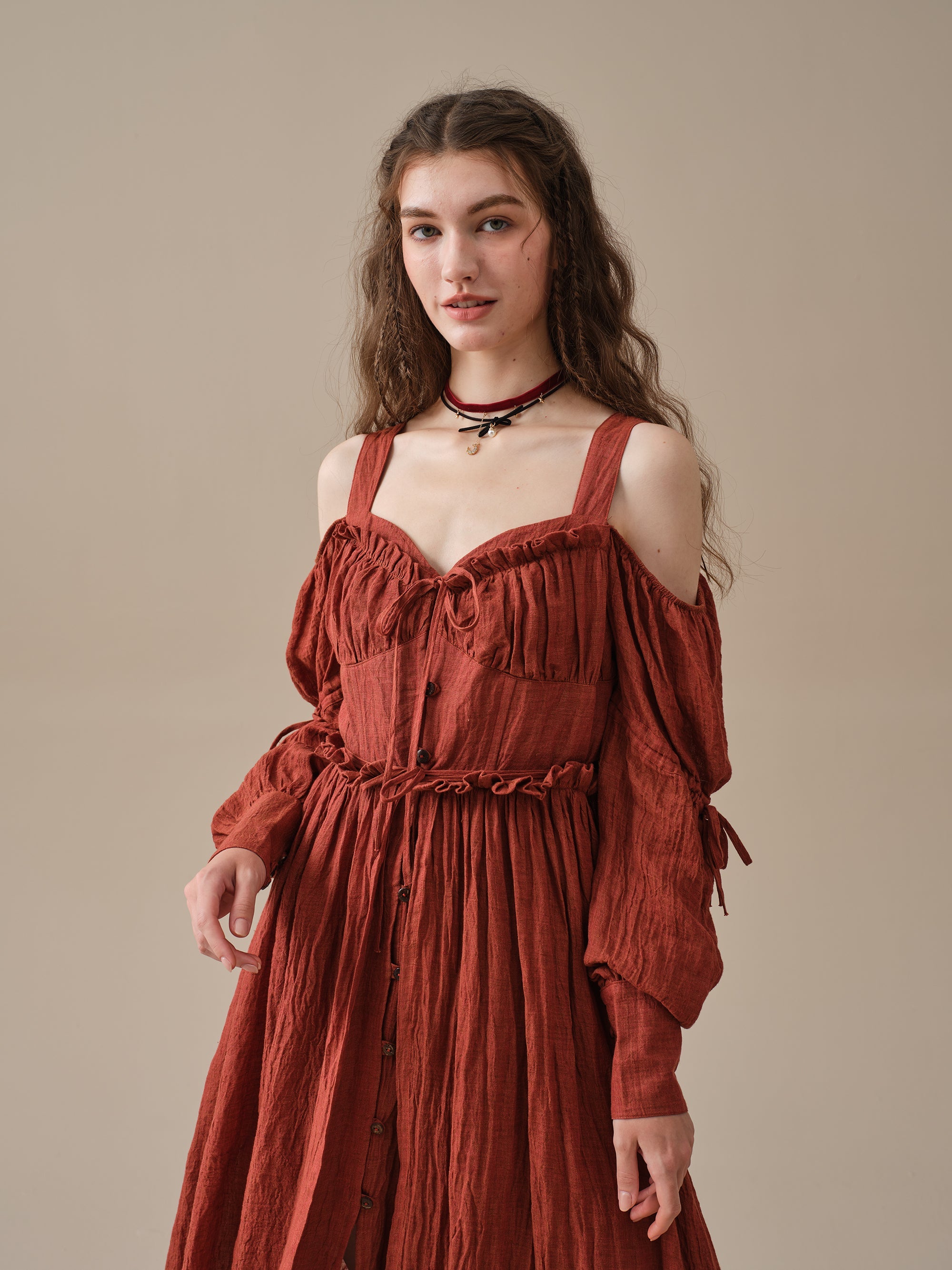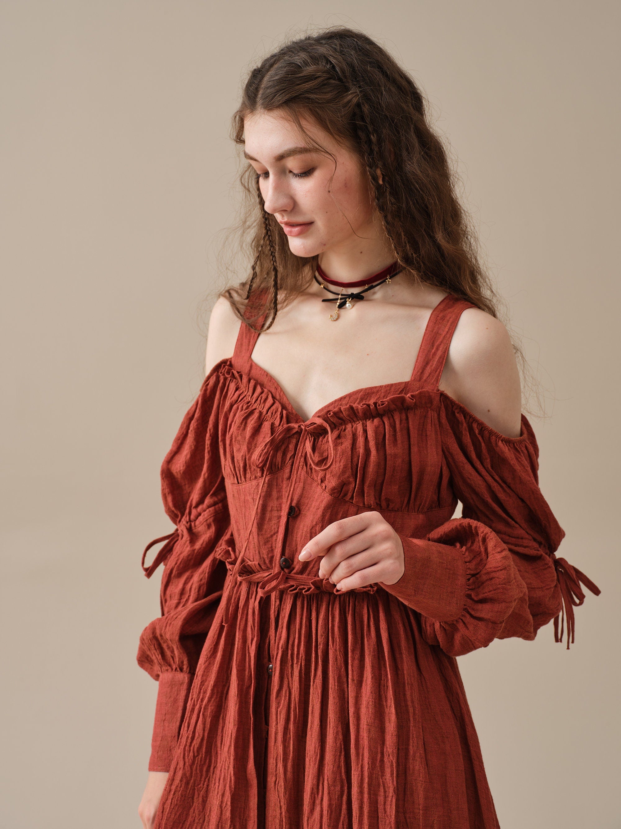 It's detailed with delicate ruffles, feminine silhouette and soft hues, perfect for whimsical and romantic looks. Eye-catching details such as cold-shoulder design, sweet sweetheart neckline,layered design, pleated details, front button fastening, lace-up details and charming puff sleeves, it exudes femininity at any time.