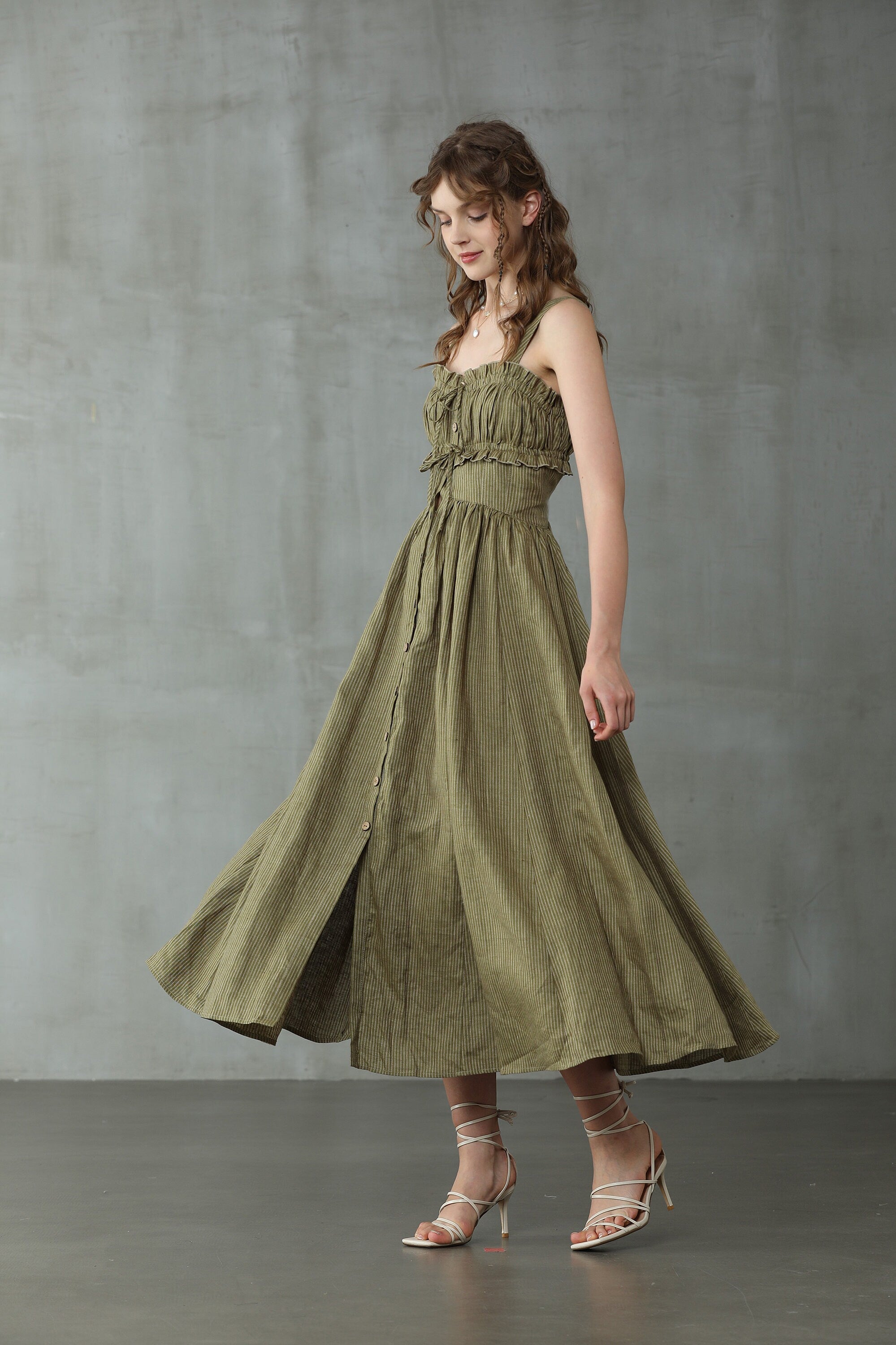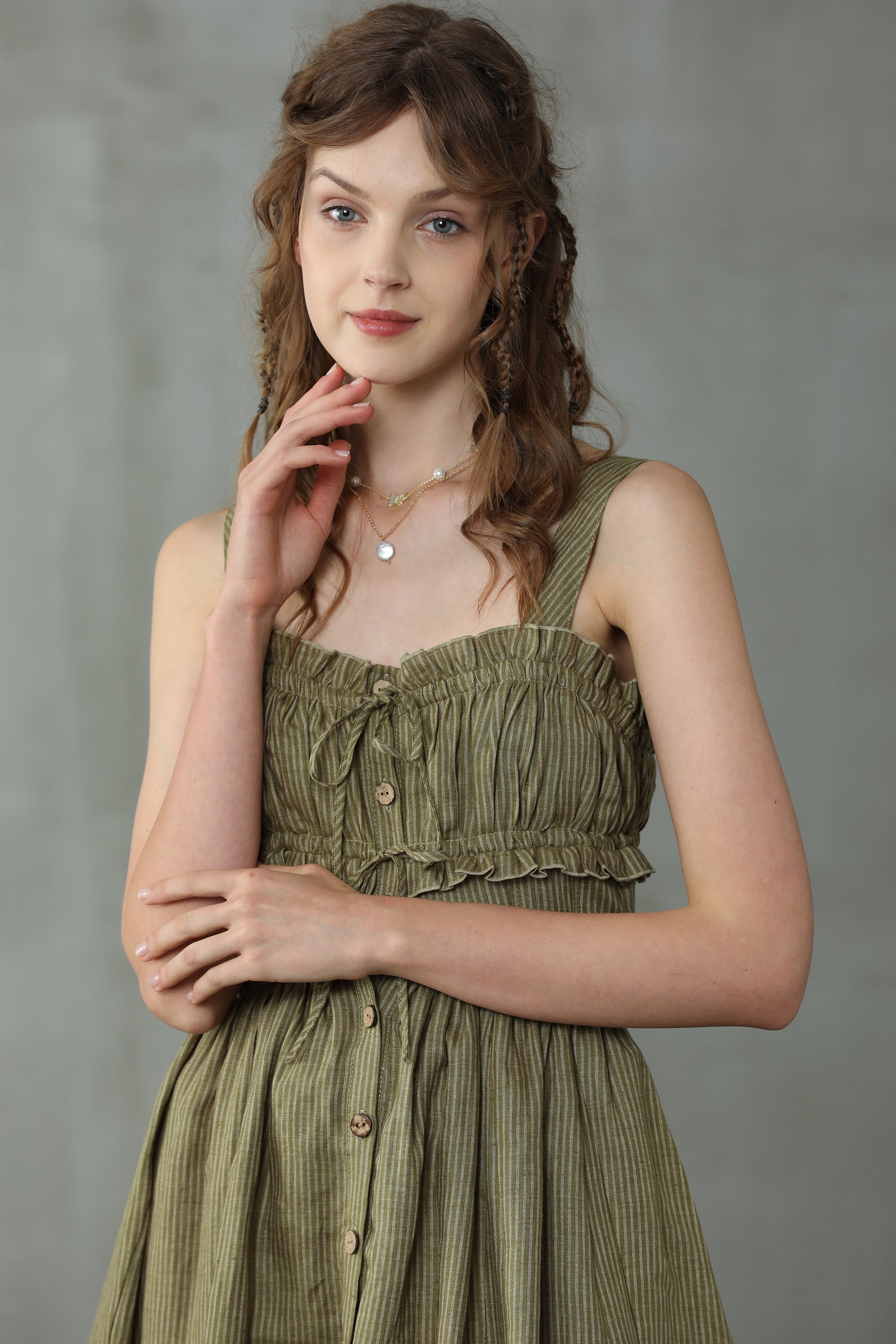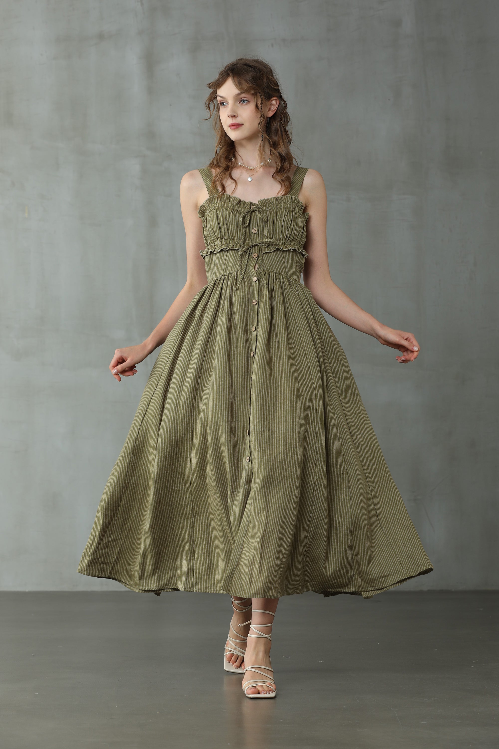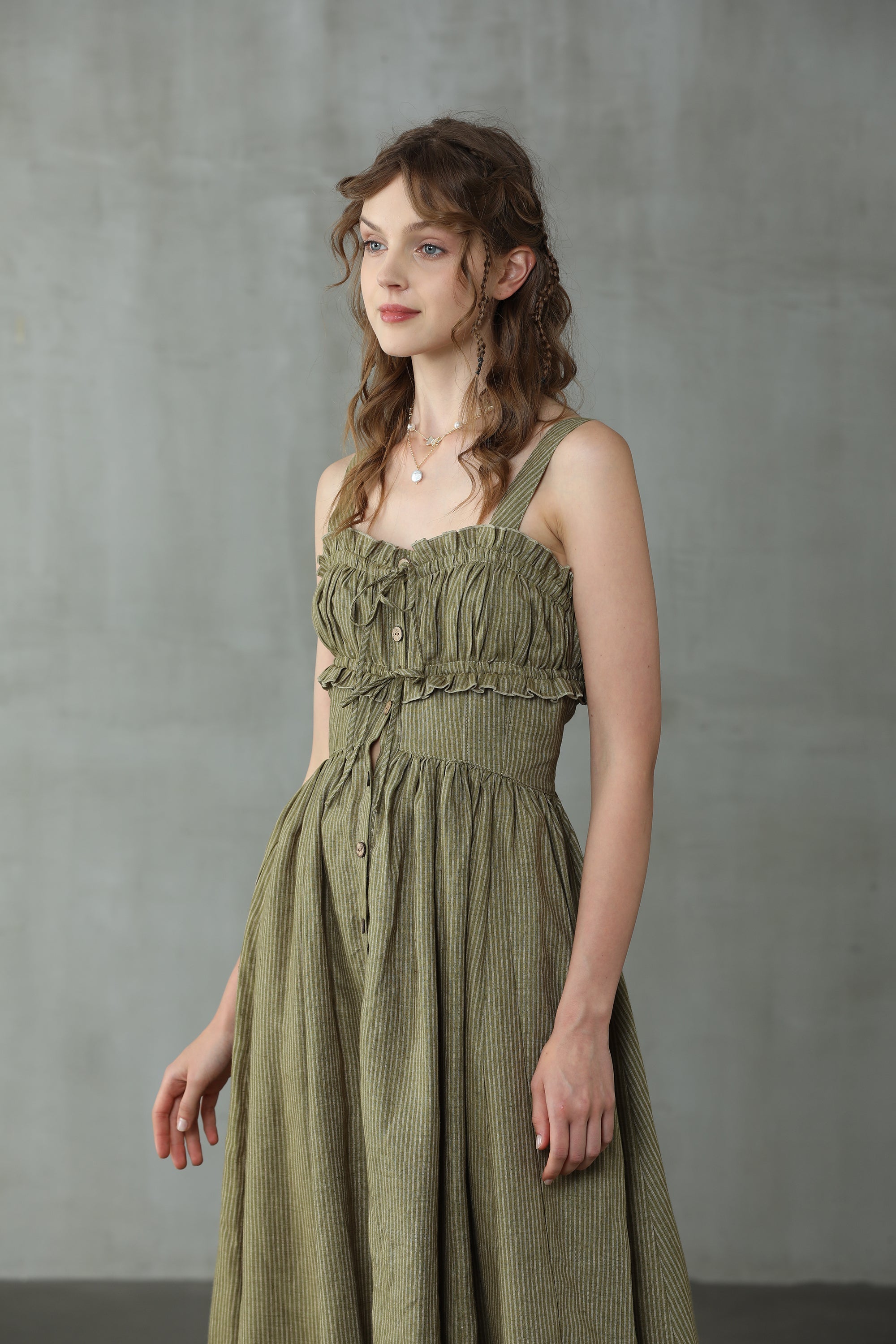 This dress is presented in olive green hue, lace up detail on the chest, front button fastening, ruffled and smocking details add to the piece's romantic nature.