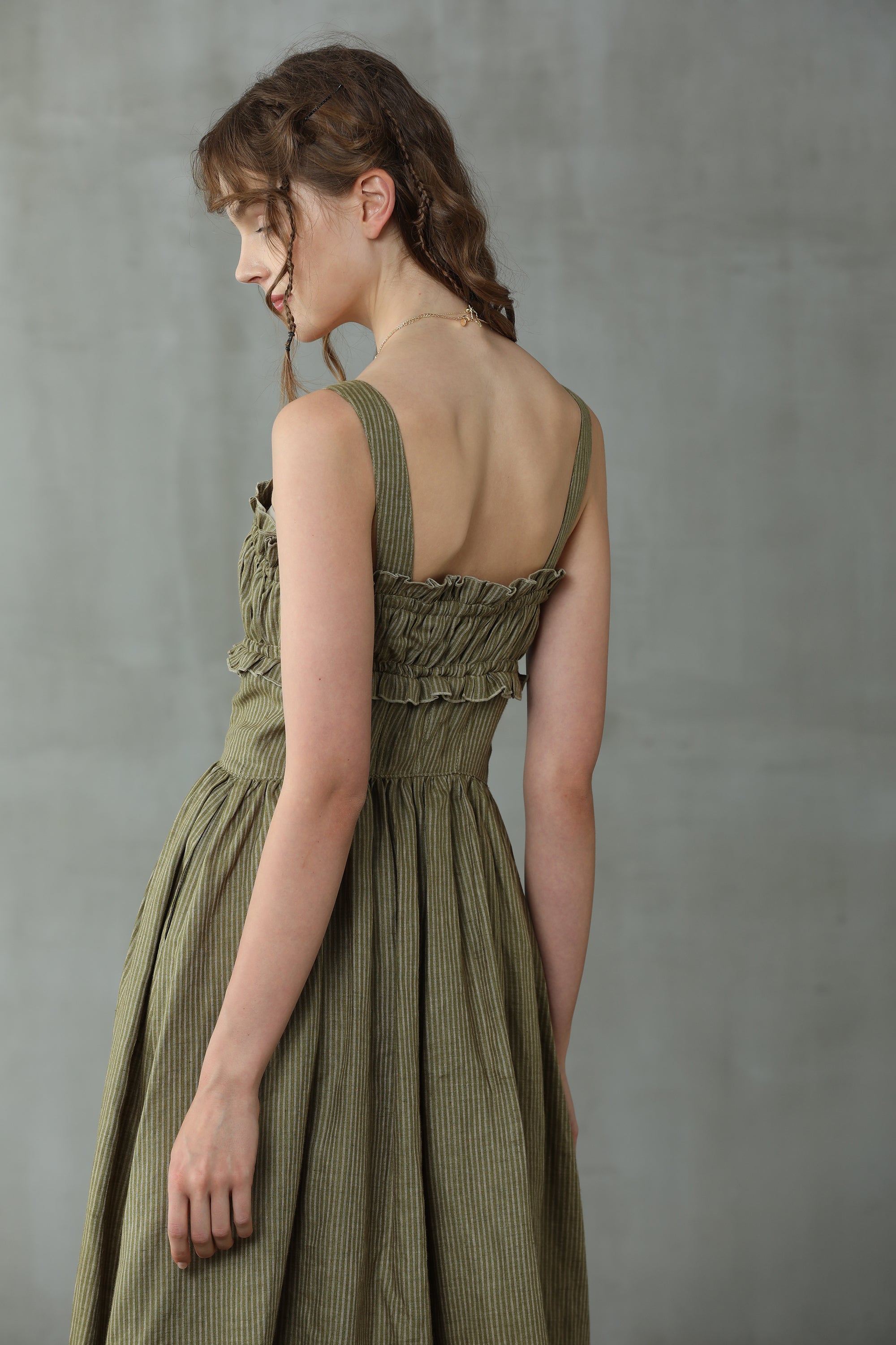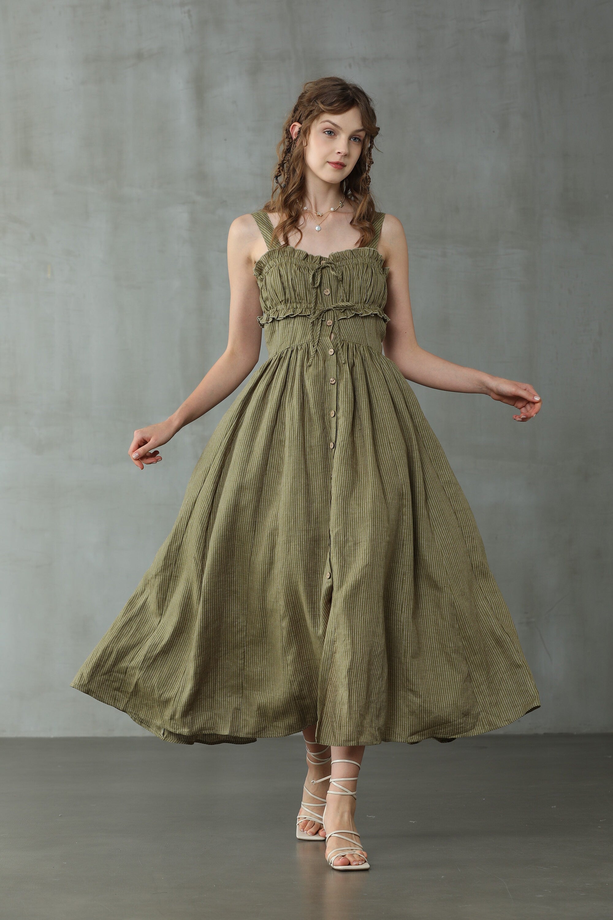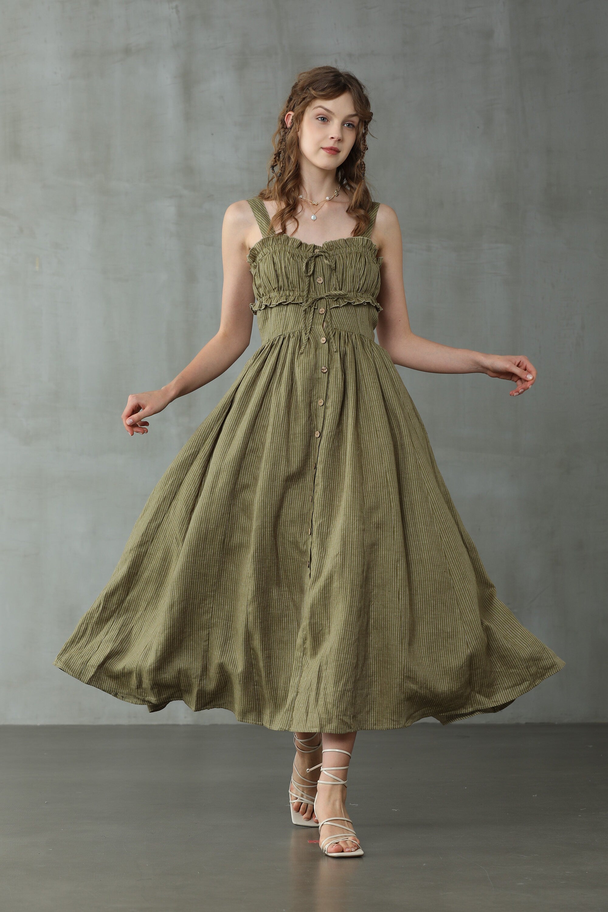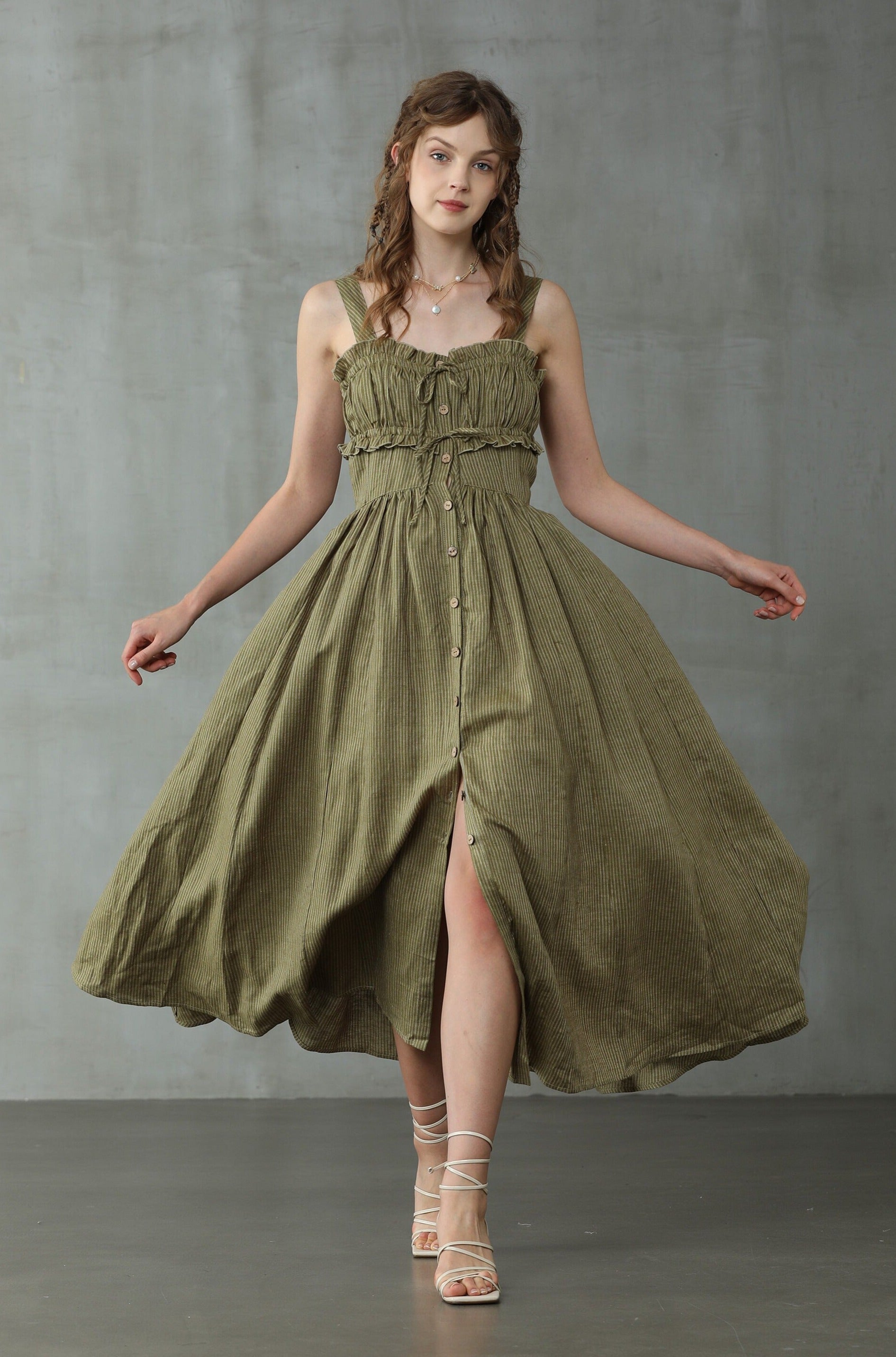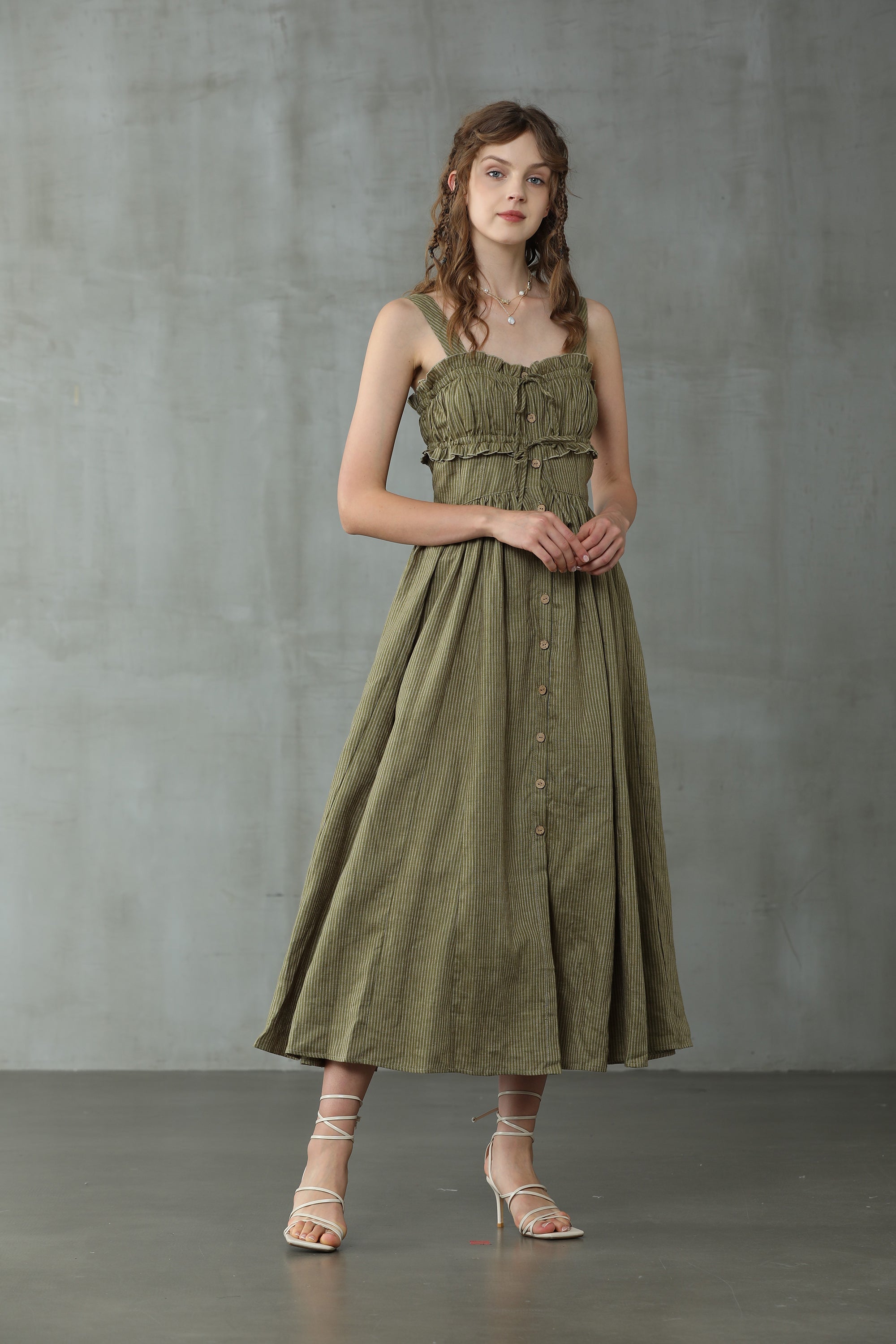 This dress is presented in olive green hue, lace up detail on the chest, front button fastening, ruffled and smocking details add to the piece's romantic nature.