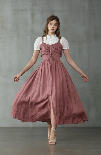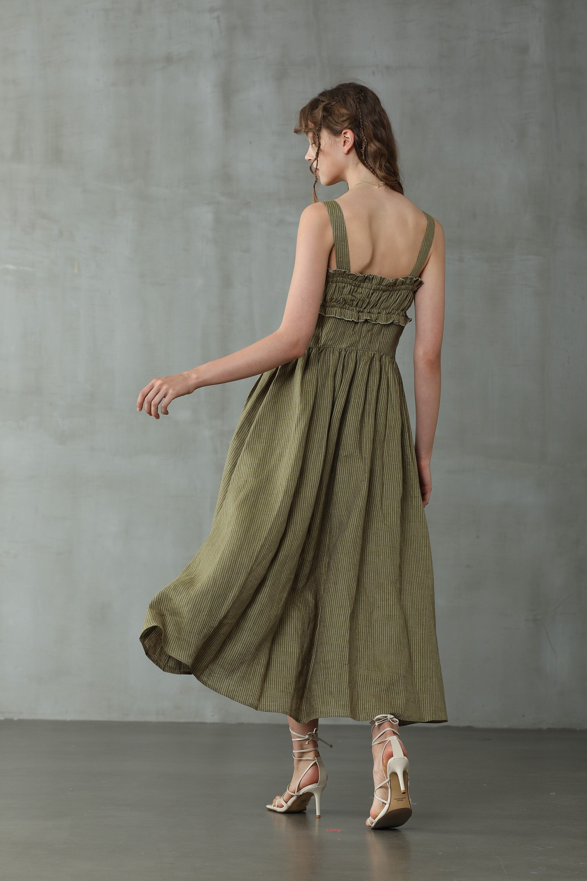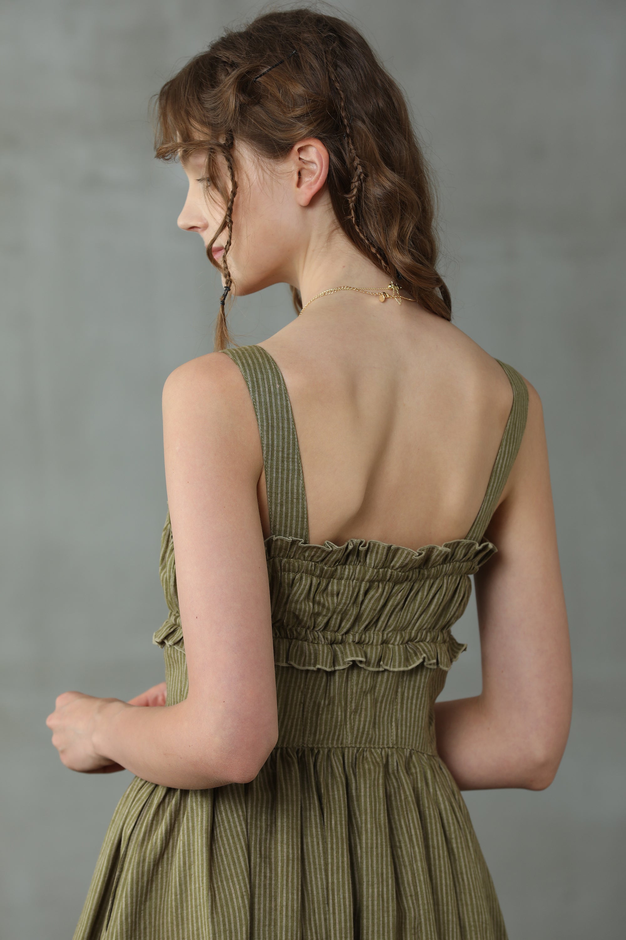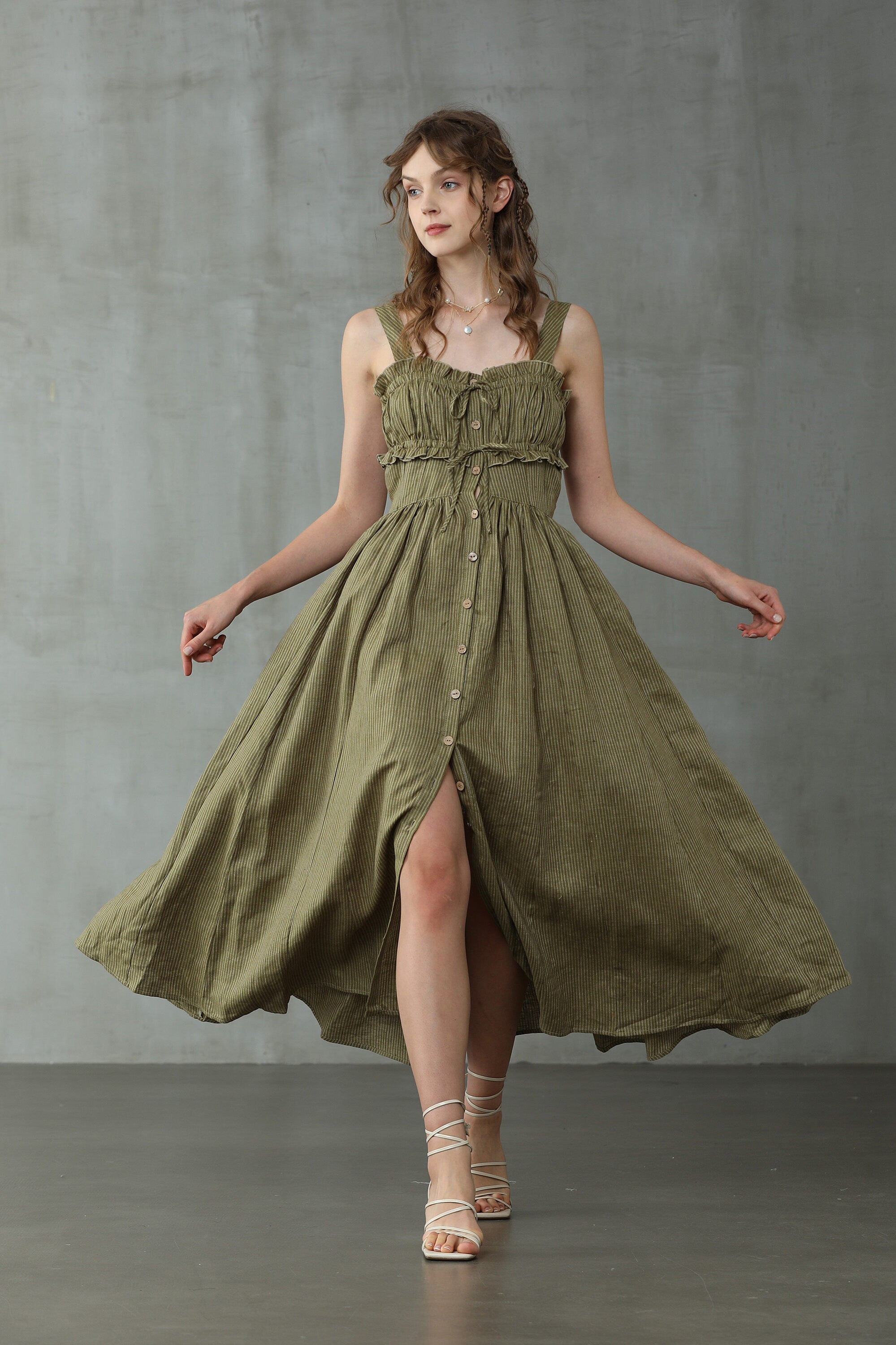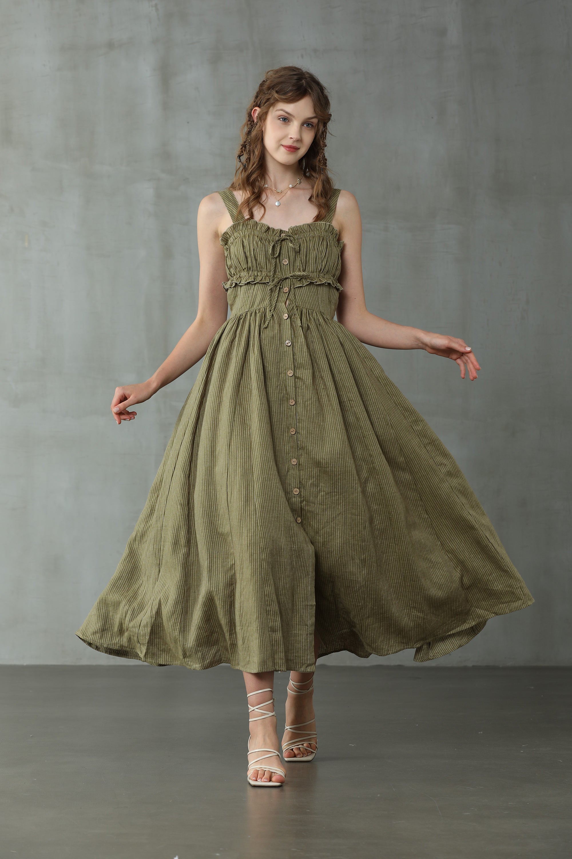 This dress is presented in olive green hue, lace up detail on the chest, front button fastening, ruffled and smocking details add to the piece's romantic nature.