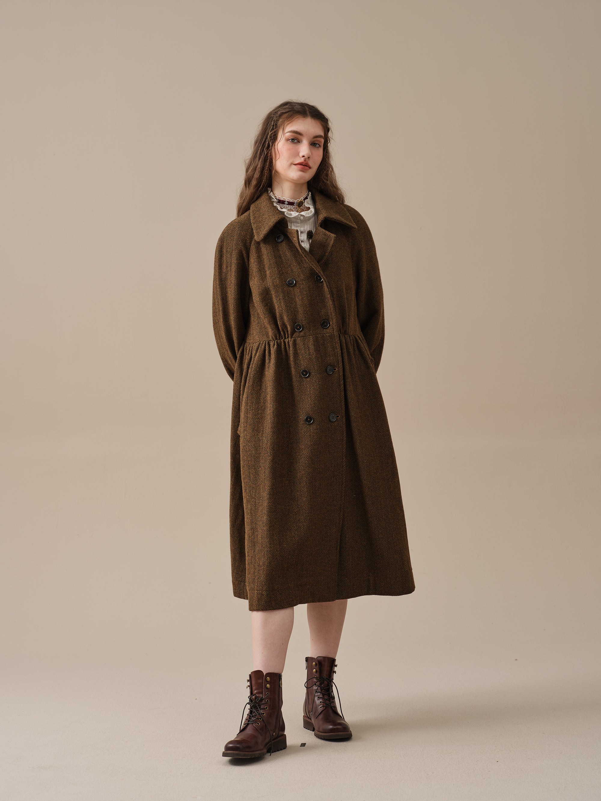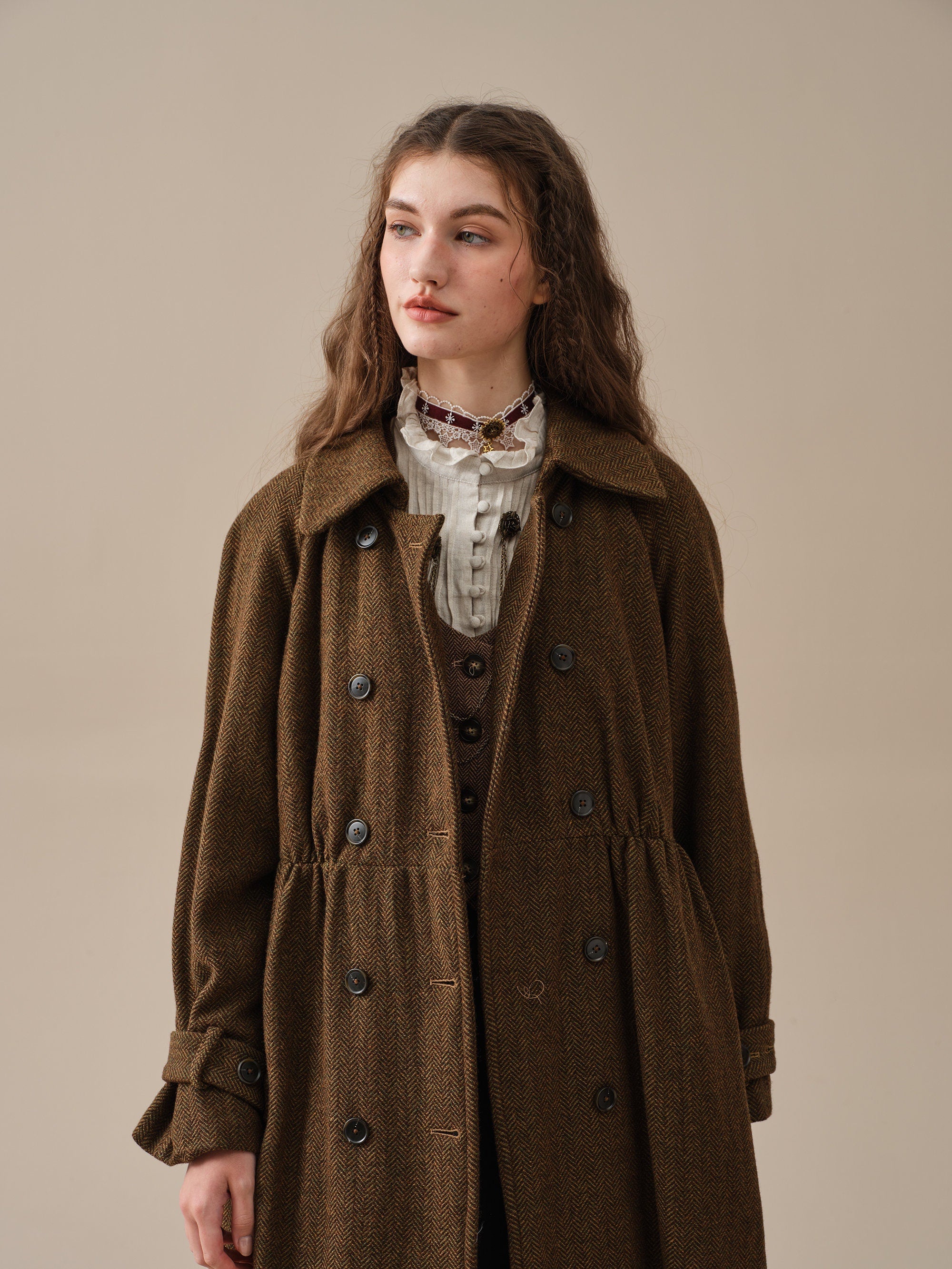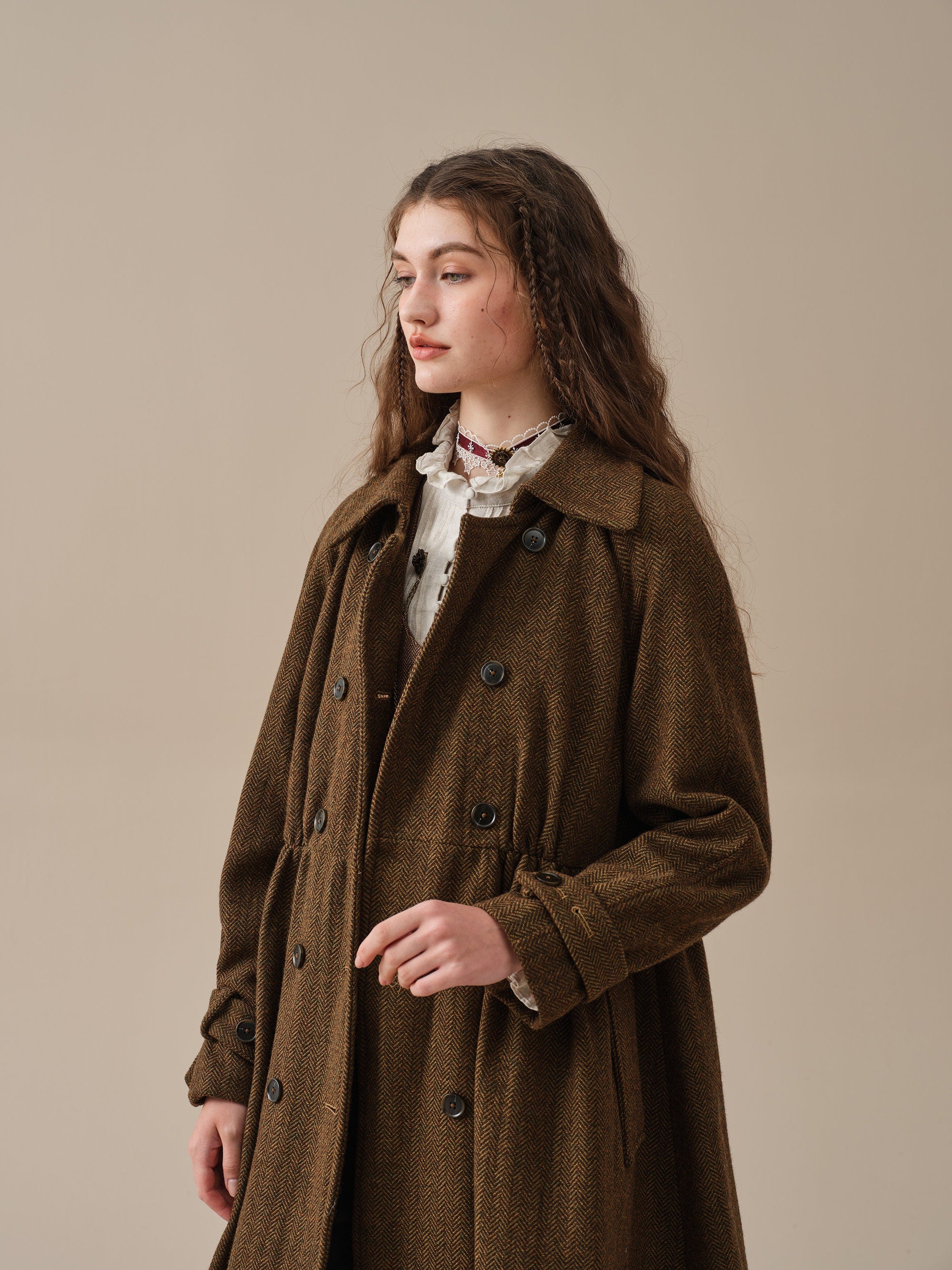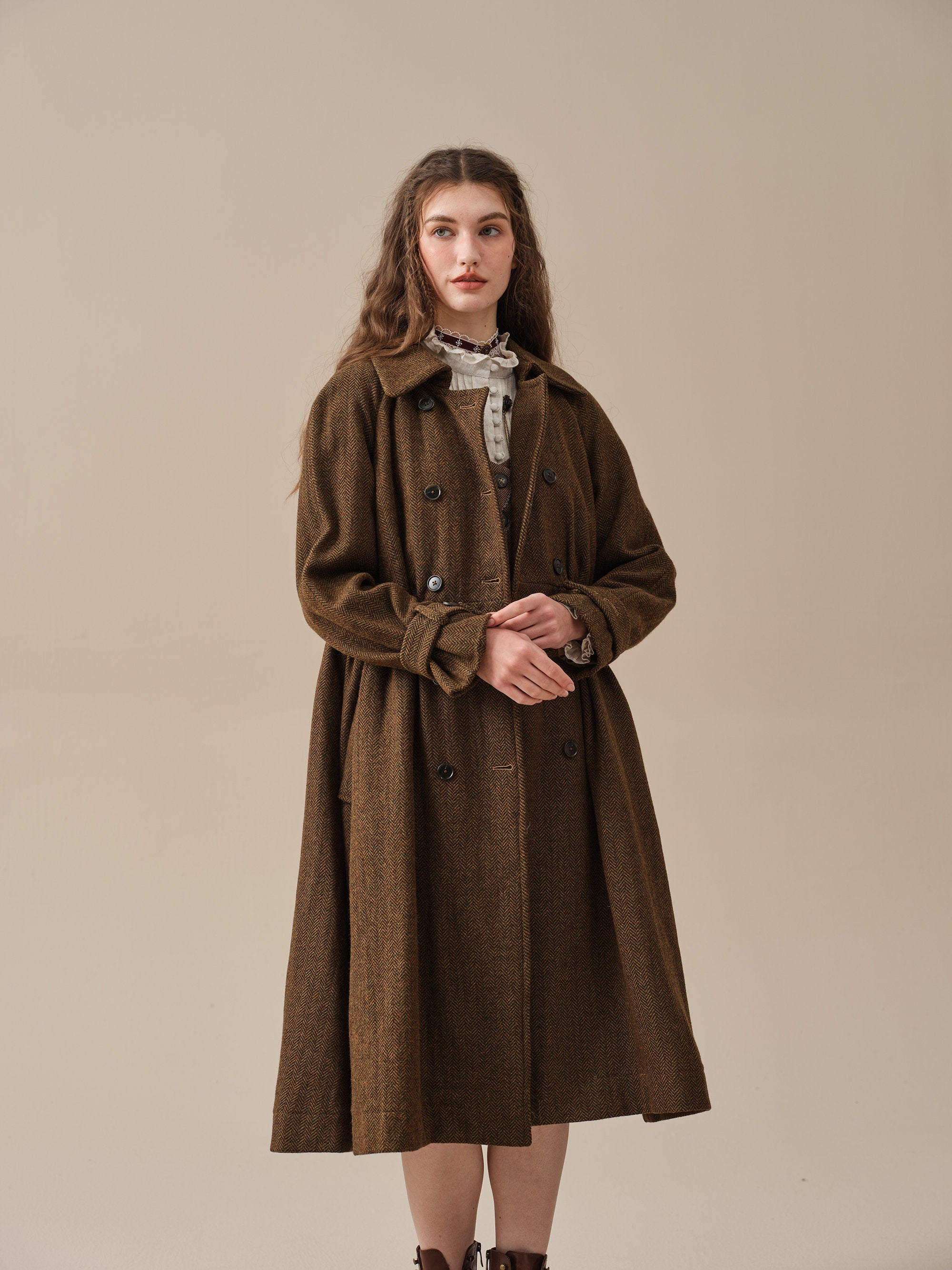 This coat is inspired by the vintage trench coat design and features a brown herringbone construction that lends a timeless feel to the piece.