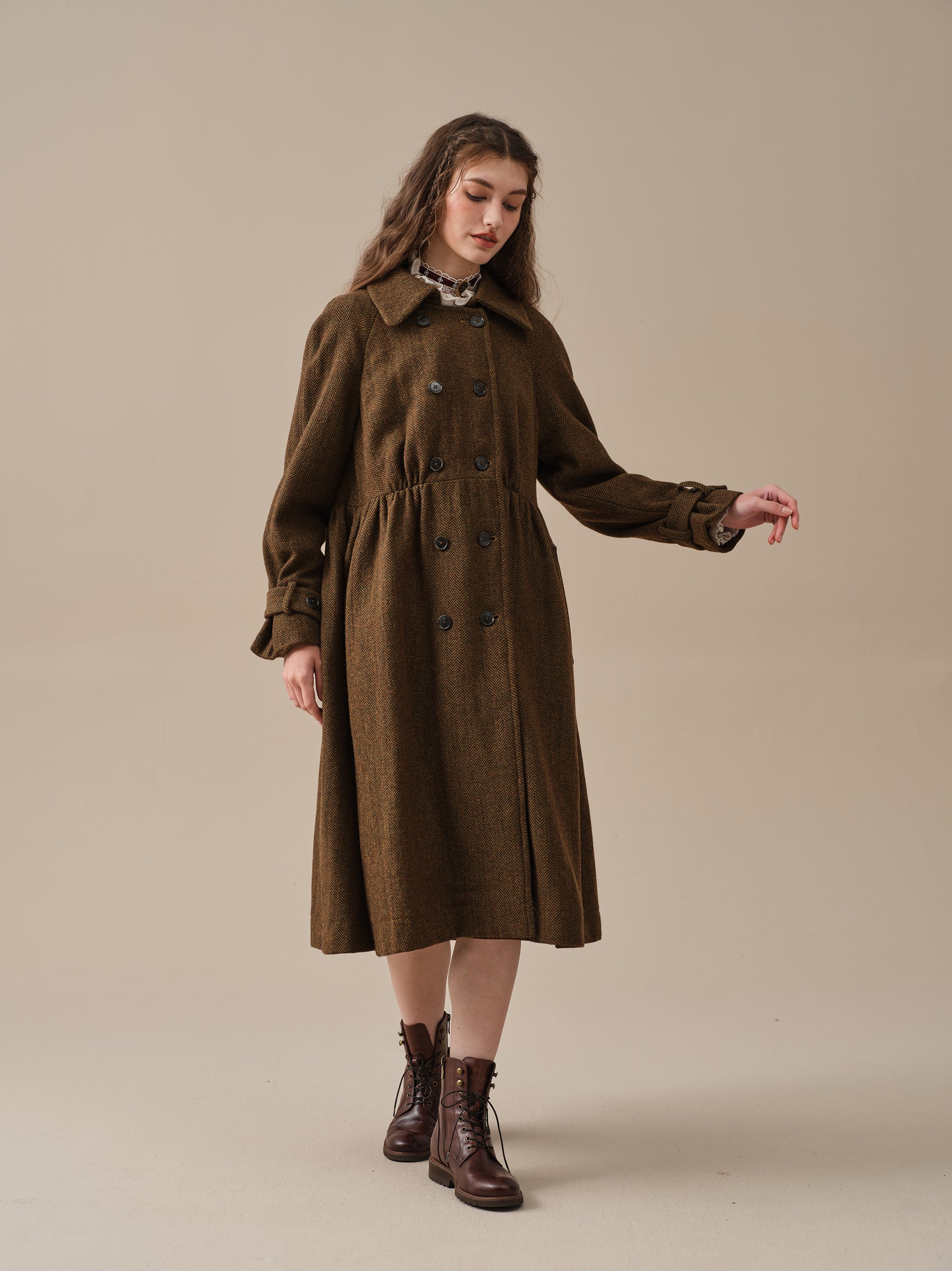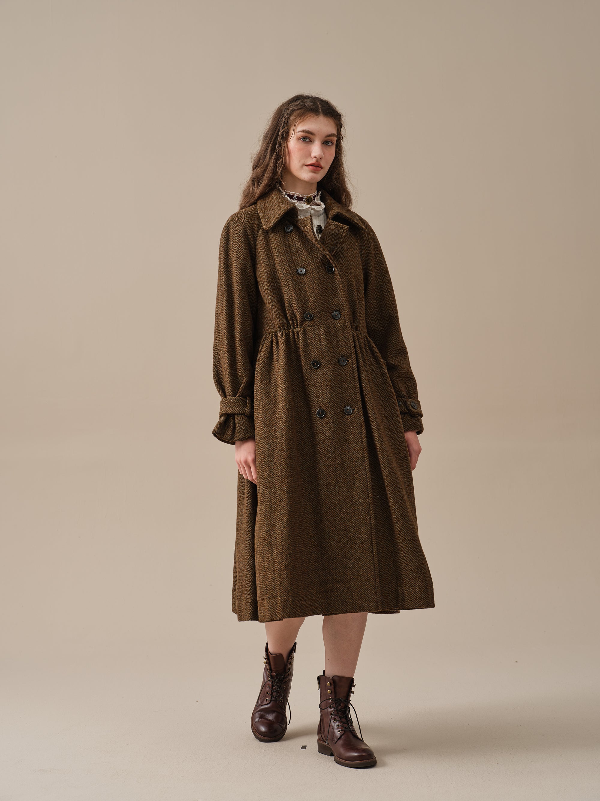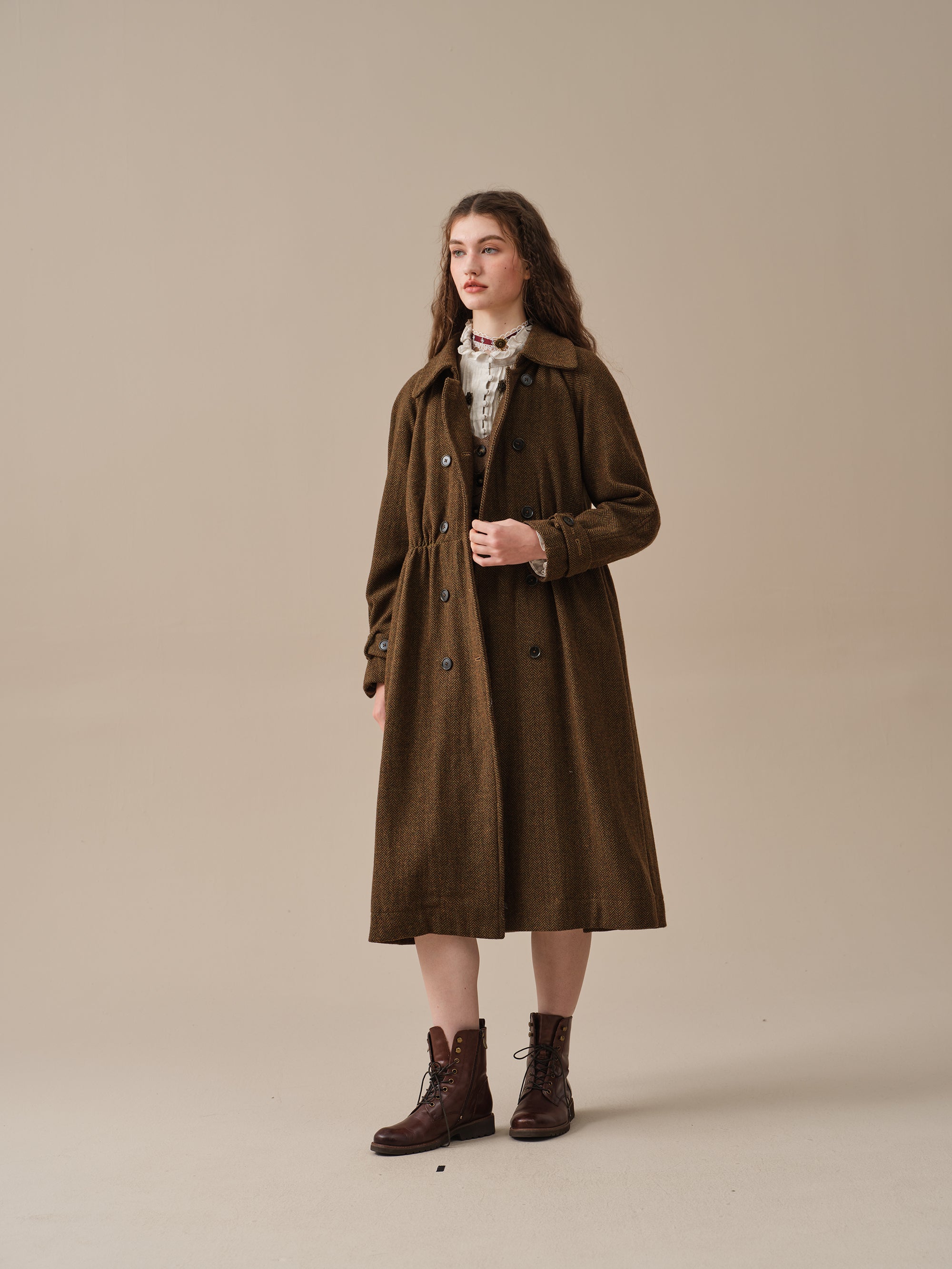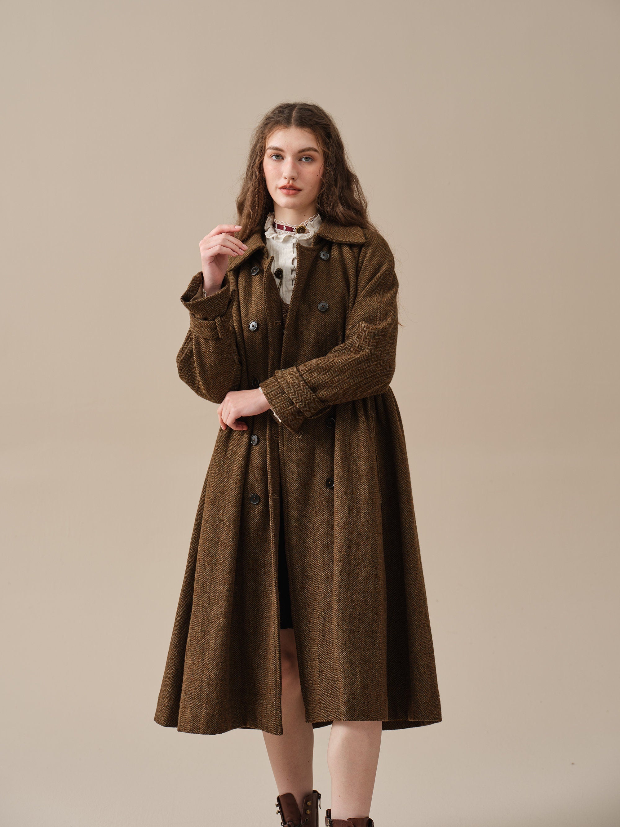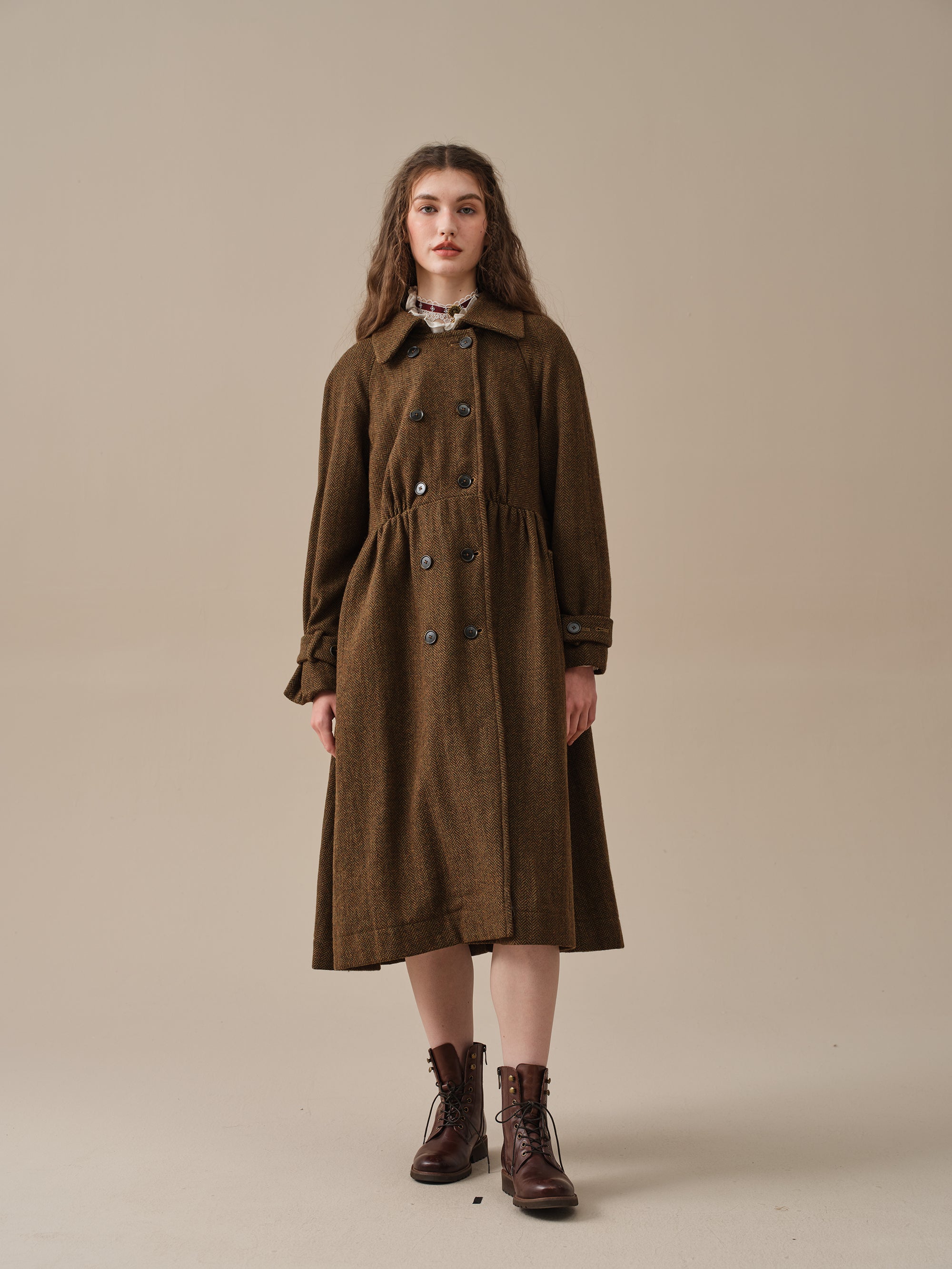 This coat is inspired by the vintage trench coat design and features a brown herringbone construction that lends a timeless feel to the piece.