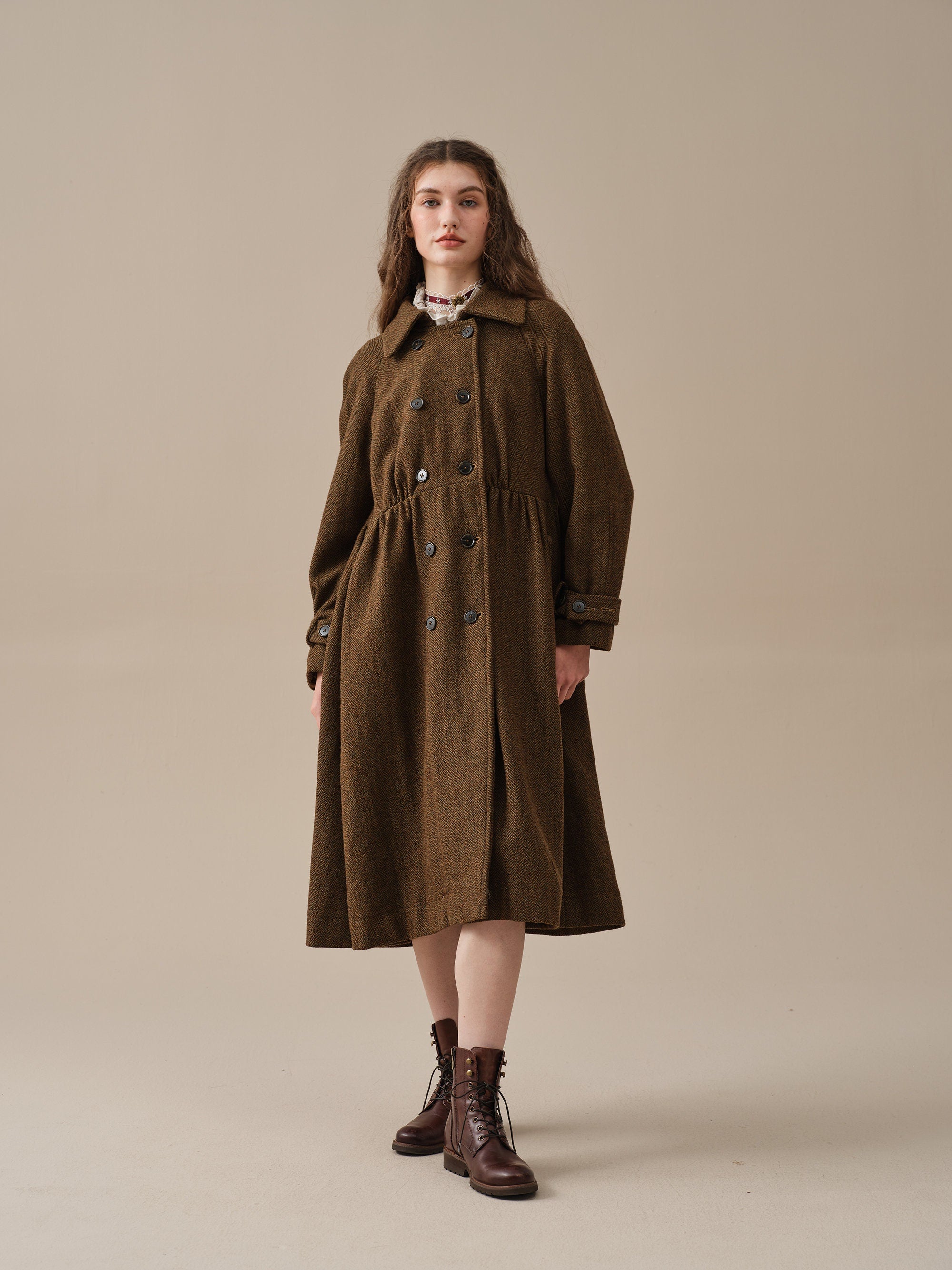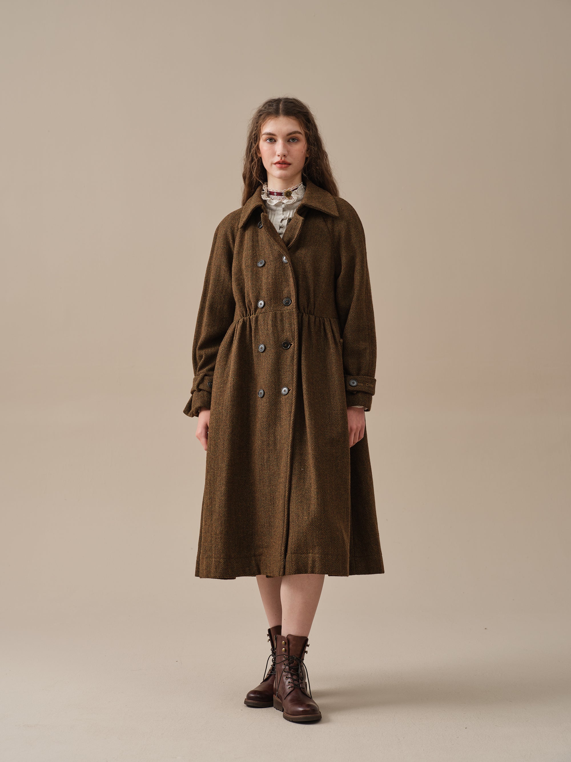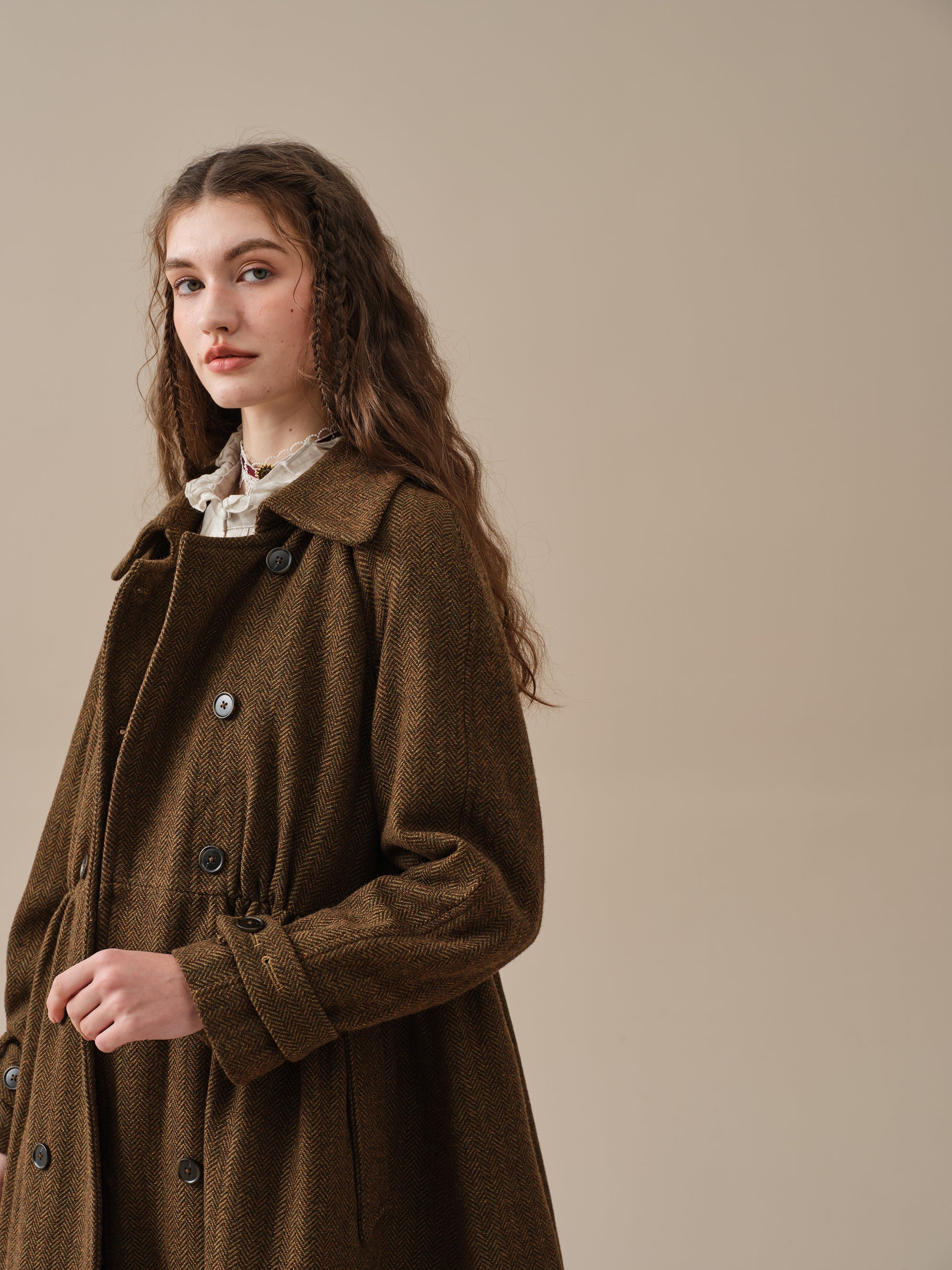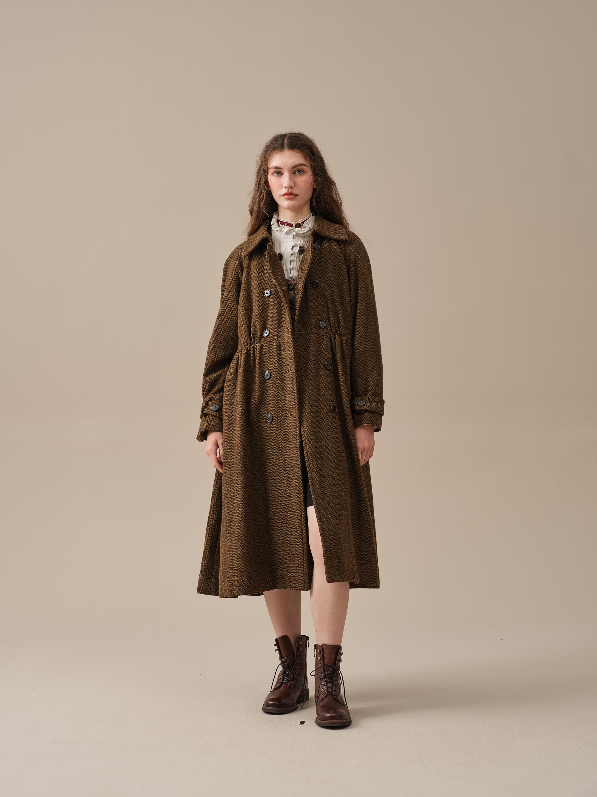 This coat is inspired by the vintage trench coat design and features a brown herringbone construction that lends a timeless feel to the piece.