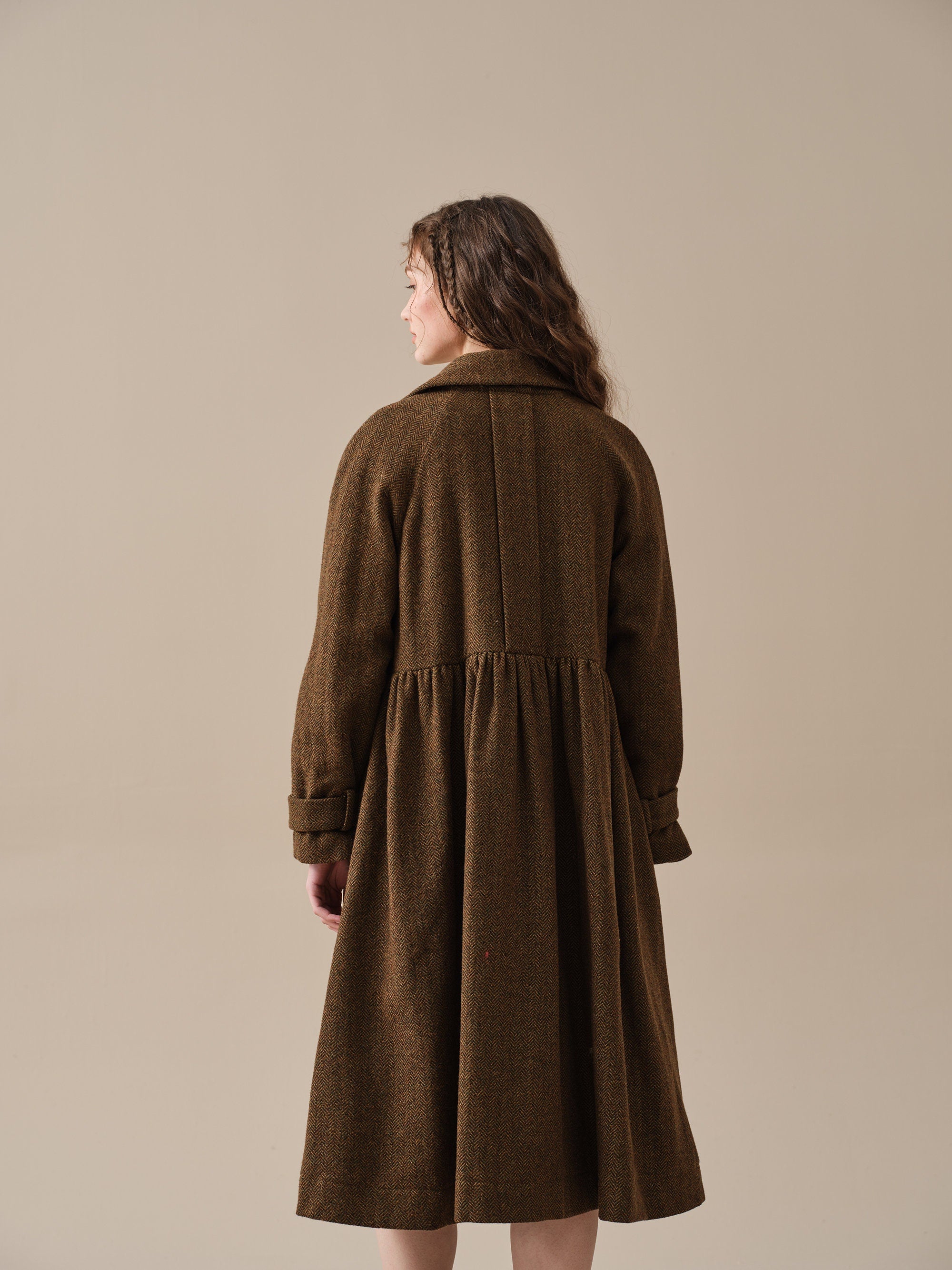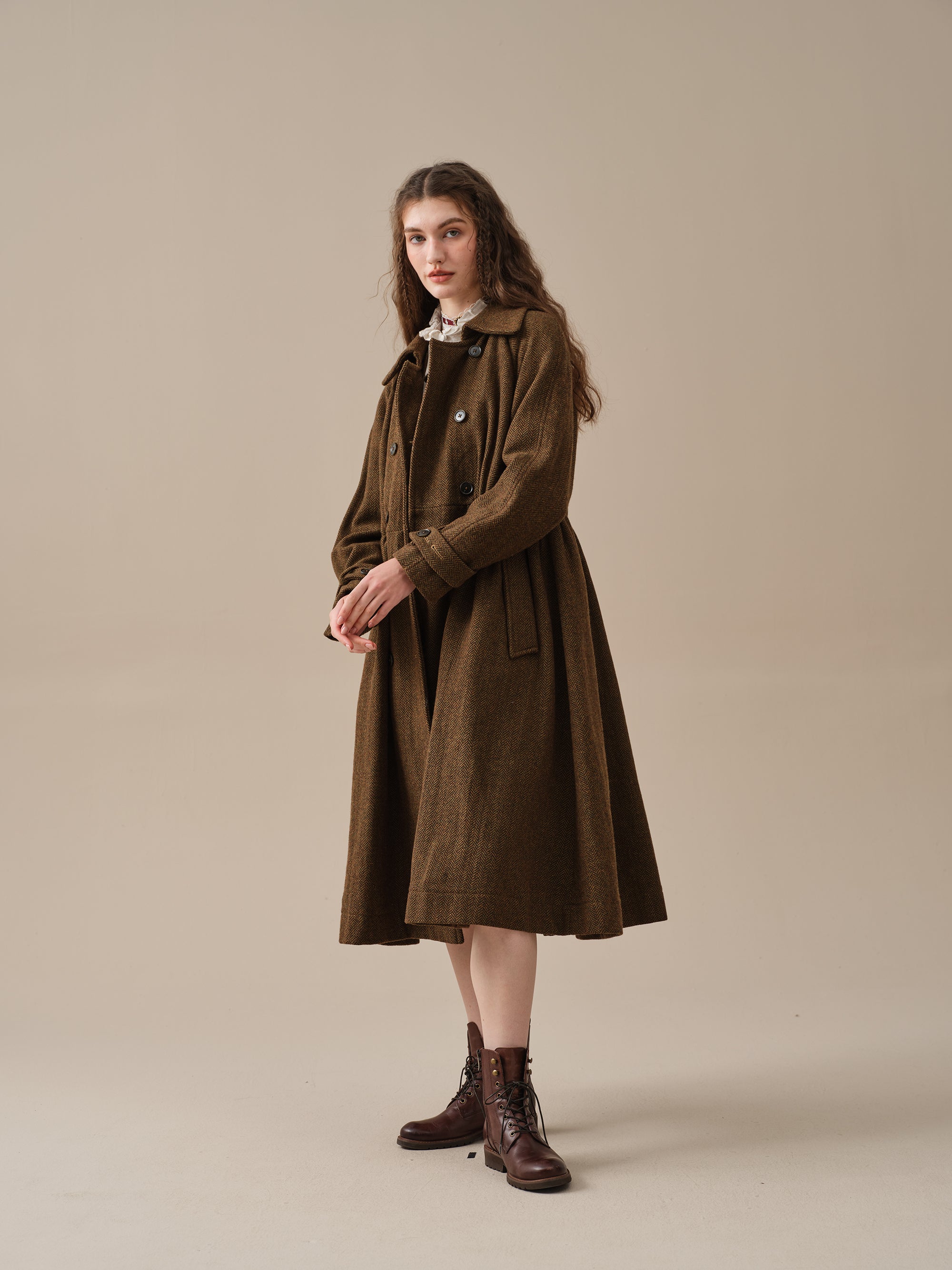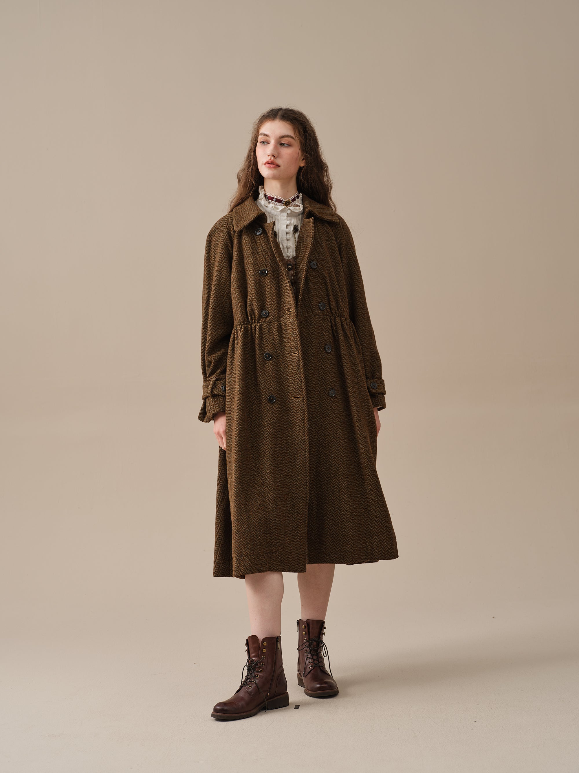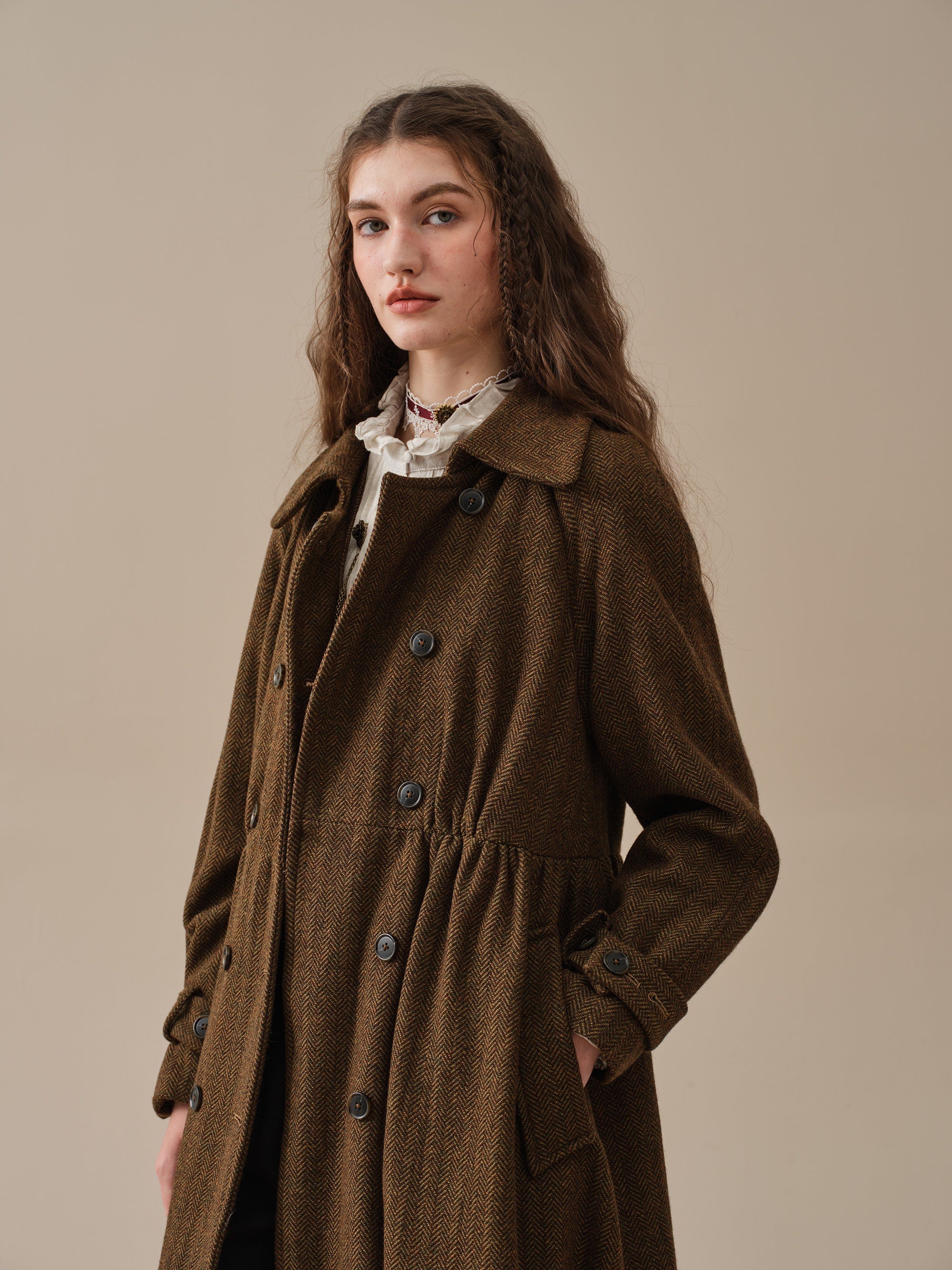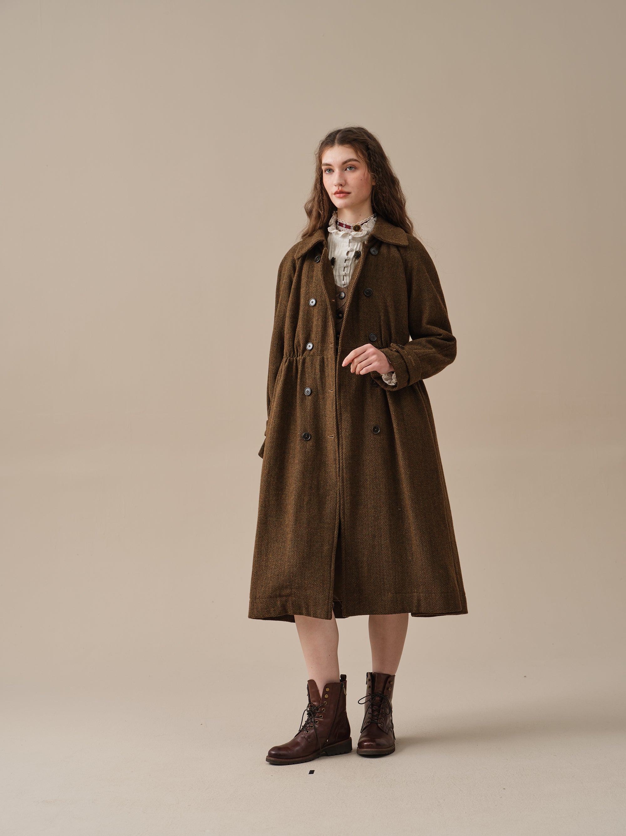 This coat is inspired by the vintage trench coat design and features a brown herringbone construction that lends a timeless feel to the piece.