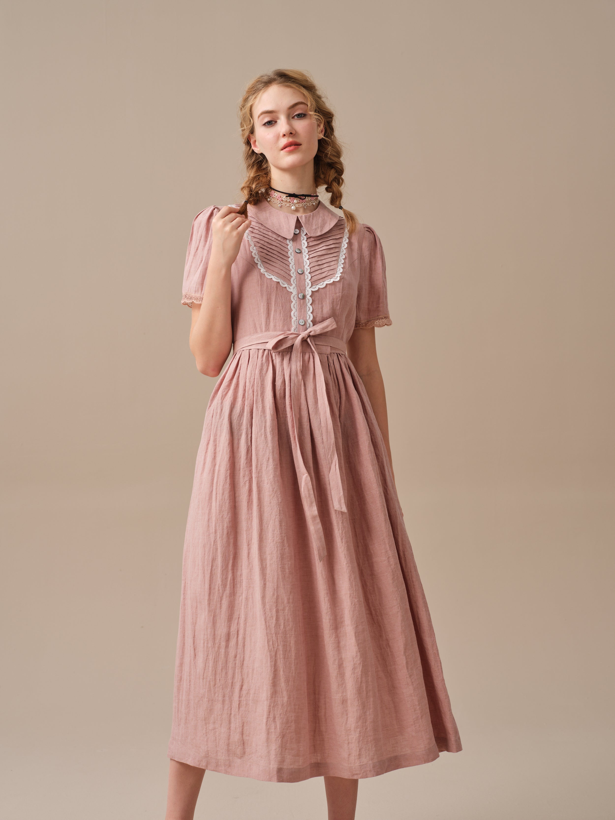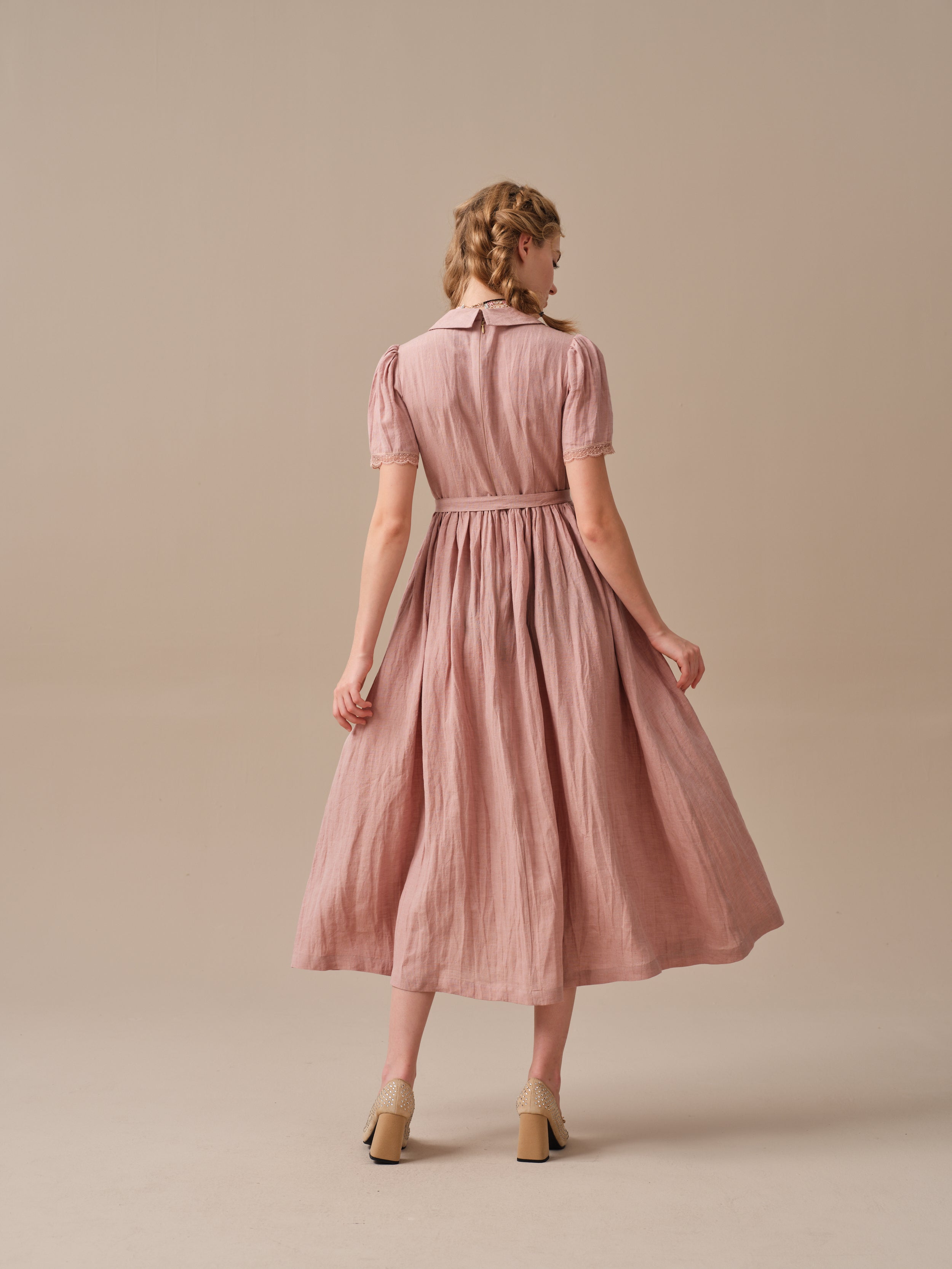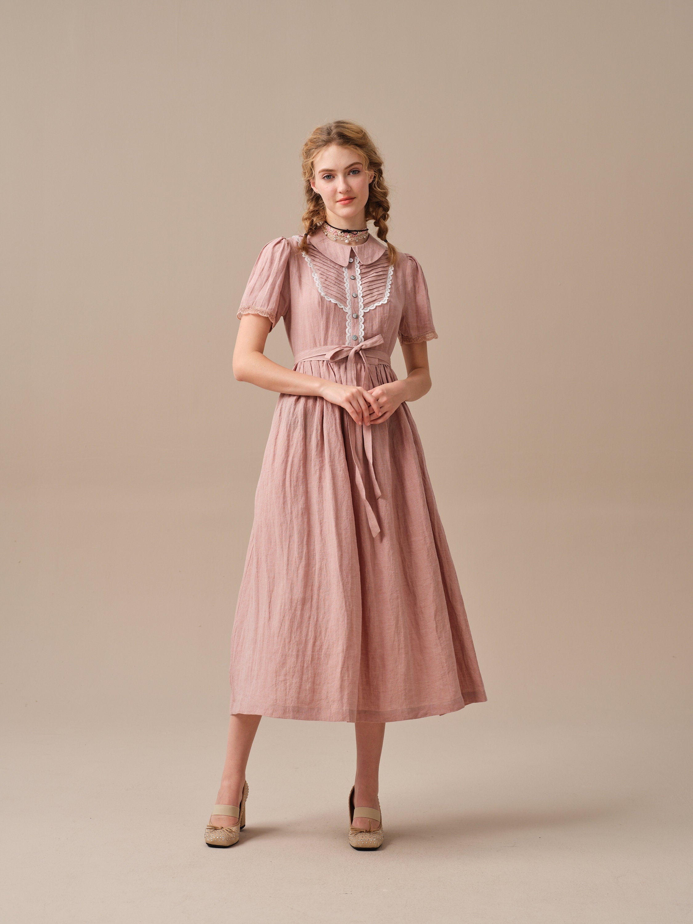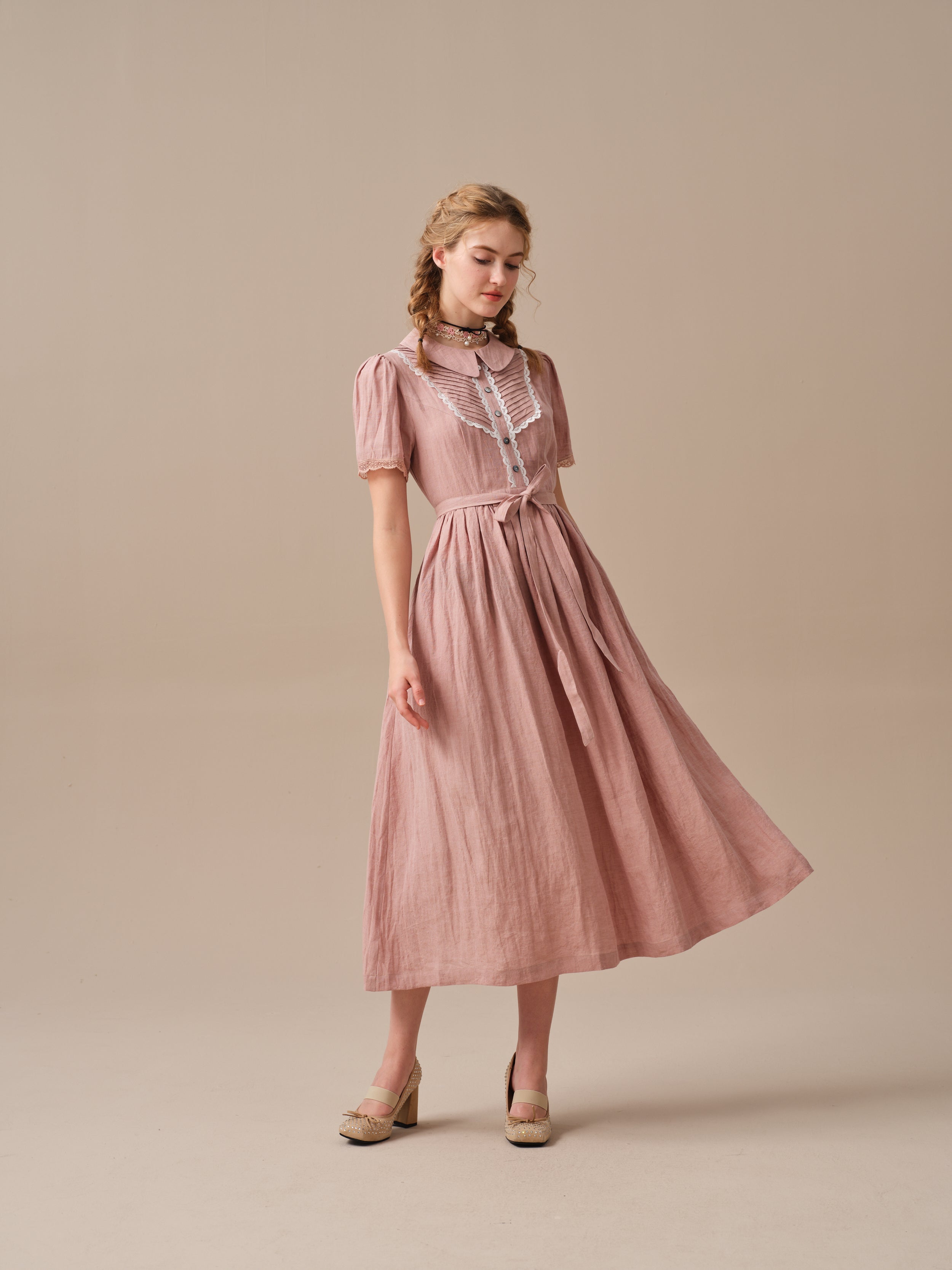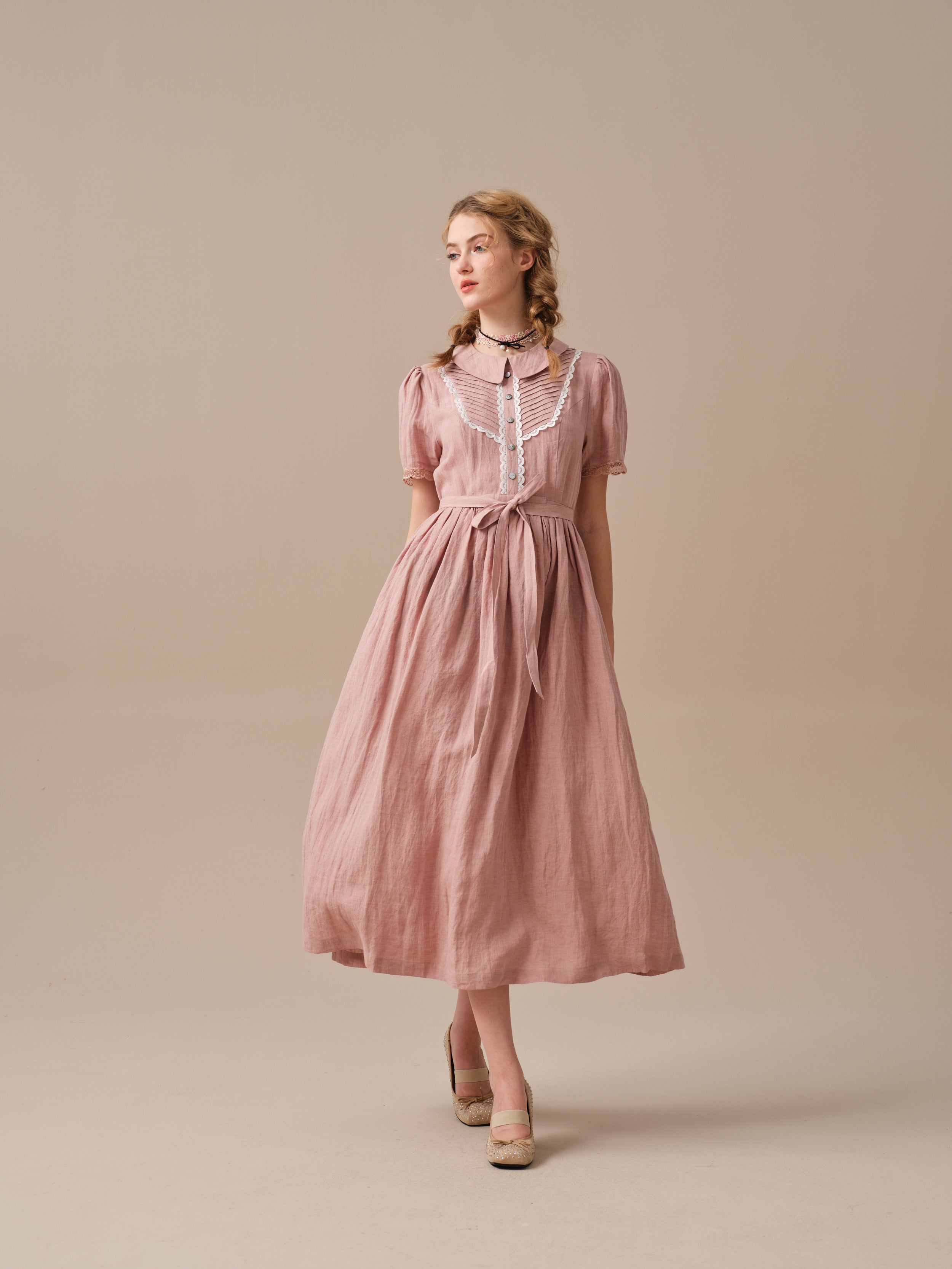 The soft pink hue is reminiscent of gentle summer sunset, romantic and tranquil. The Peter Pan collar adds a delightful flair to this dress.