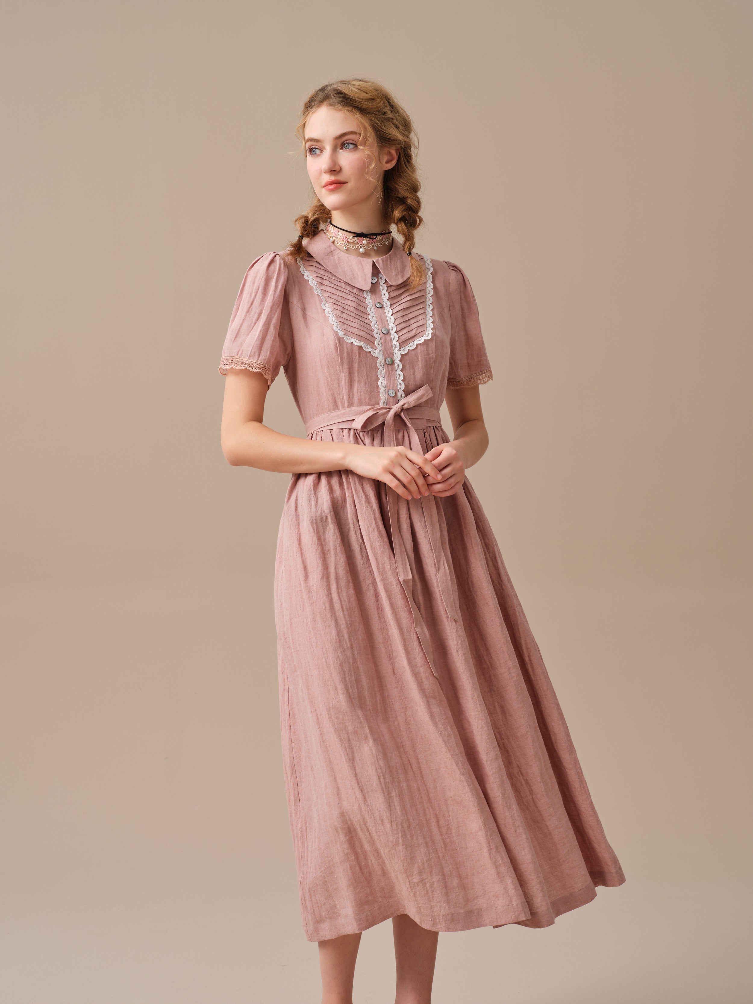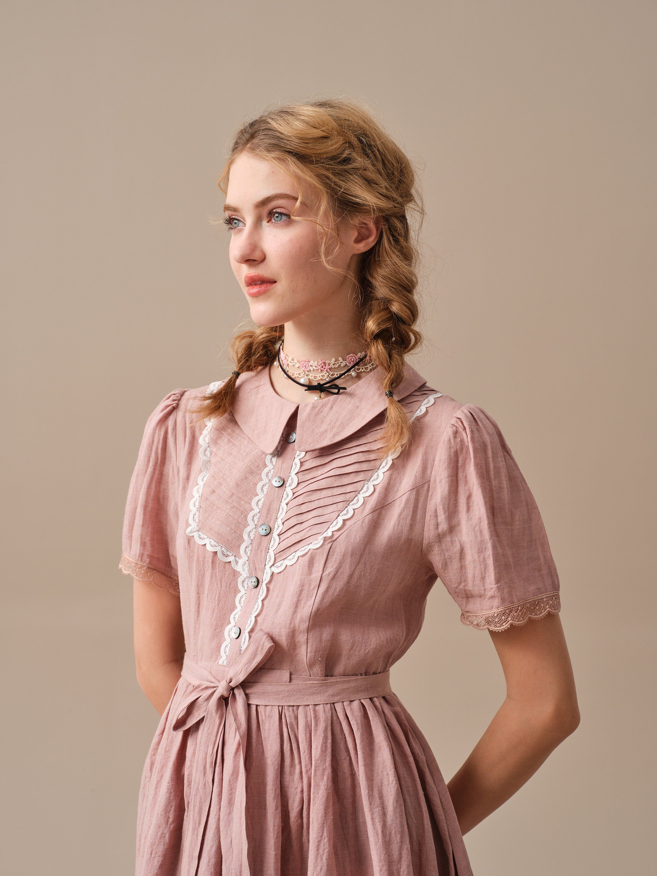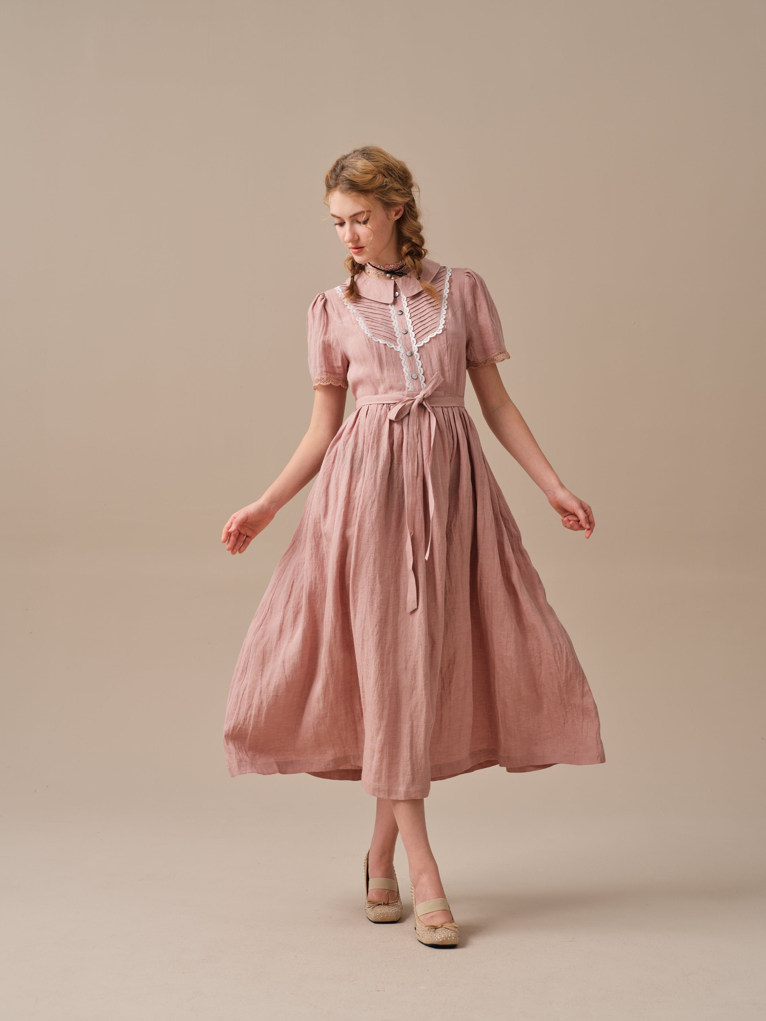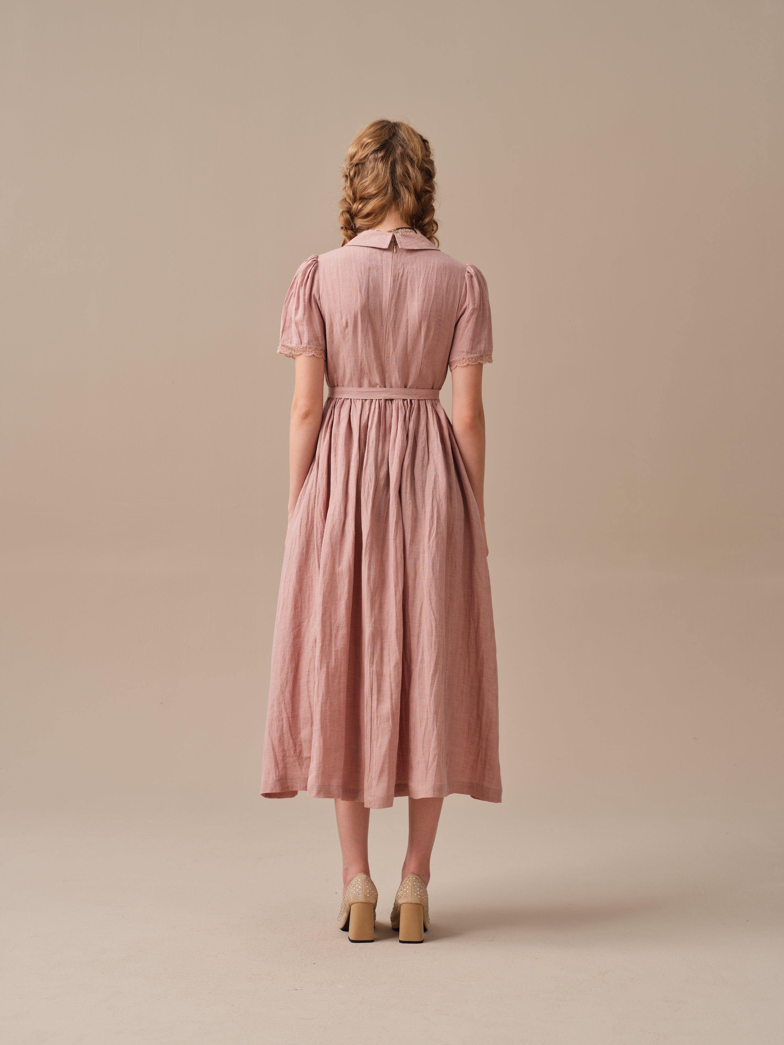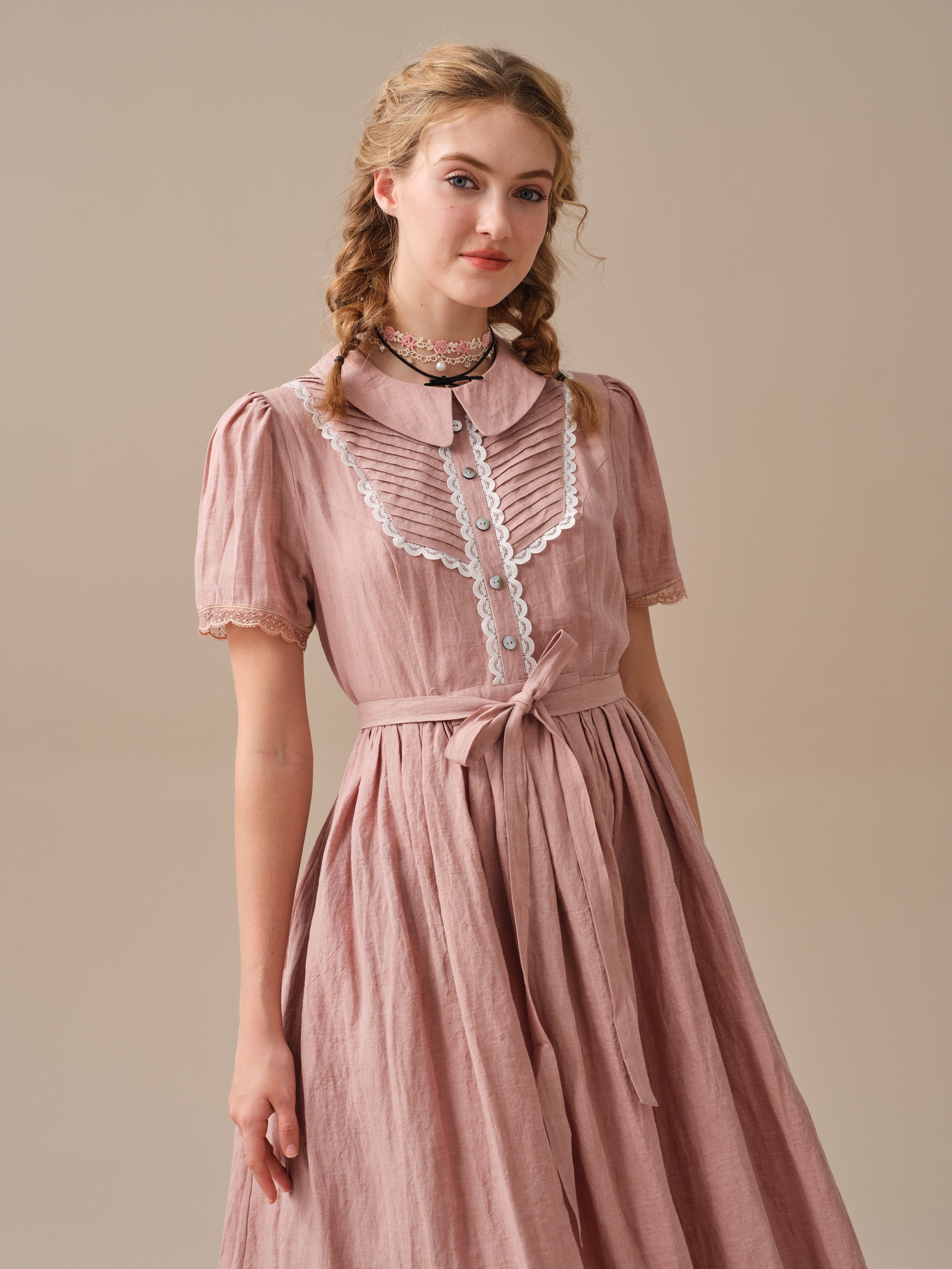 The soft pink hue is reminiscent of gentle summer sunset, romantic and tranquil. The Peter Pan collar adds a delightful flair to this dress.
