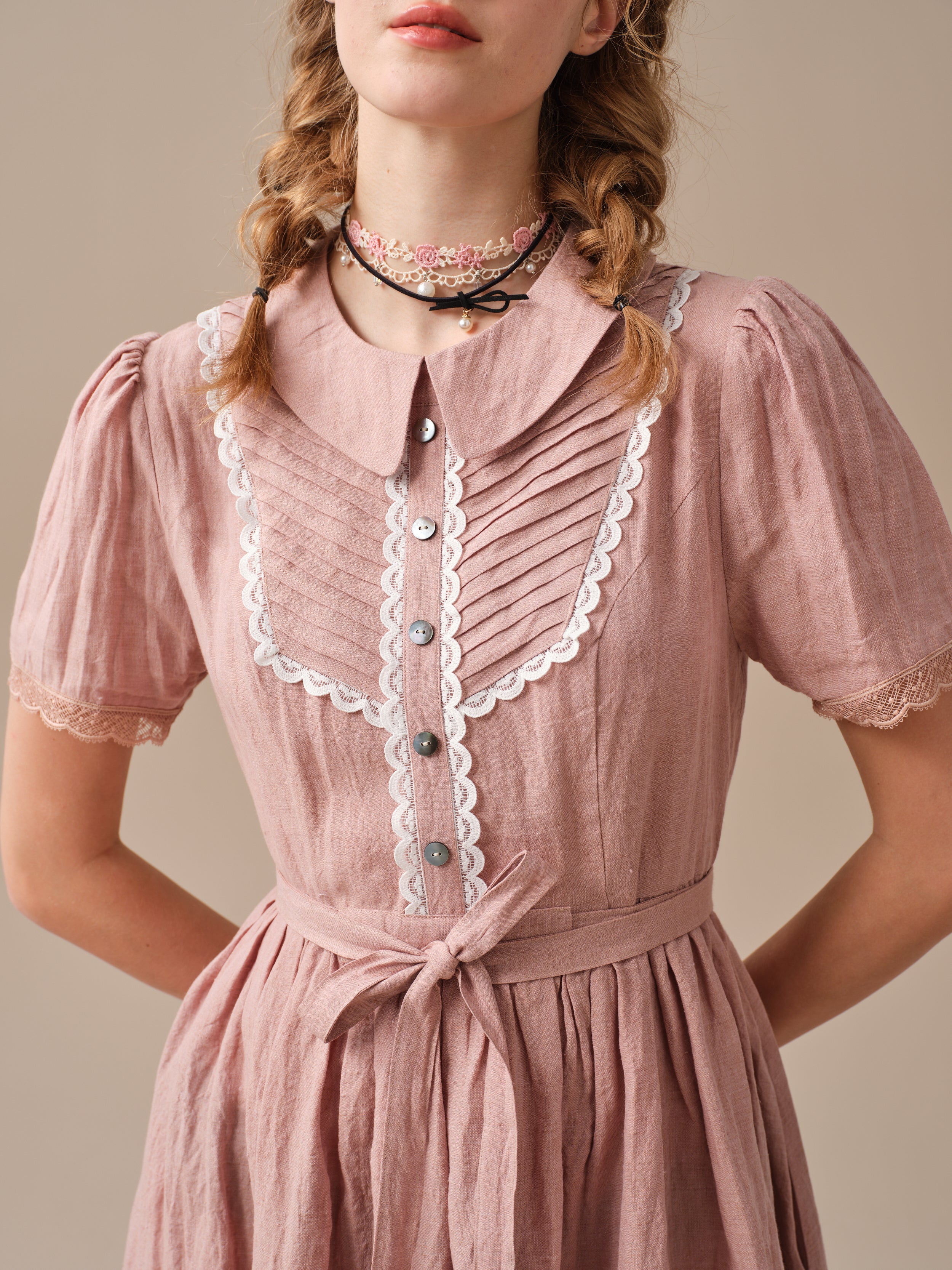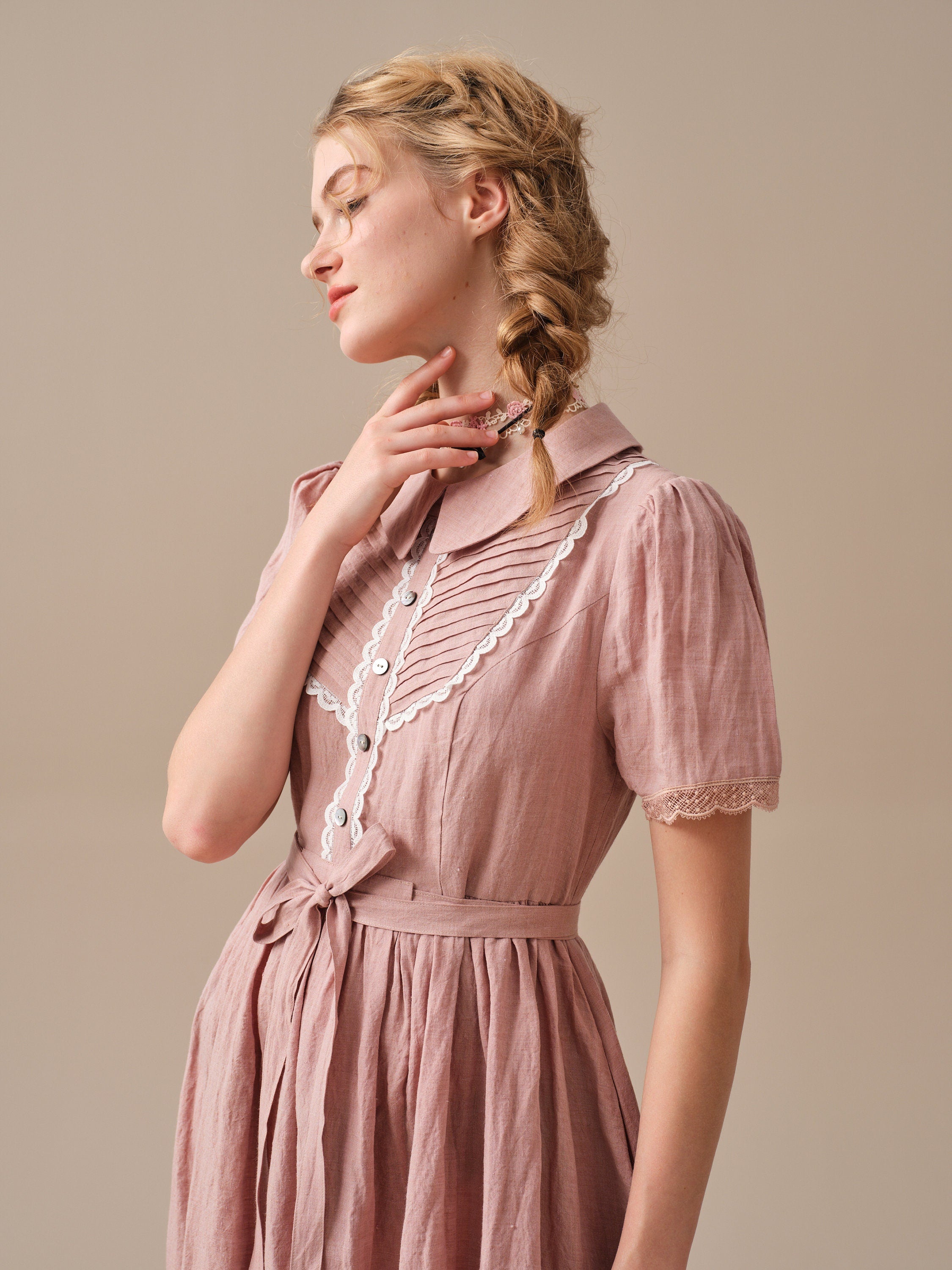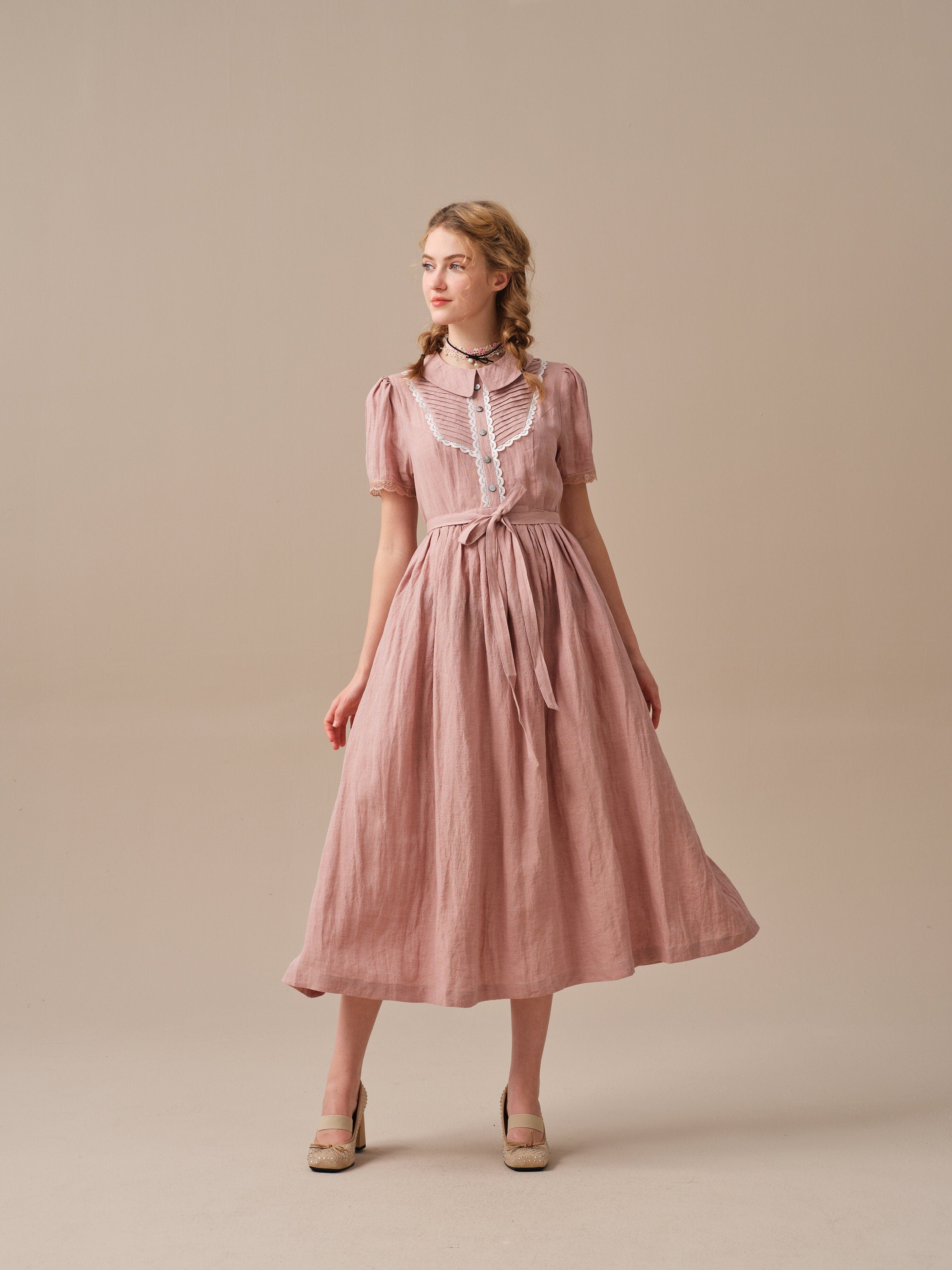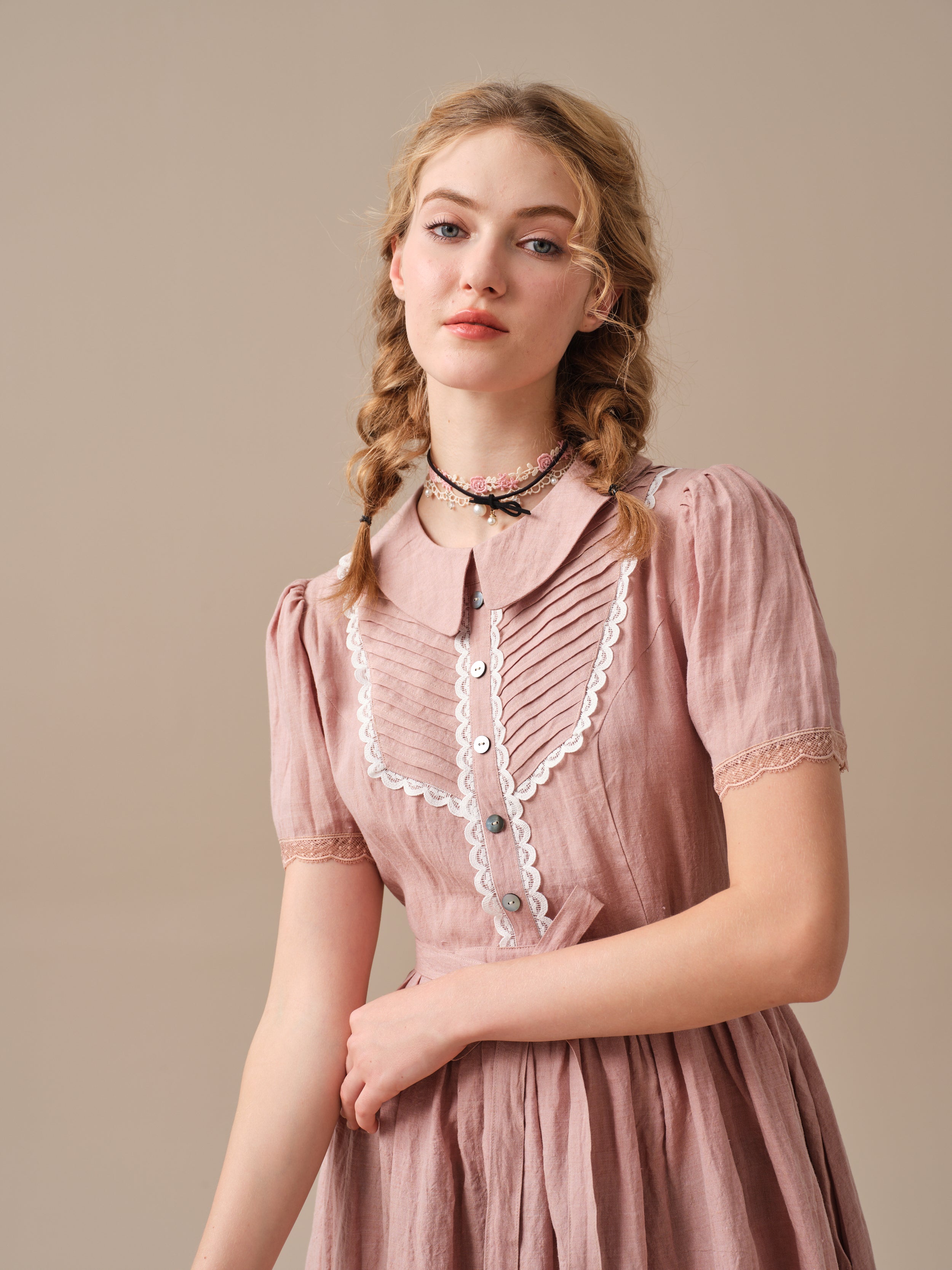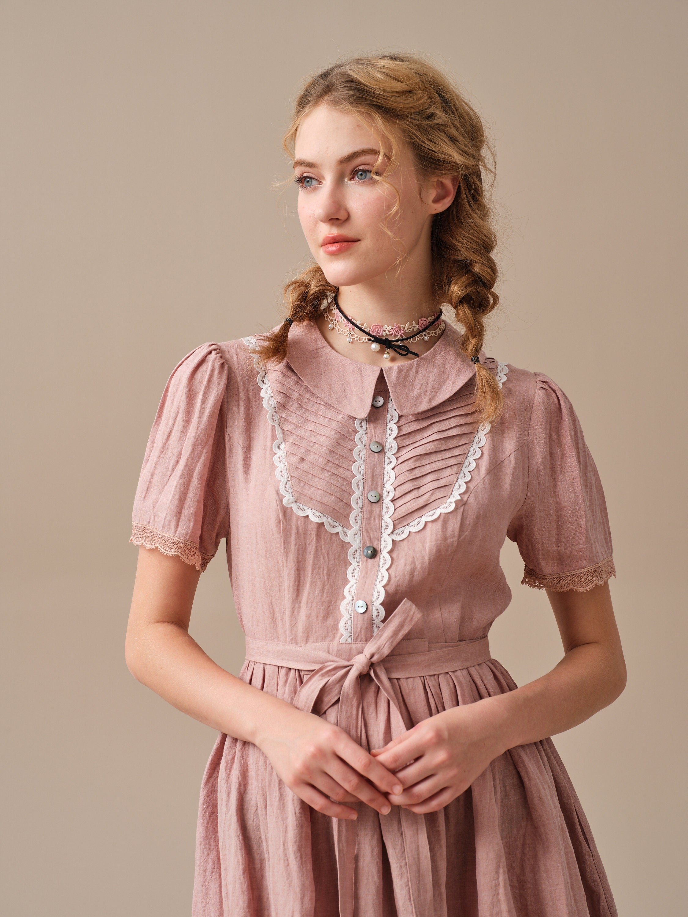 The soft pink hue is reminiscent of gentle summer sunset, romantic and tranquil. The Peter Pan collar adds a delightful flair to this dress.