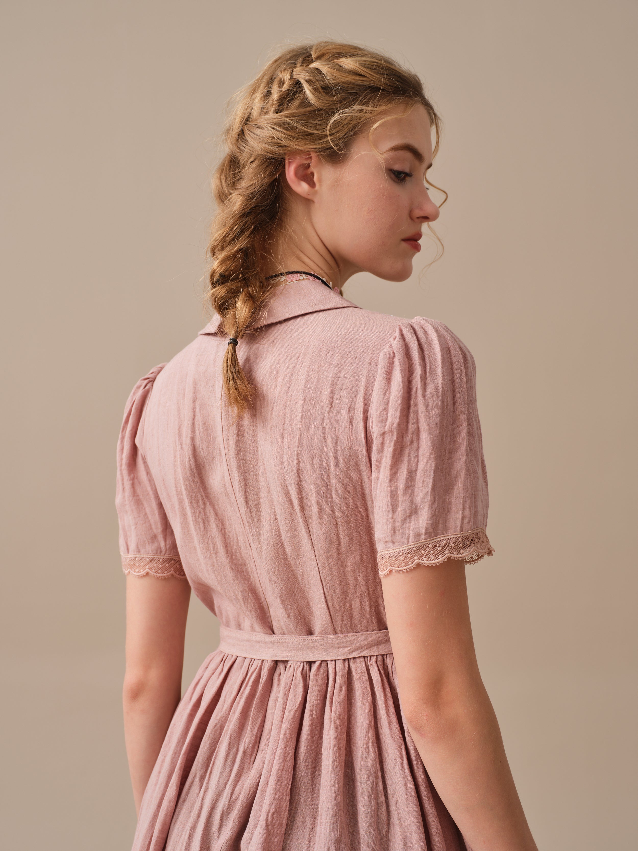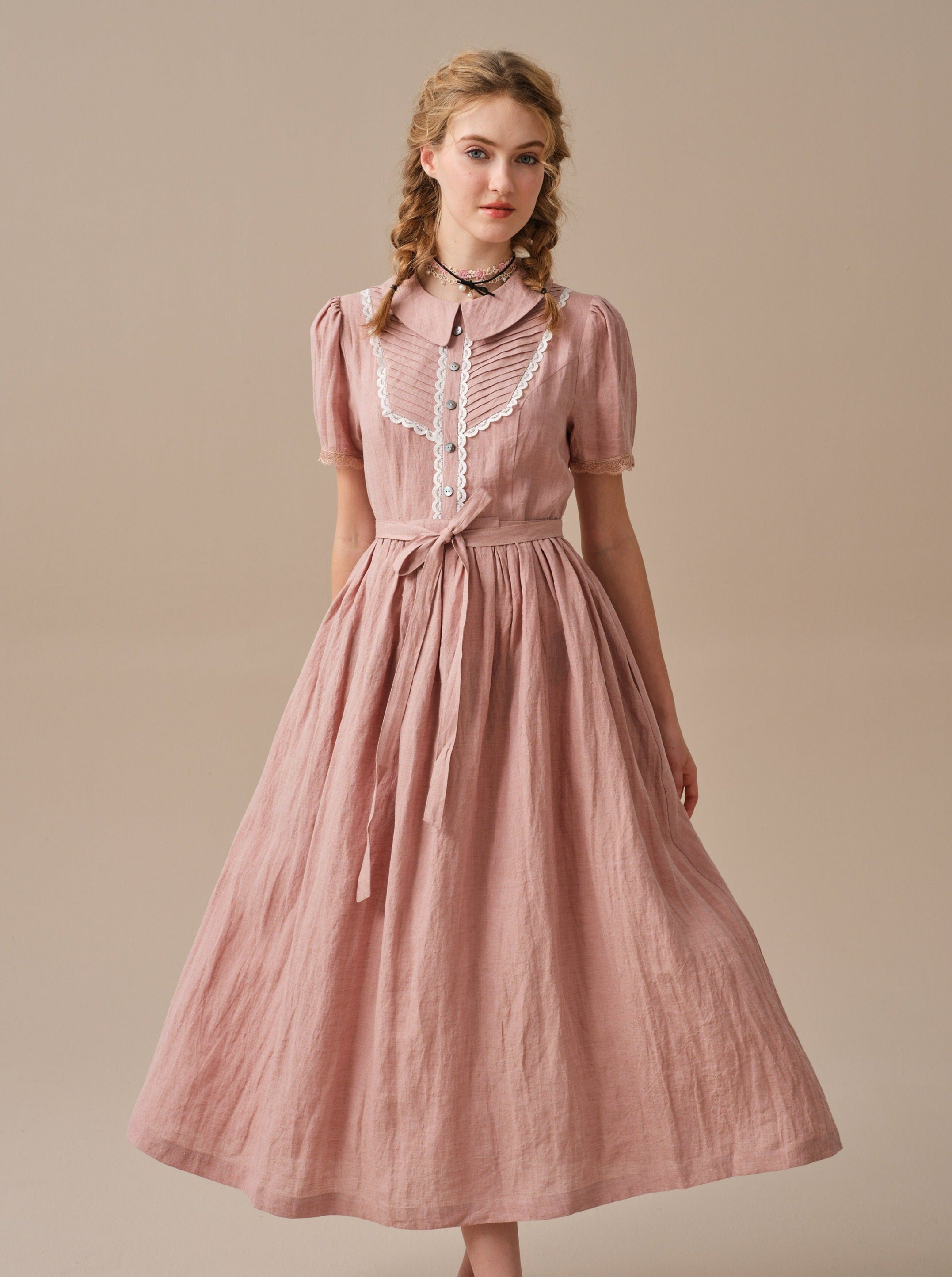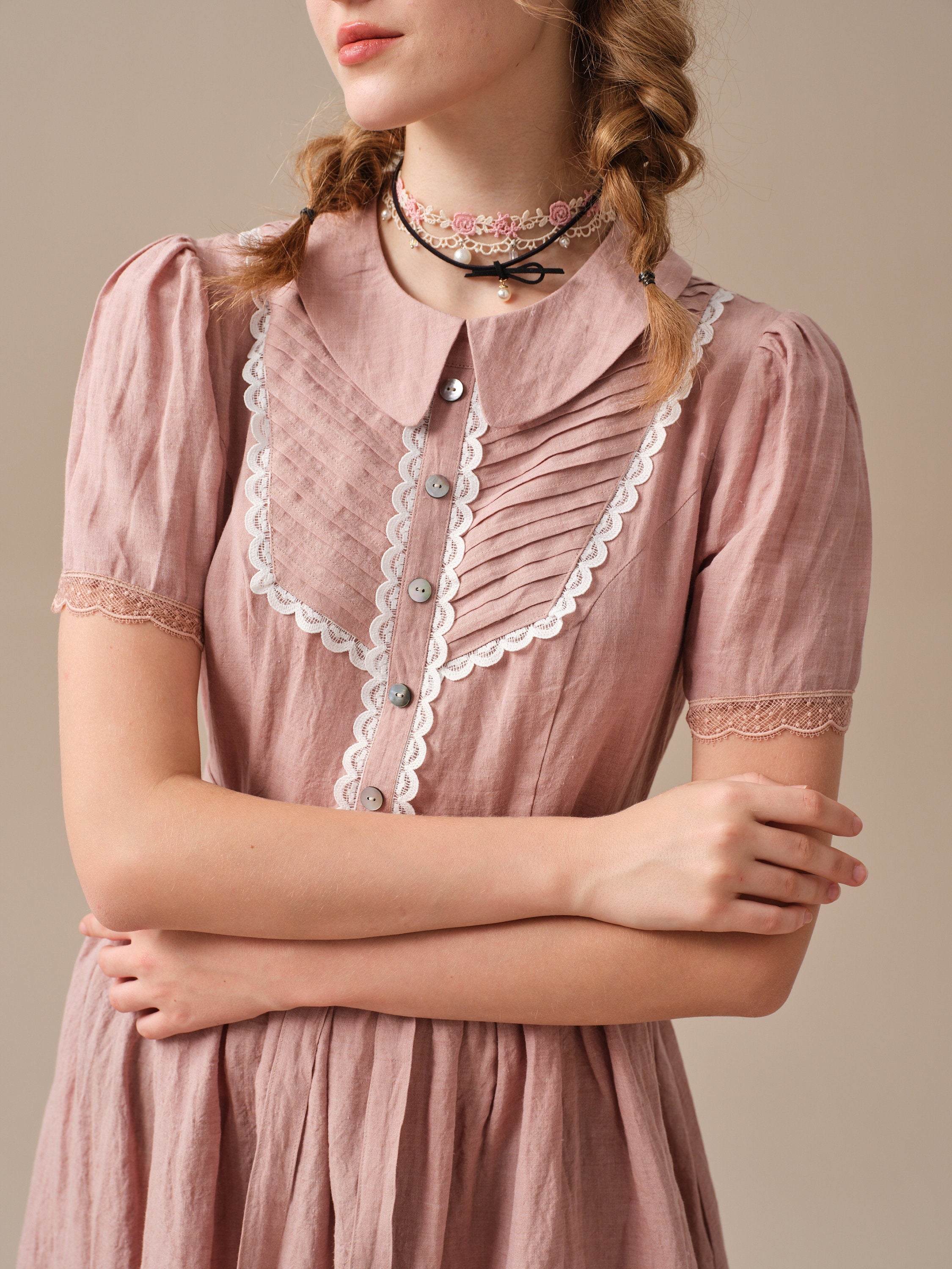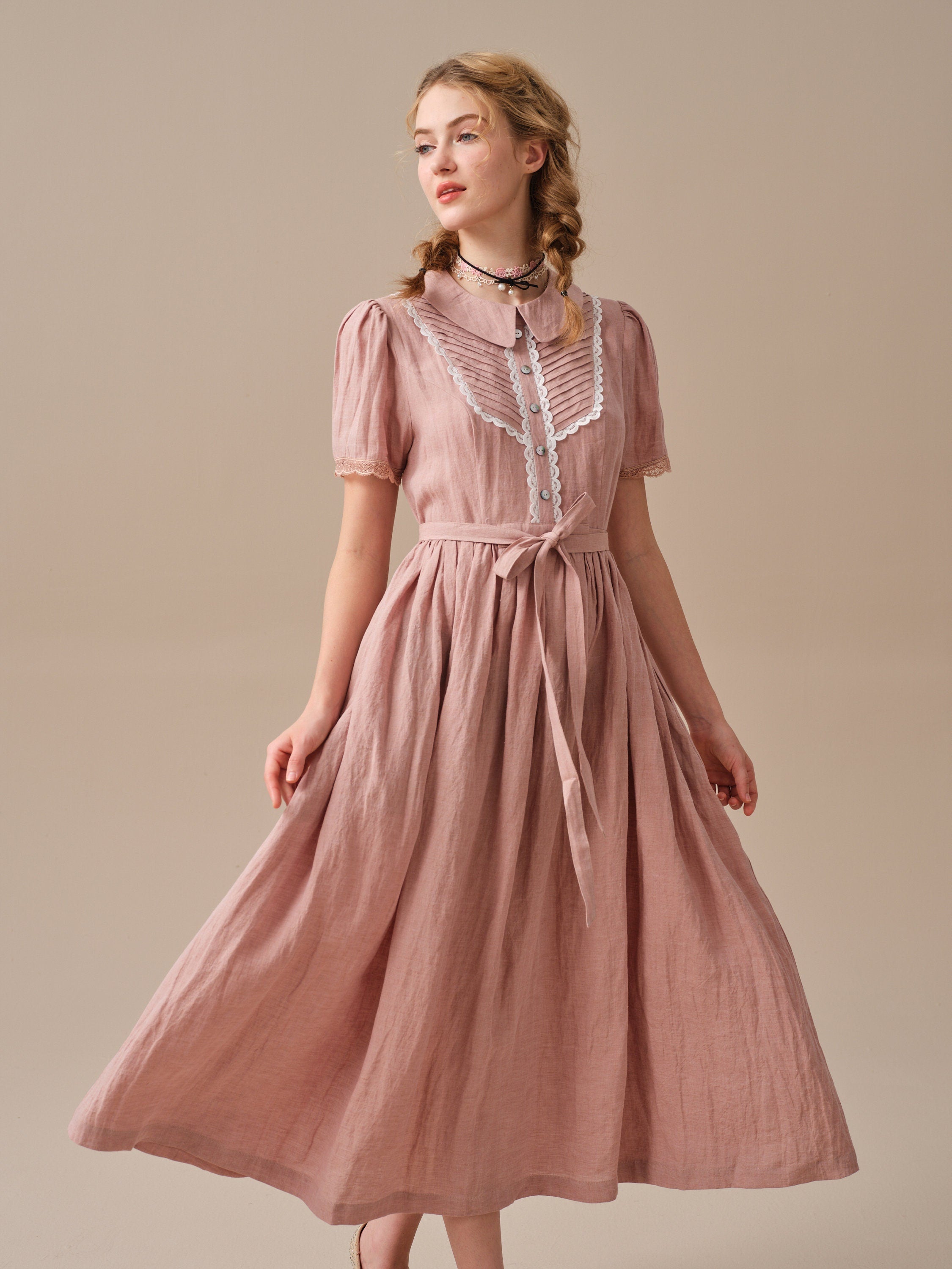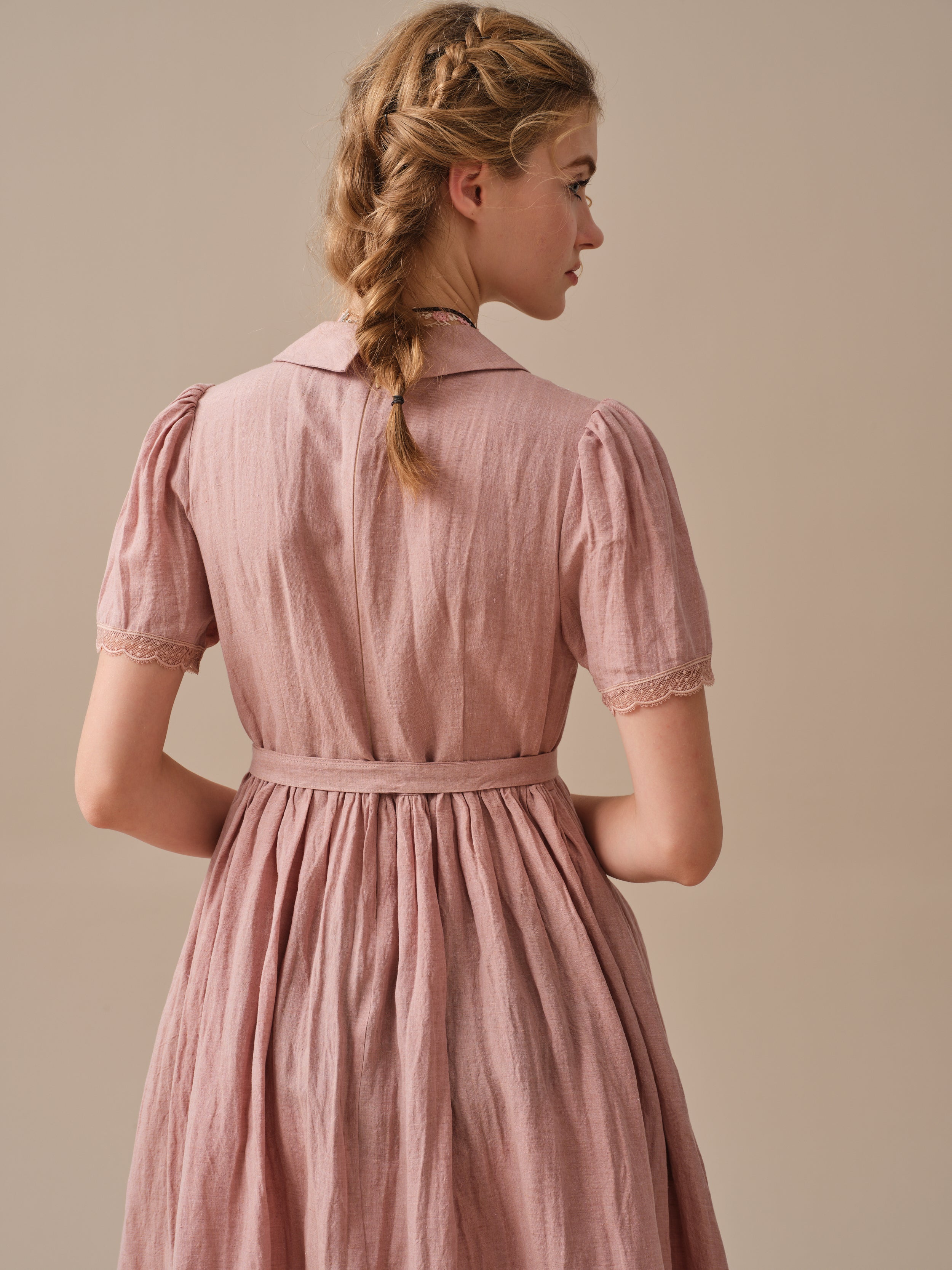 The soft pink hue is reminiscent of gentle summer sunset, romantic and tranquil. The Peter Pan collar adds a delightful flair to this dress.