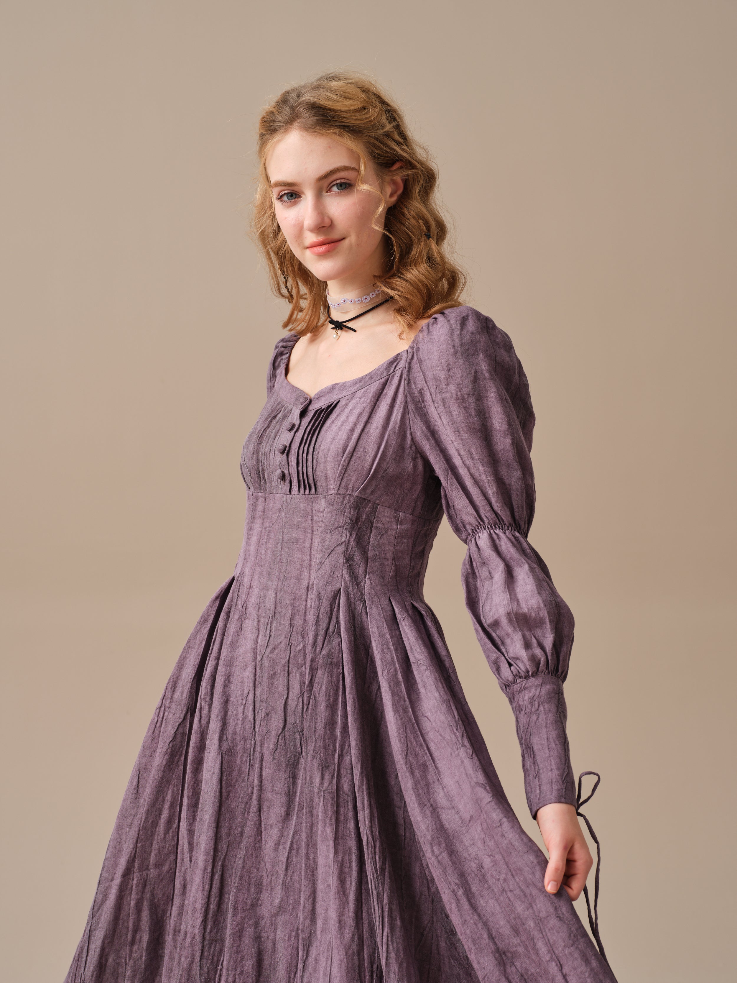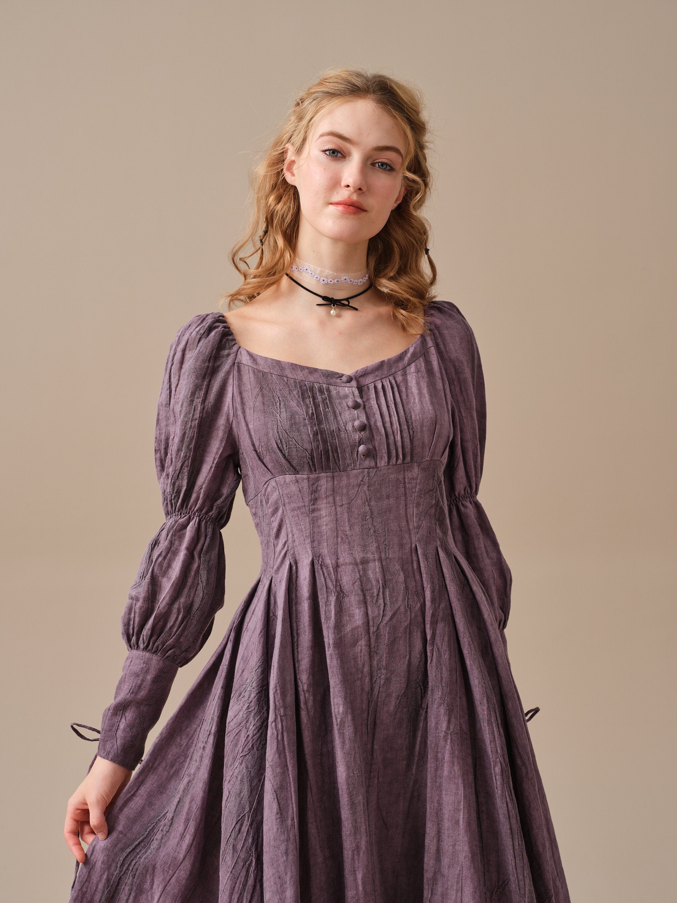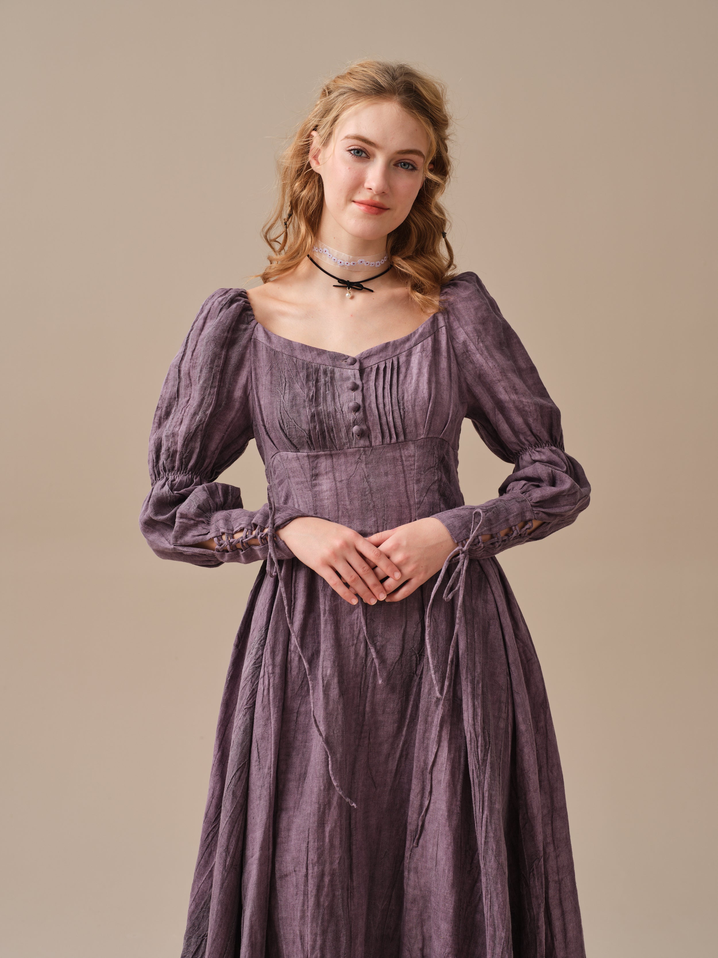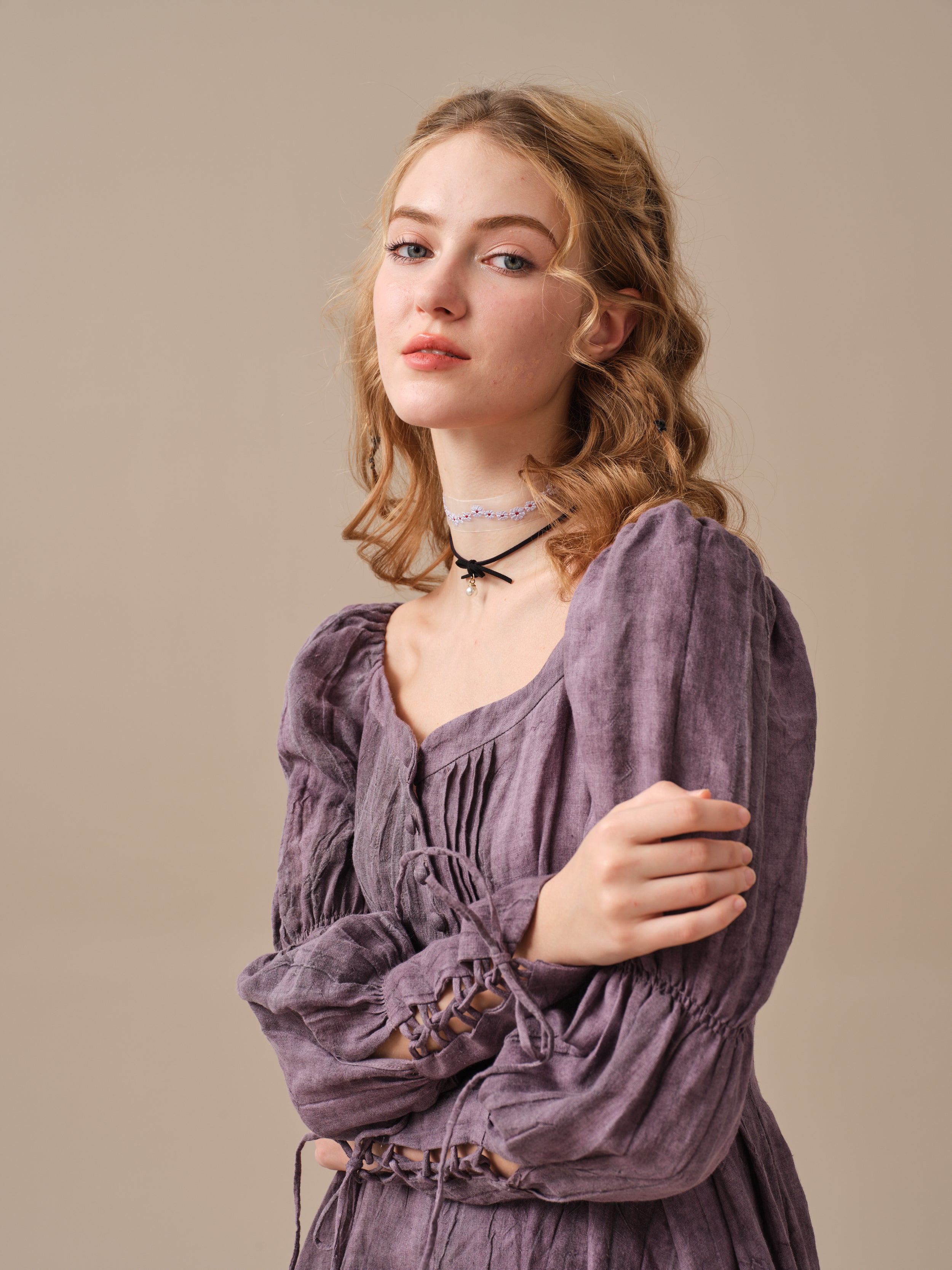 Crafted from soft linen, the piece is enhanced with a smocked bodice and button closure for added texture. It is a combination of elegance and romance.