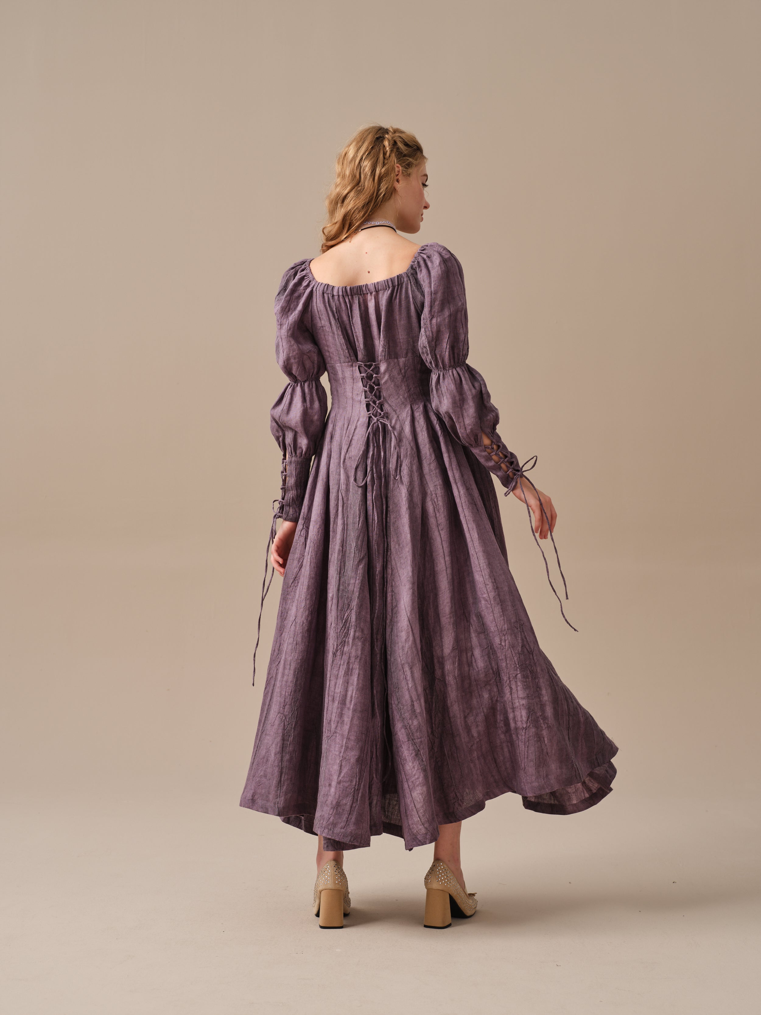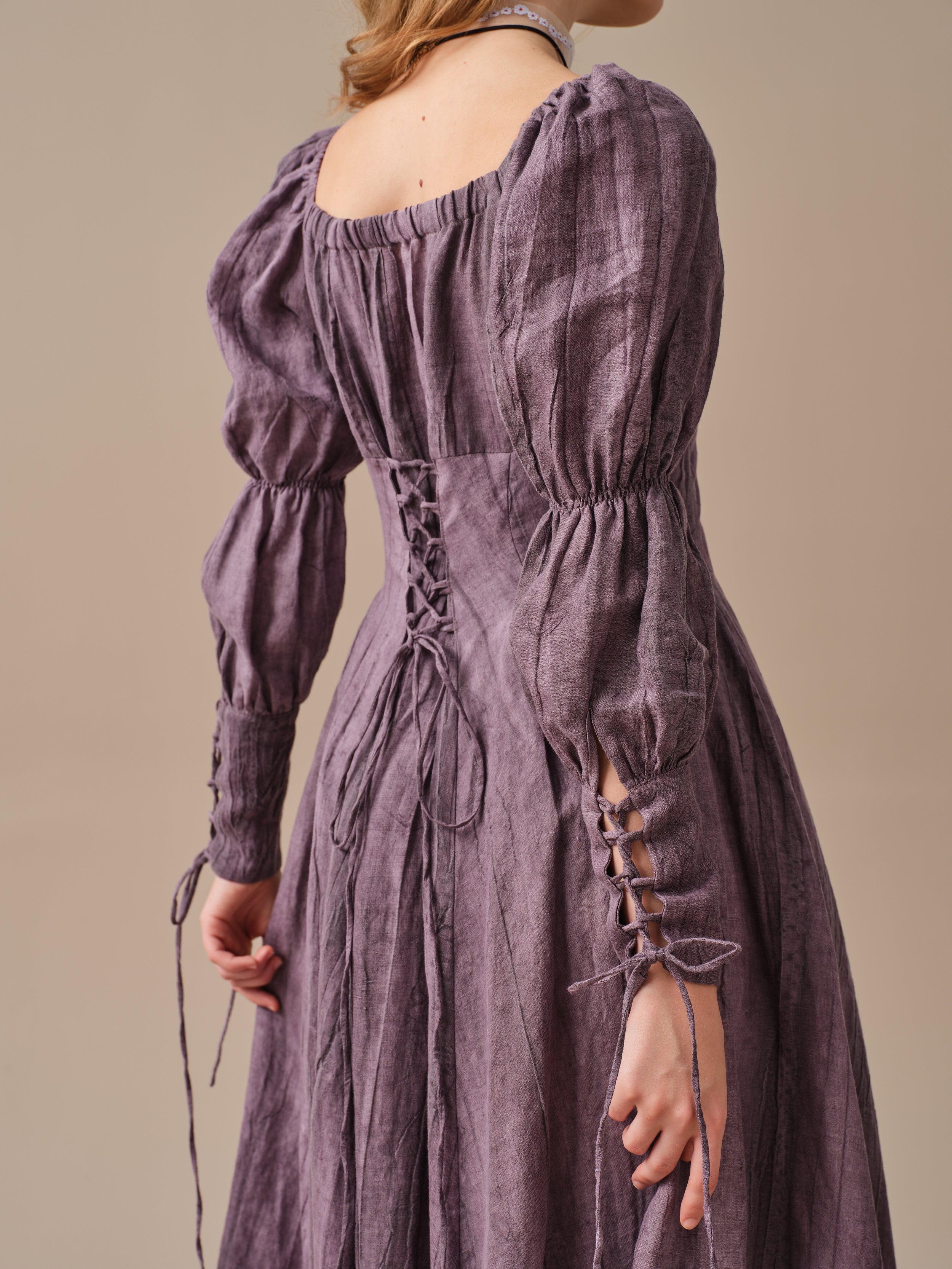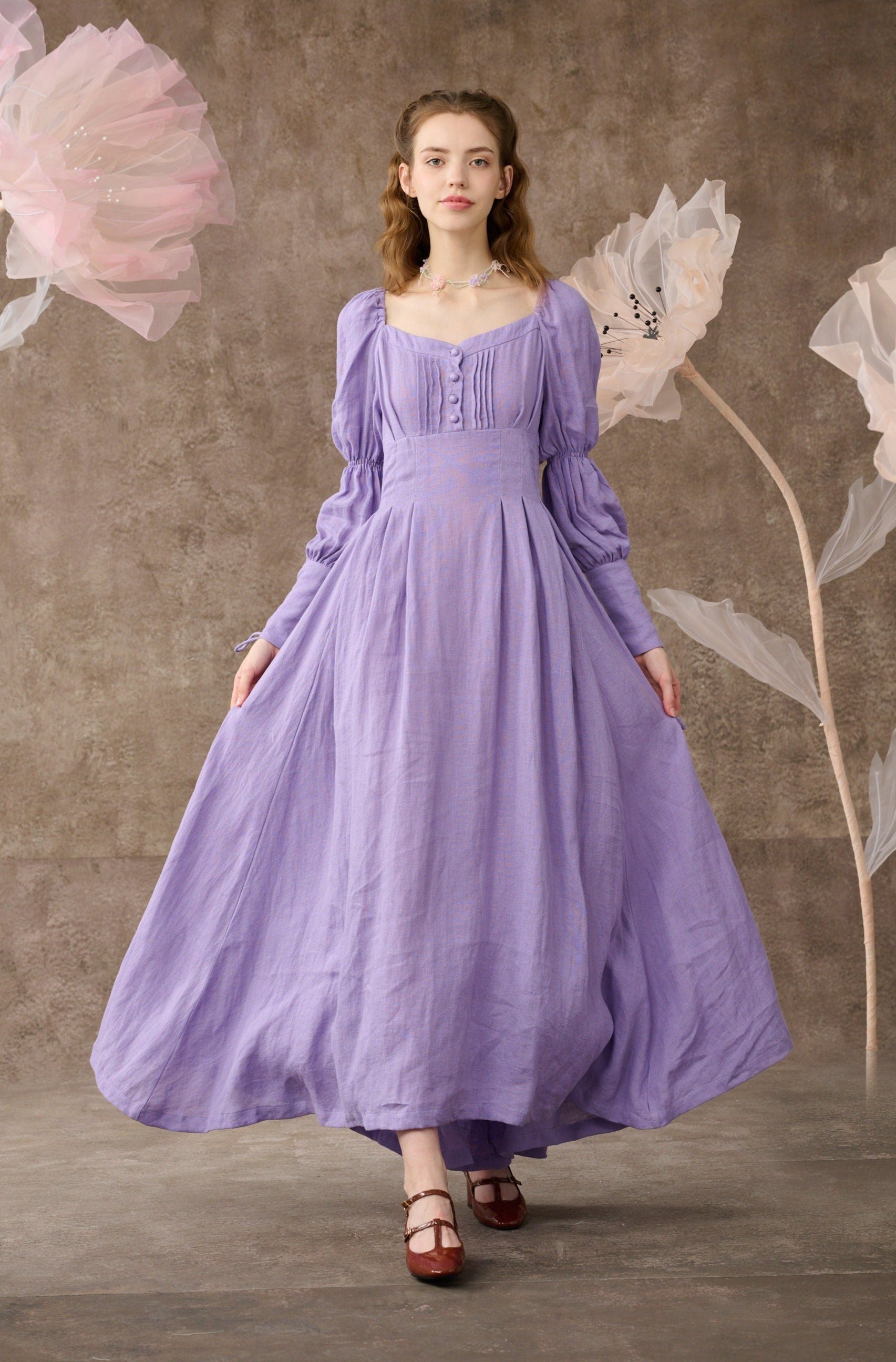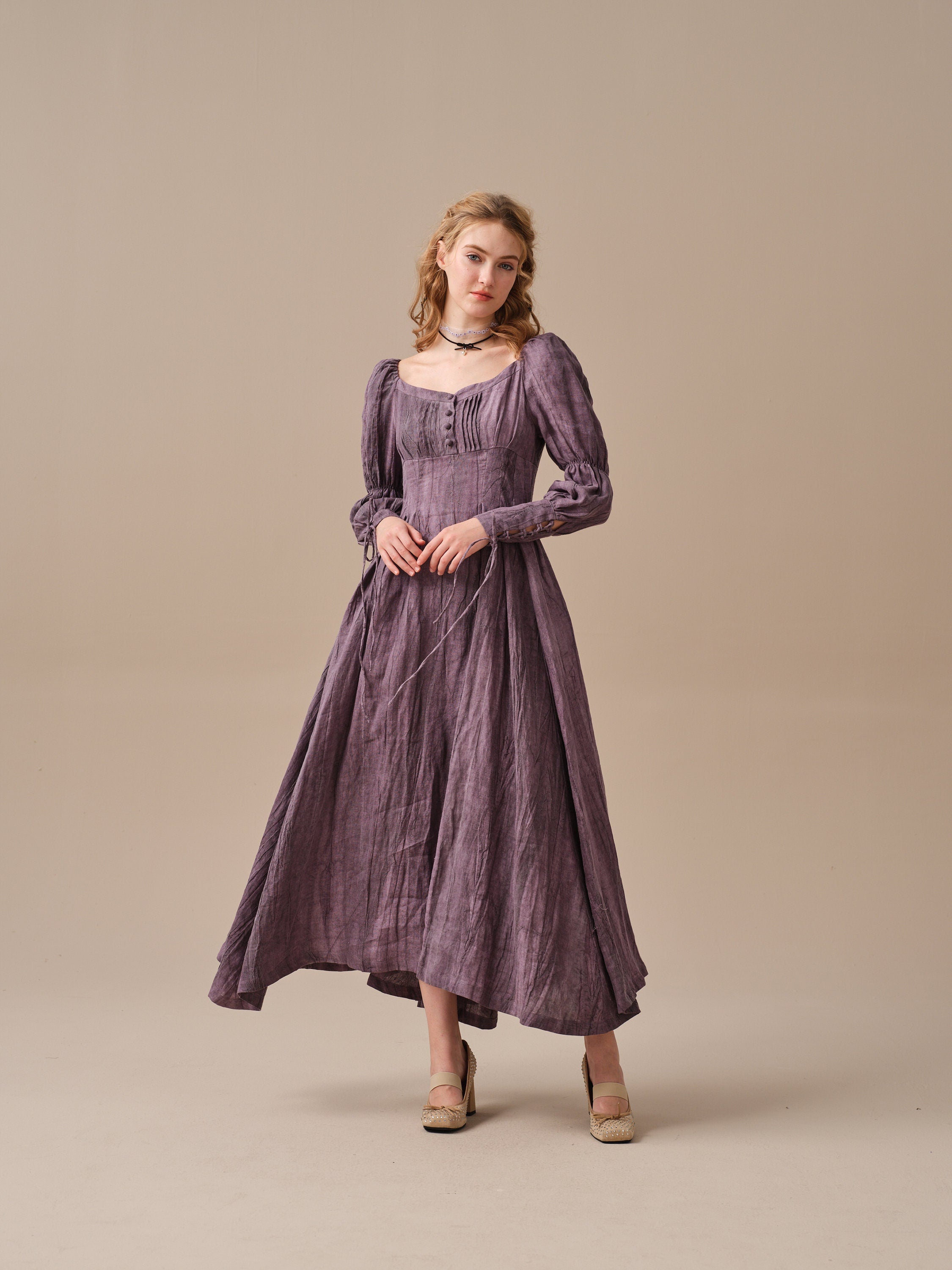 Crafted from soft linen, the piece is enhanced with a smocked bodice and button closure for added texture. It is a combination of elegance and romance.