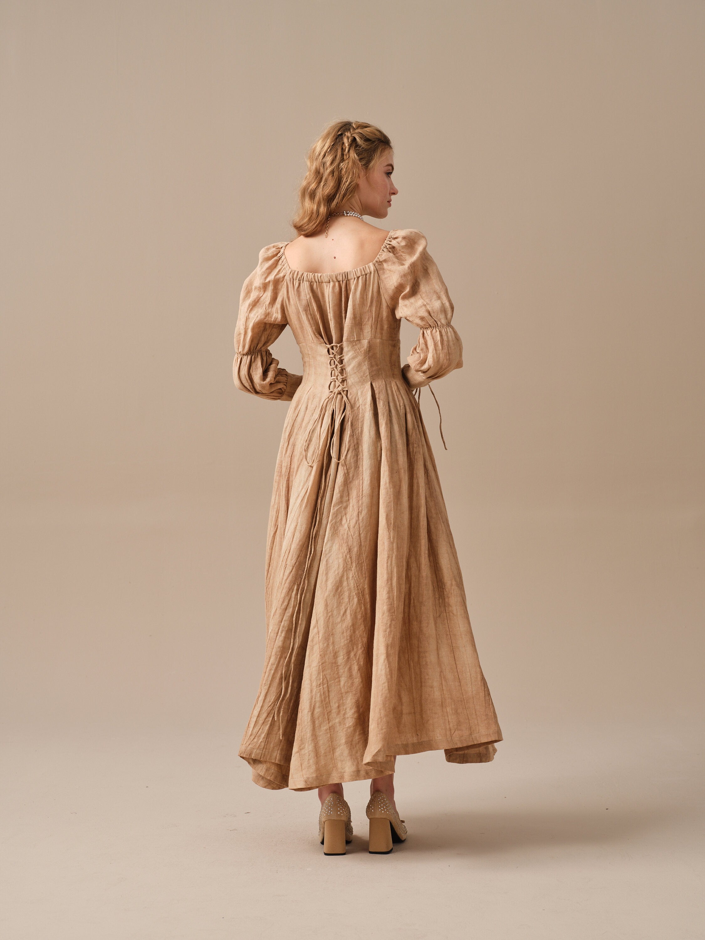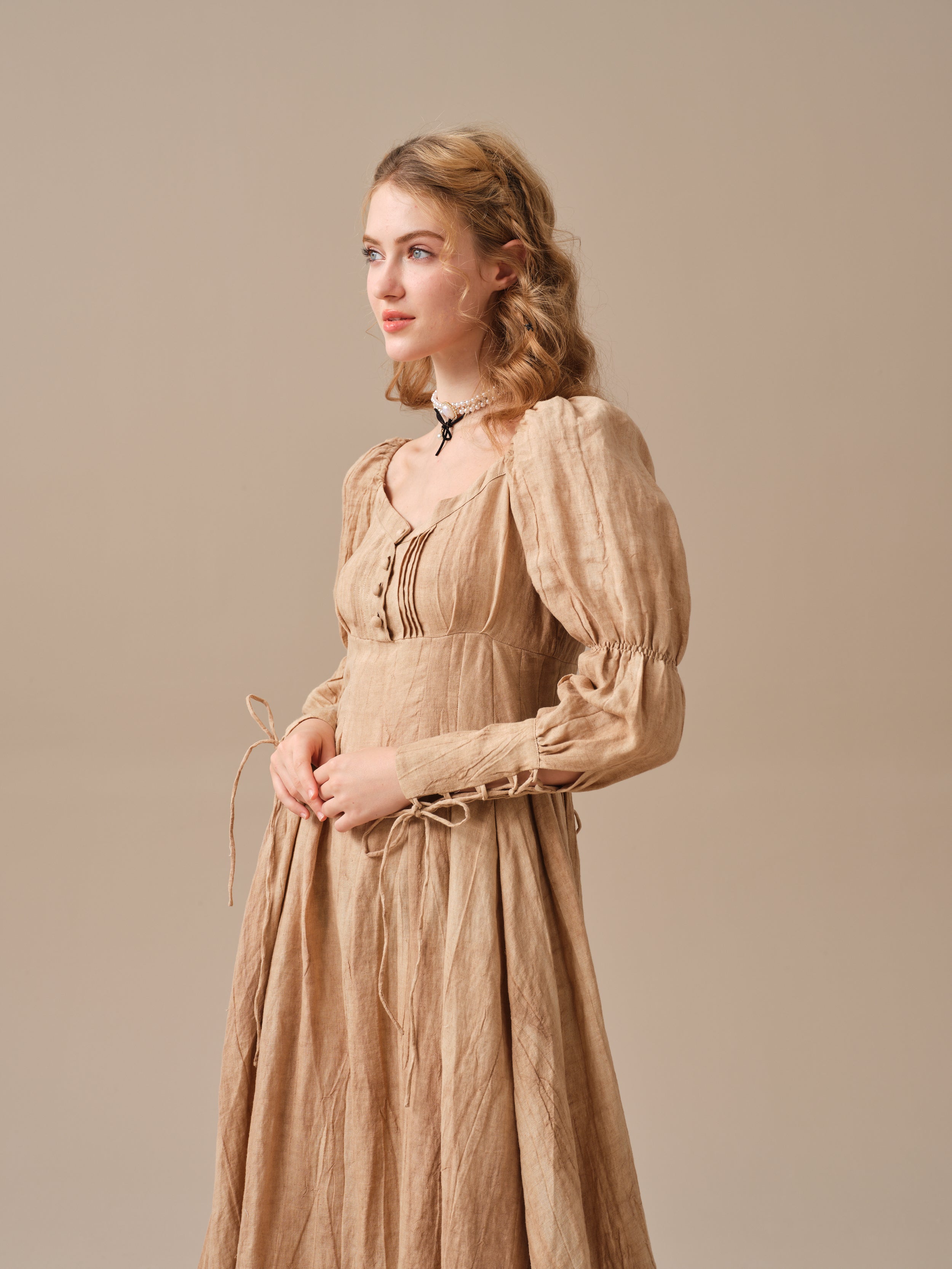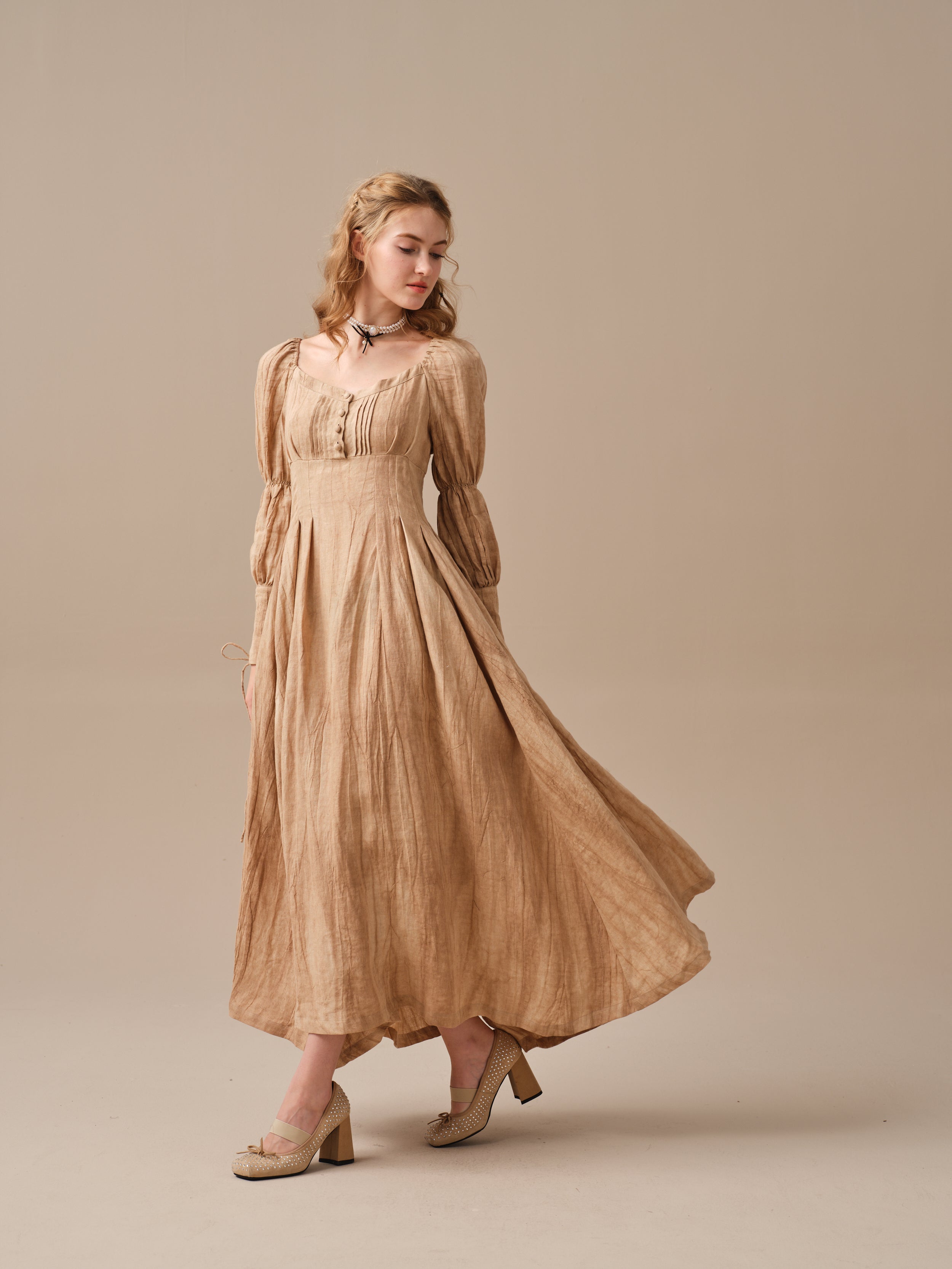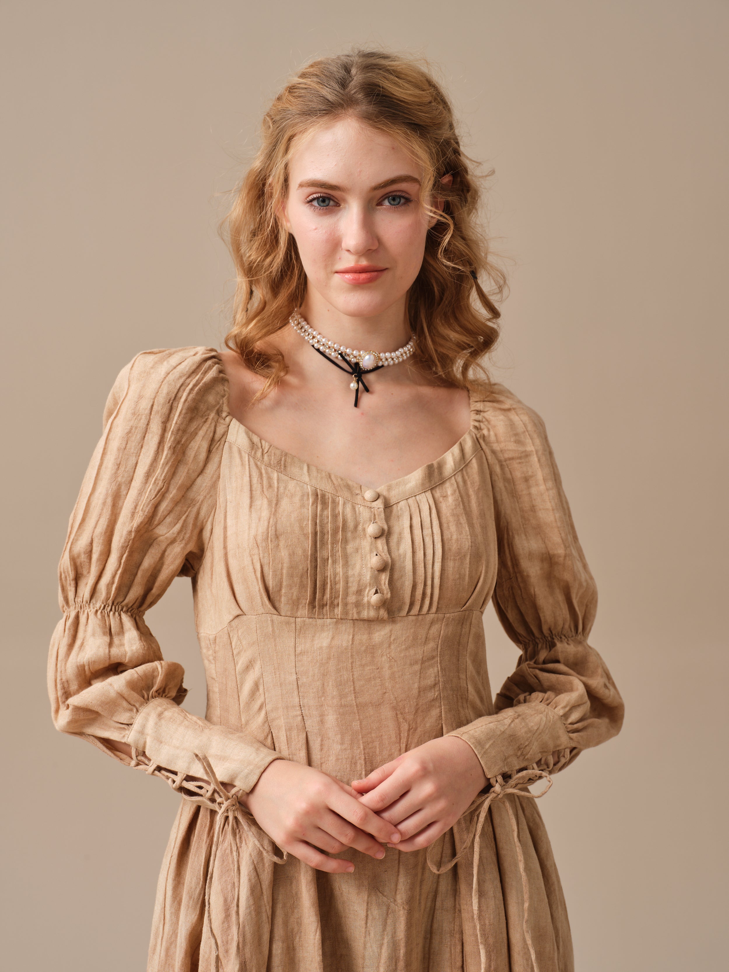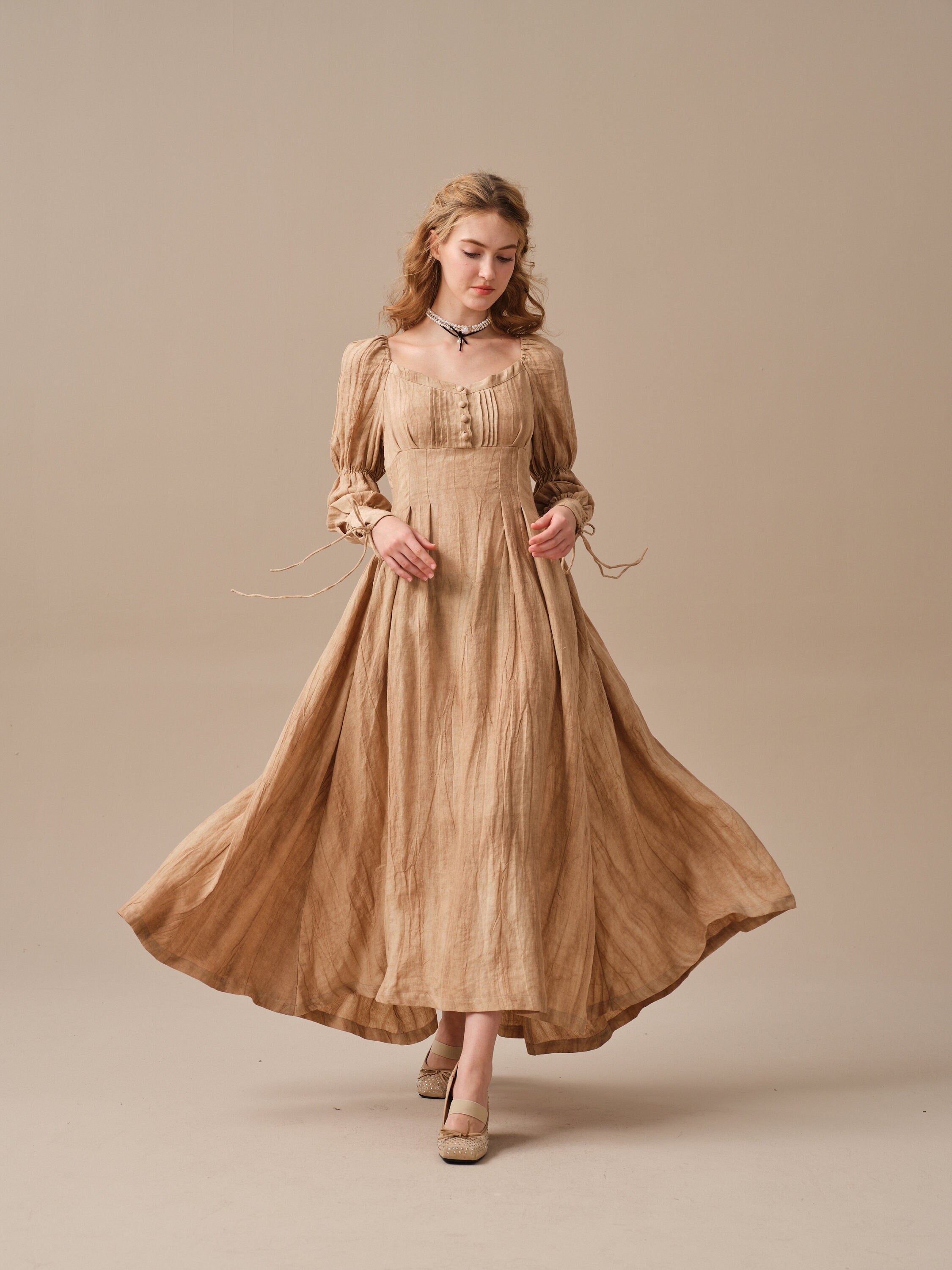 Crafted from soft linen, the piece is enhanced with a smocked bodice and button closure for added texture. It is a combination of elegance and romance.