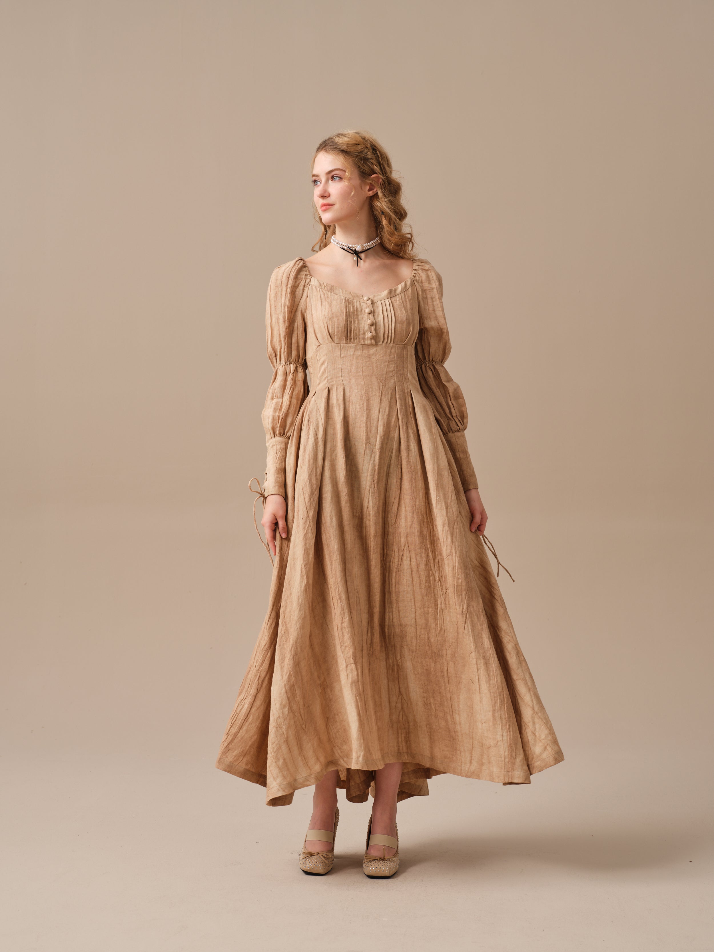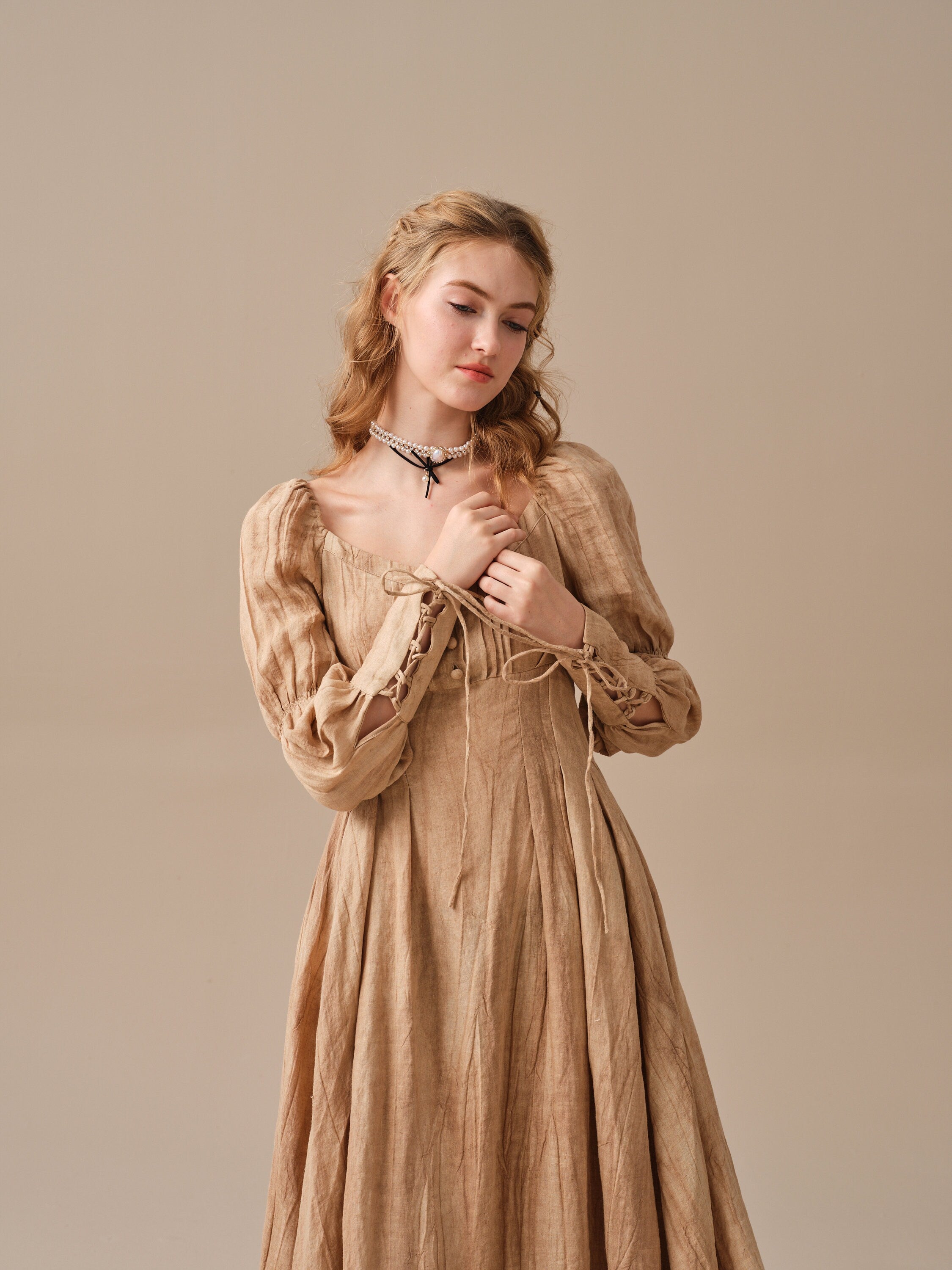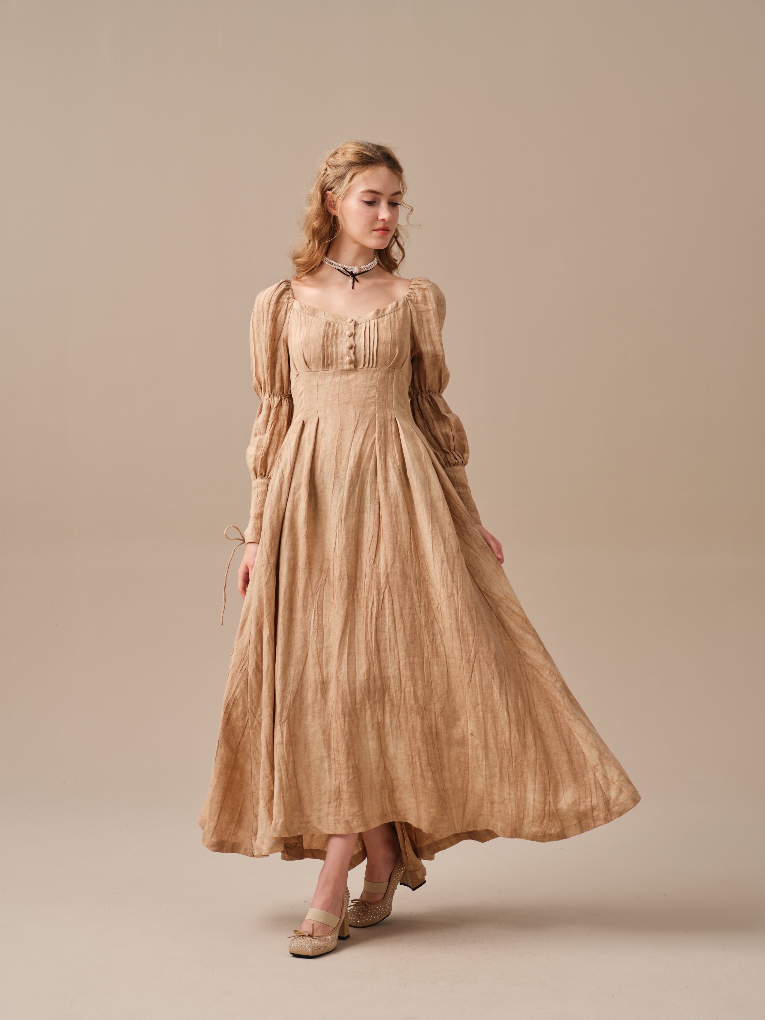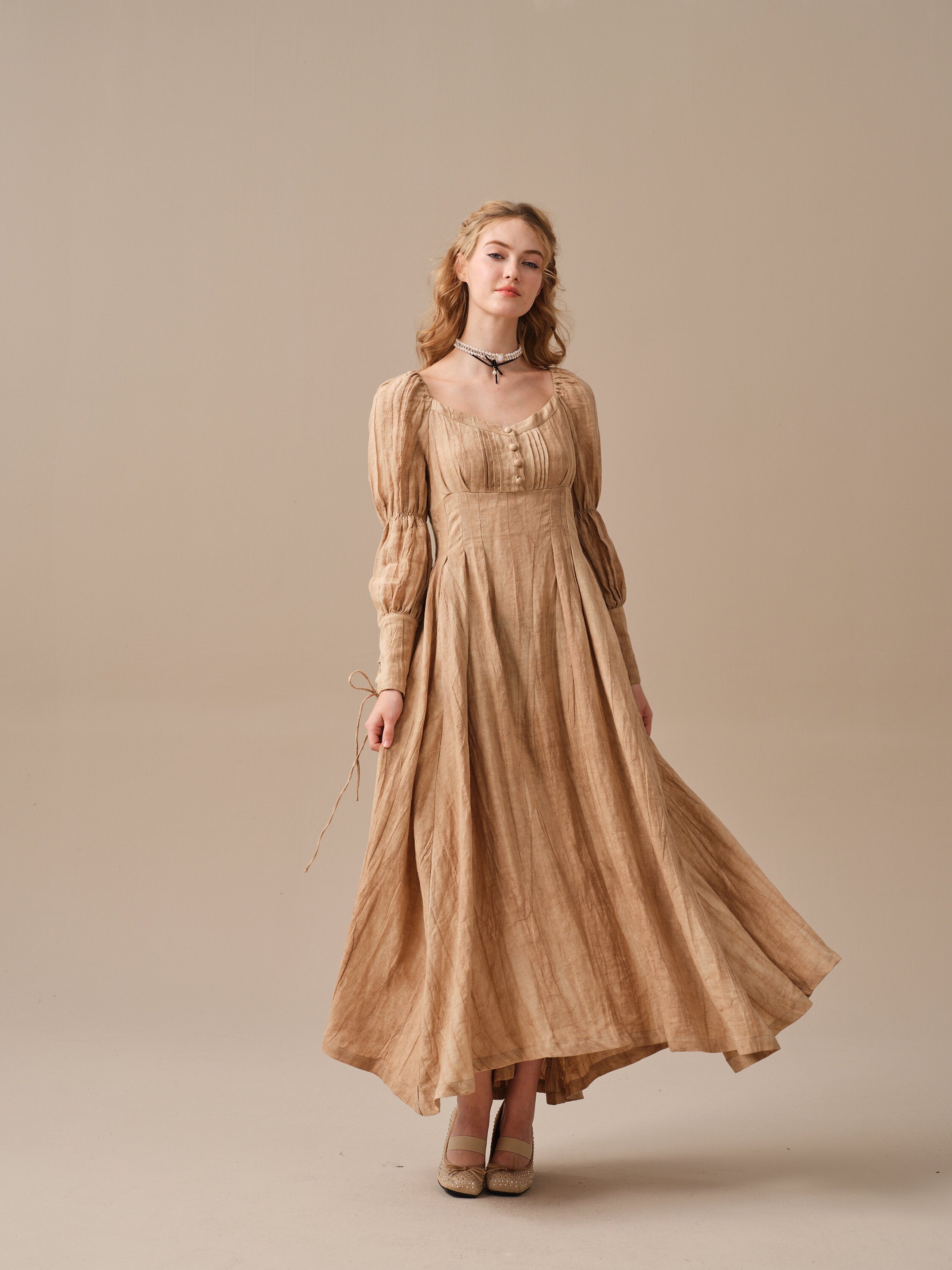 Crafted from soft linen, the piece is enhanced with a smocked bodice and button closure for added texture. It is a combination of elegance and romance.