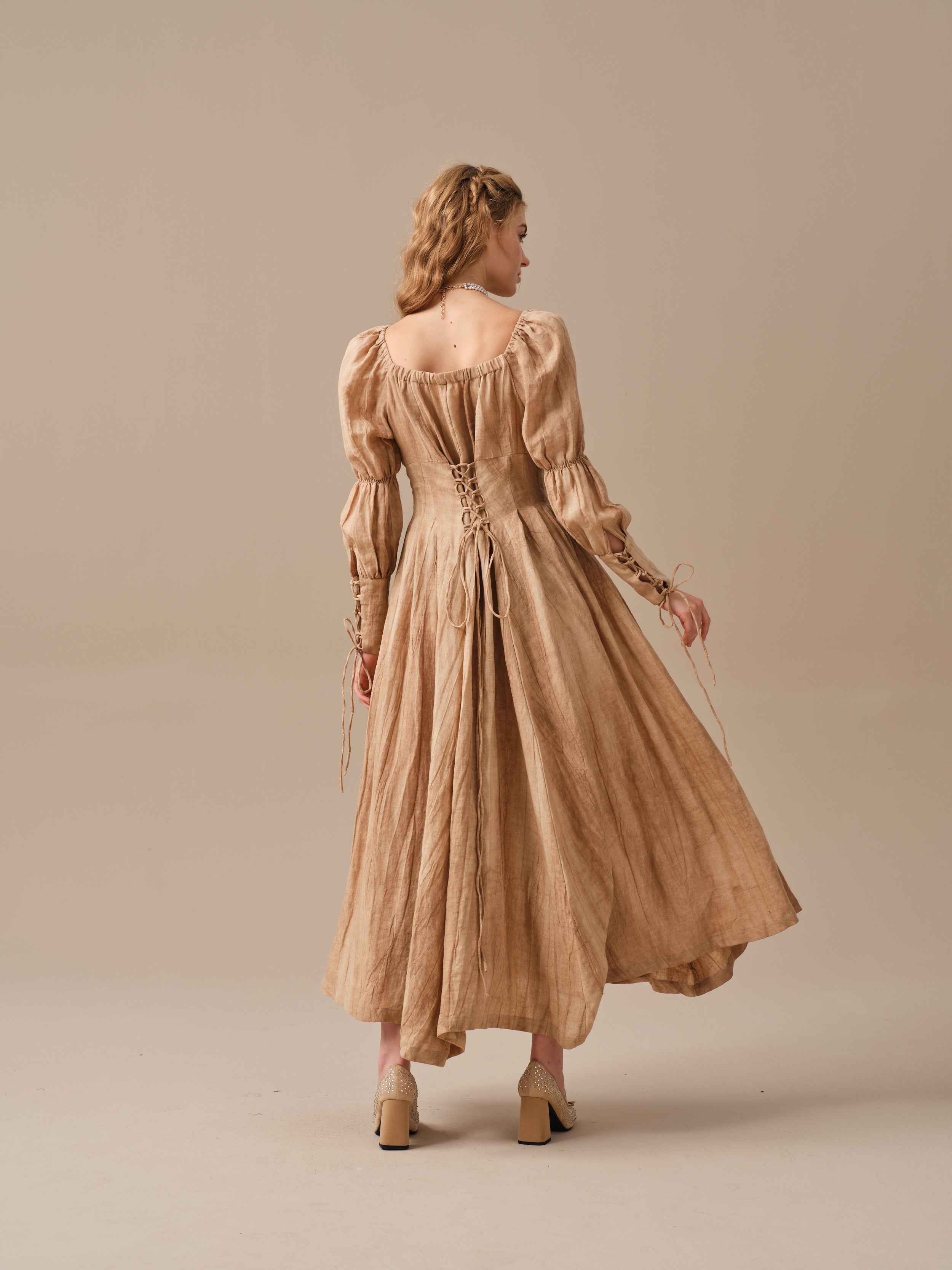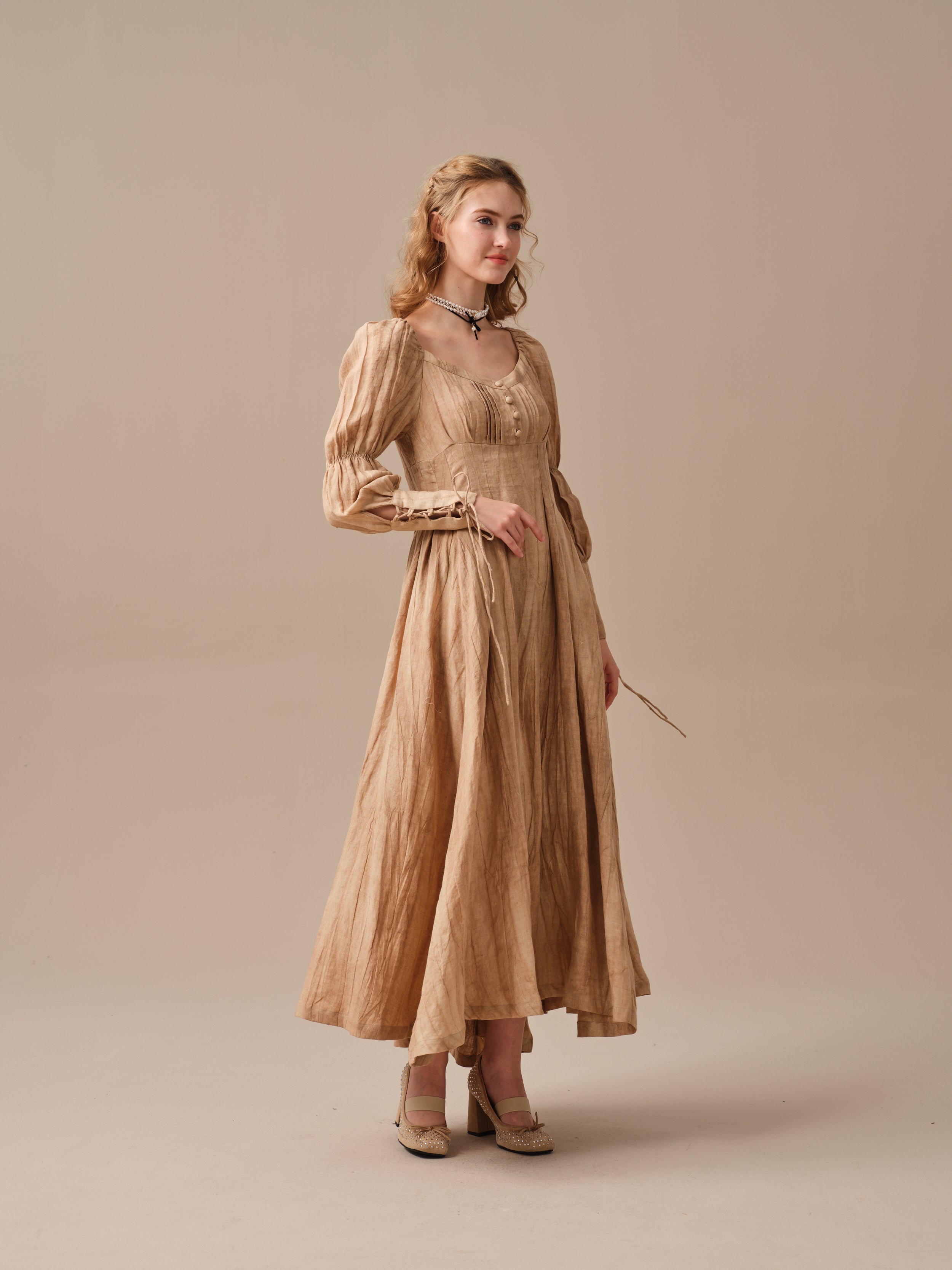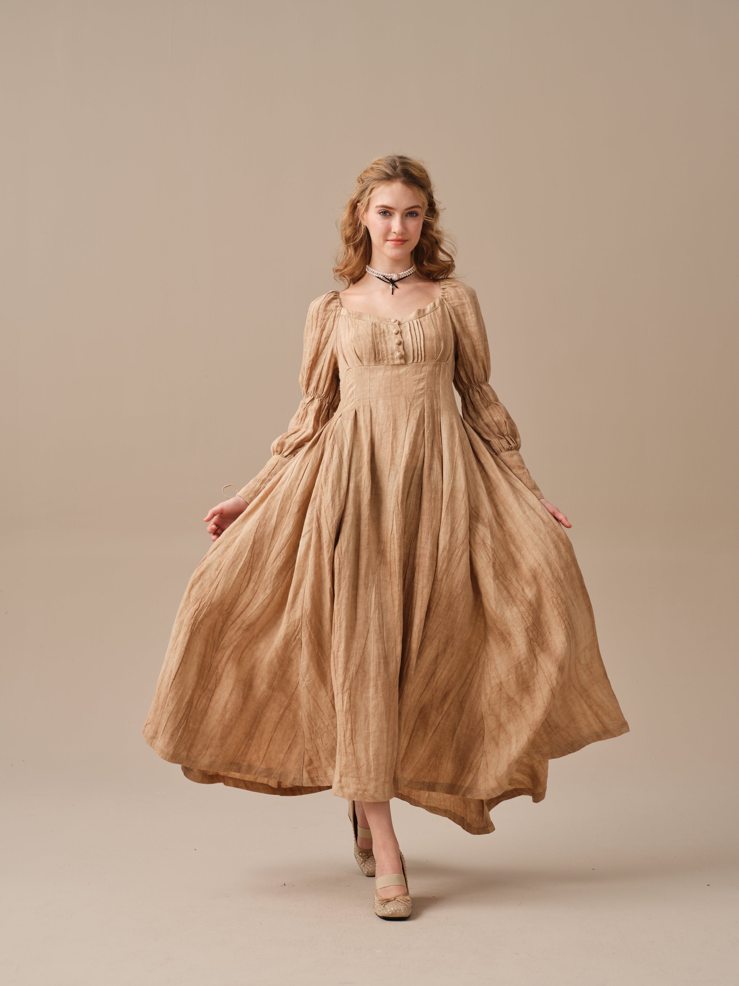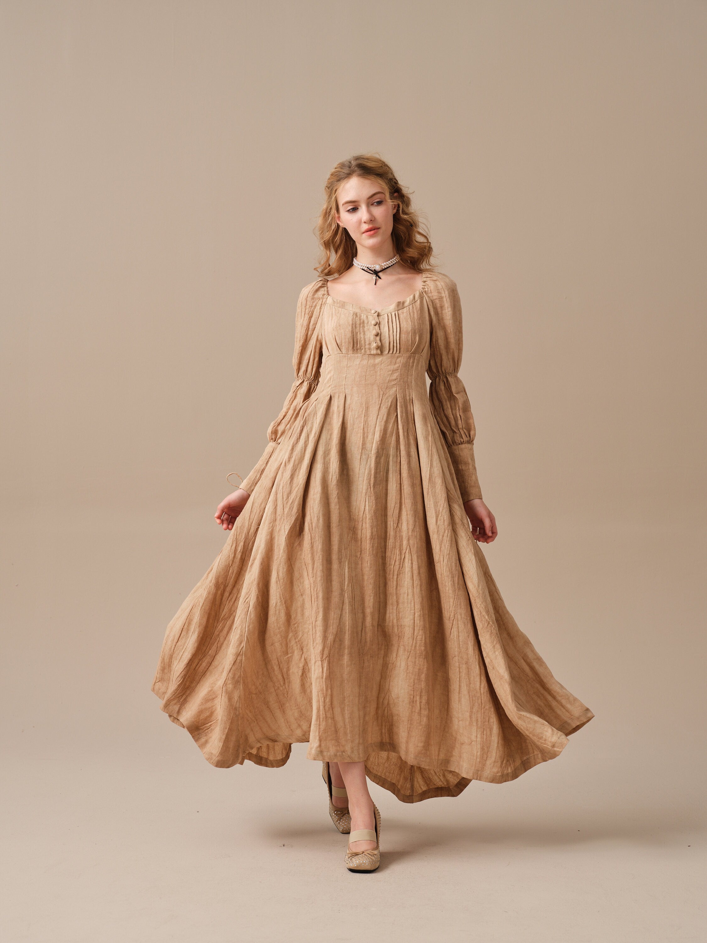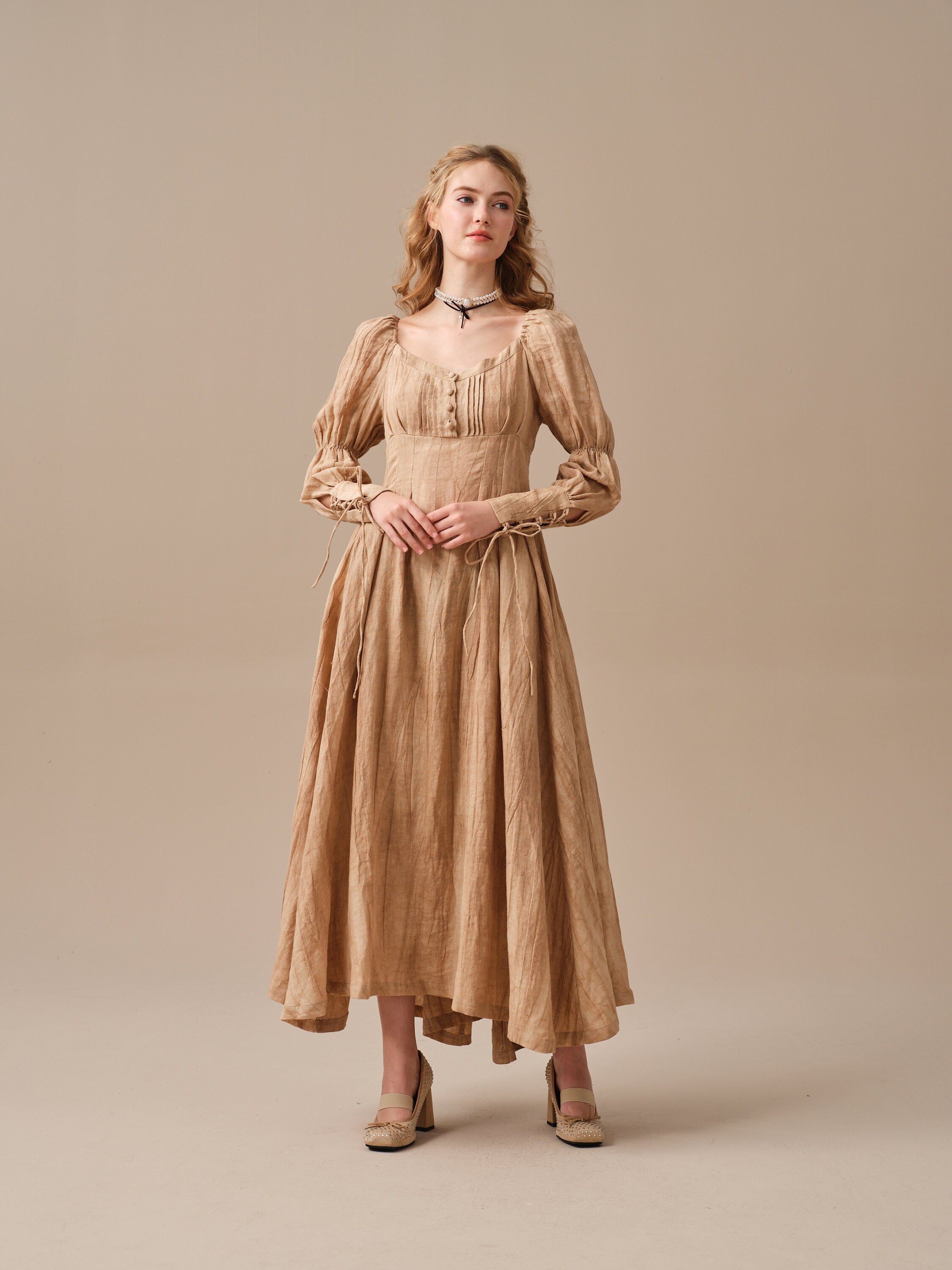Crafted from soft linen, the piece is enhanced with a smocked bodice and button closure for added texture. It is a combination of elegance and romance.