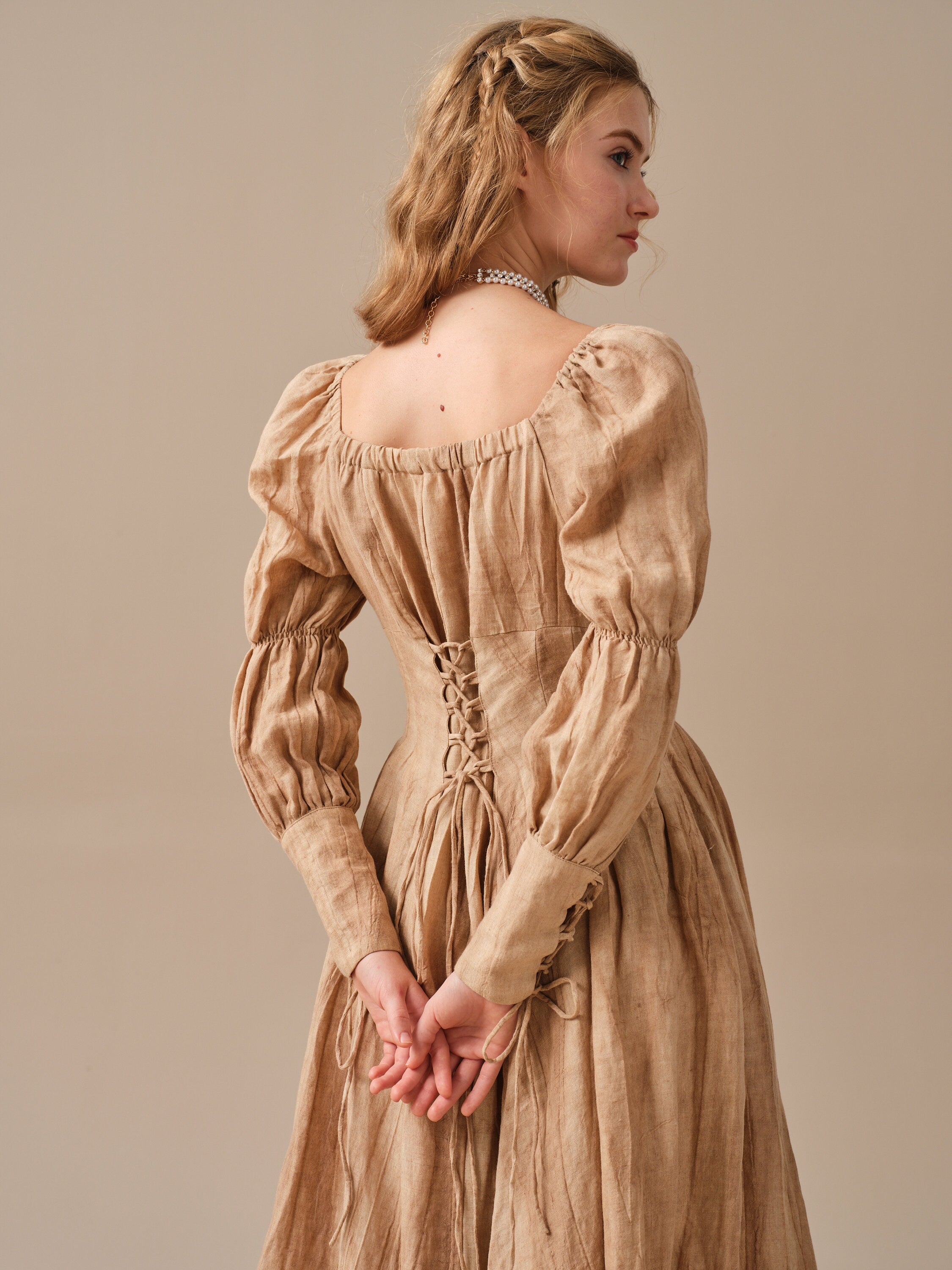 It's cut to an empire line silhouette framed by puff sleeves and a delicate sweetheart neck. the elasticated lacing-up sleeves with pleated detail exude vintage elegance. Winning combination.