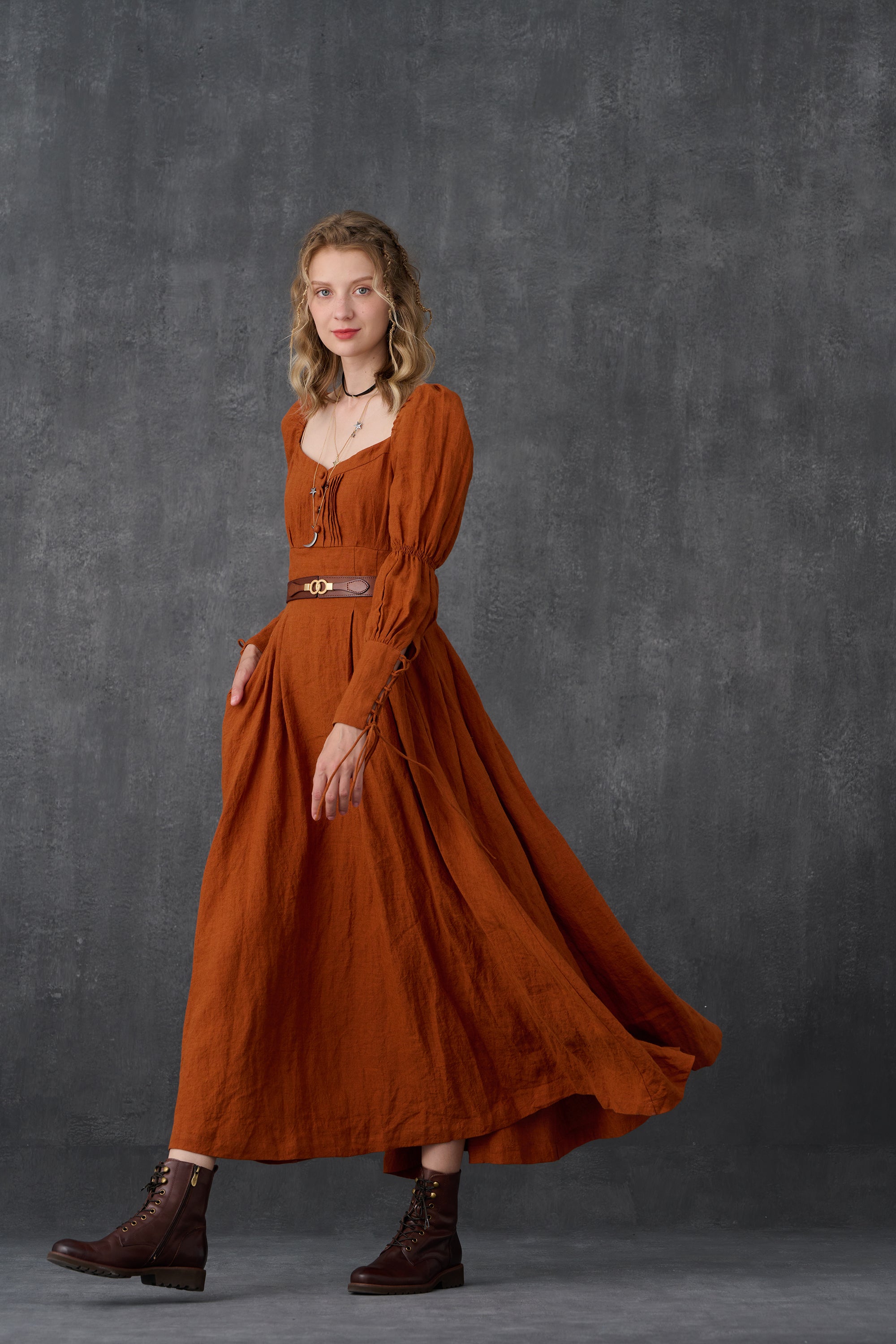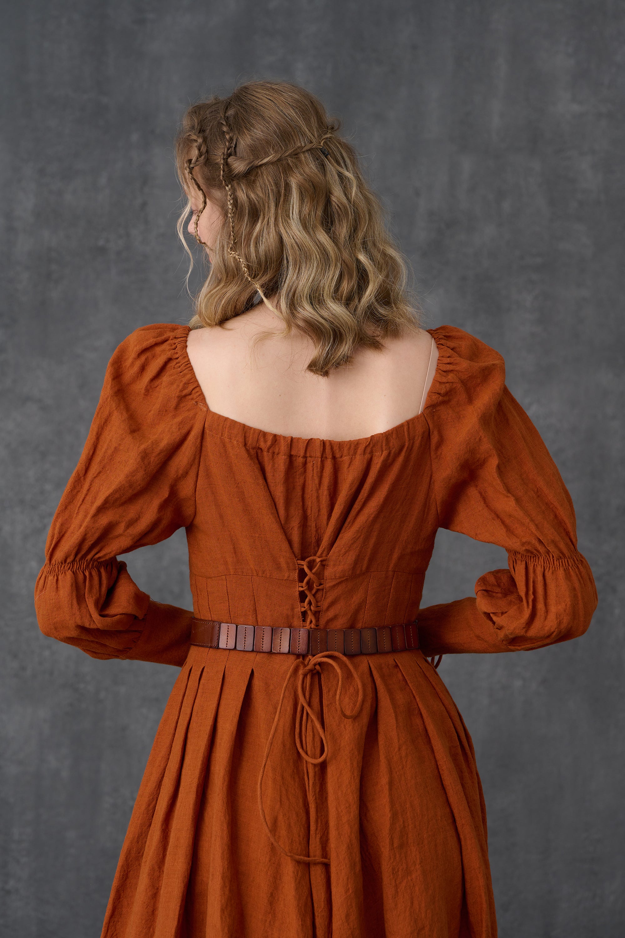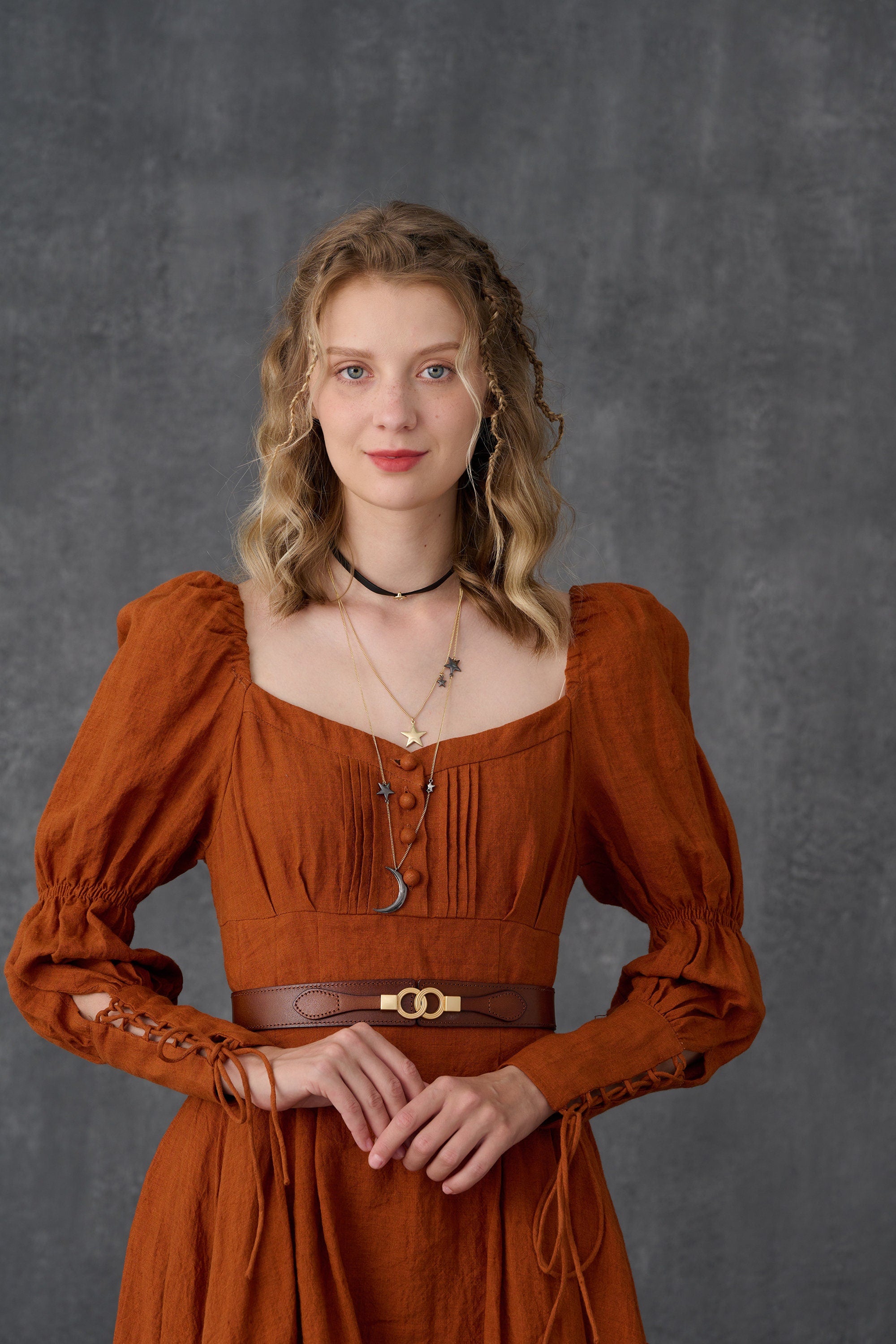 Crafted from soft linen, the piece is enhanced with a smocked bodice and button closure for added texture. It is a combination of elegance and romance.