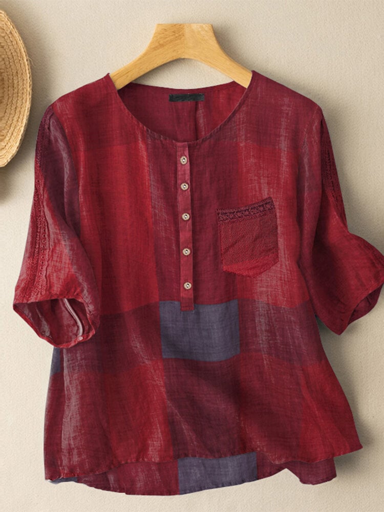 • Plaid Pattern Pocket Button Front Crew Neck Blouse