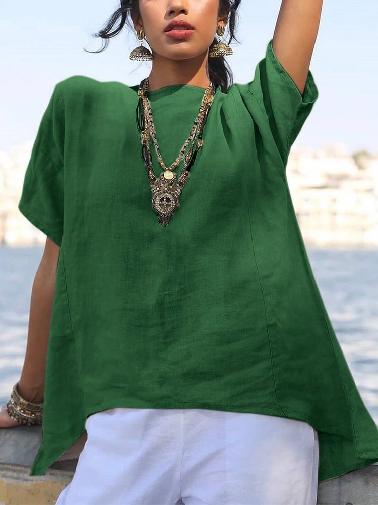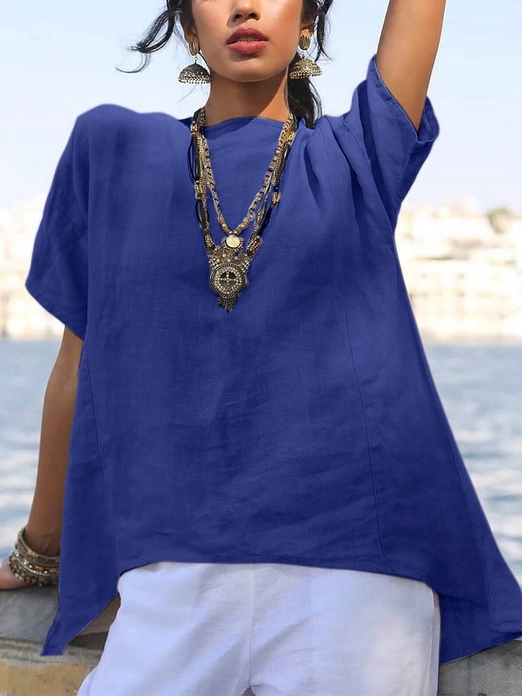 • Plain cotton and linen shirt irregular hem short sleeve stitching loose casual round collar top for women