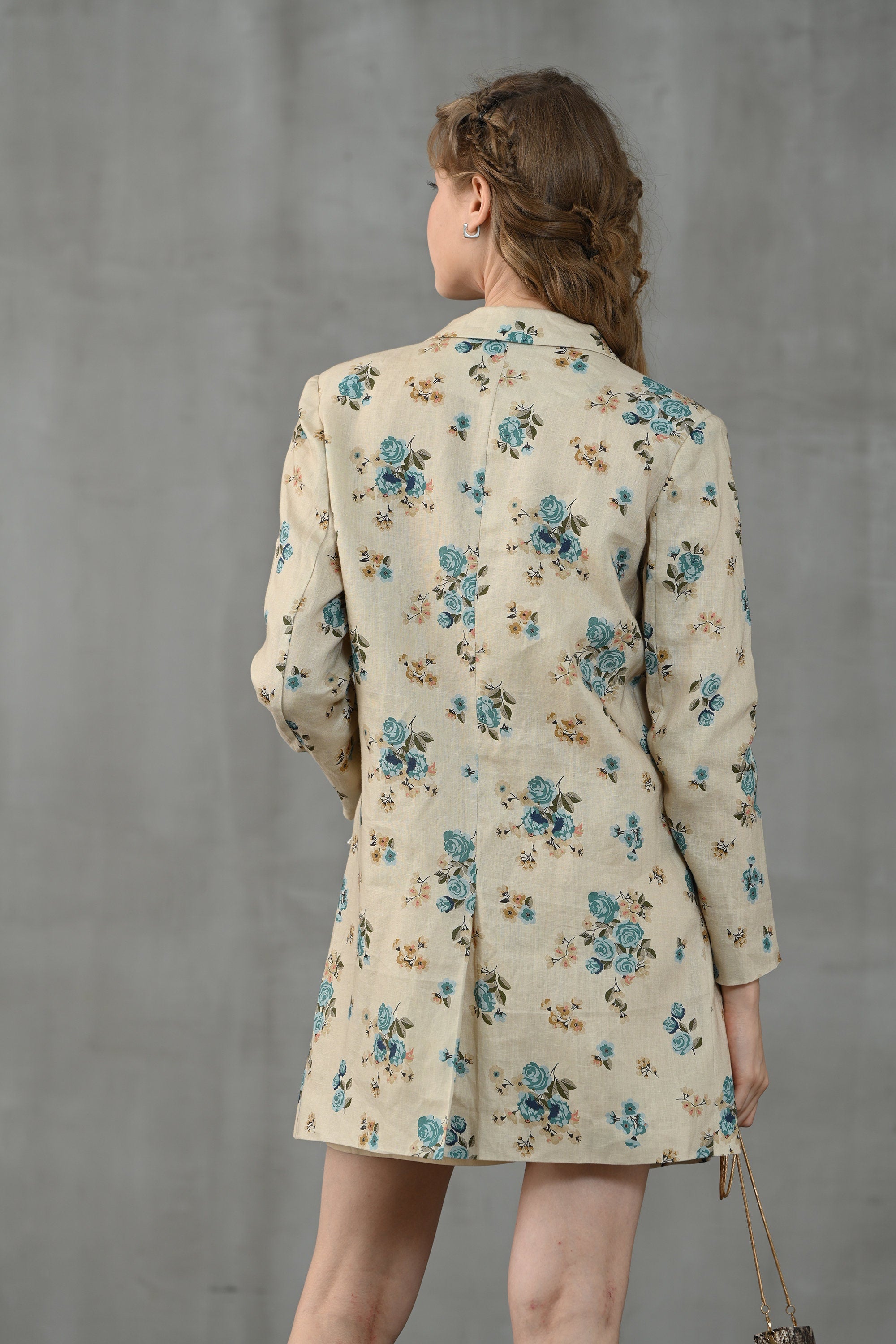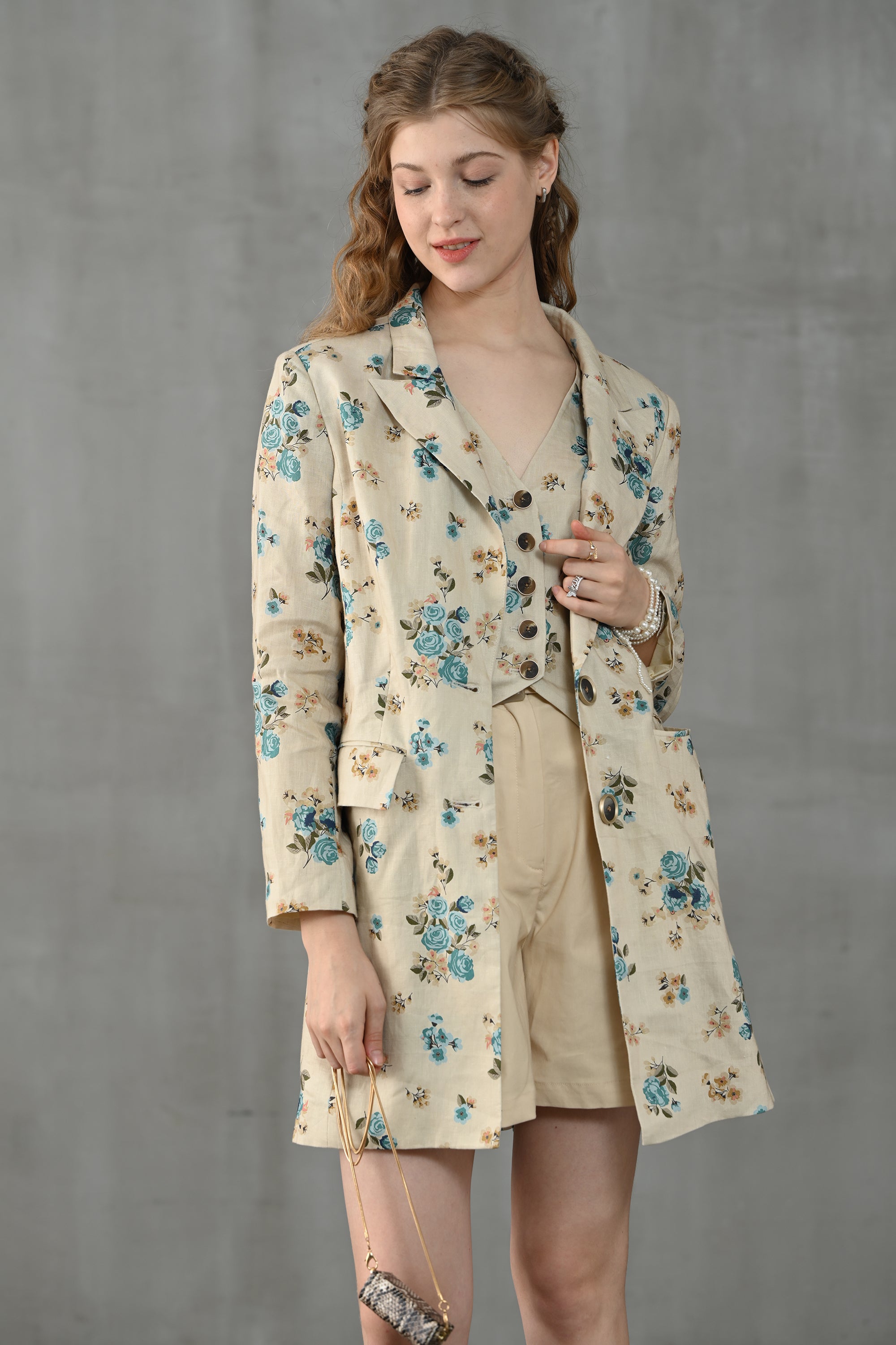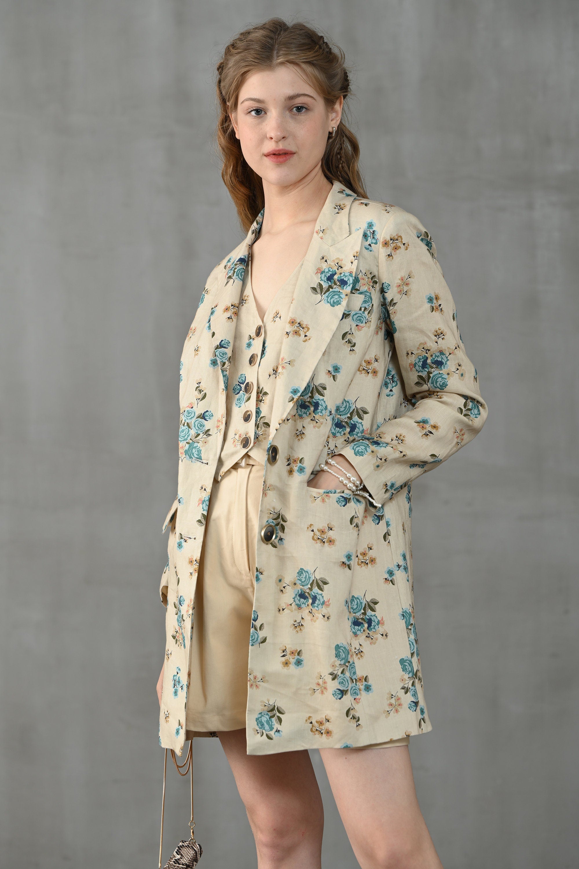 Linennaive specially design this vintage floral pattern and print on 100% heavy linen. A layered corset is attached inside the classic blazer. and the basic top is cut to expose the midriff. It's all about the details. This corset-effect single-breasted coat from Linennaive will get you more elegant than ever to face colder season.