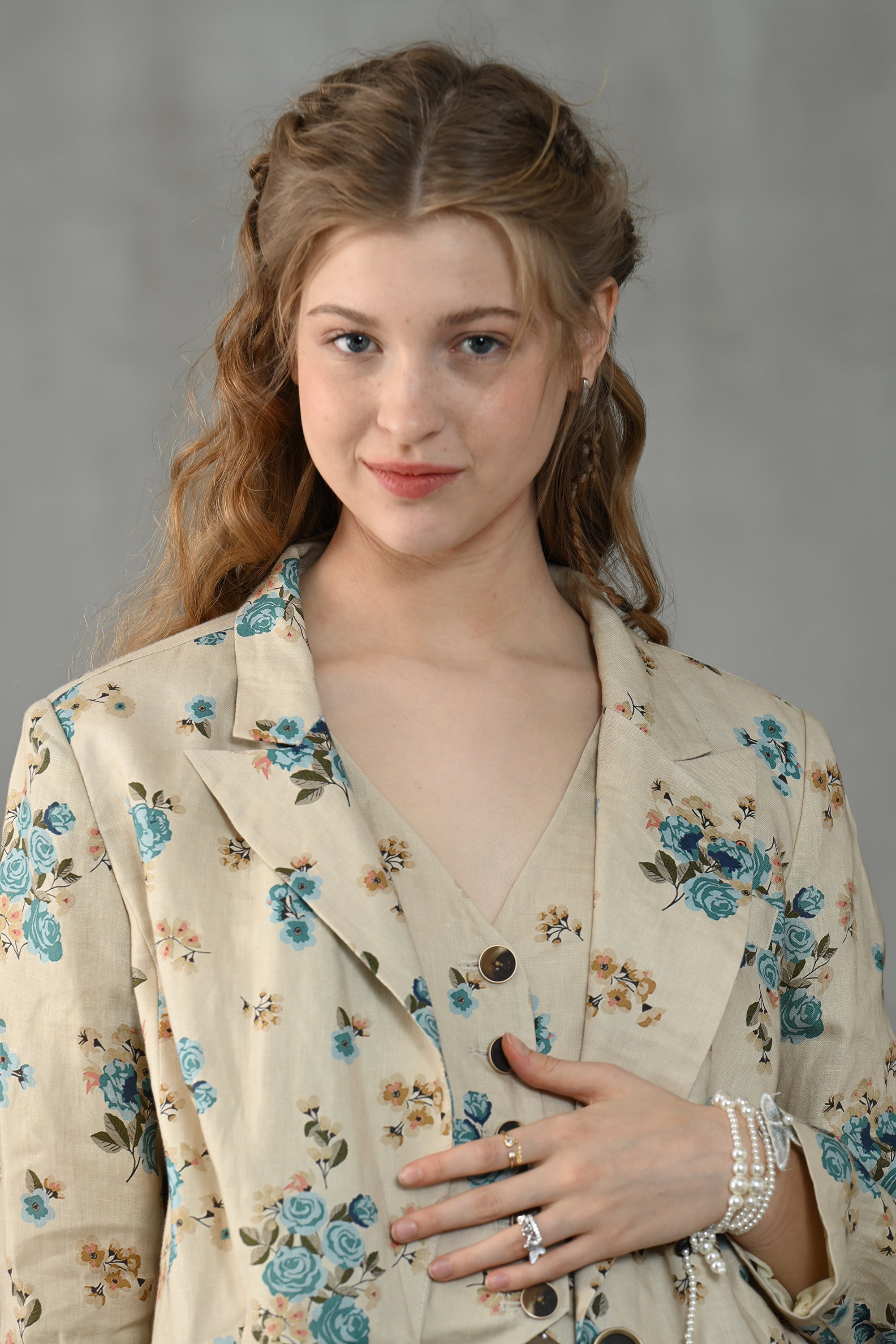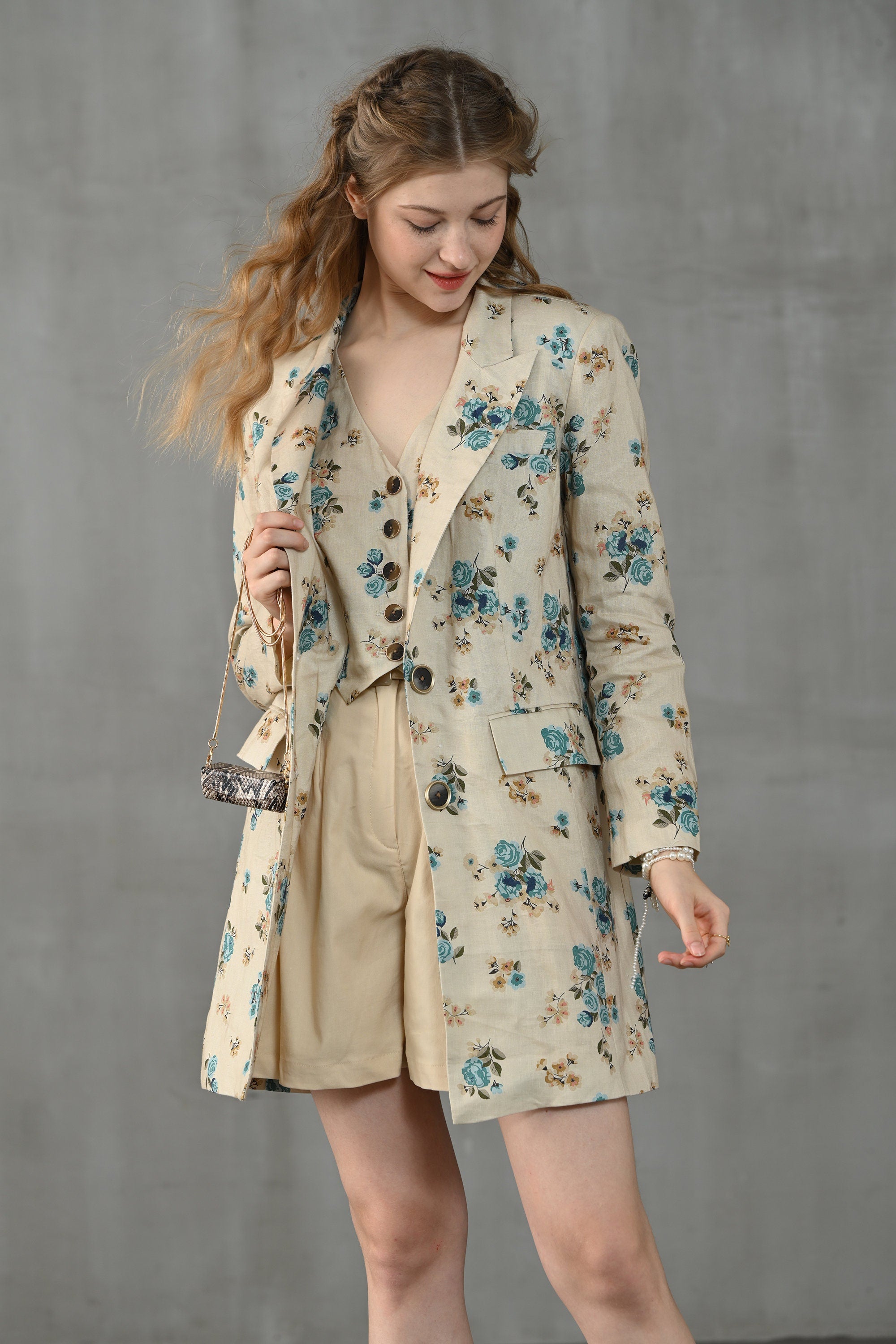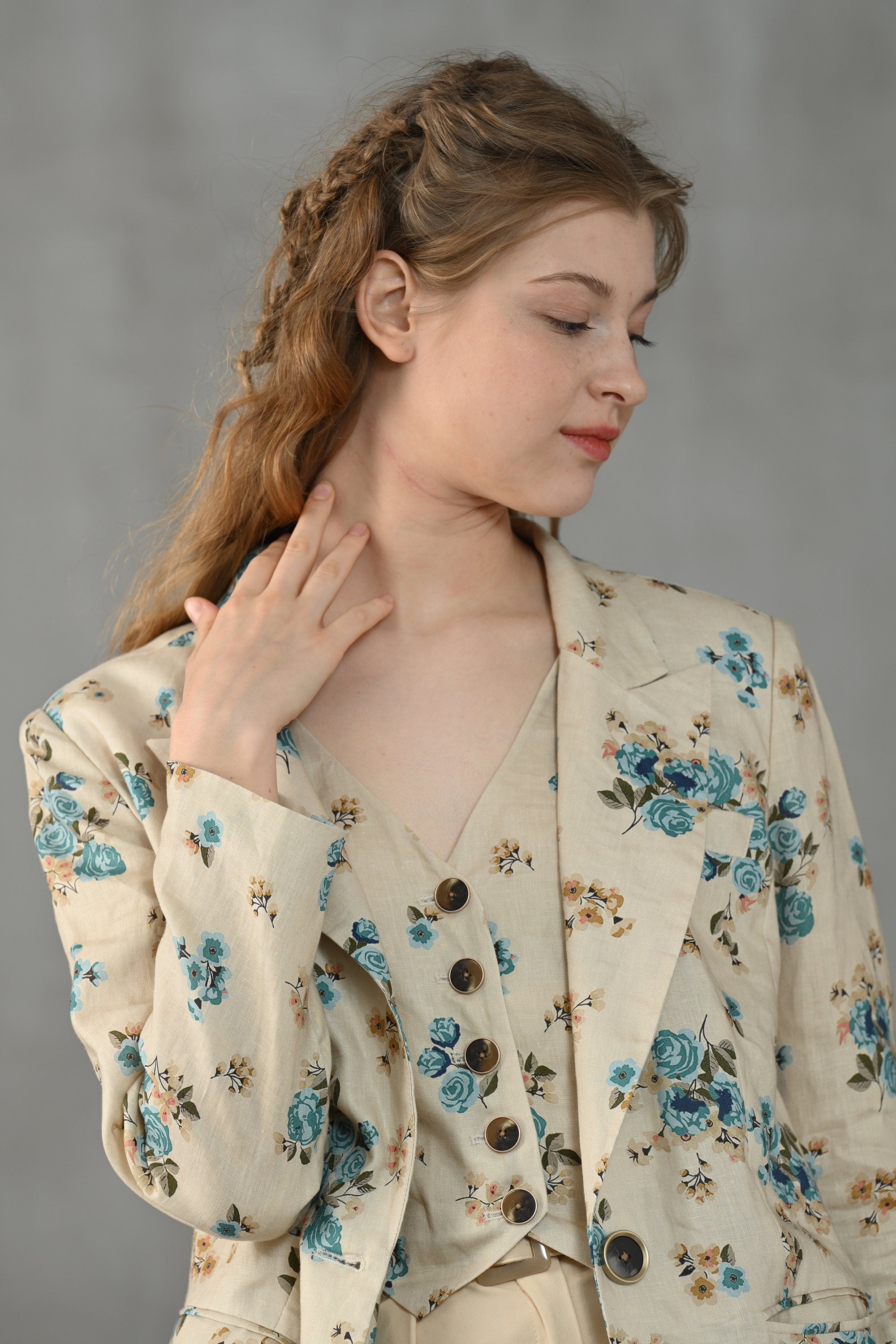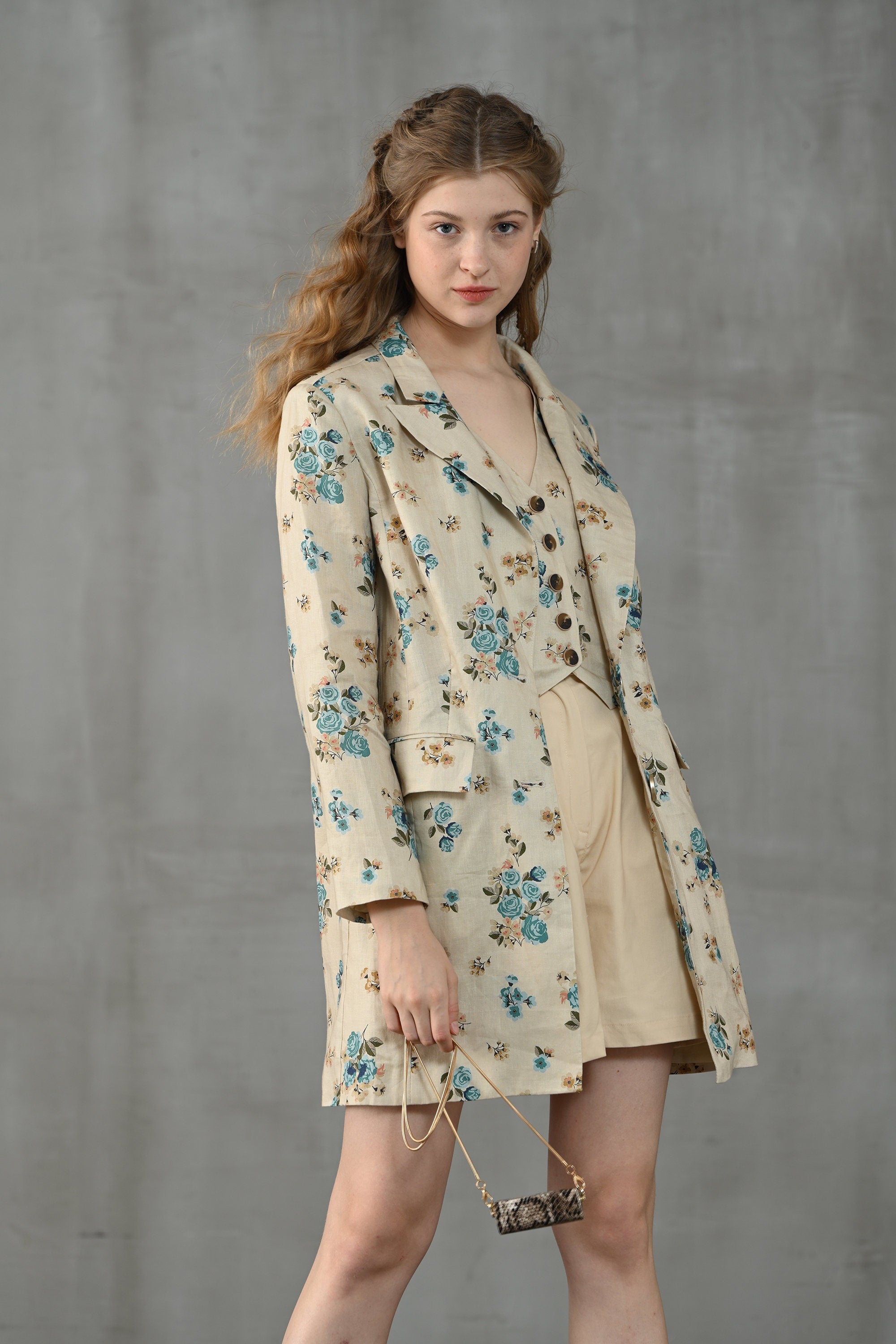 Linennaive specially design this vintage floral pattern and print on 100% heavy linen. A layered corset is attached inside the classic blazer. and the basic top is cut to expose the midriff. It's all about the details. This corset-effect single-breasted coat from Linennaive will get you more elegant than ever to face colder season.