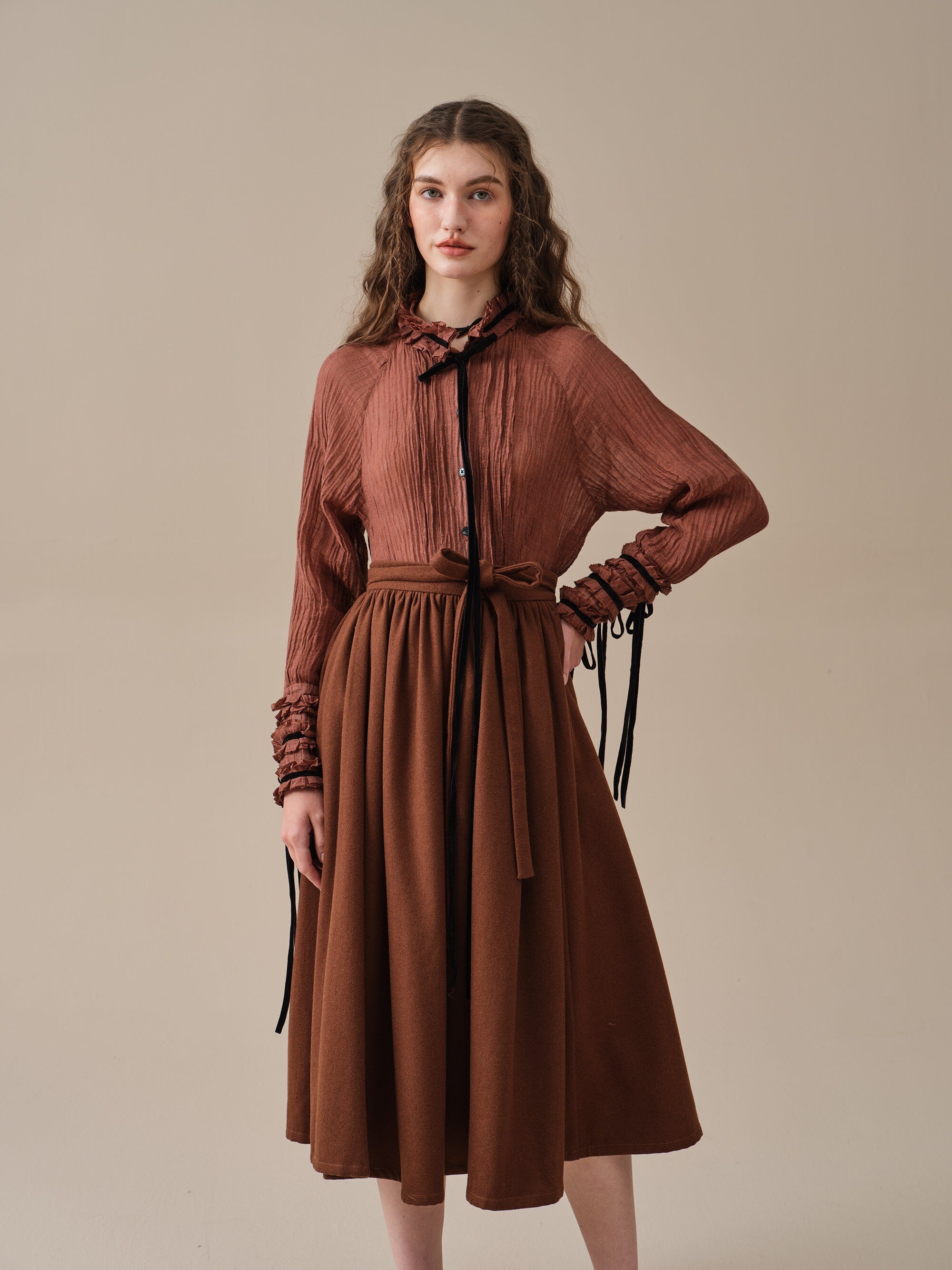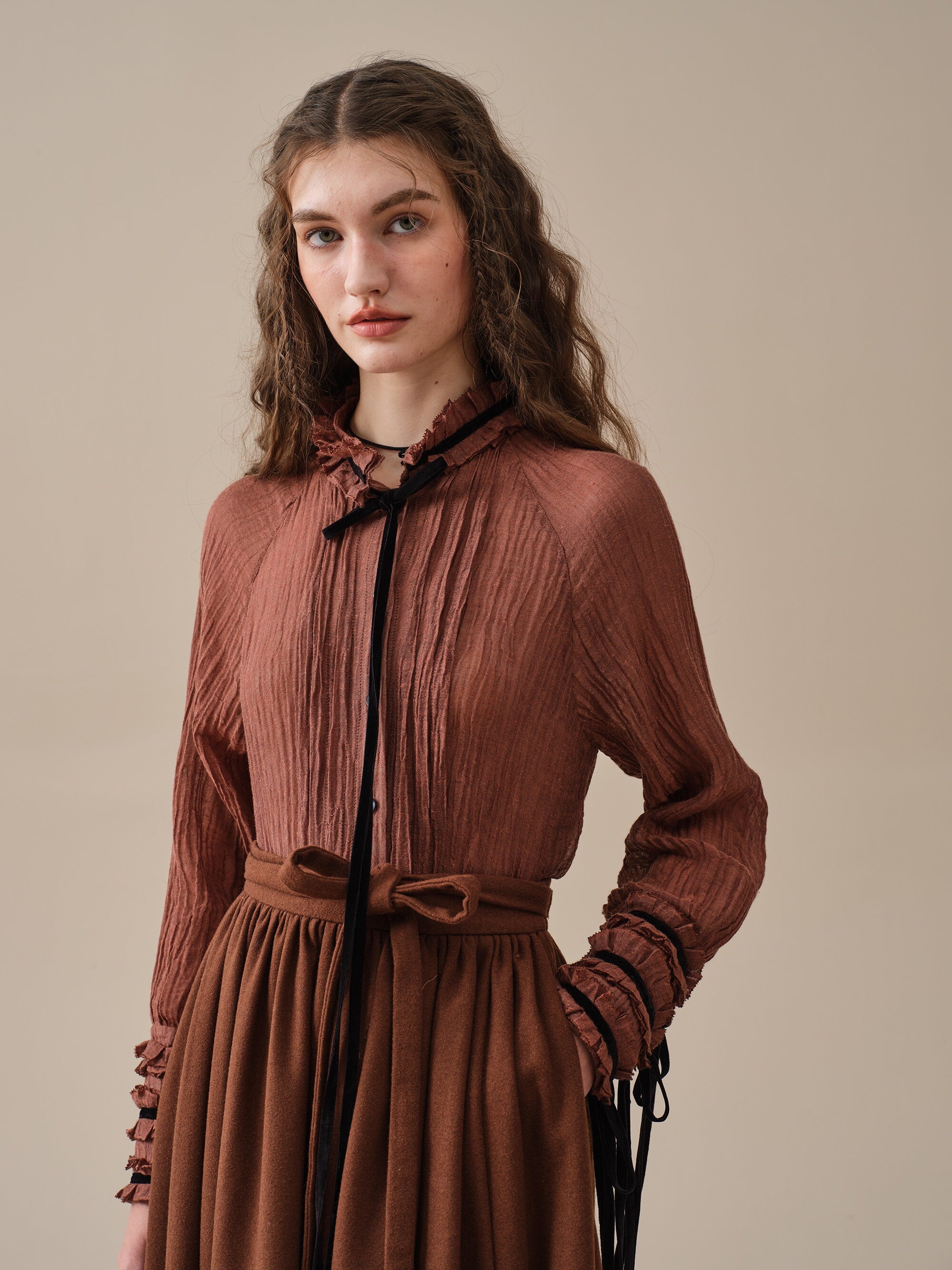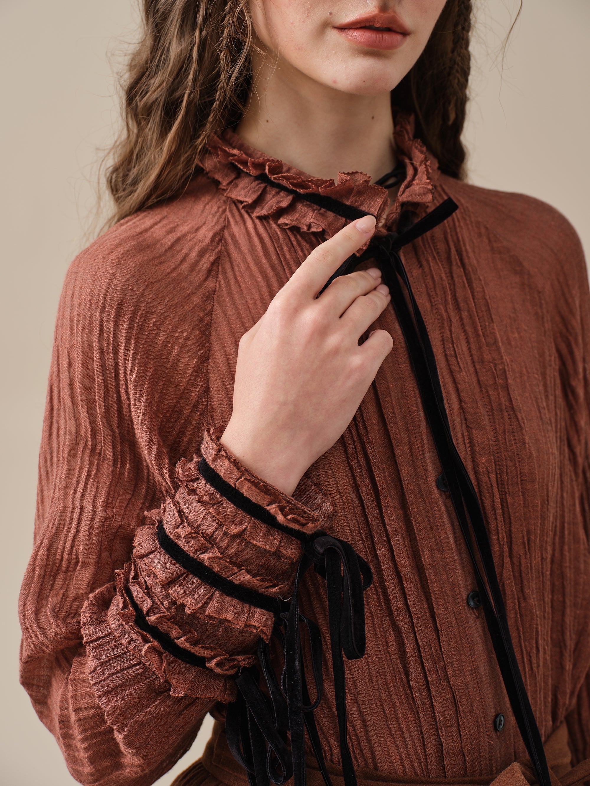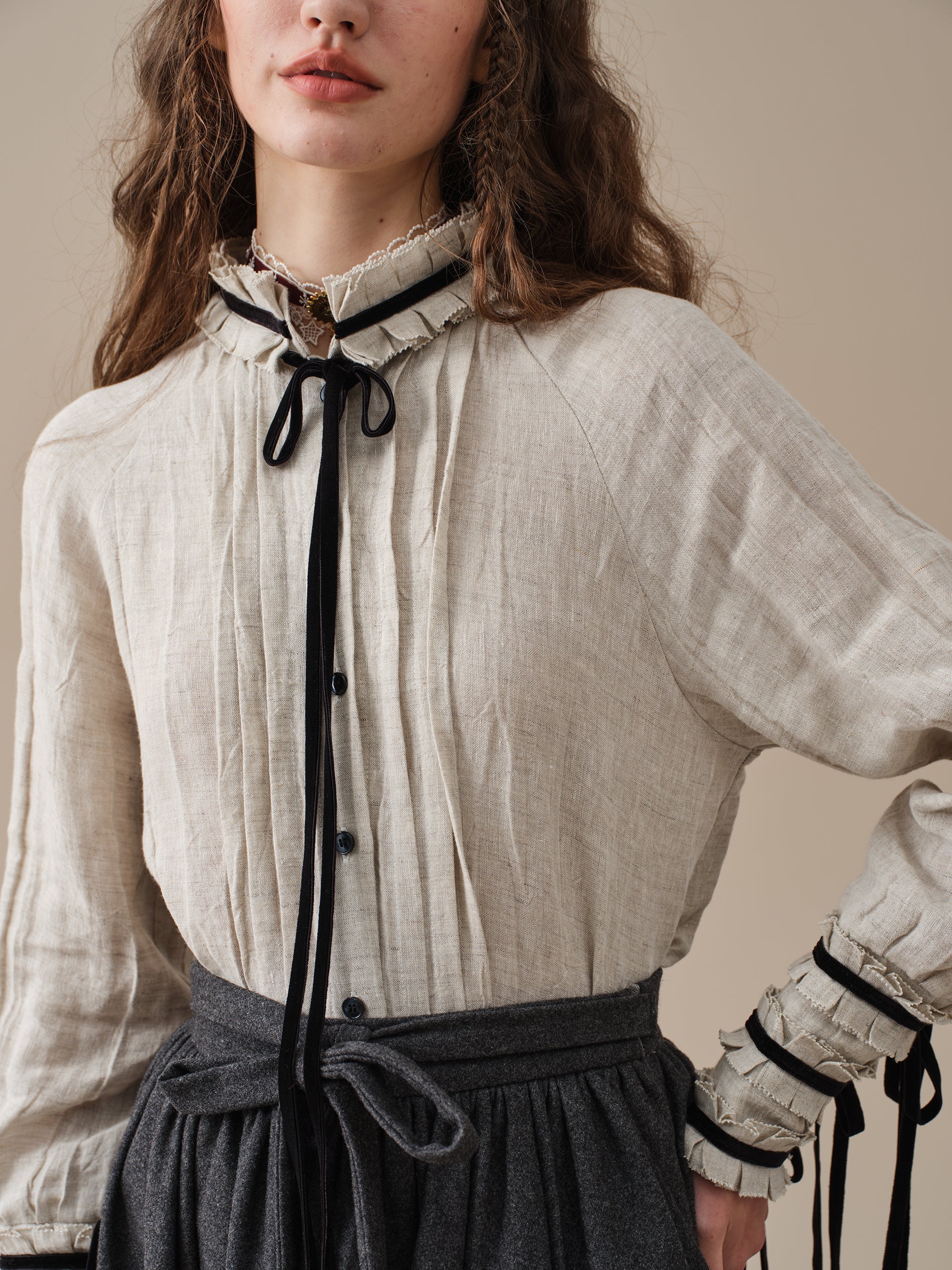 Crafted from soft linen, the delicate ruffles at the neckline and cuffs elevate its texture and add a soft and romantic feel. captivating lace-up detailing allowing for customized fit and adding a touch of femininity to your ensemble.