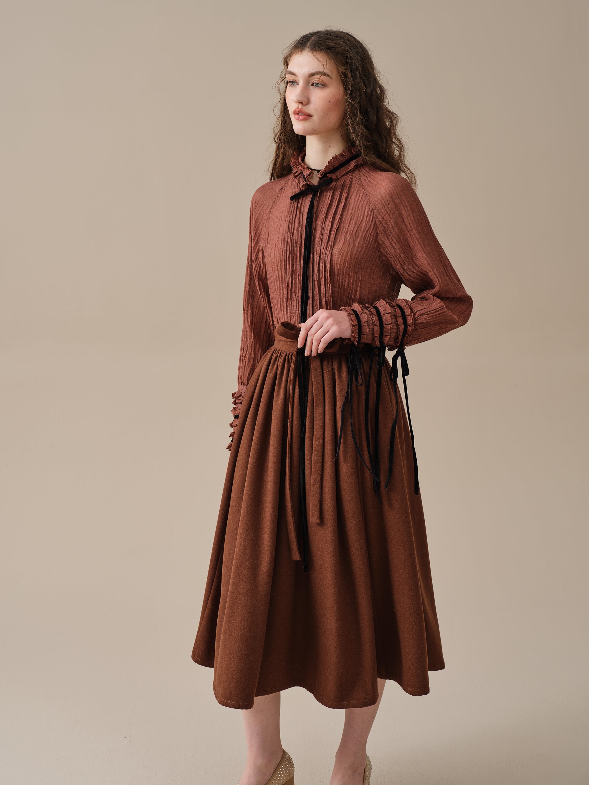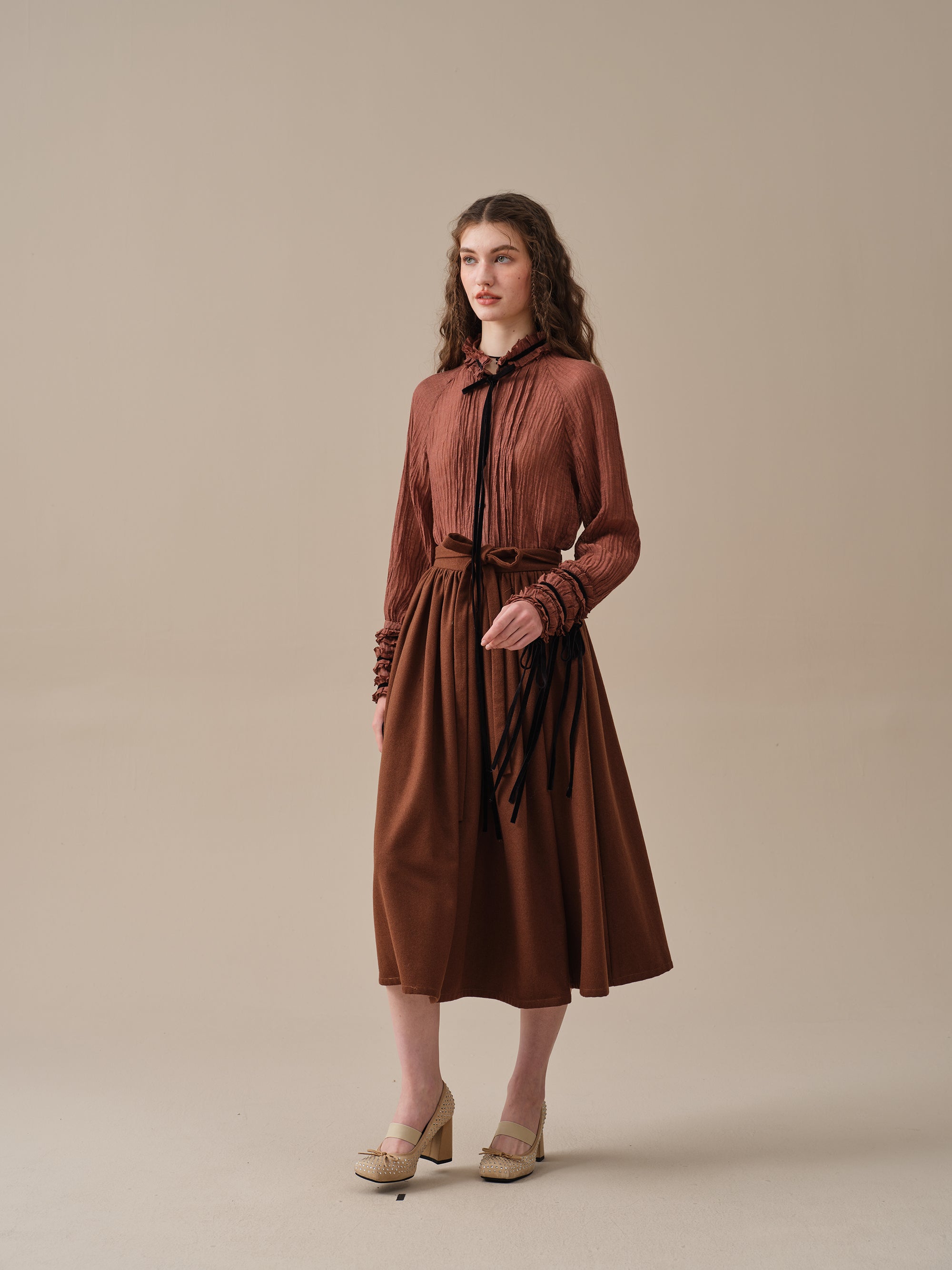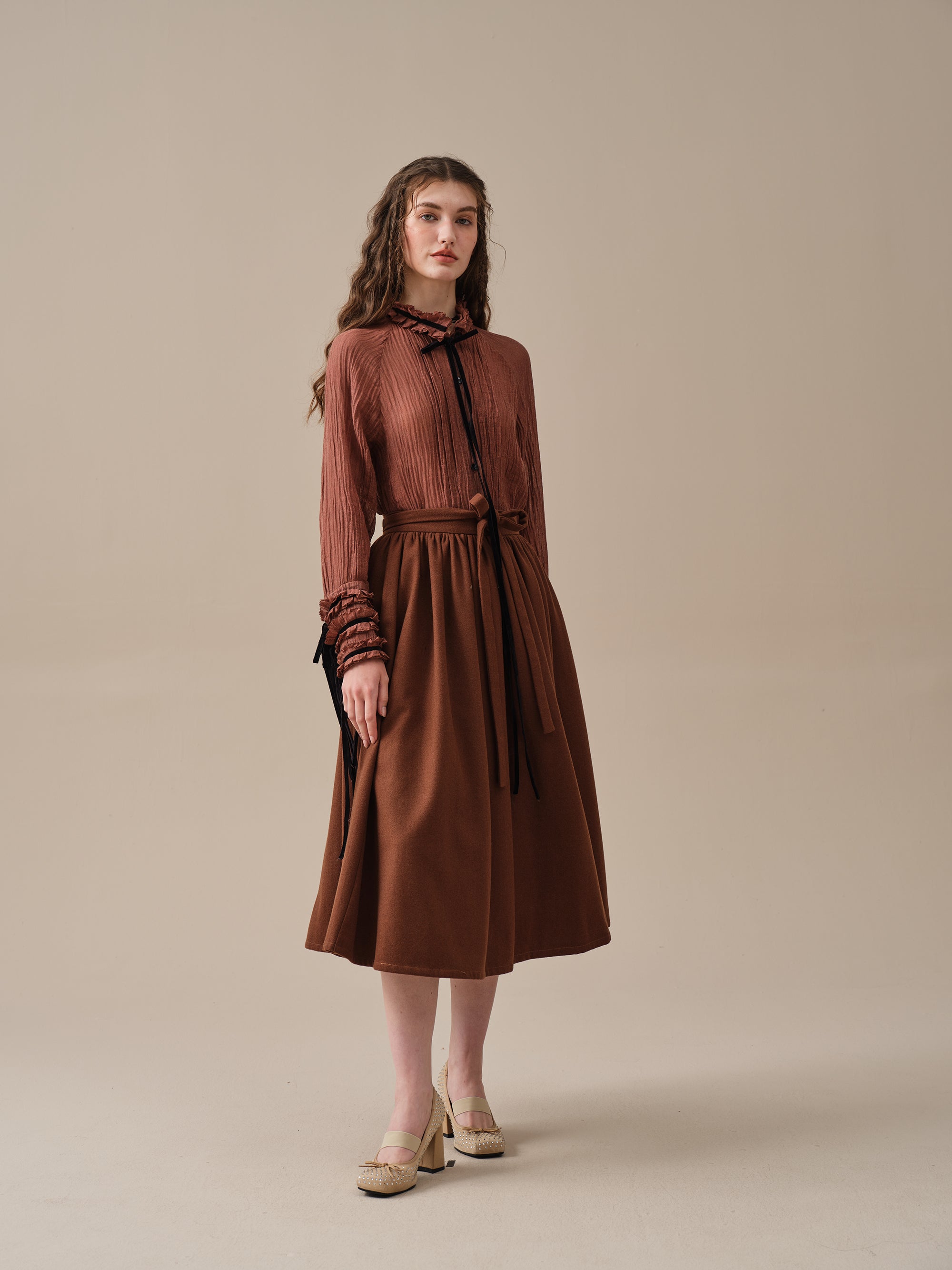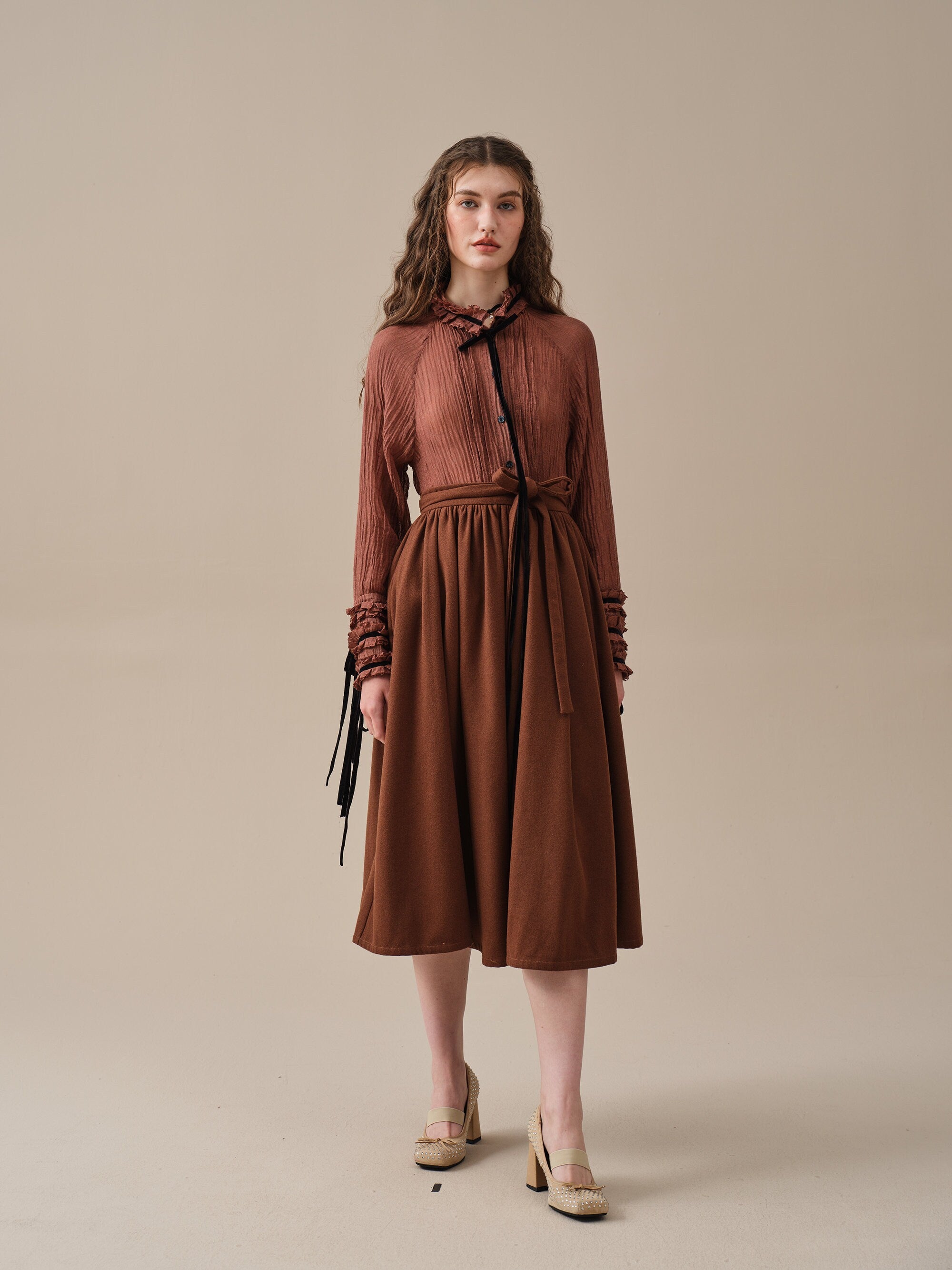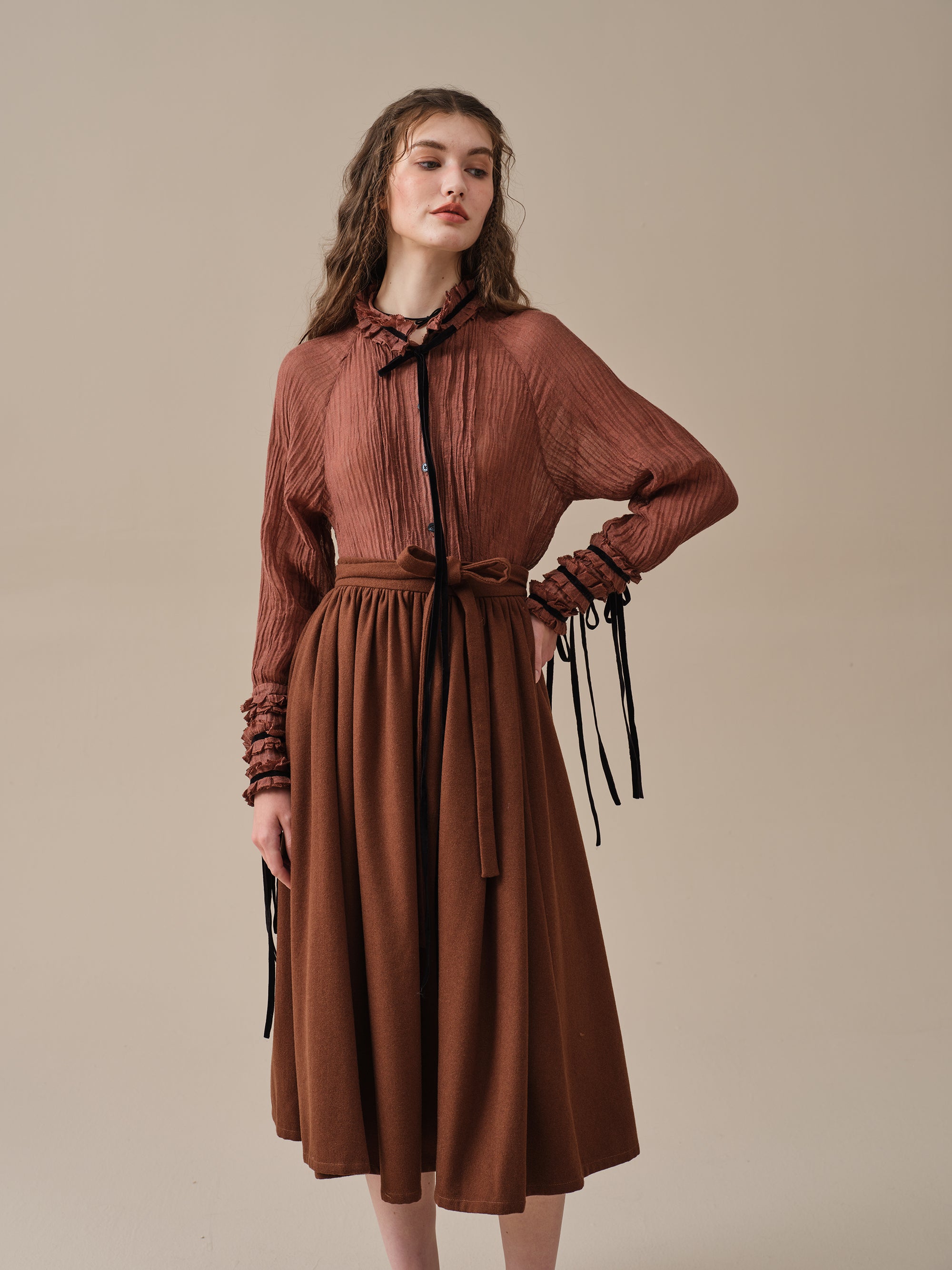Crafted from soft linen, the delicate ruffles at the neckline and cuffs elevate its texture and add a soft and romantic feel. captivating lace-up detailing allowing for customized fit and adding a touch of femininity to your ensemble.