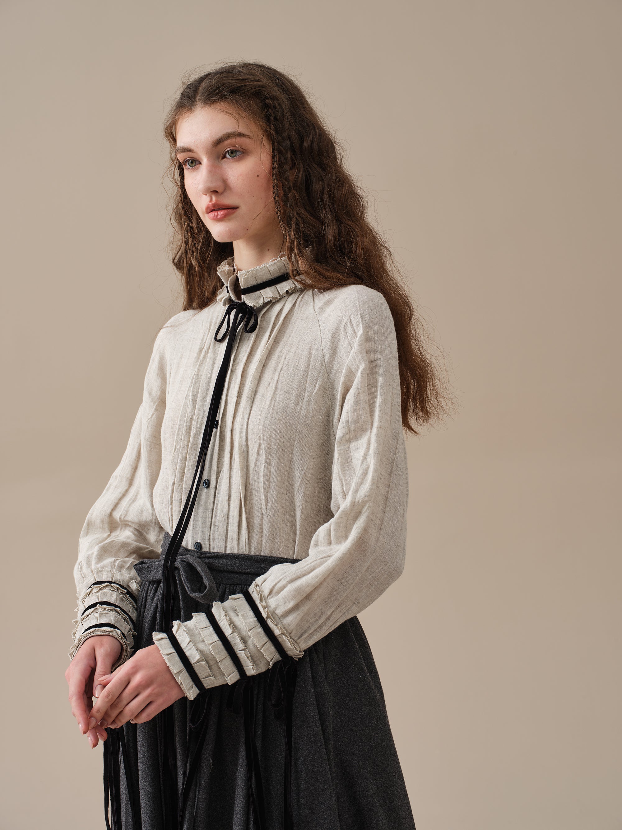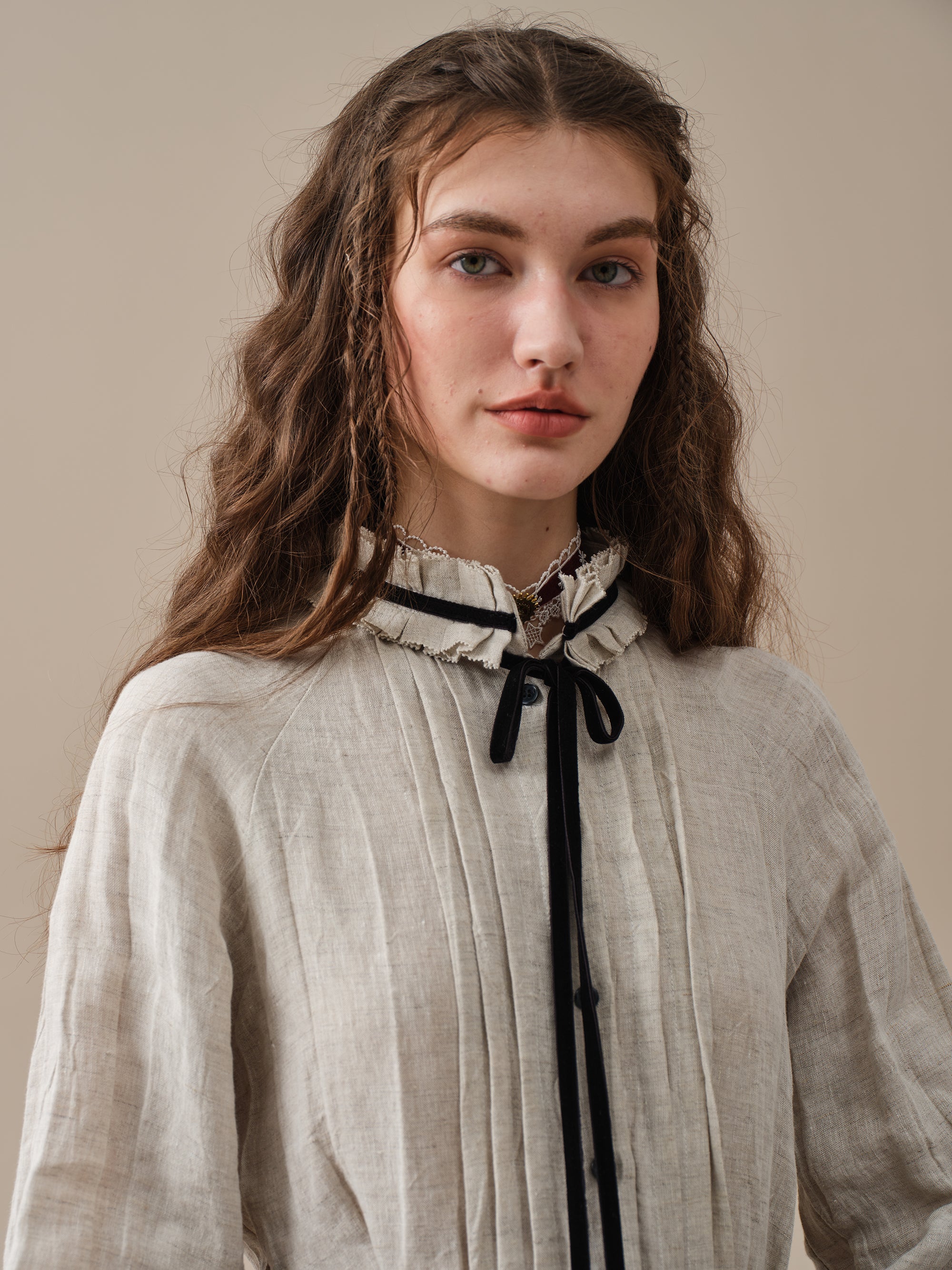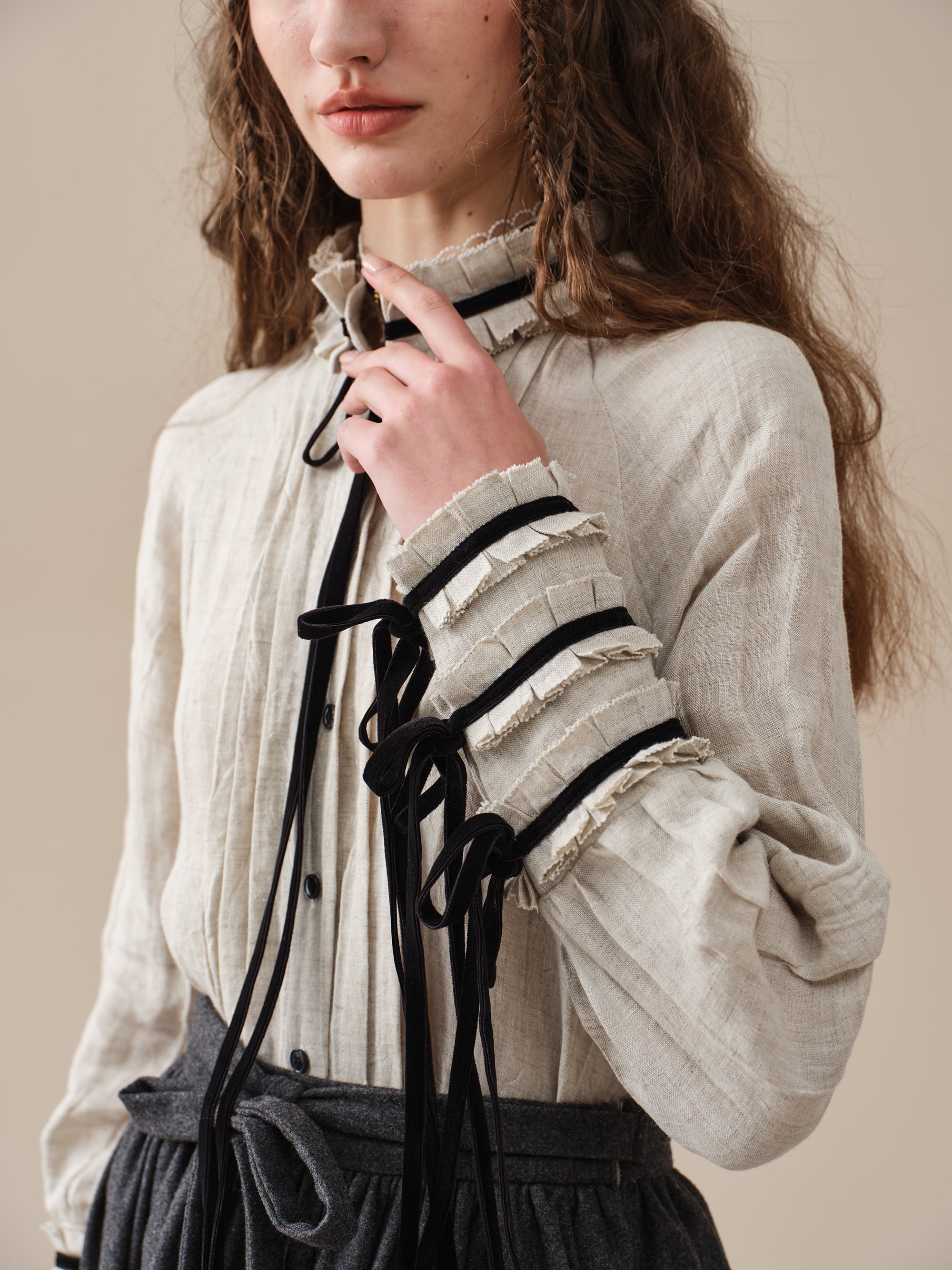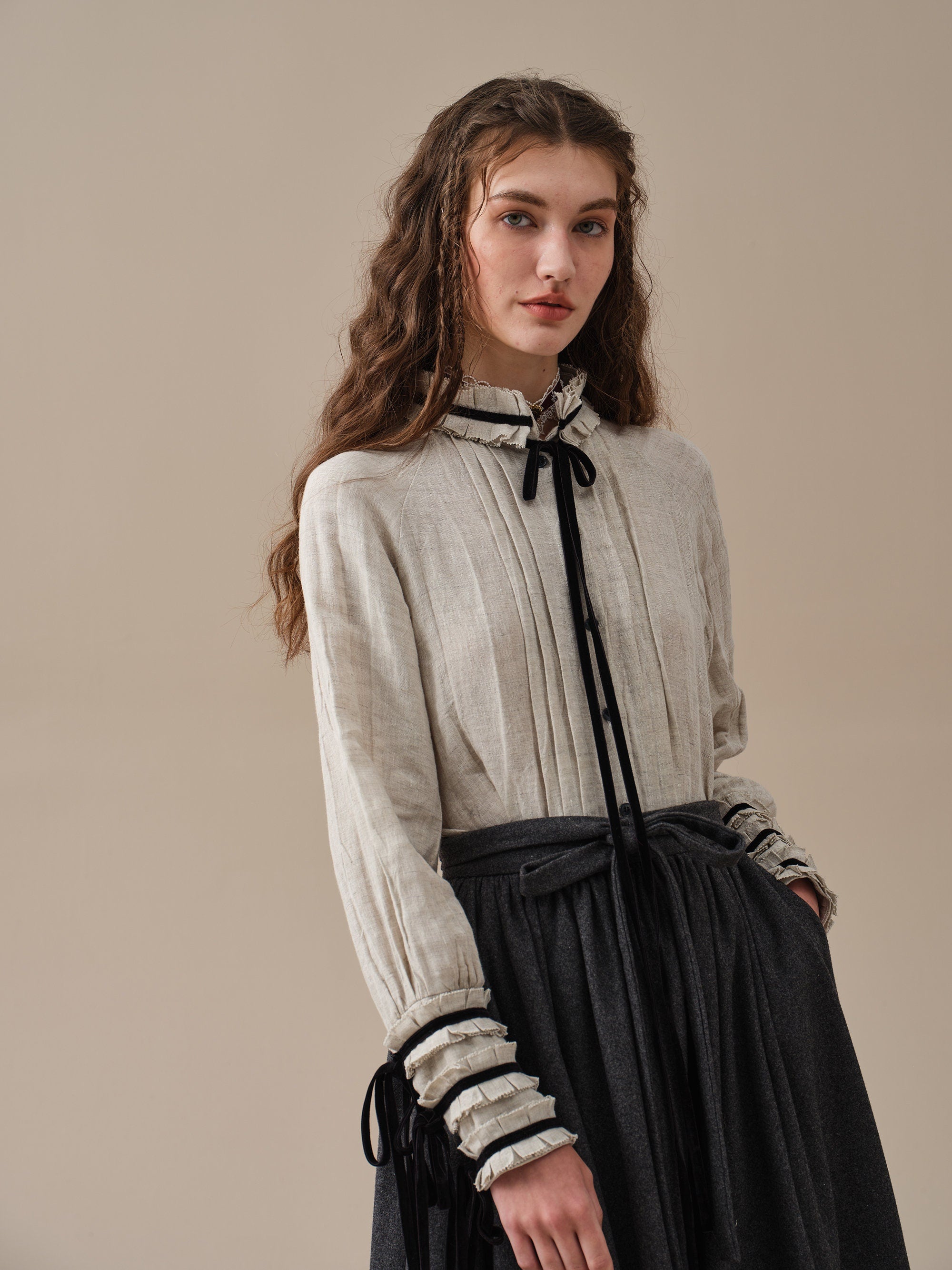 Crafted from soft linen, the delicate ruffles at the neckline and cuffs elevate its texture and add a soft and romantic feel. captivating lace-up detailing allowing for customized fit and adding a touch of femininity to your ensemble.