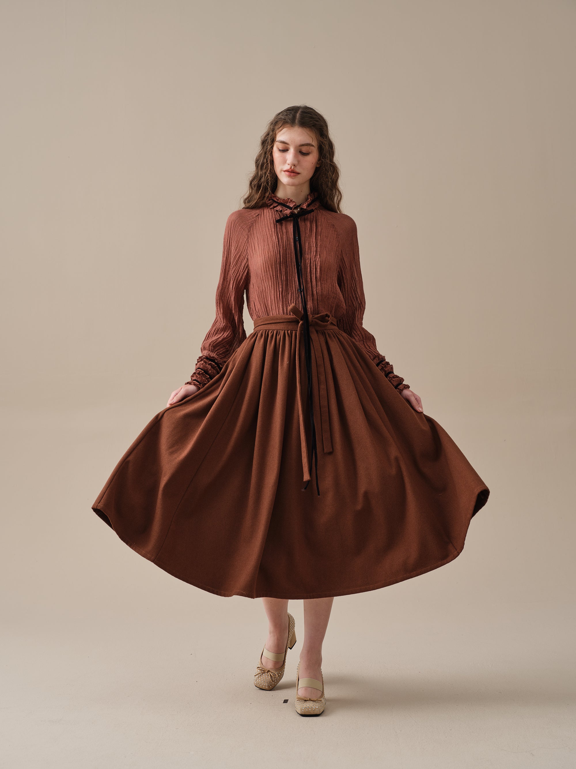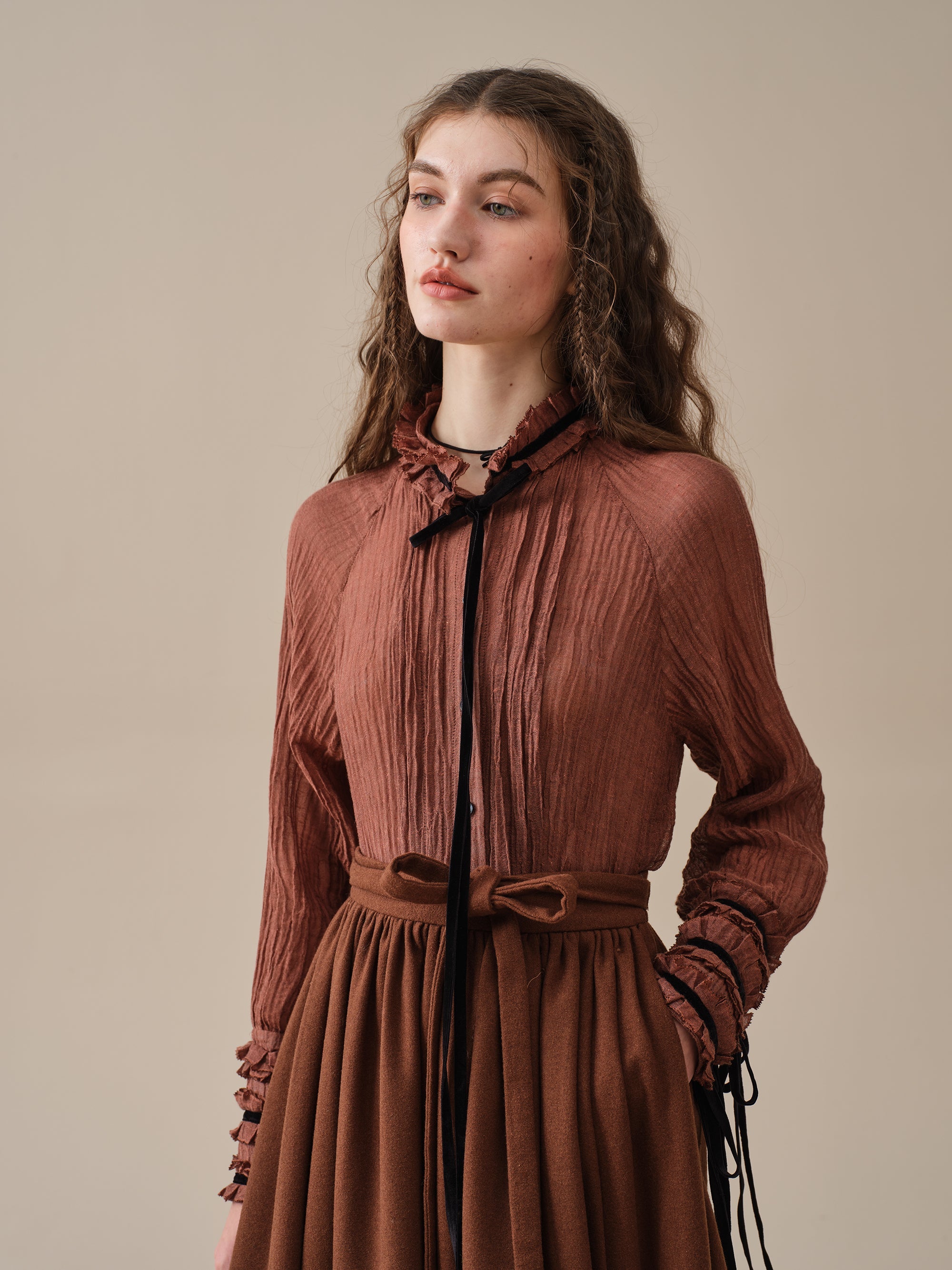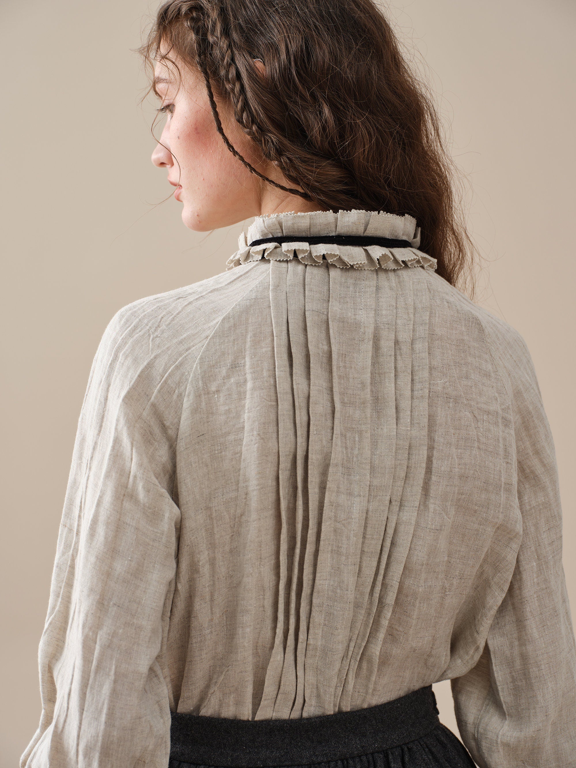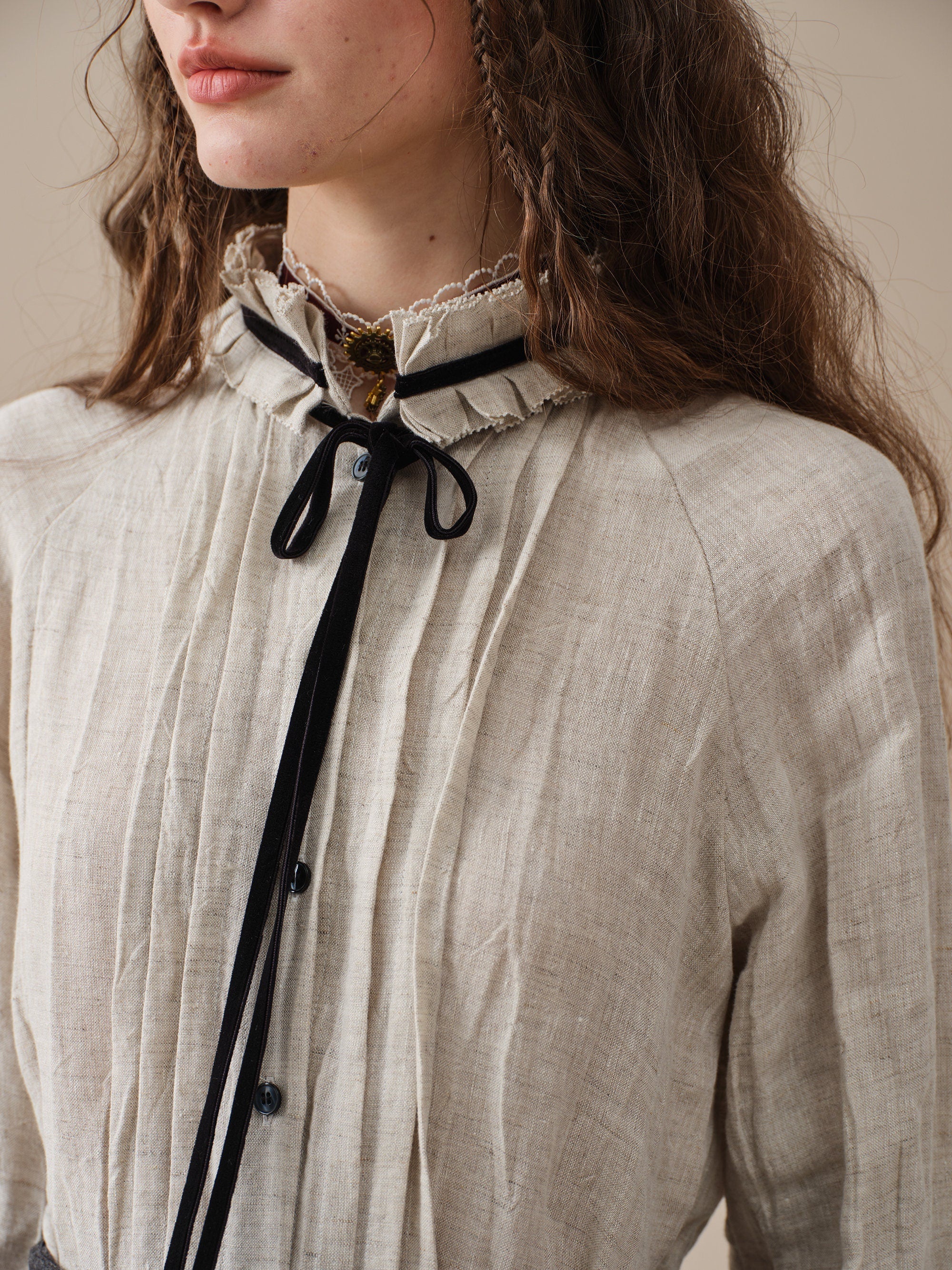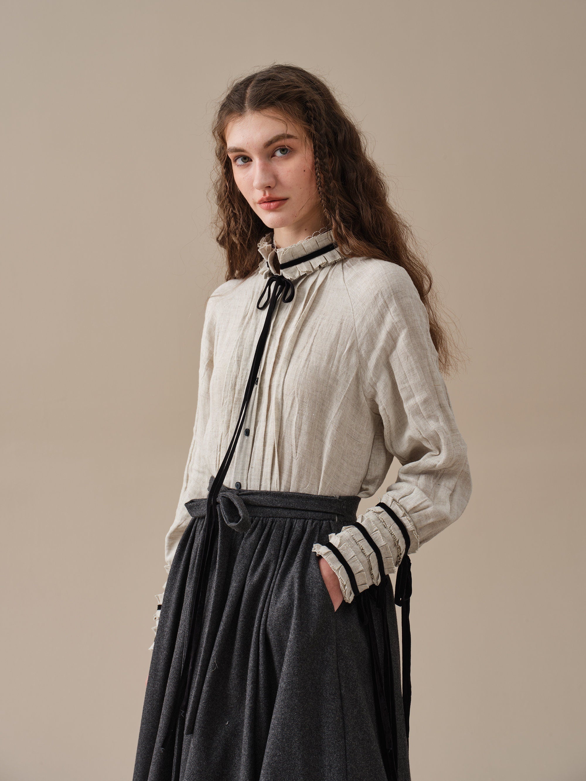 Crafted from soft linen, the delicate ruffles at the neckline and cuffs elevate its texture and add a soft and romantic feel. captivating lace-up detailing allowing for customized fit and adding a touch of femininity to your ensemble.
