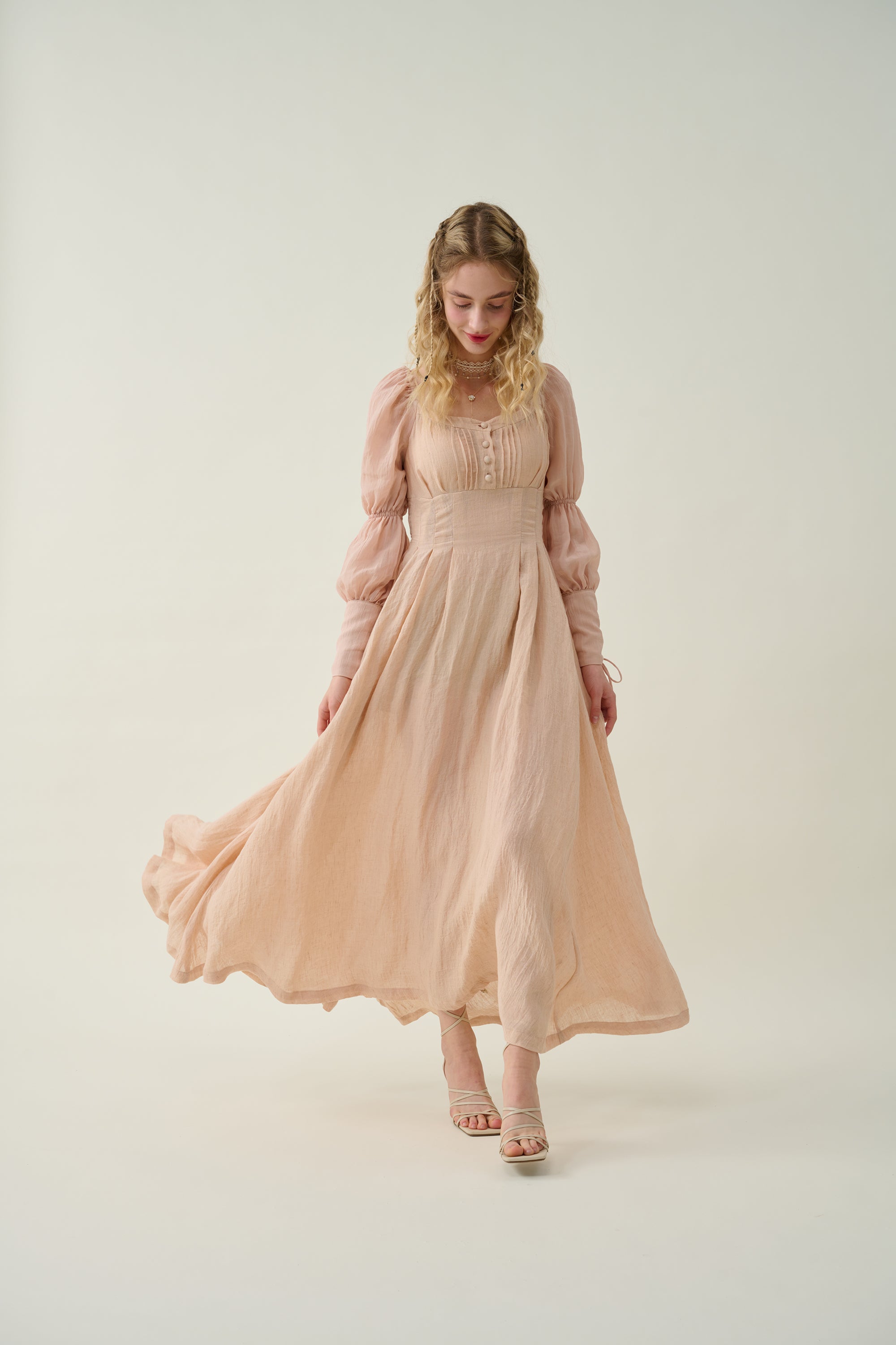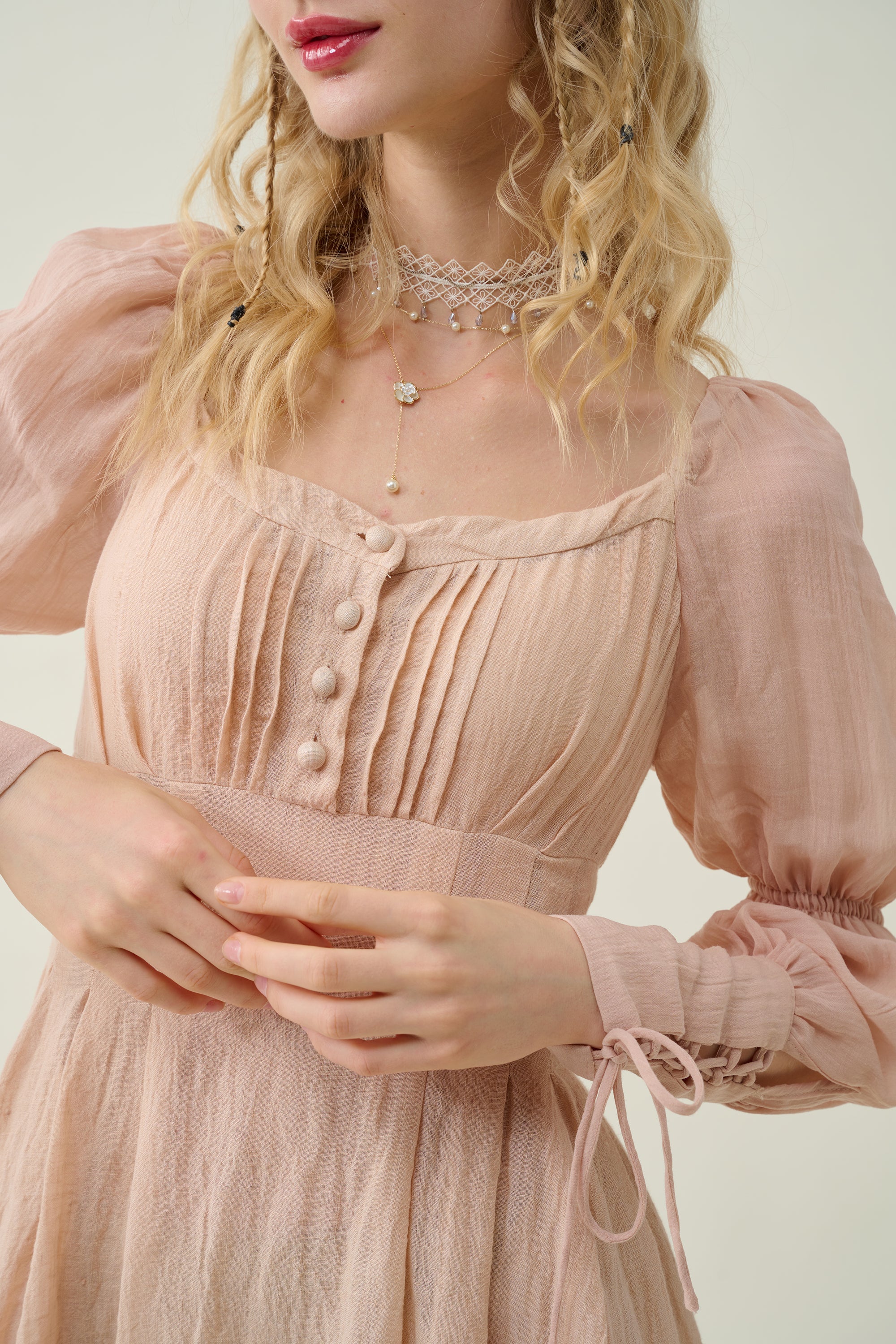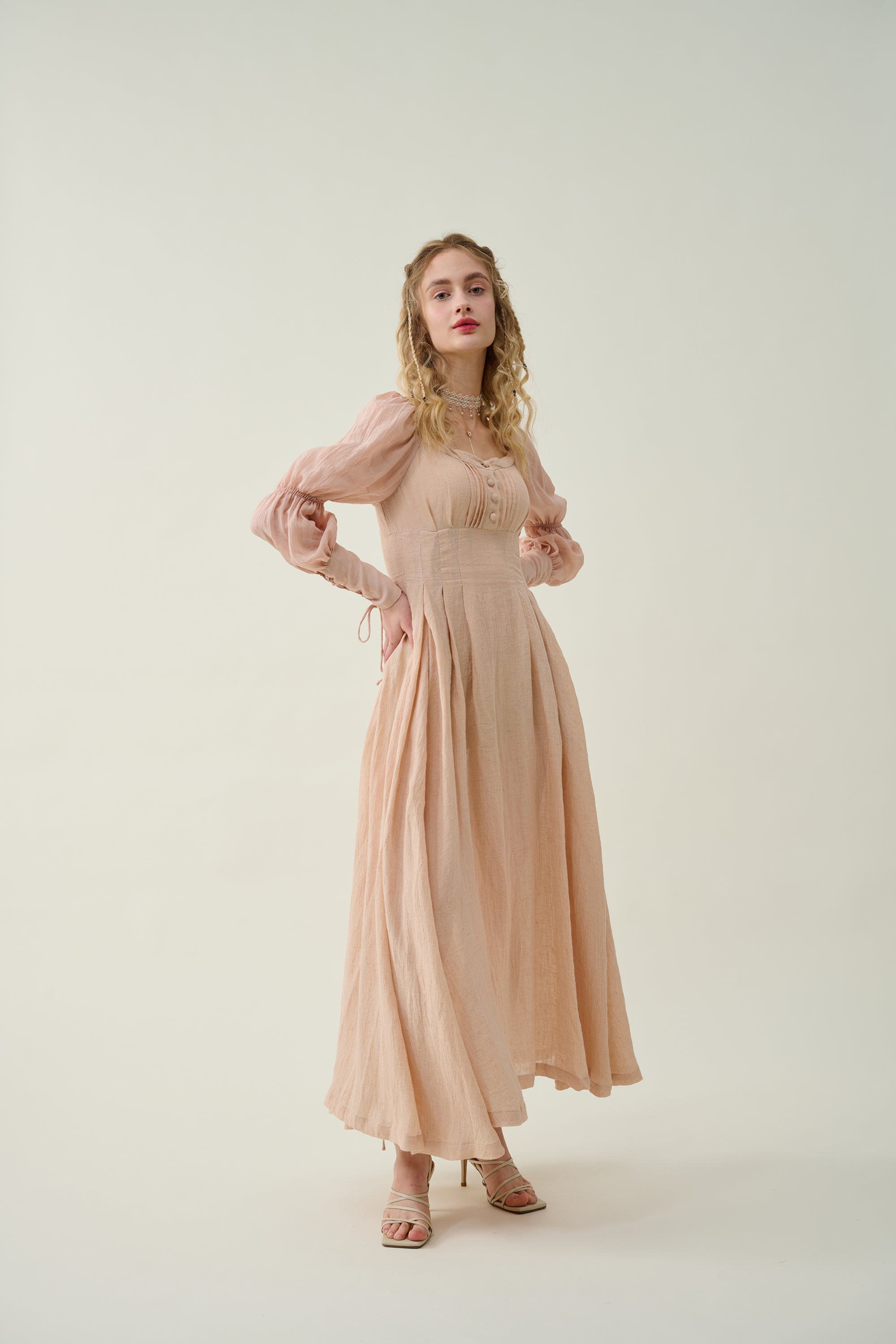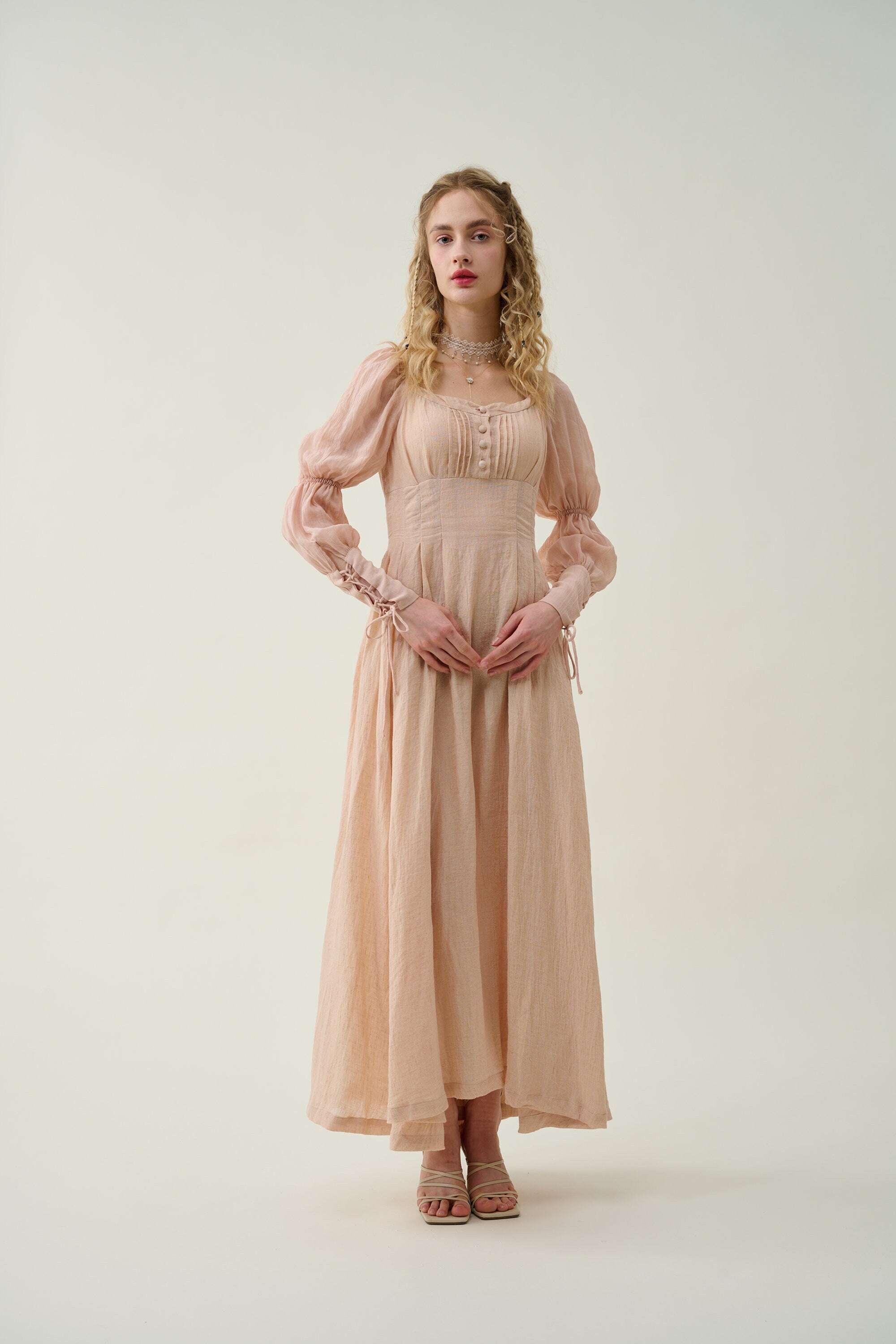 Crafted from soft linen, the piece is enhanced with a smocked bodice and button closure for added texture. It is a combination of elegance and romance.