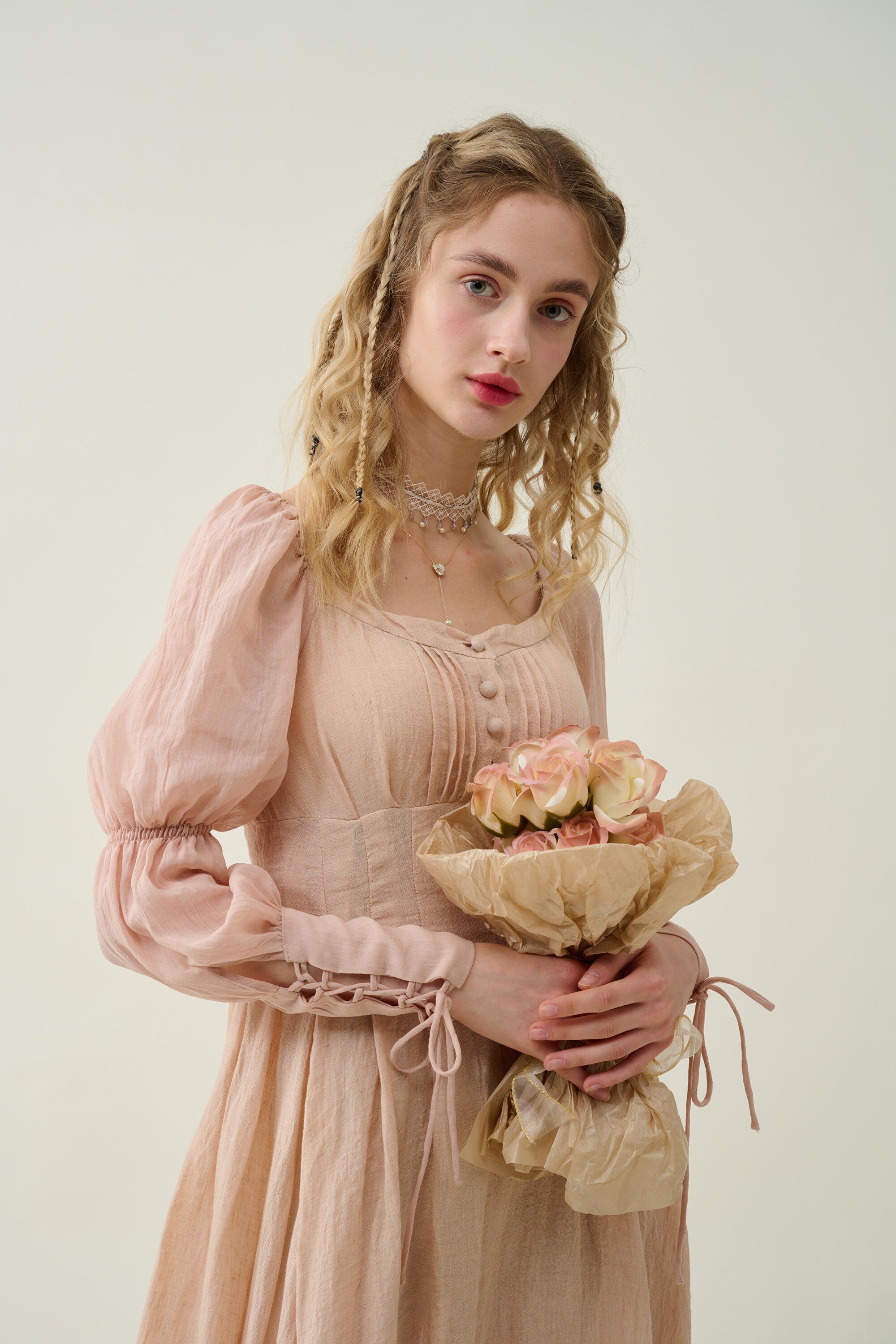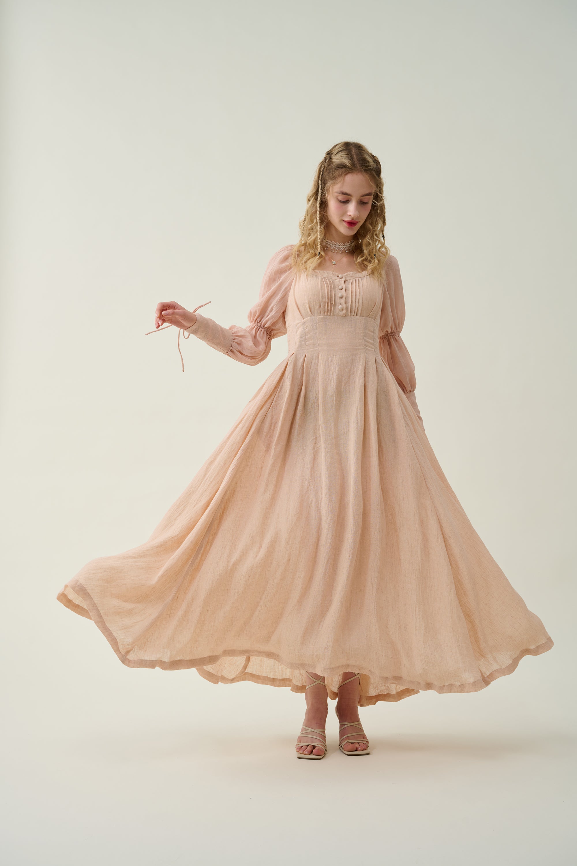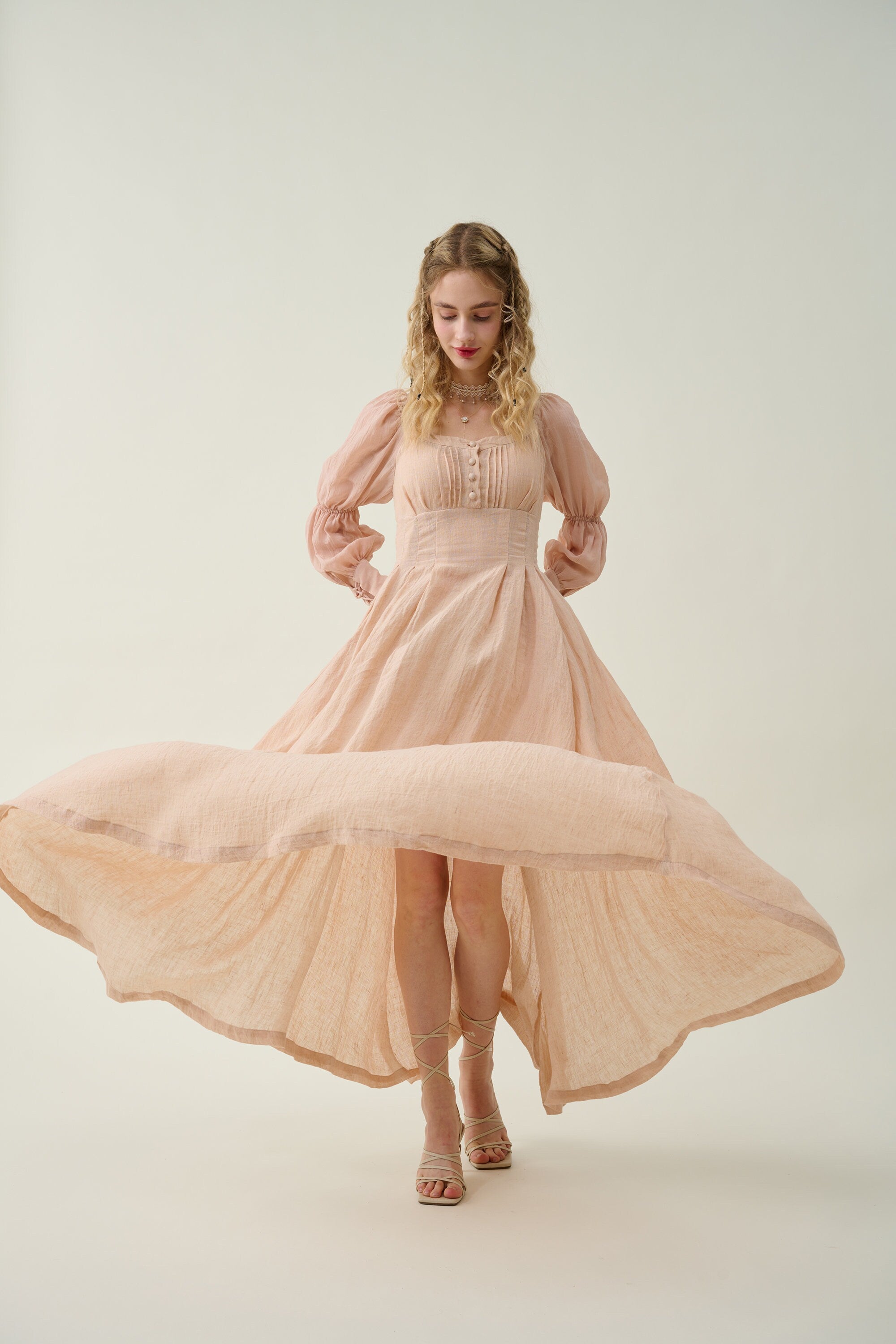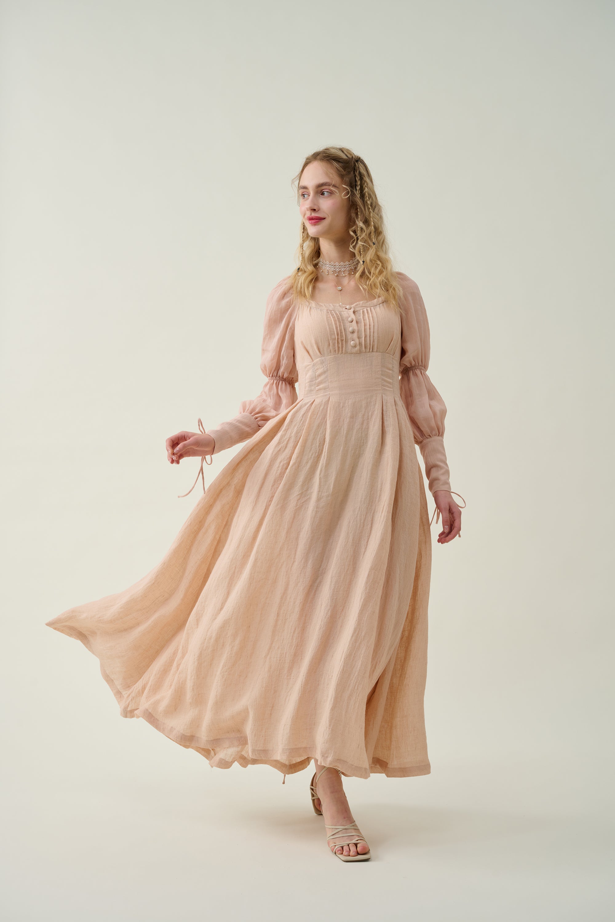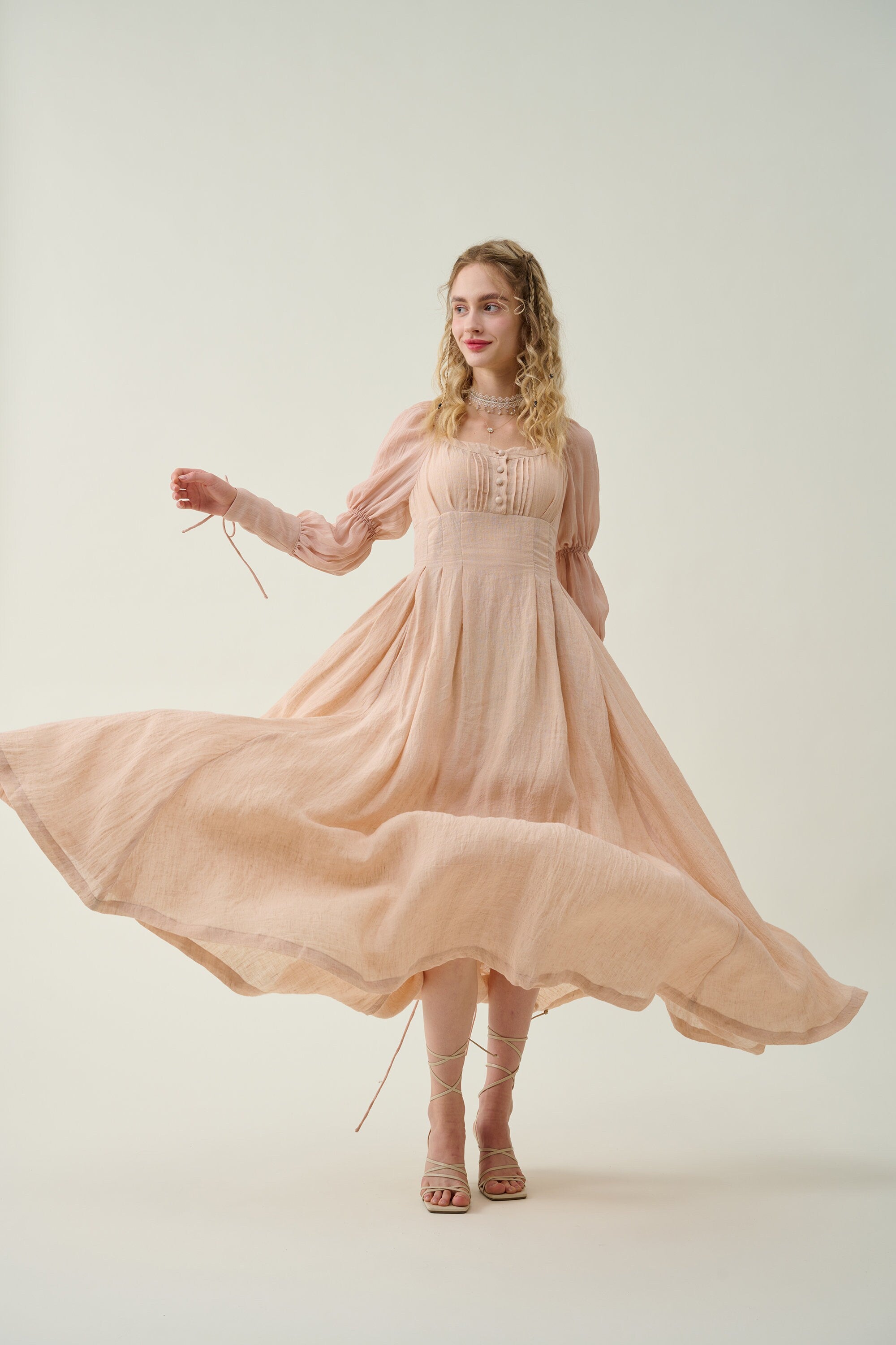 Crafted from soft linen, the piece is enhanced with a smocked bodice and button closure for added texture. It is a combination of elegance and romance.
